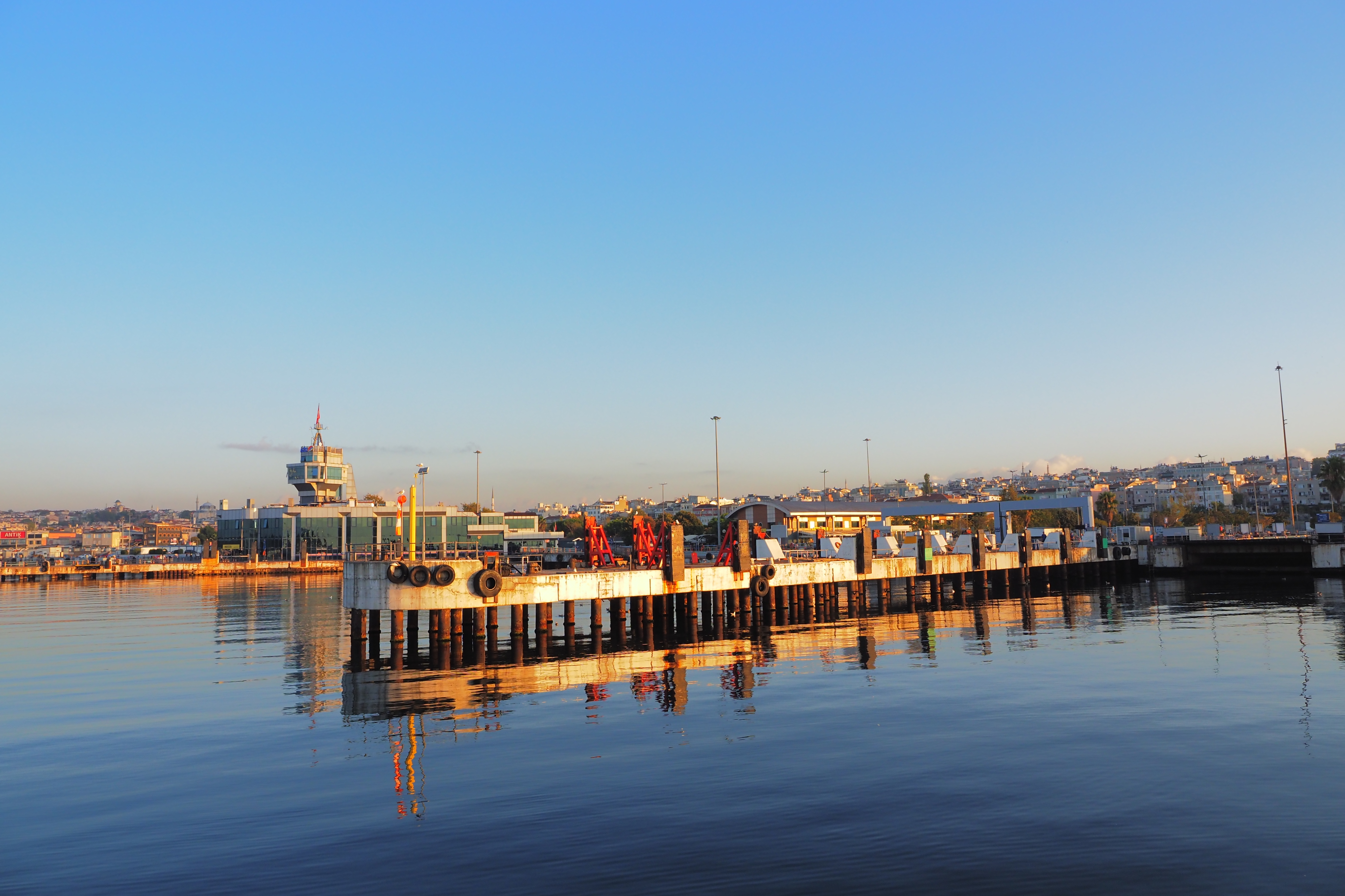 マルマラ海に浮かぶ小さな島々が見えたあと、朧朝の霞の中から ボスポラス海峡に臨む人工物たちが浮かび上がって来た。