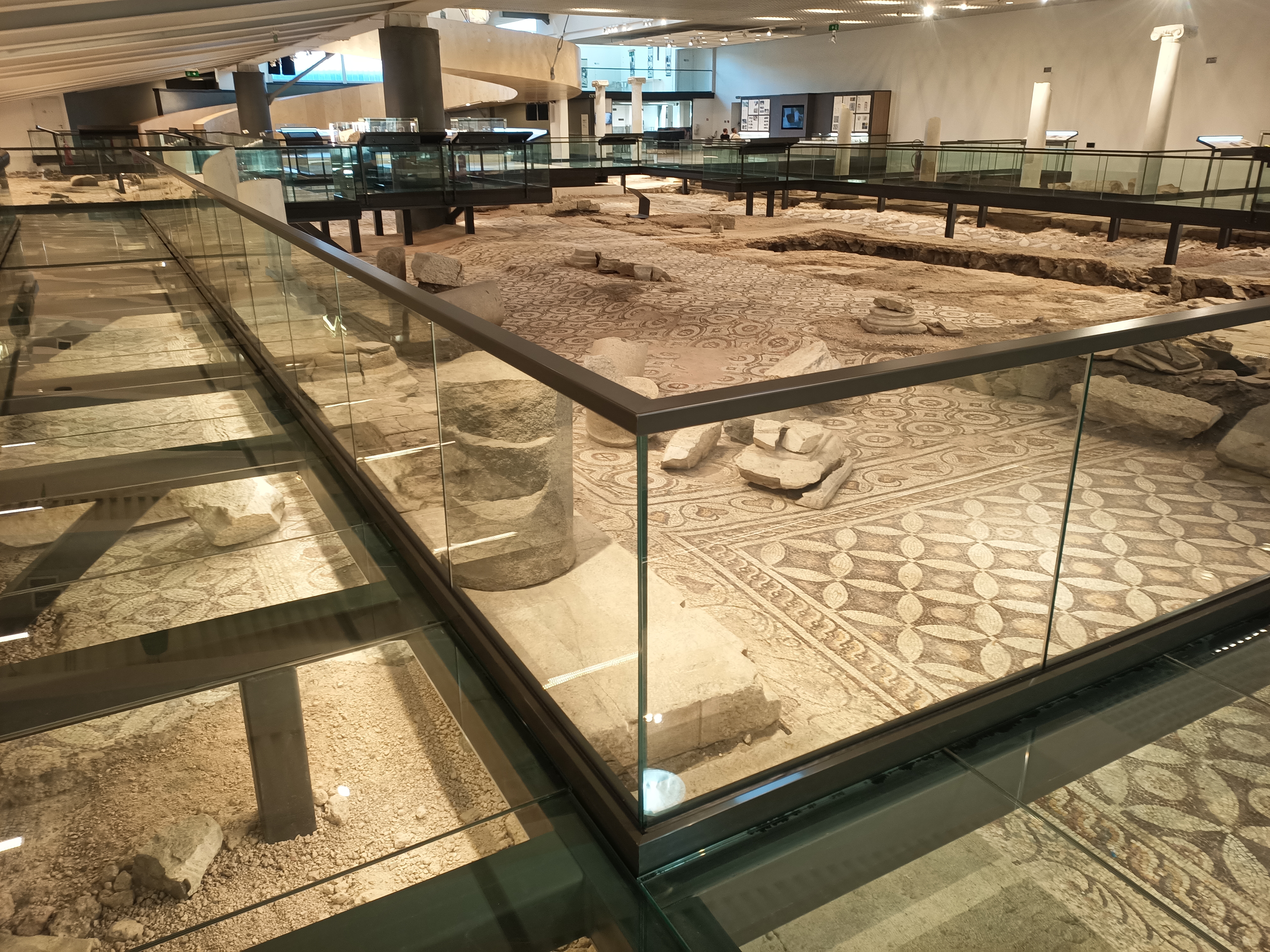 モザイク床上に張り巡らされたガラスの歩道を歩いて、全体をくまなく見学できるようになっている。