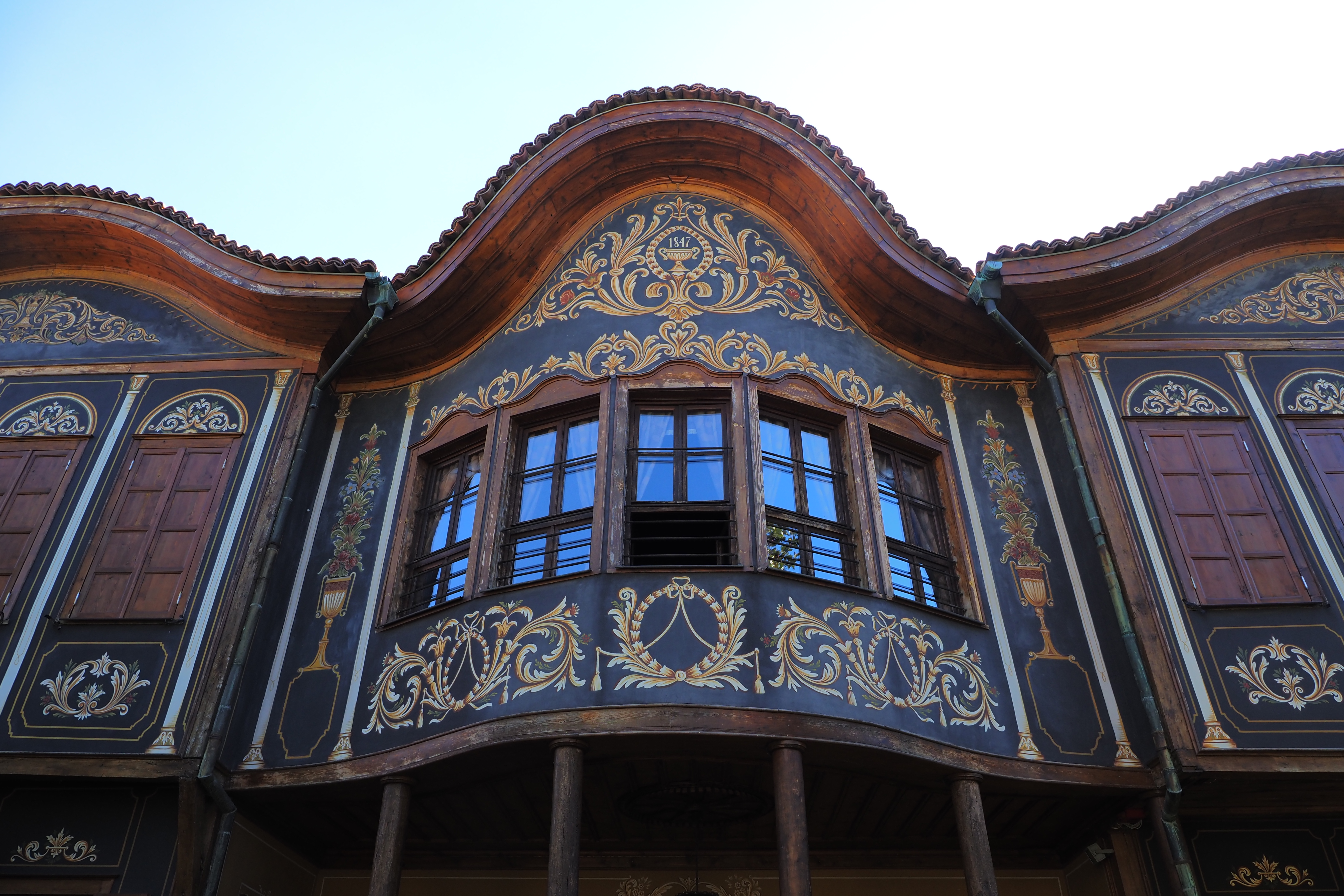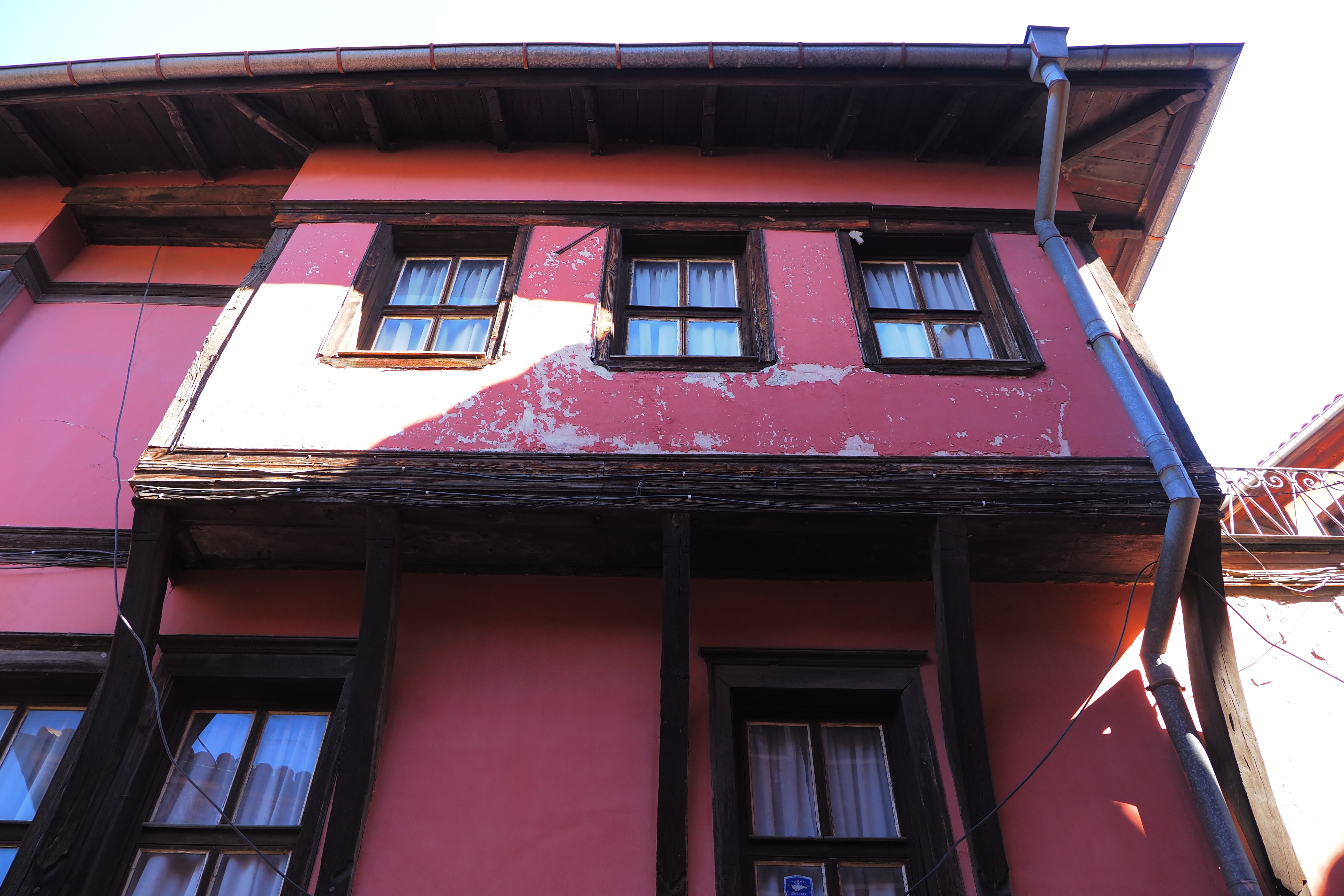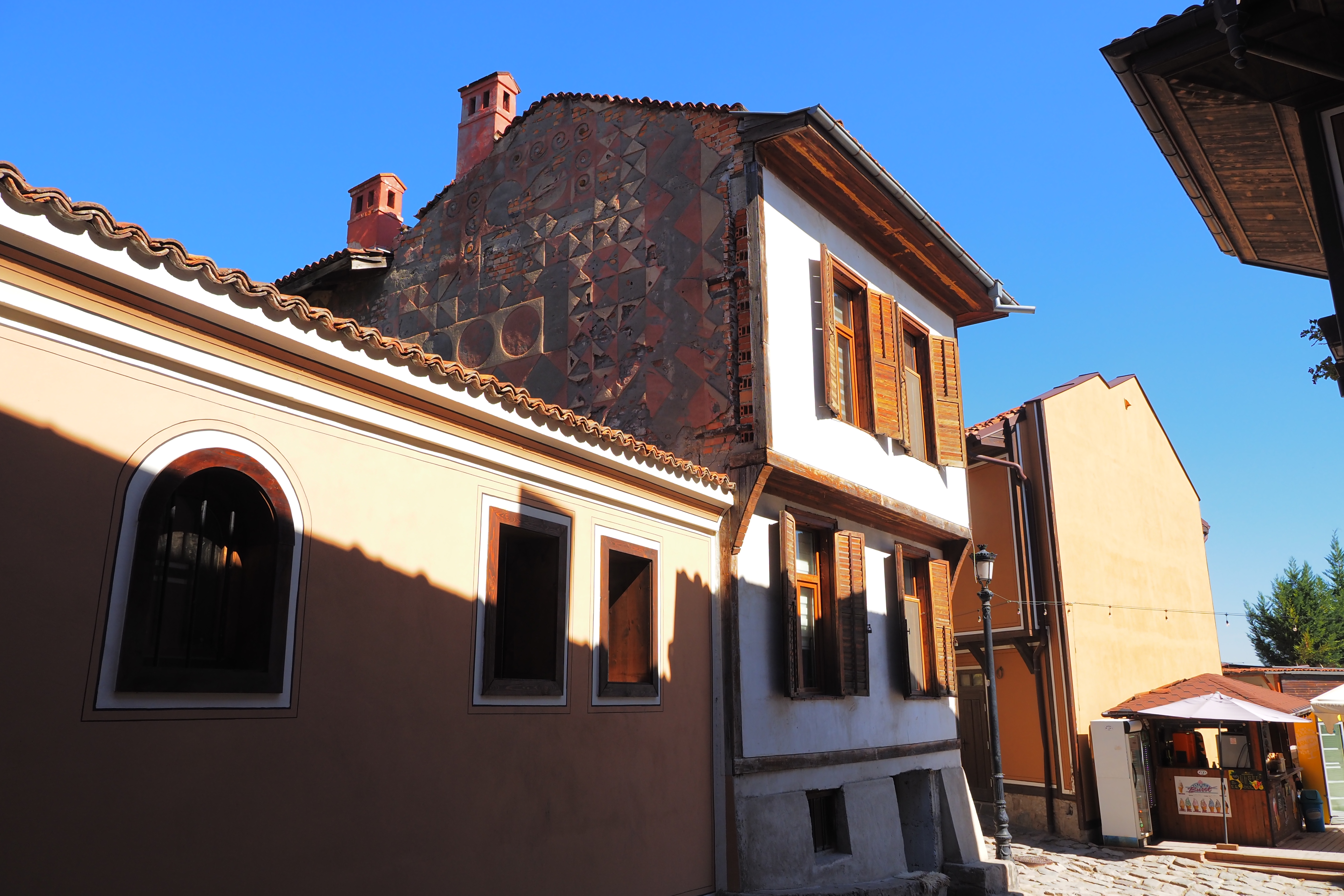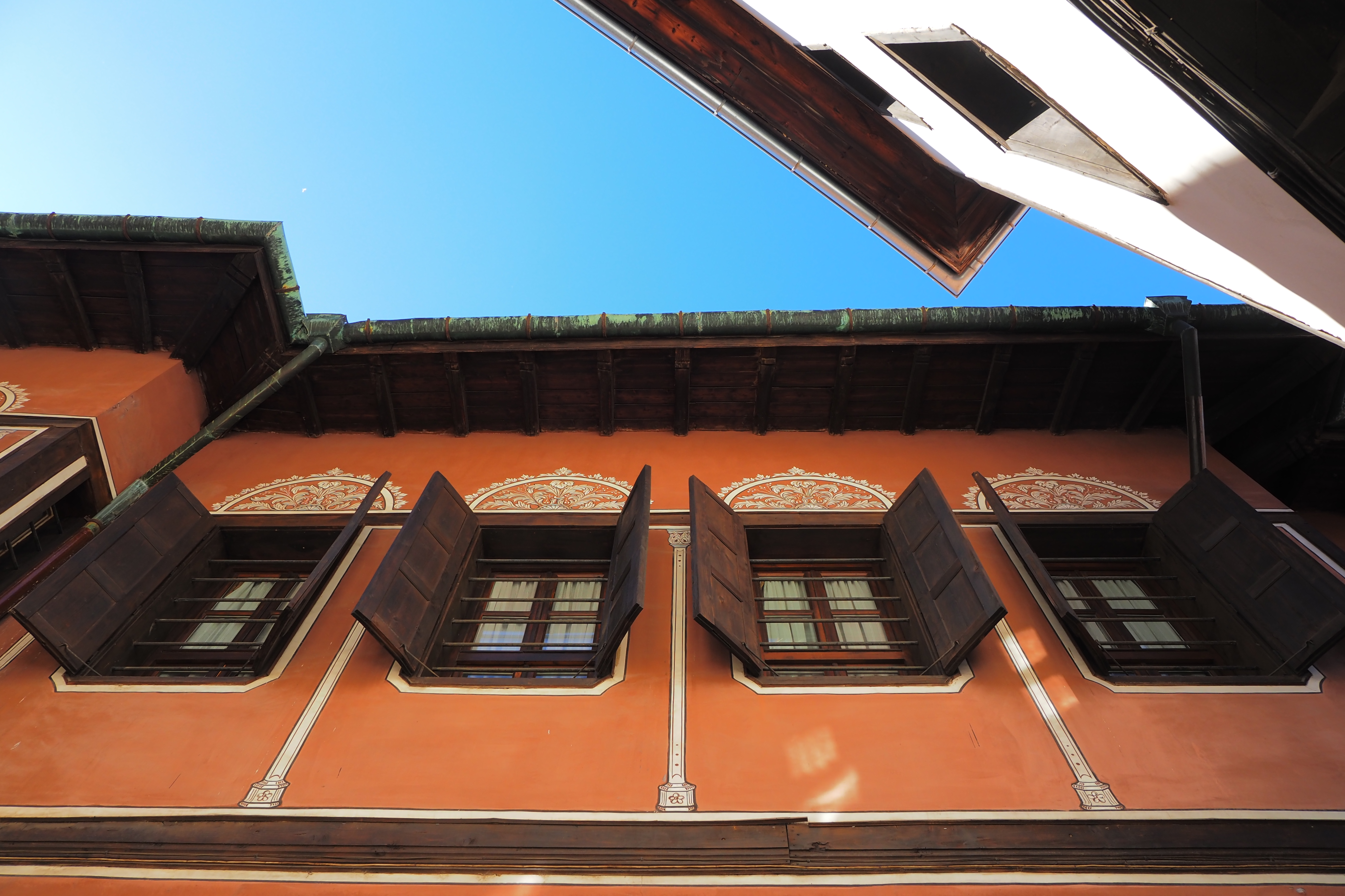 これは「ブルガリア復興様式」とよばれるもので、19世紀にオスマン帝国から解放され自治が始まると、ブルガリア民族復興運動の中心的な都市だったプロヴディヴには経済的に成功した裕福な市民が出てきて、彼らは民族アイデンティティを示す手段としてこういった邸宅を建てたらしい。上層階が張り出した様式なんかは、オスマン建築の影響も強く受けている。