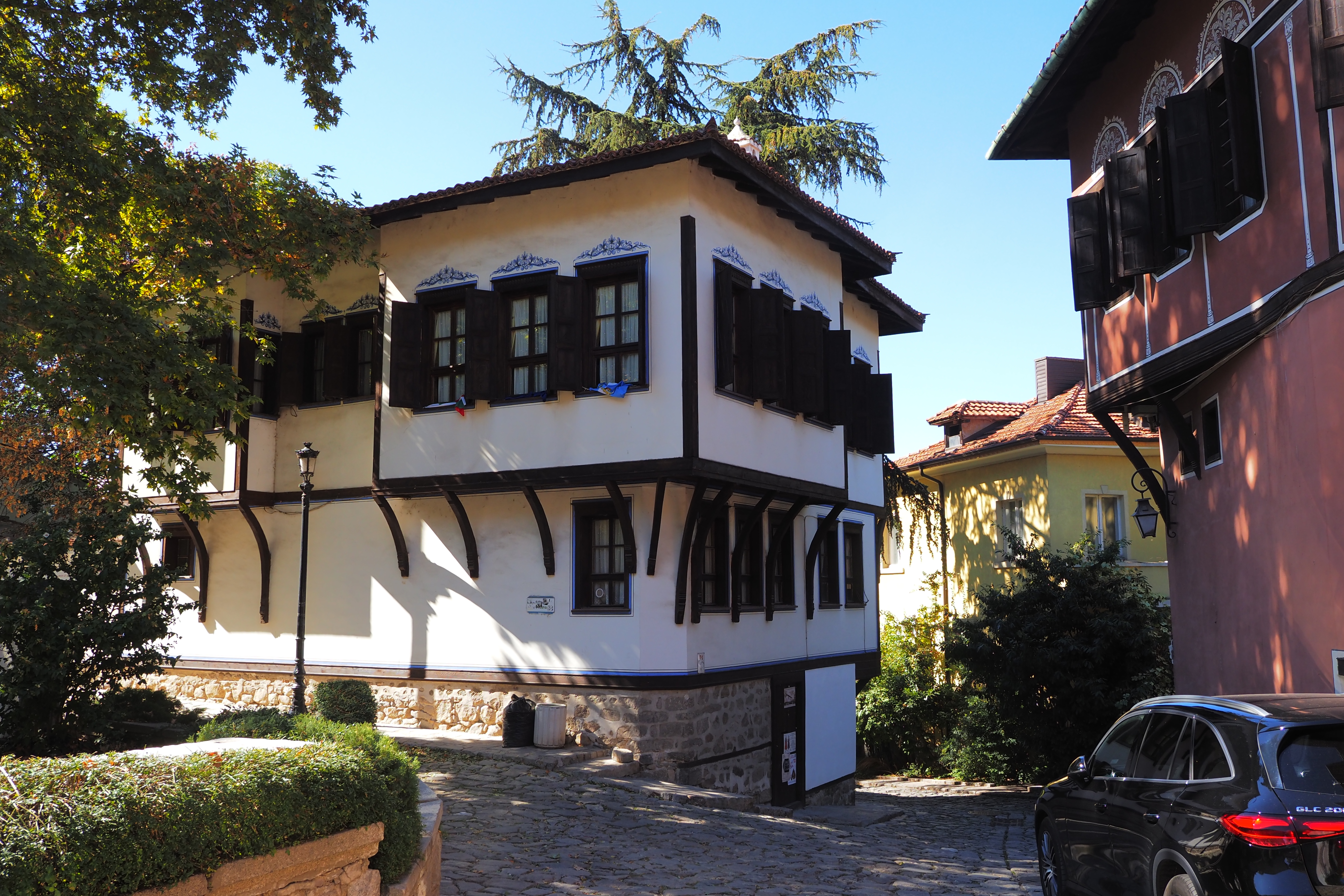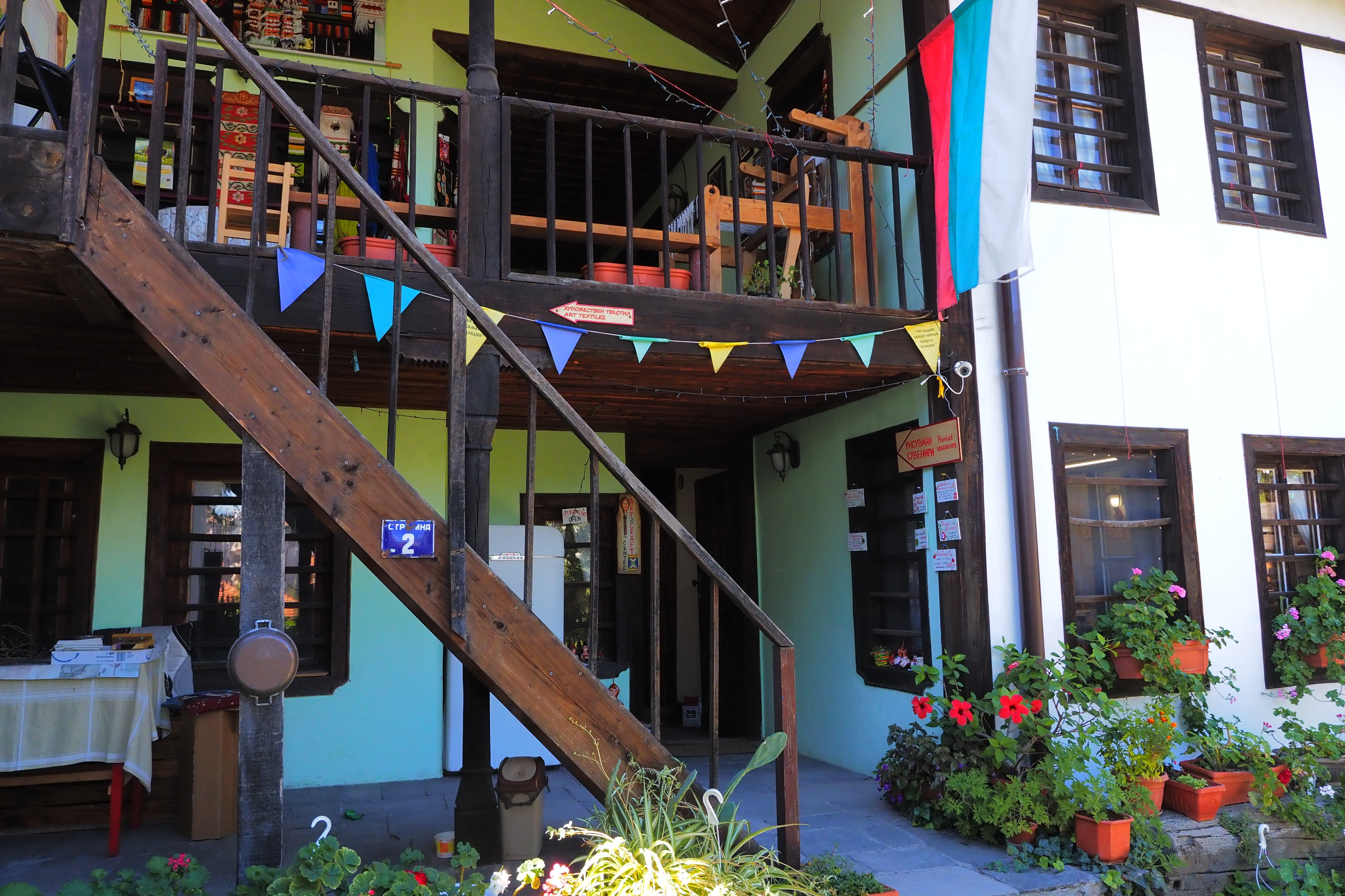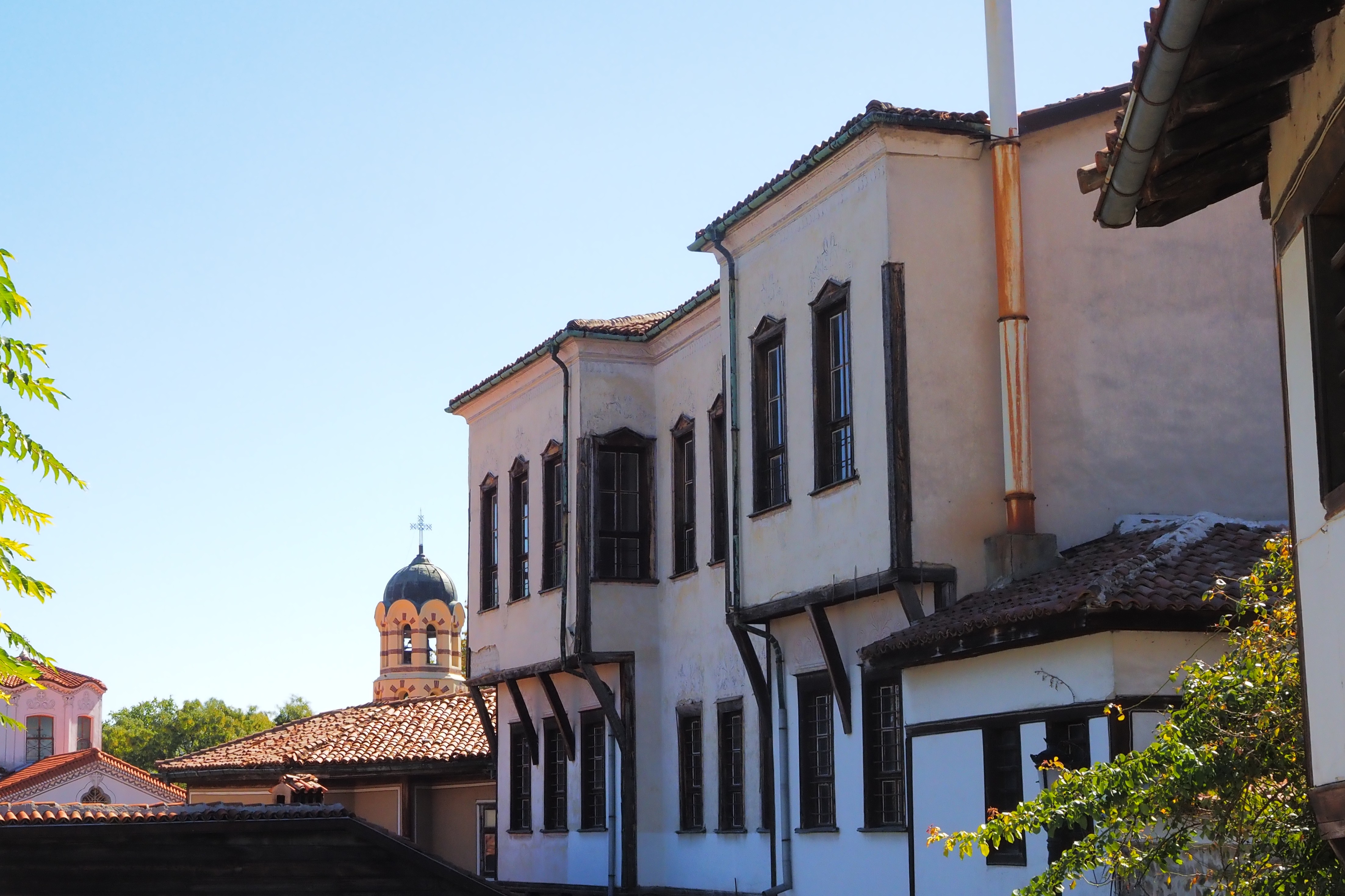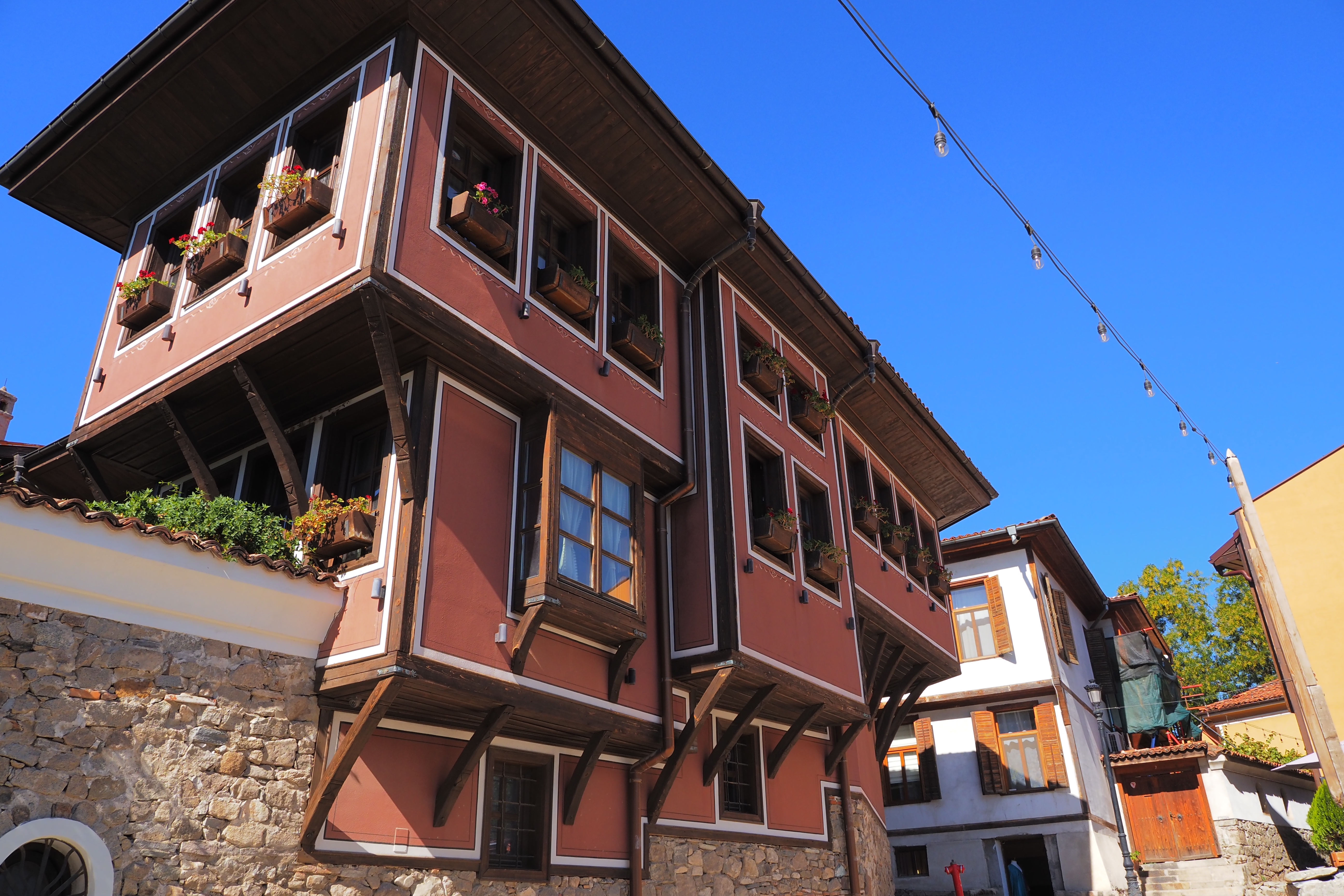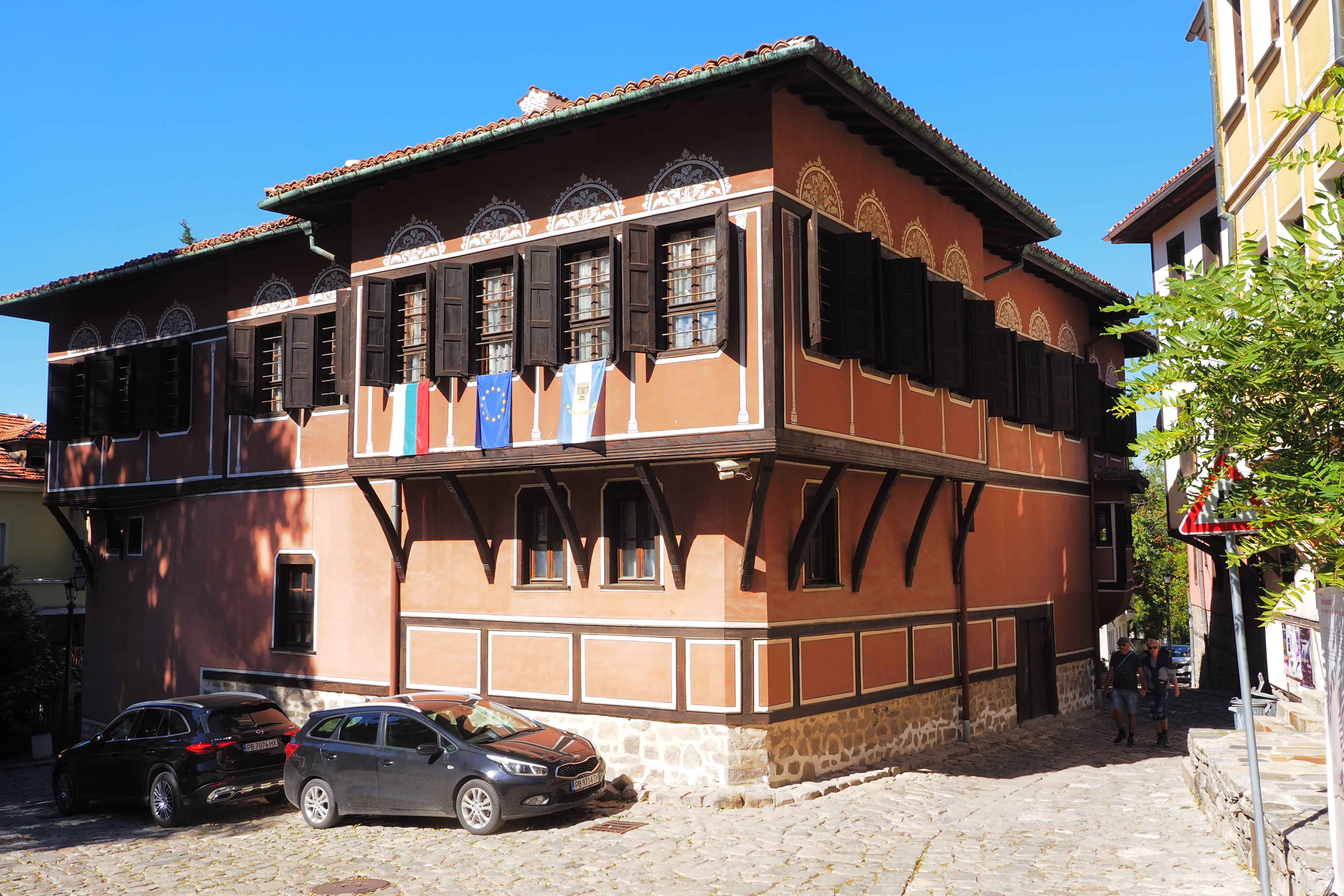 これは「ブルガリア復興様式」とよばれるもので、19世紀にオスマン帝国から解放され自治が始まると、ブルガリア民族復興運動の中心的な都市だったプロヴディヴには経済的に成功した裕福な市民が出てきて、彼らは民族アイデンティティを示す手段としてこういった邸宅を建てたらしい。上層階が張り出した様式なんかは、オスマン建築の影響も強く受けている。