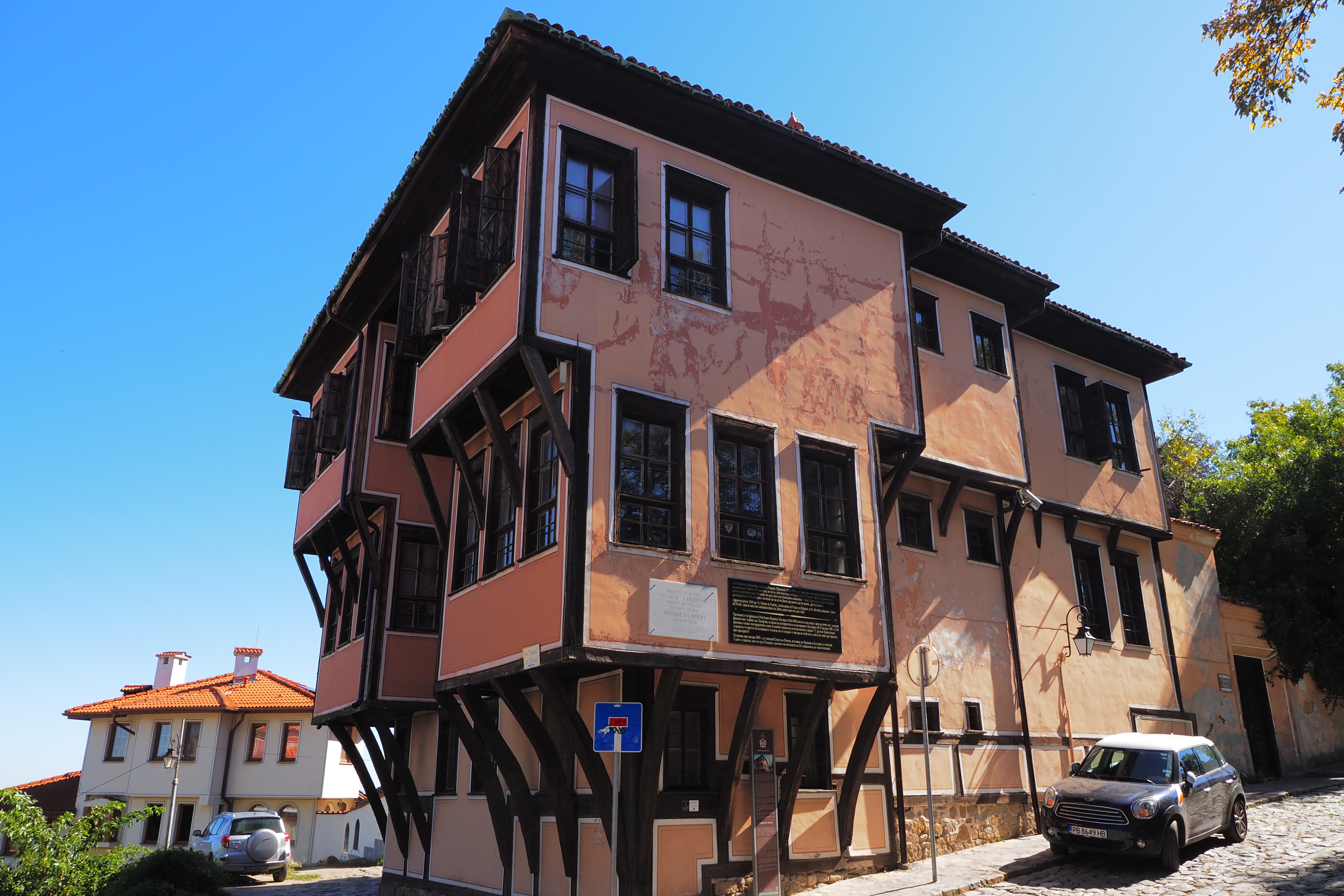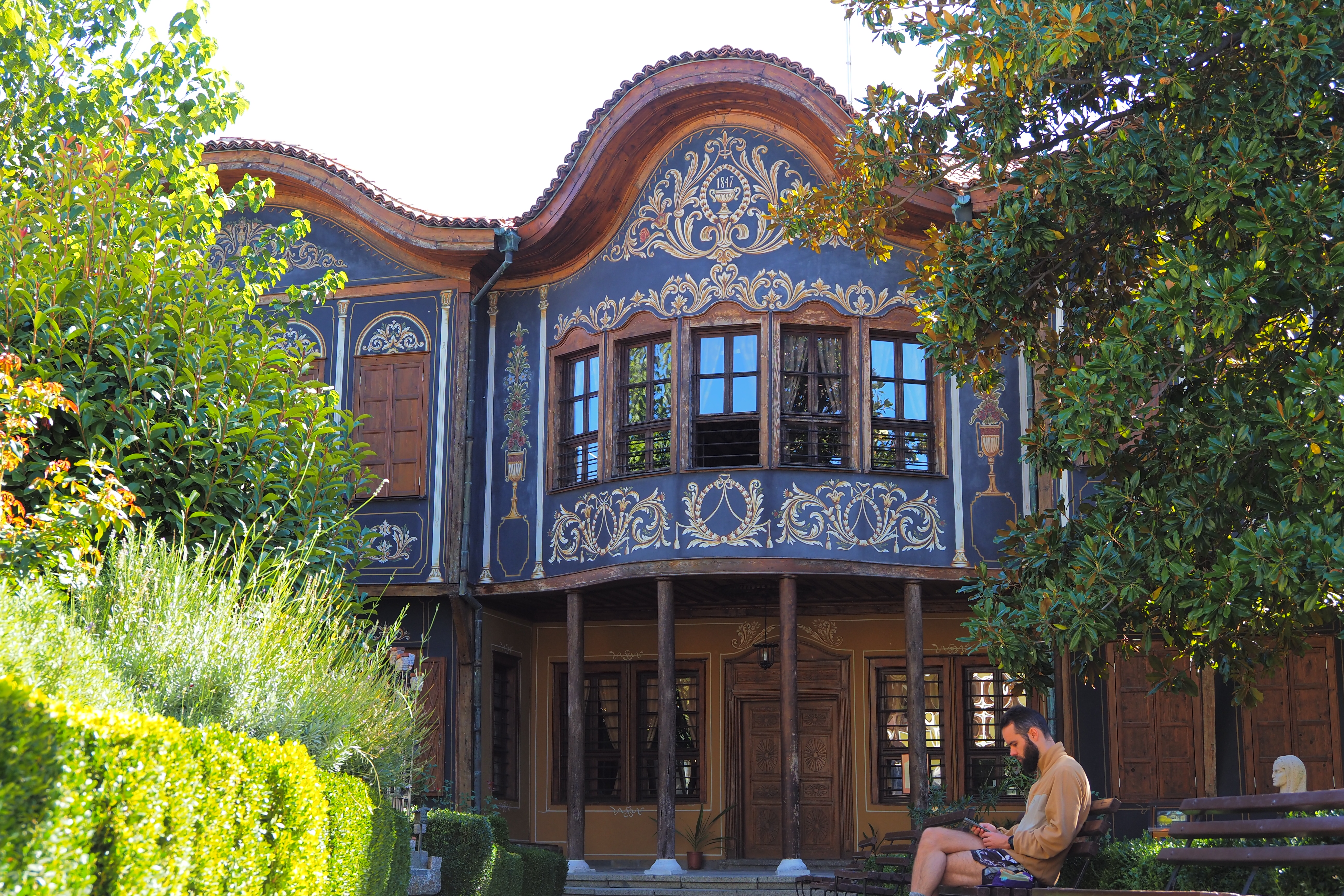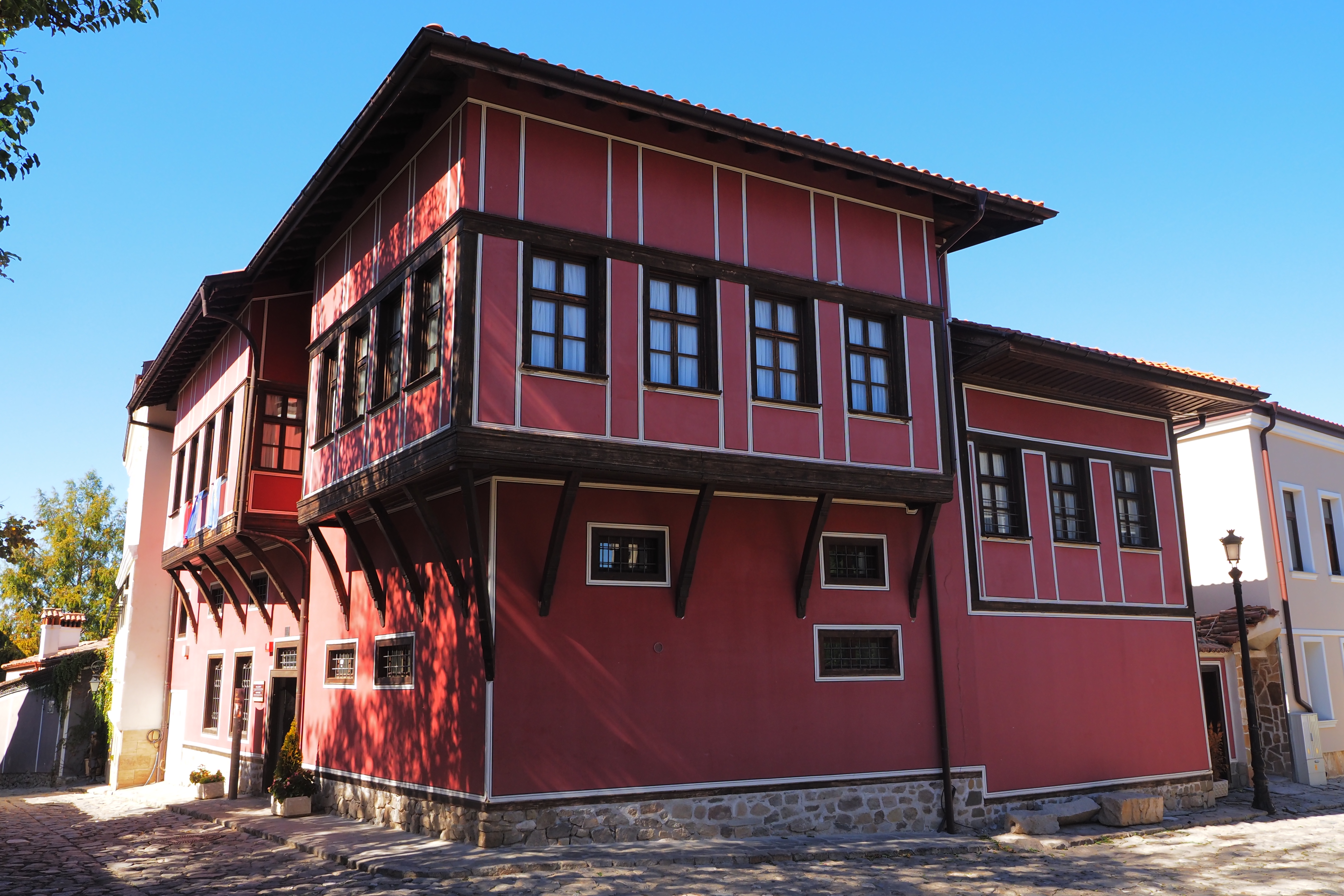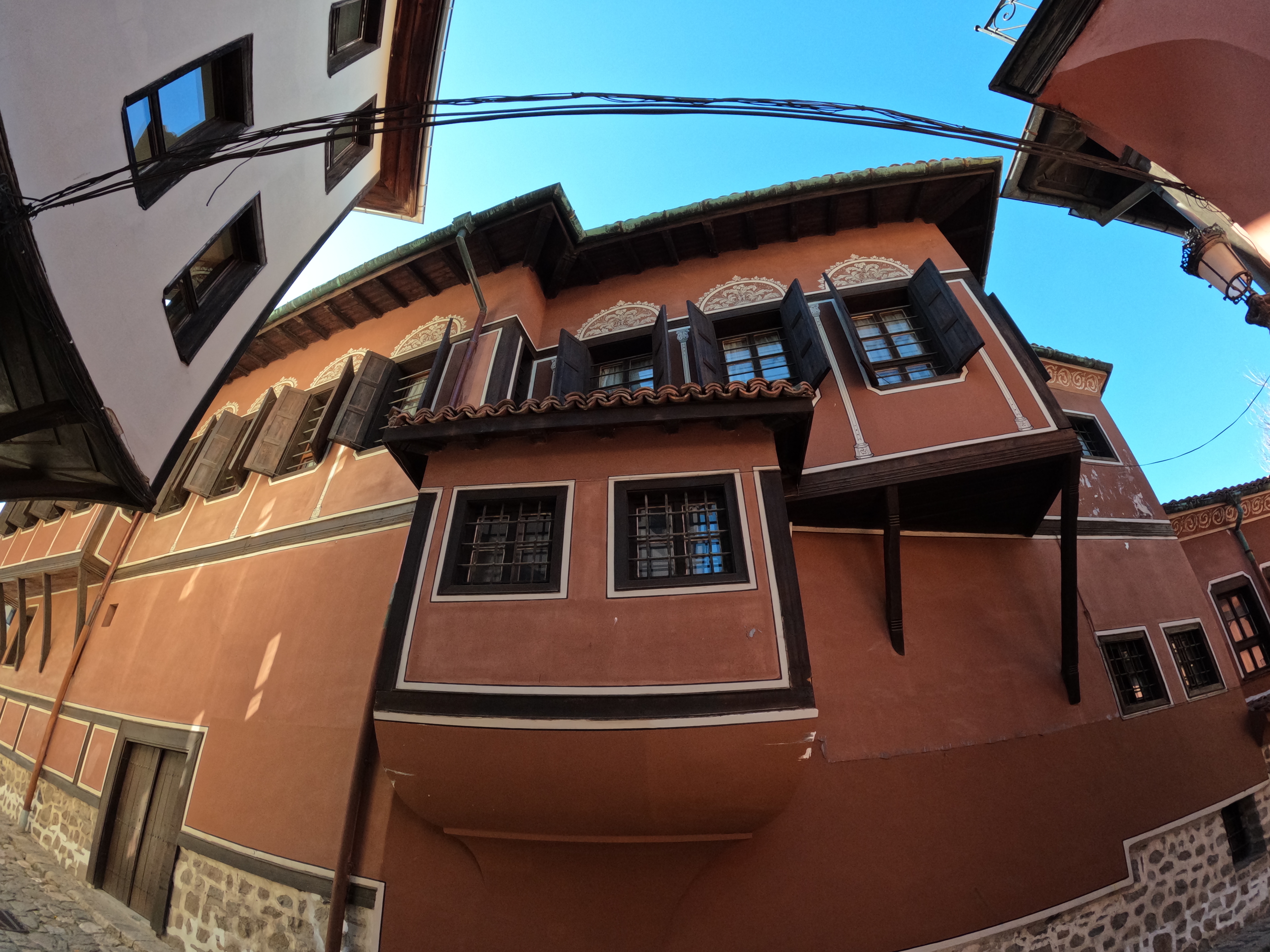 これは「ブルガリア復興様式」とよばれるもので、19世紀にオスマン帝国から解放され自治が始まると、ブルガリア民族復興運動の中心的な都市だったプロヴディヴには経済的に成功した裕福な市民が出てきて、彼らは民族アイデンティティを示す手段としてこういった邸宅を建てたらしい。上層階が張り出した様式なんかは、オスマン建築の影響も強く受けている。