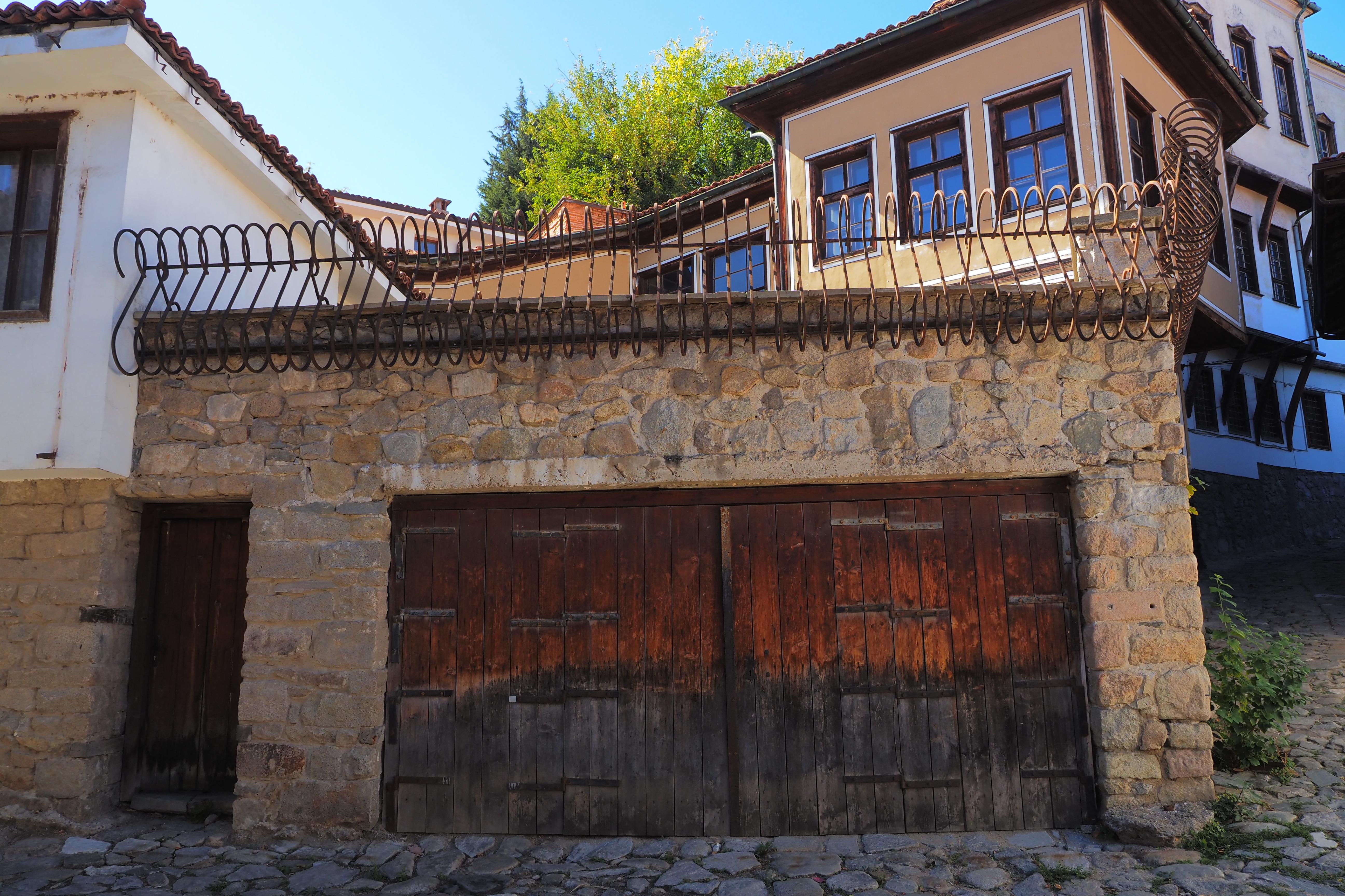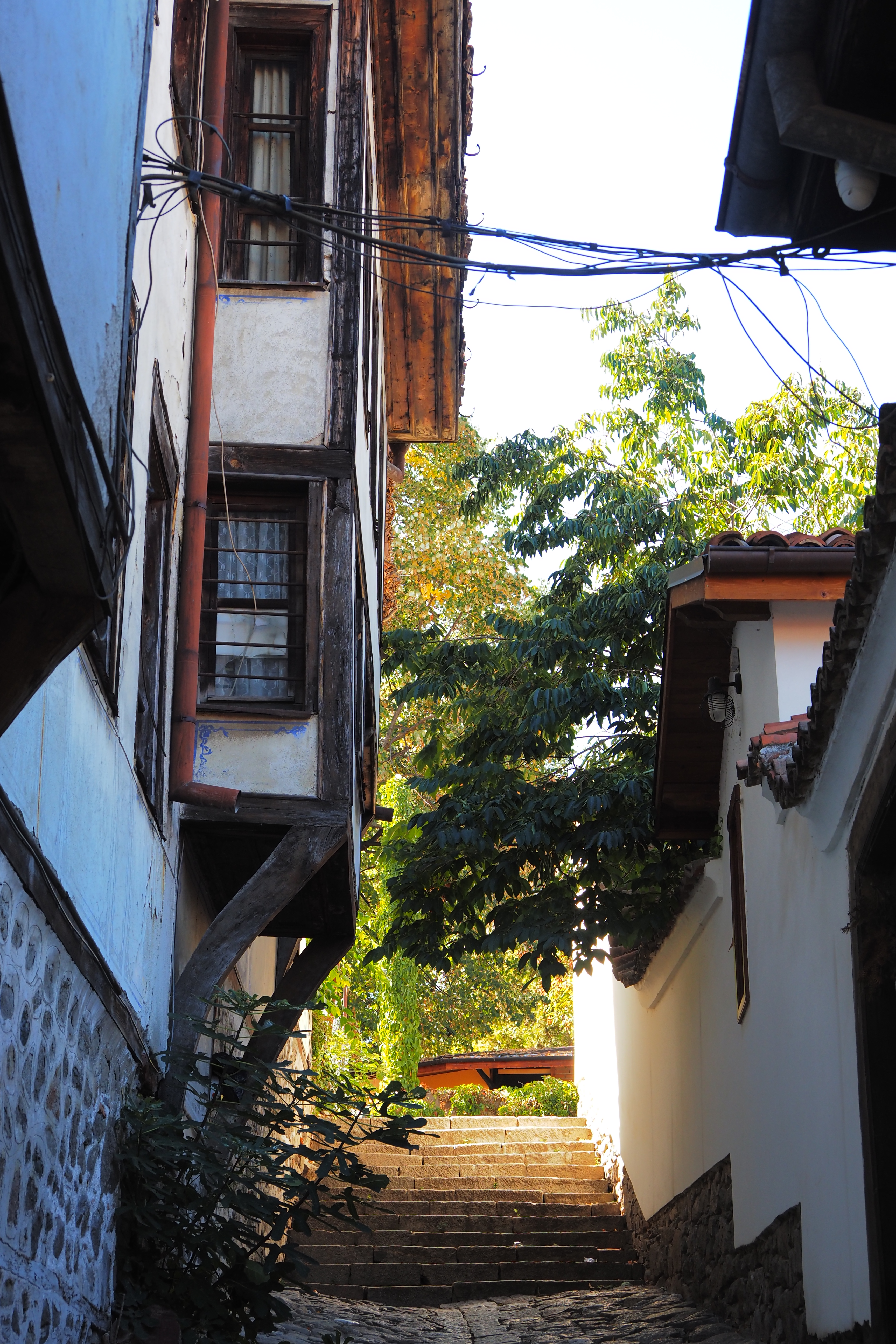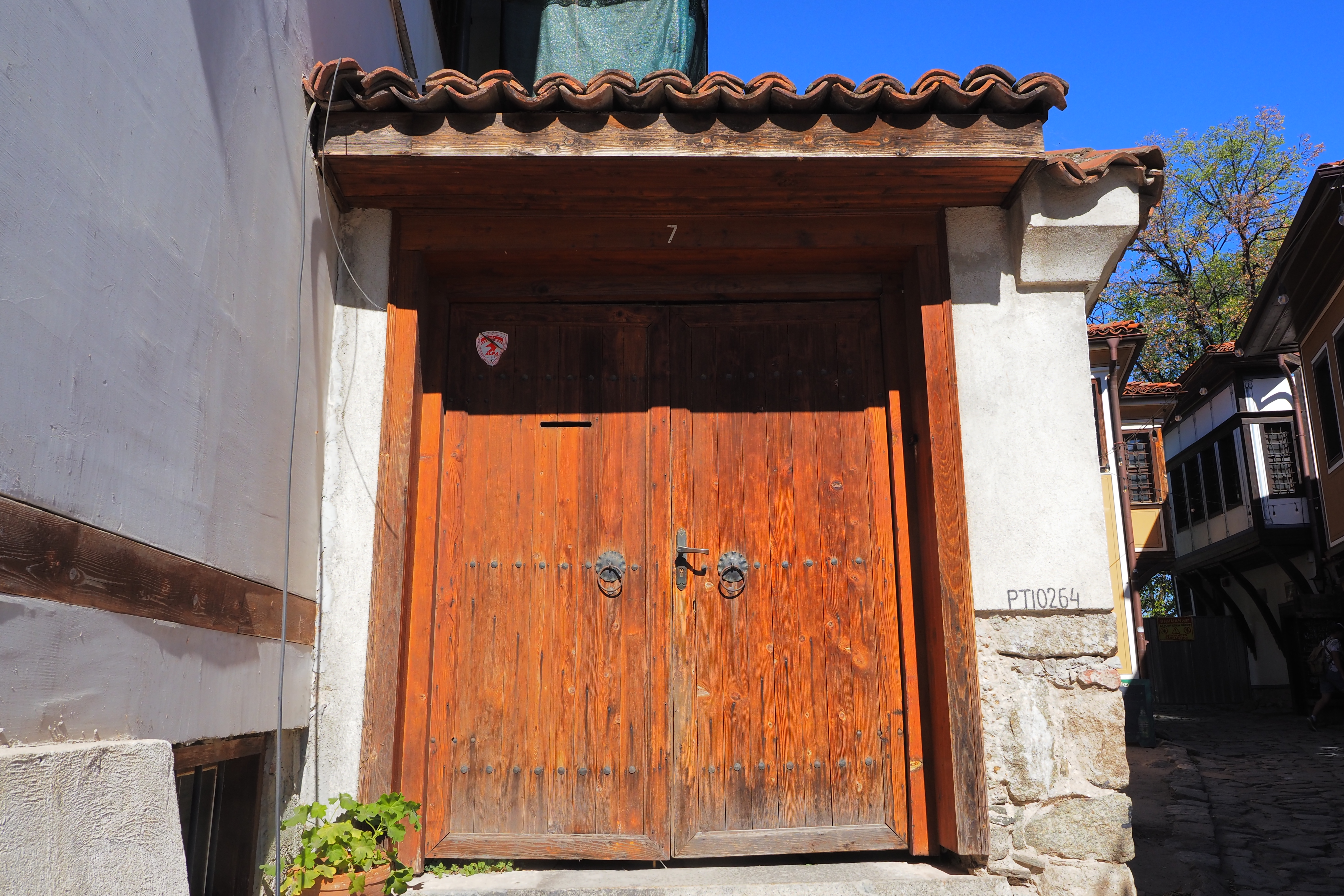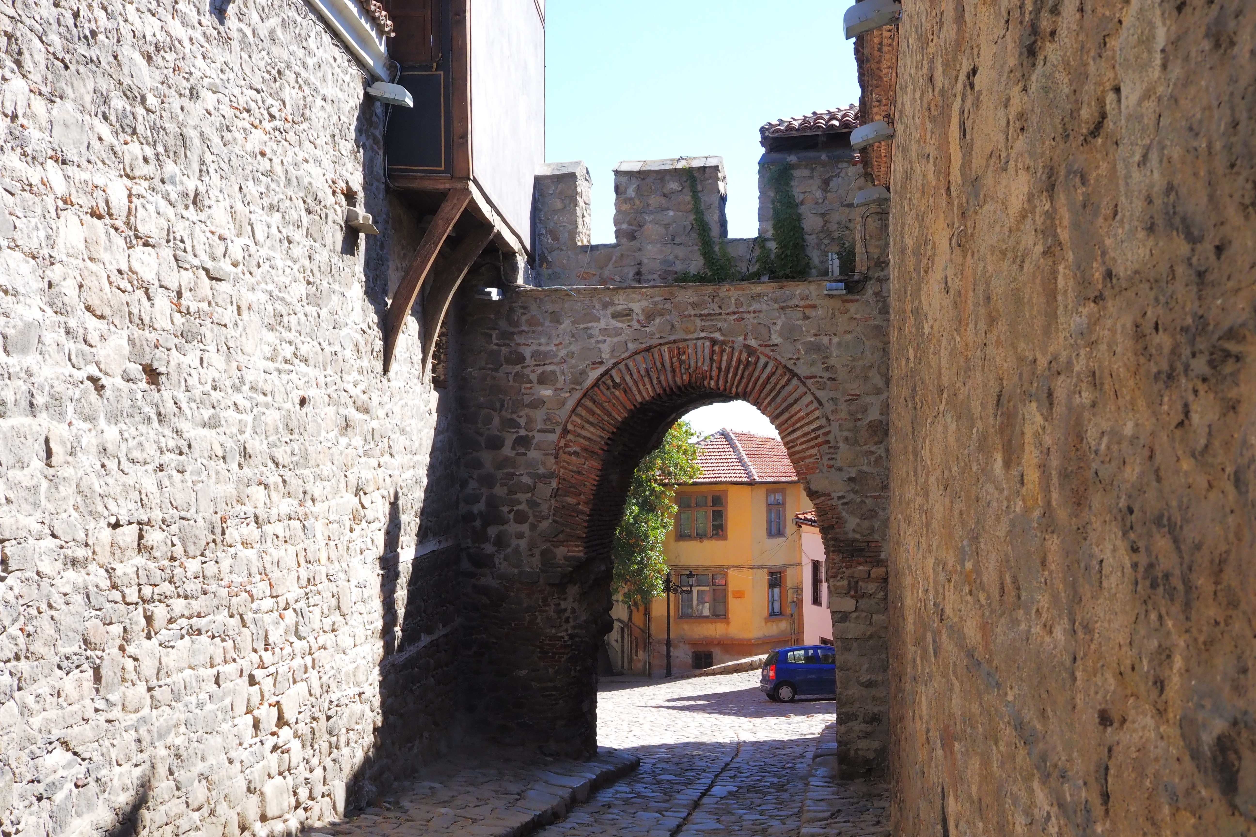 旧市街のブルガリア復興様式邸宅が軒を連ねる路地に架かる Хисар капия; ヒサルカピアと呼ばれる城壁門。基礎は2世紀頃のローマ期のもので、11~14世紀頃、第2ブルガリア帝国のときに現在の姿になったらしい。