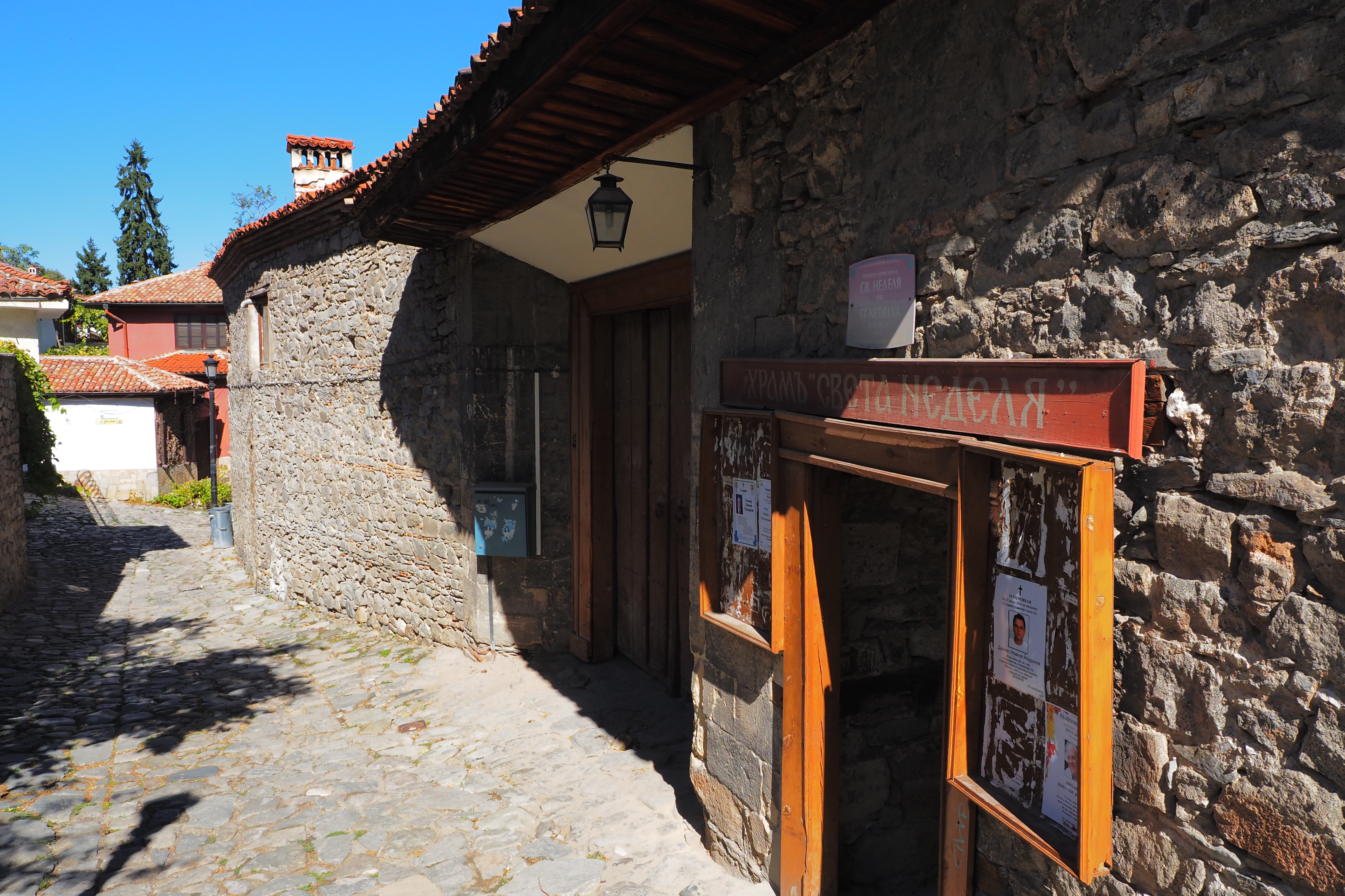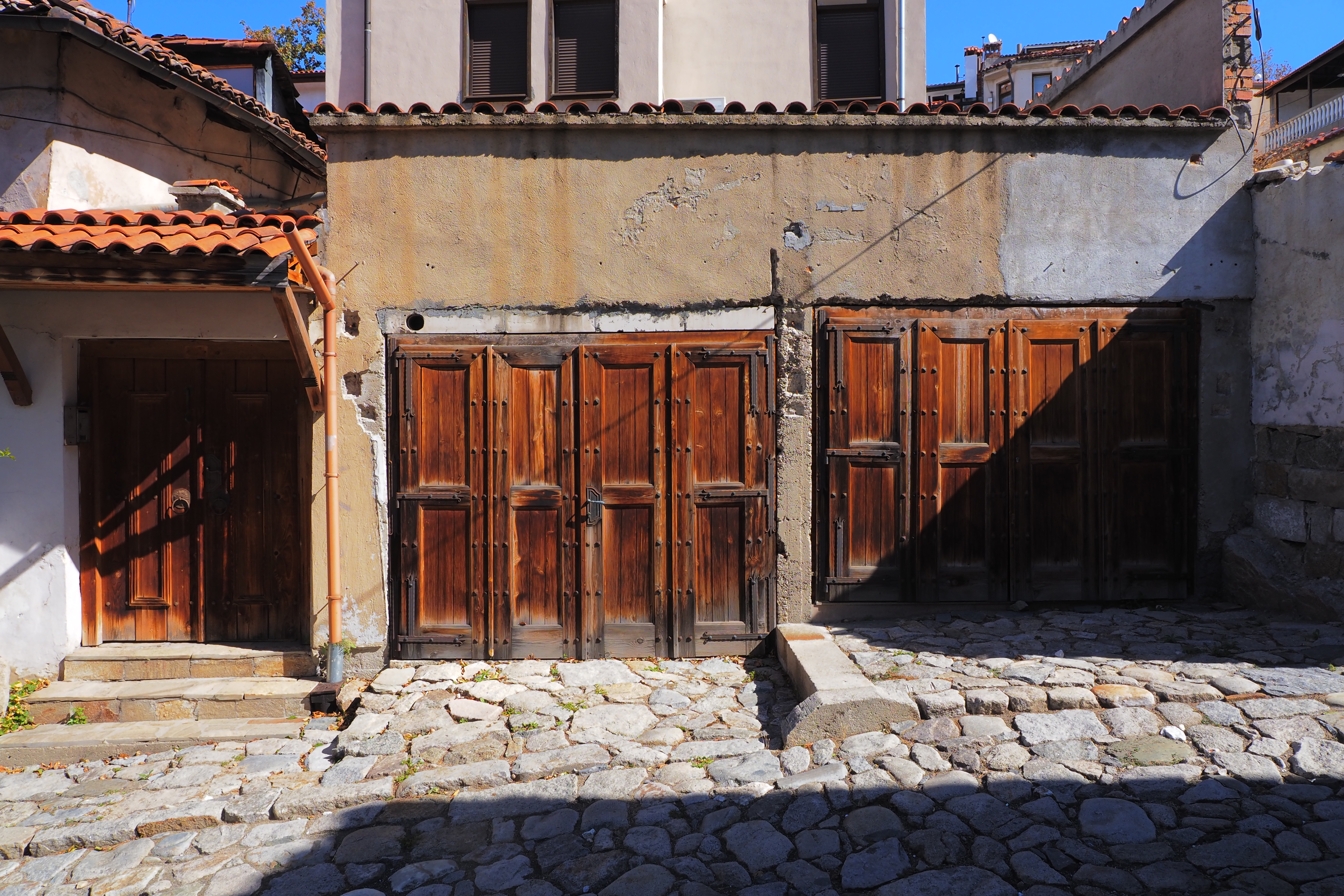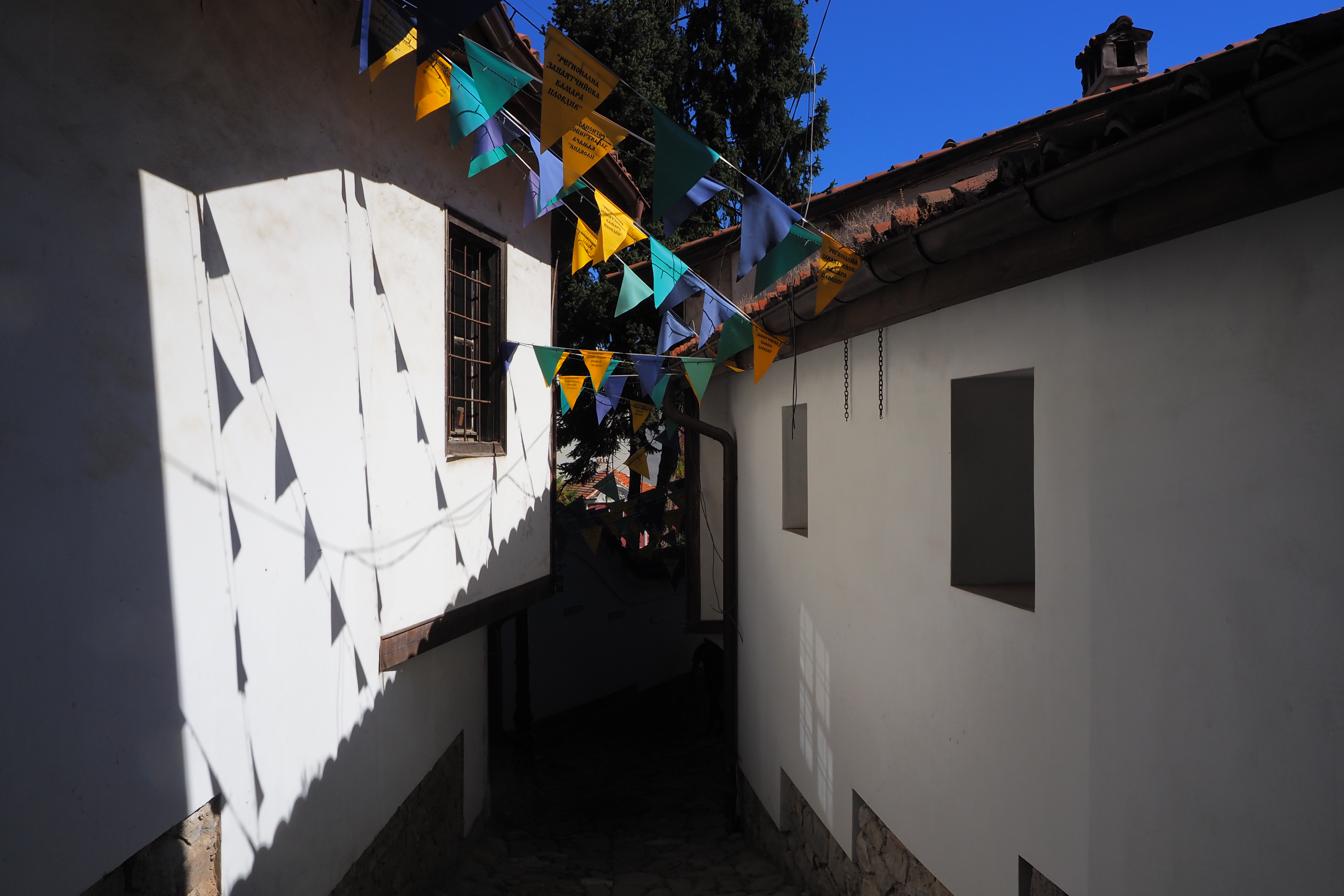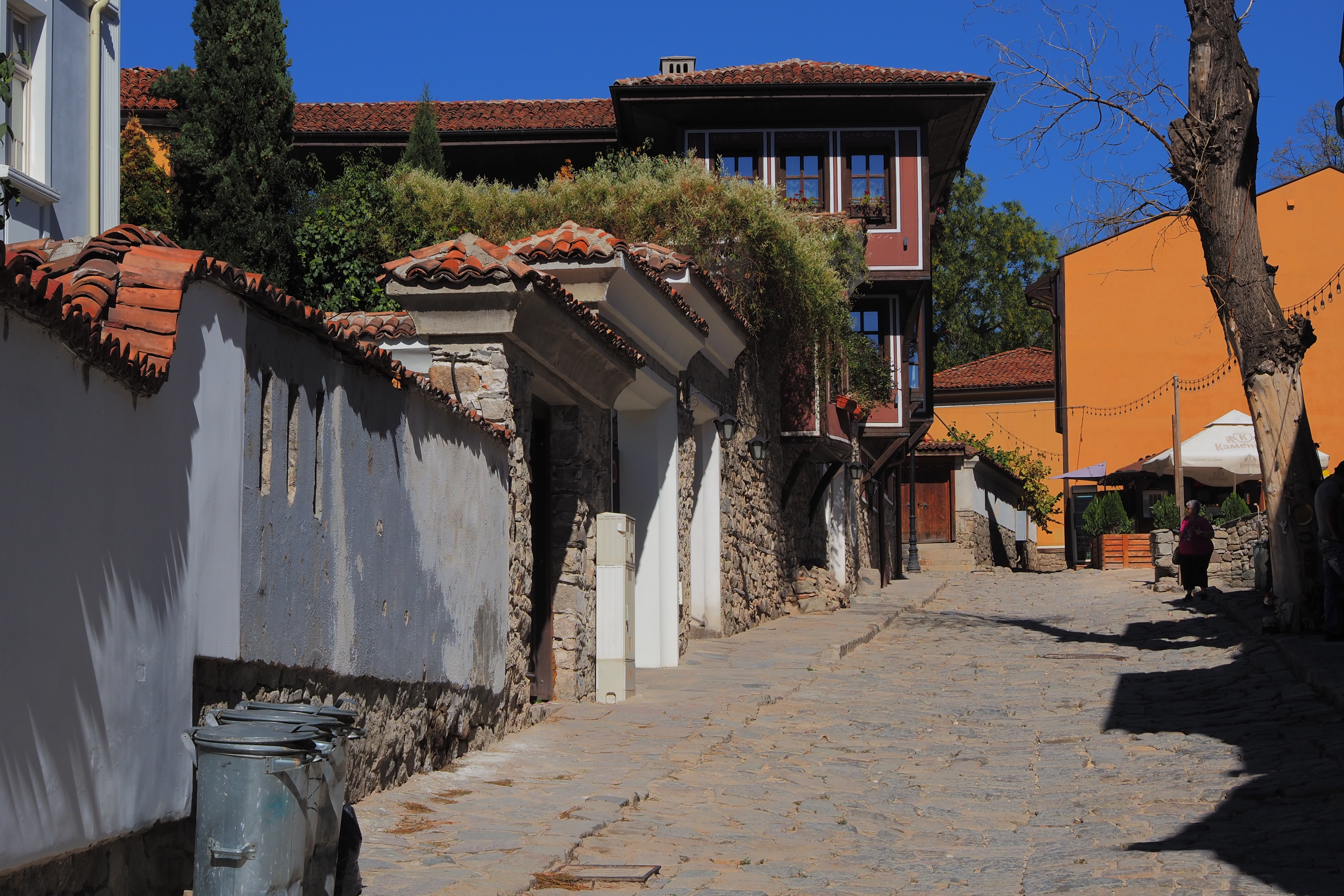 旧市街のブルガリア復興様式邸宅が軒を連ねる路地に架かる Хисар капия; ヒサルカピアと呼ばれる城壁門。基礎は2世紀頃のローマ期のもので、11~14世紀頃、第2ブルガリア帝国のときに現在の姿になったらしい。