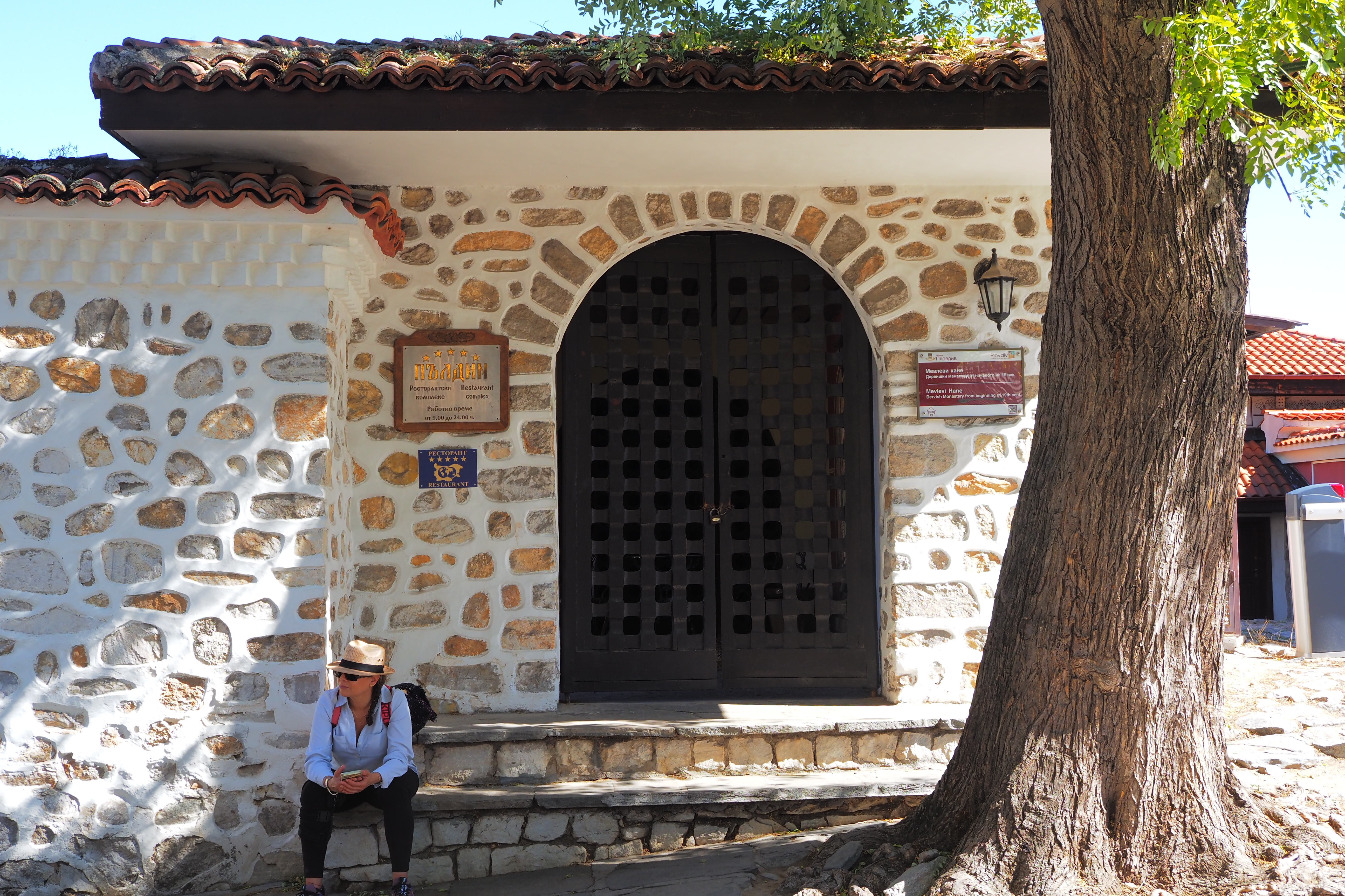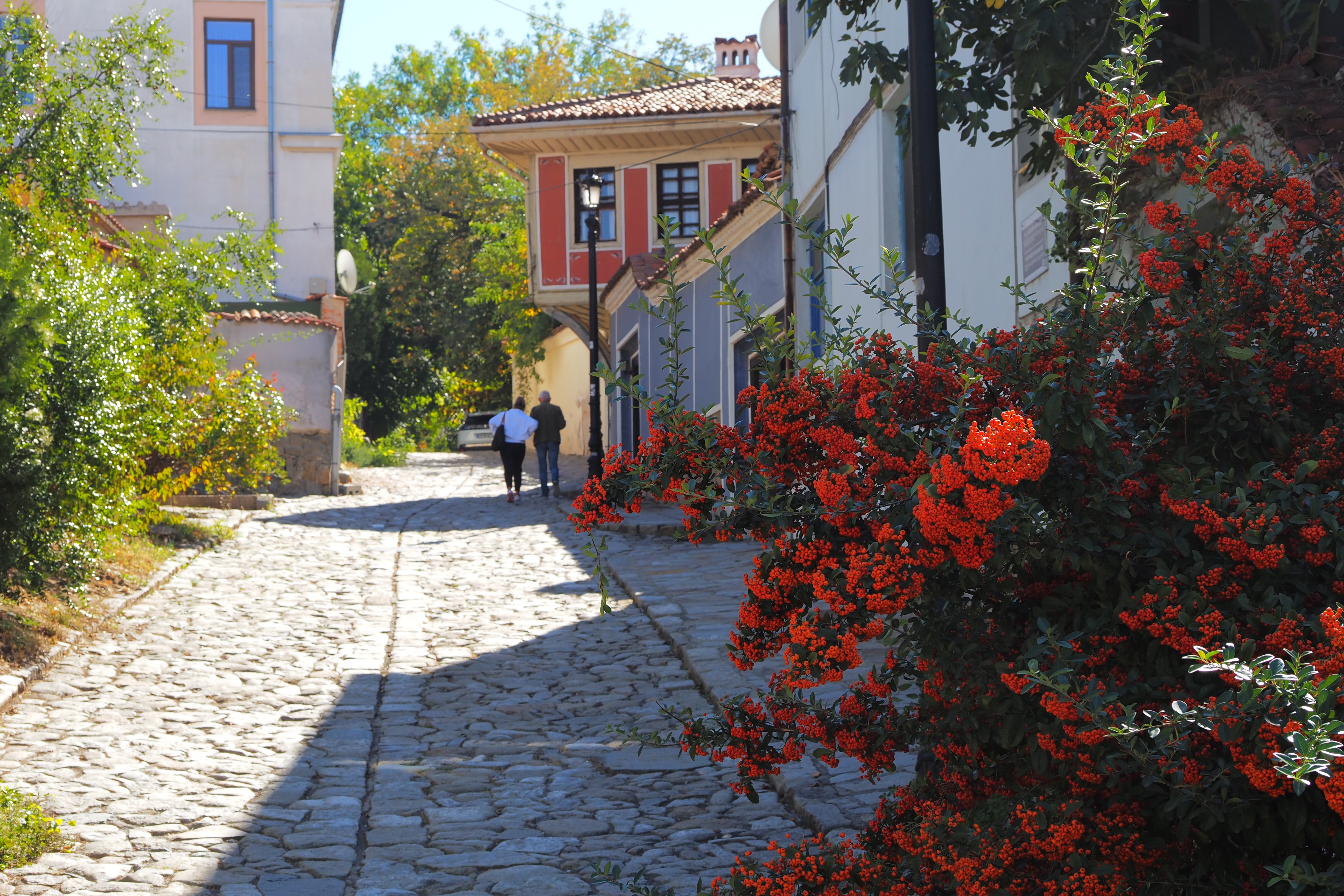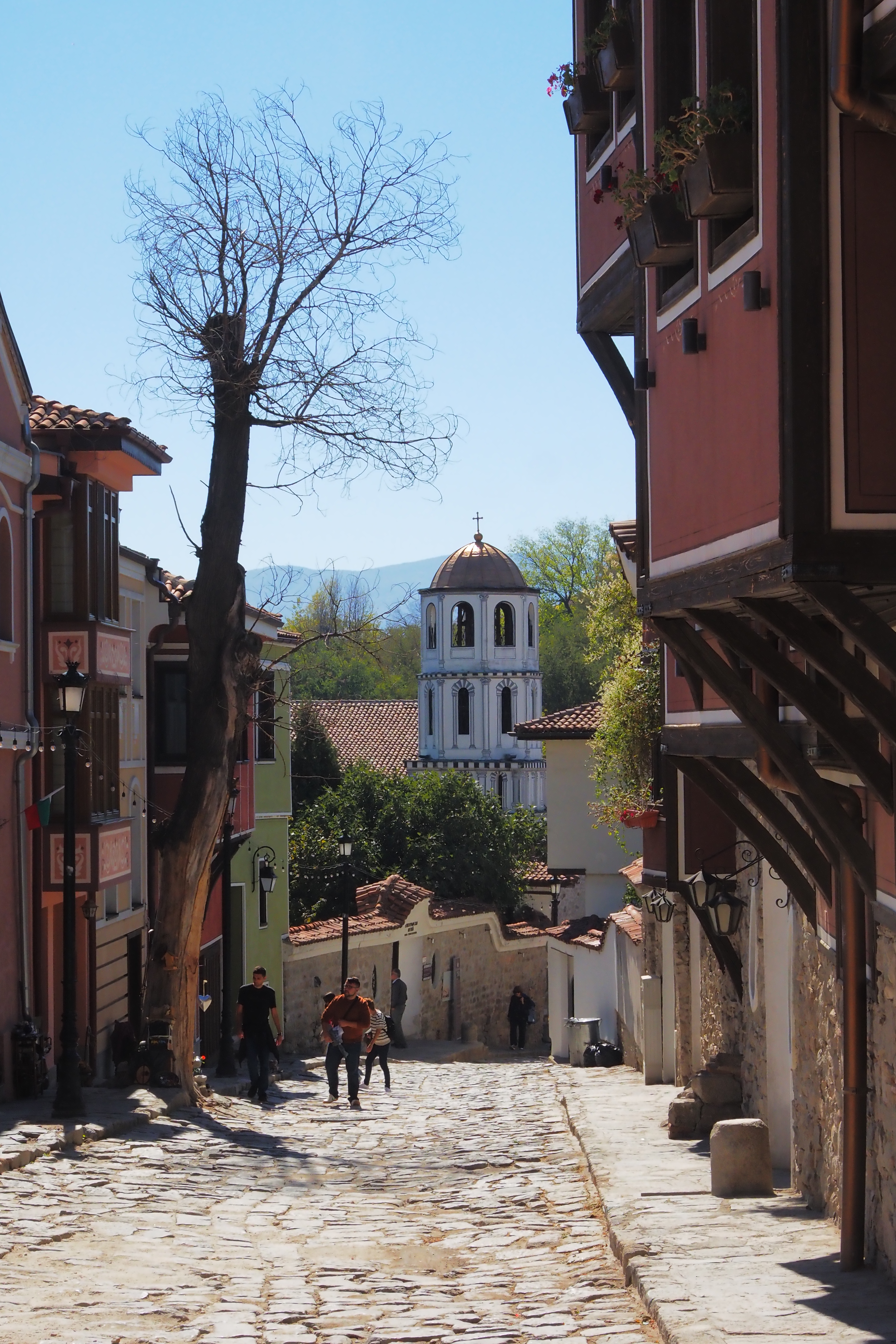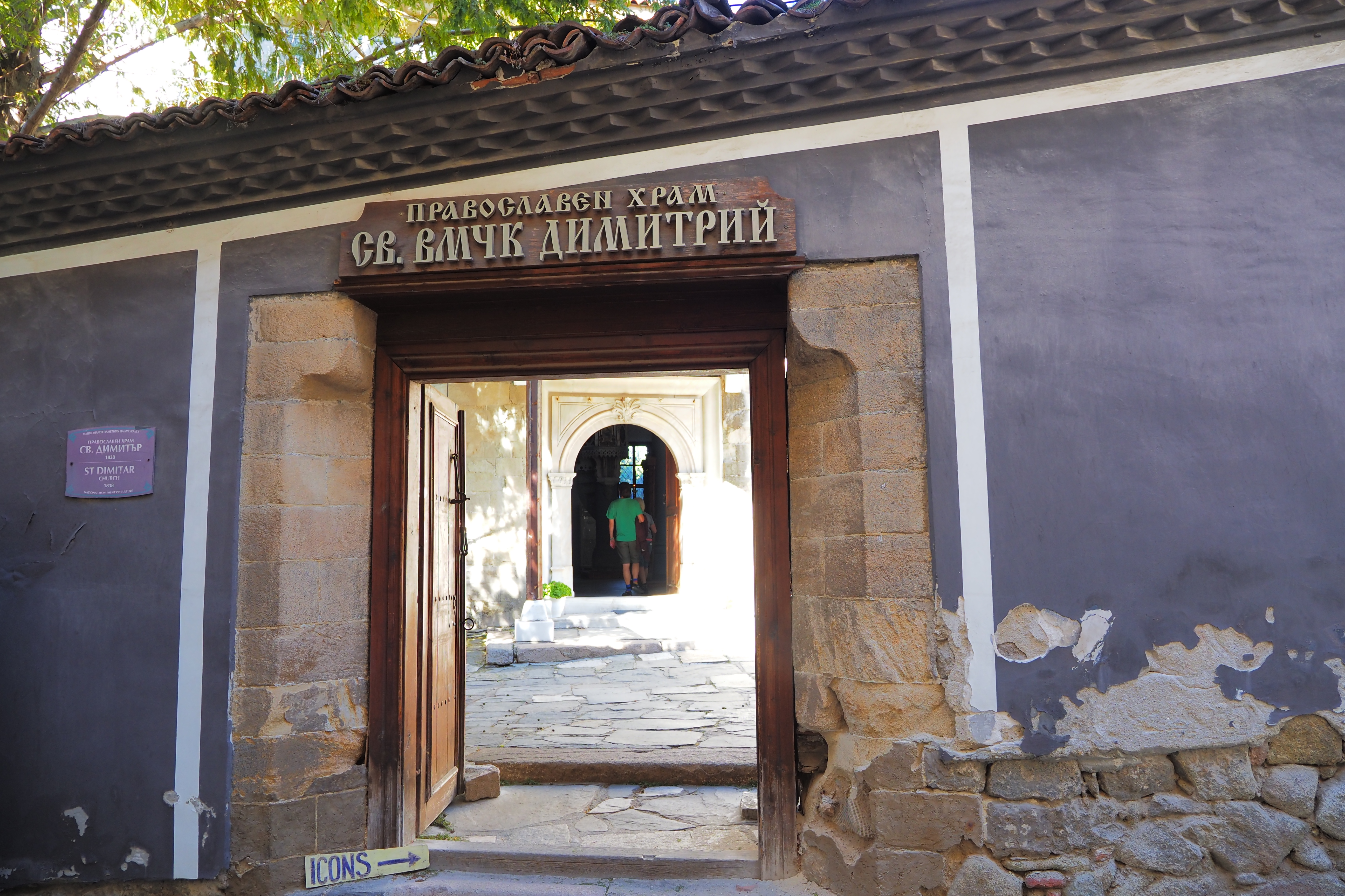 旧市街のブルガリア復興様式邸宅が軒を連ねる路地に架かる Хисар капия; ヒサルカピアと呼ばれる城壁門。基礎は2世紀頃のローマ期のもので、11~14世紀頃、第2ブルガリア帝国のときに現在の姿になったらしい。