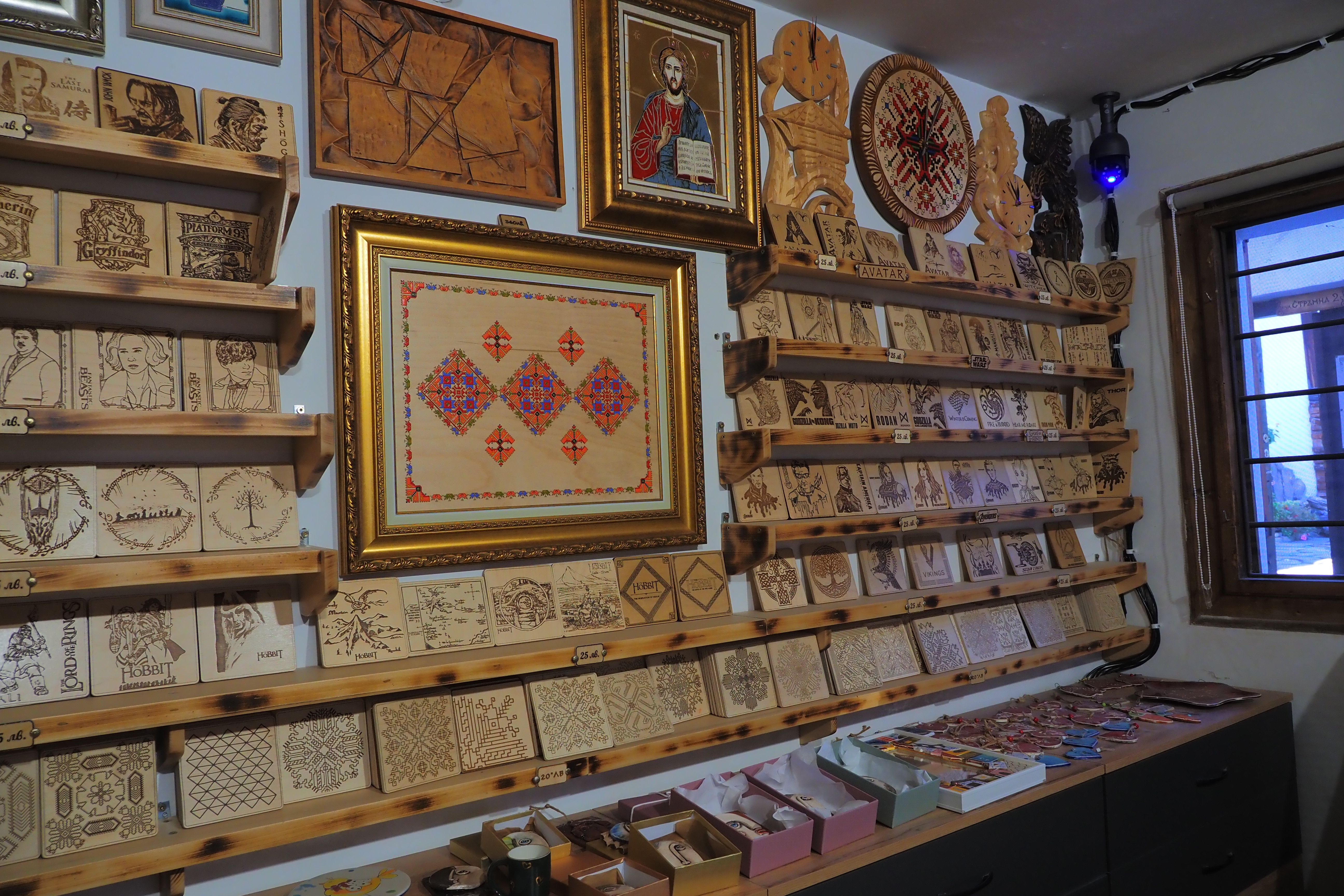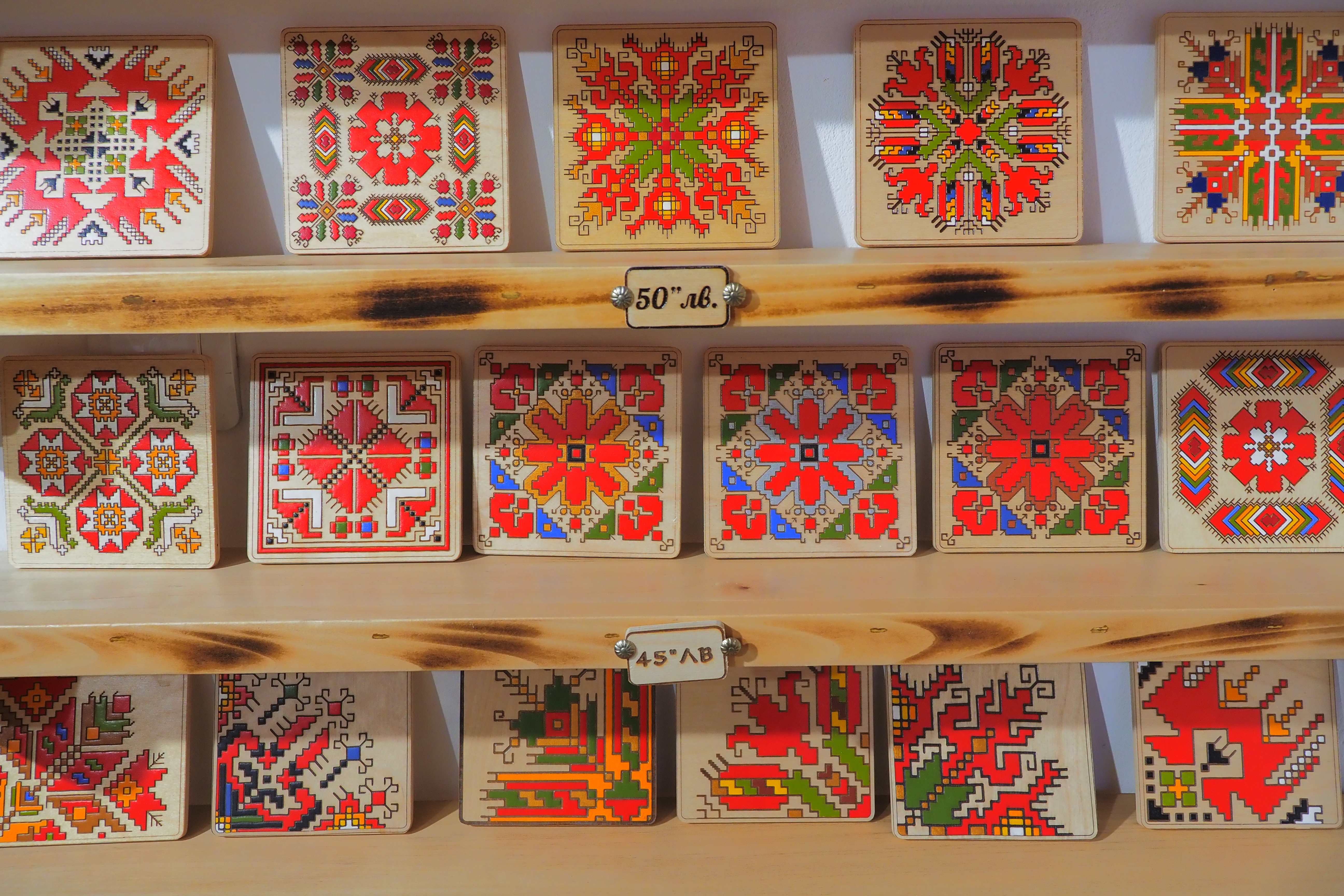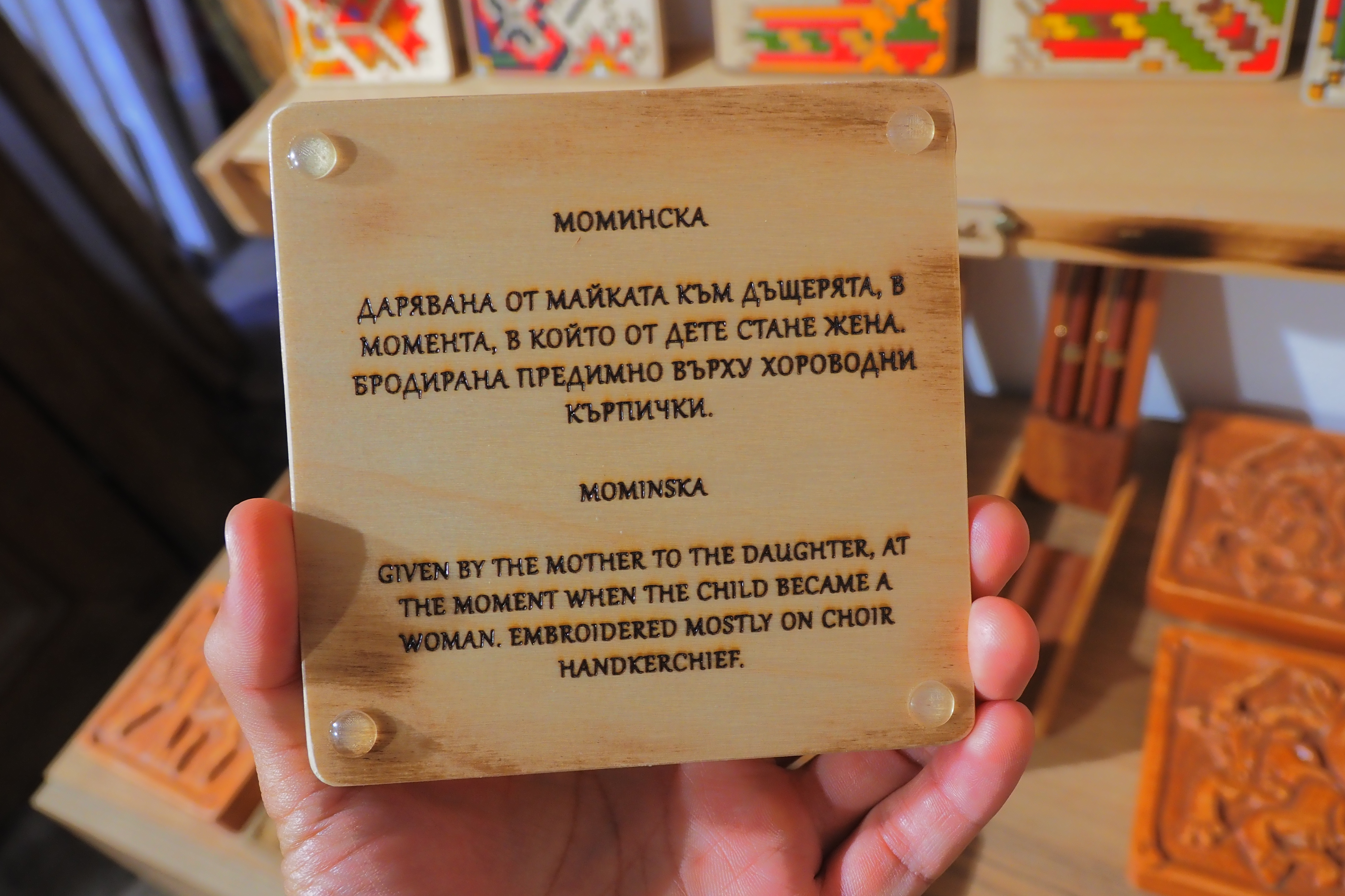 шевица; シェビスタ と呼ばれるブルガリアの伝統刺繍を木材にあしらったもの。コースターなのかな、裏面には各デザインにどんな意味があるかがレーザーで印字されている。