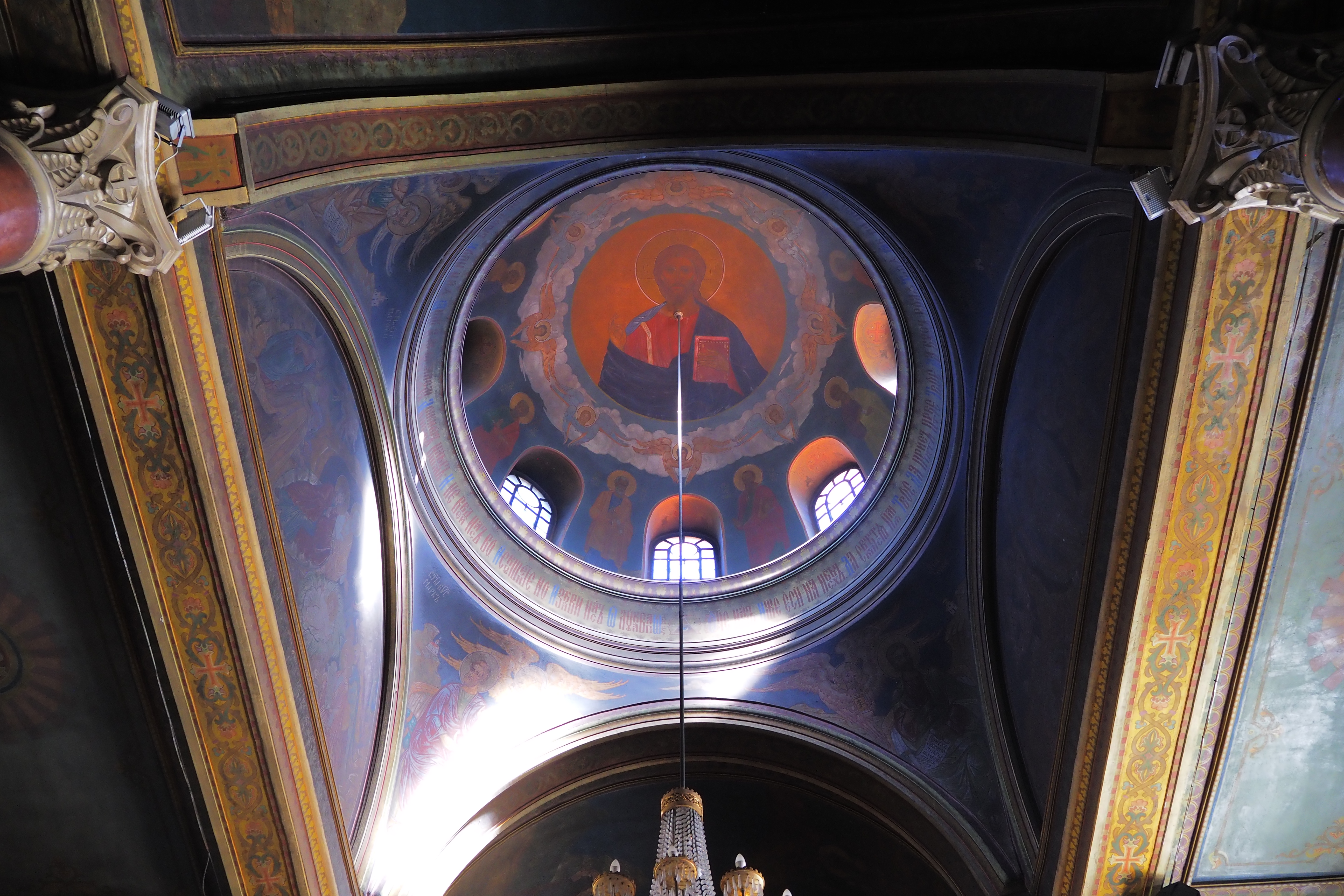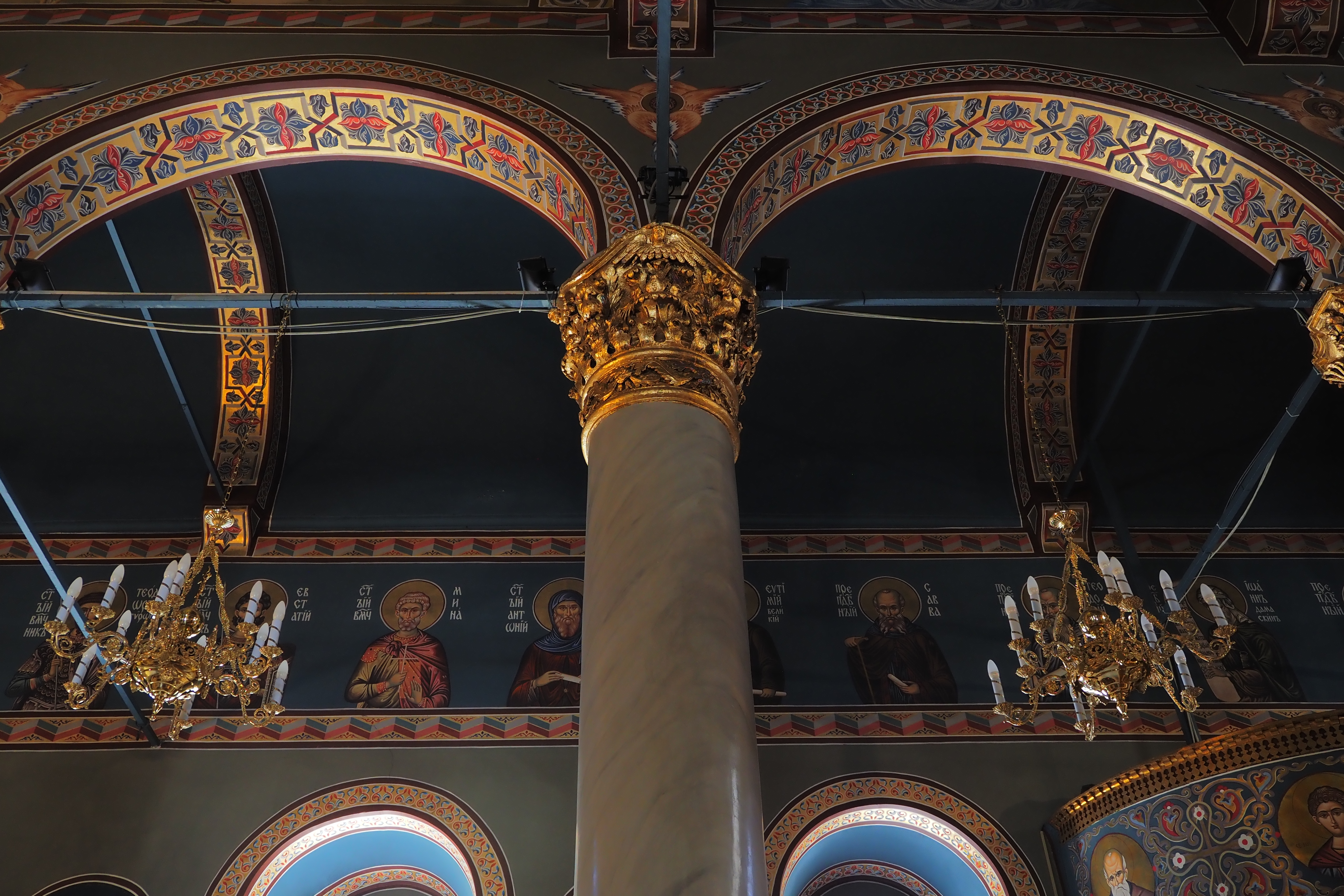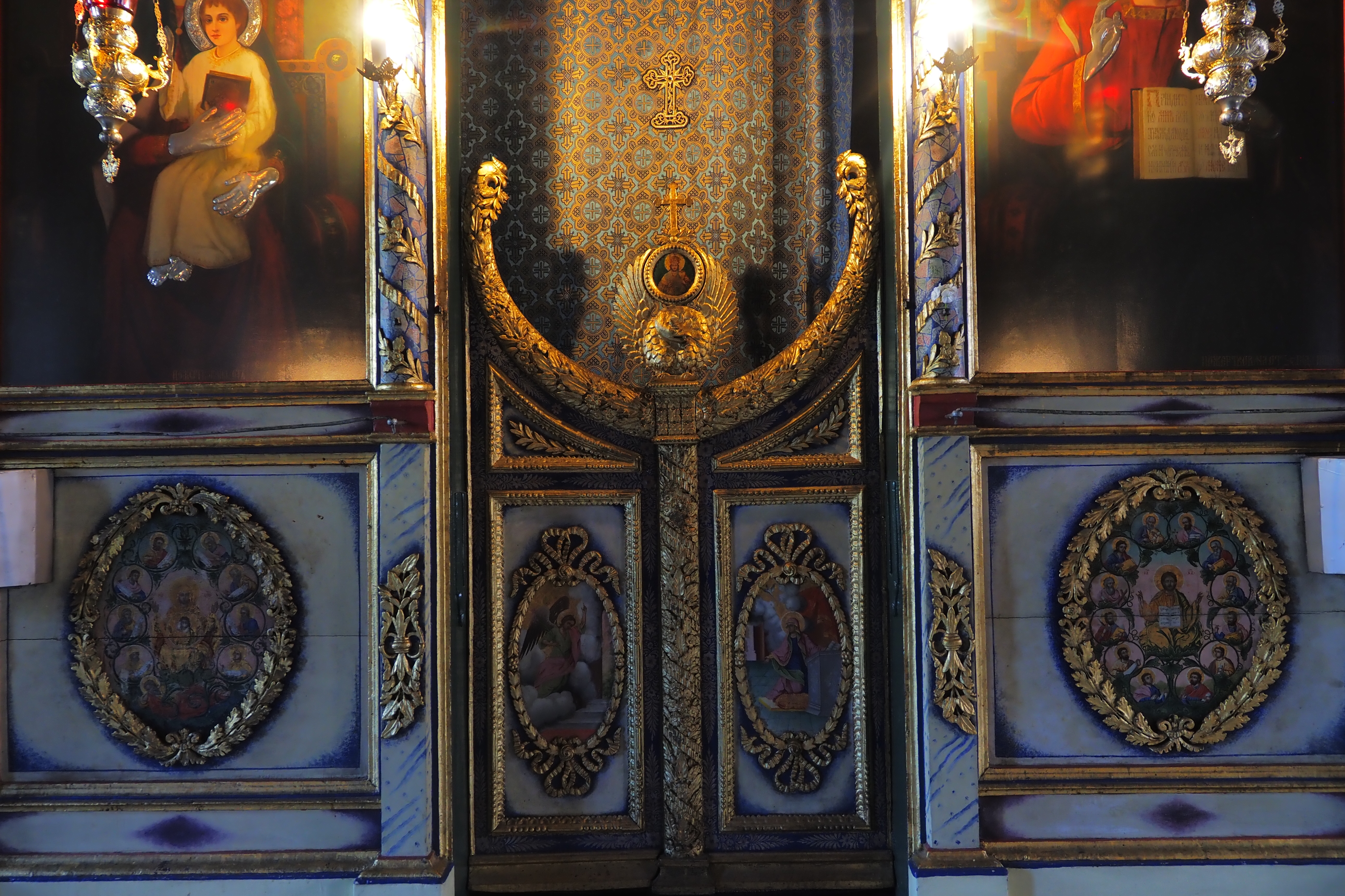 金の柱頭と、白基調の壁面が全体的に純潔な印象だ。教会が建てられたのは1838年ということみたいだけど、どこかのタイミングで修復されていると思う。イコンの中にはそれよりもずっと古い 15世紀ごろのものが含まれているらしい。