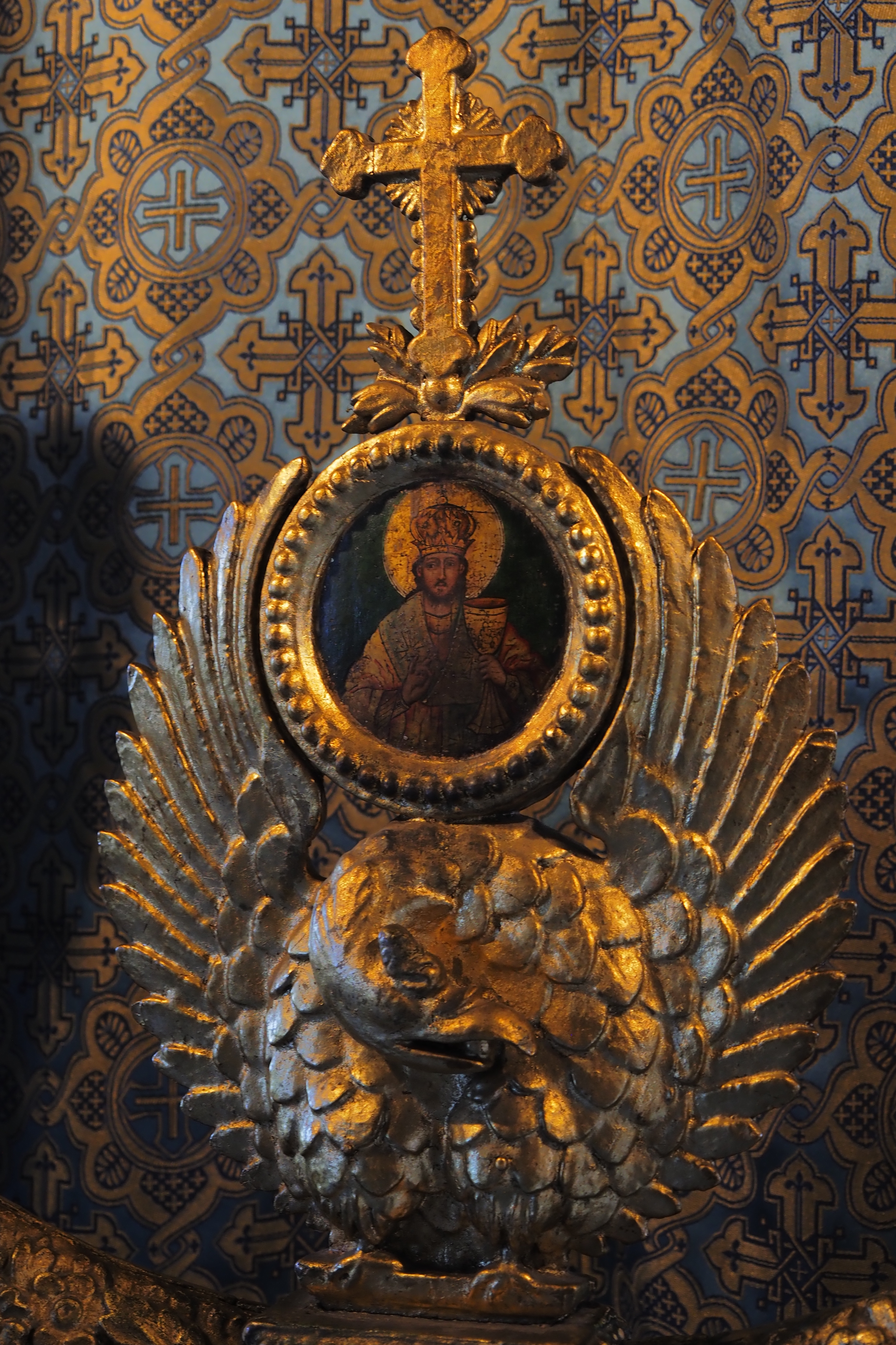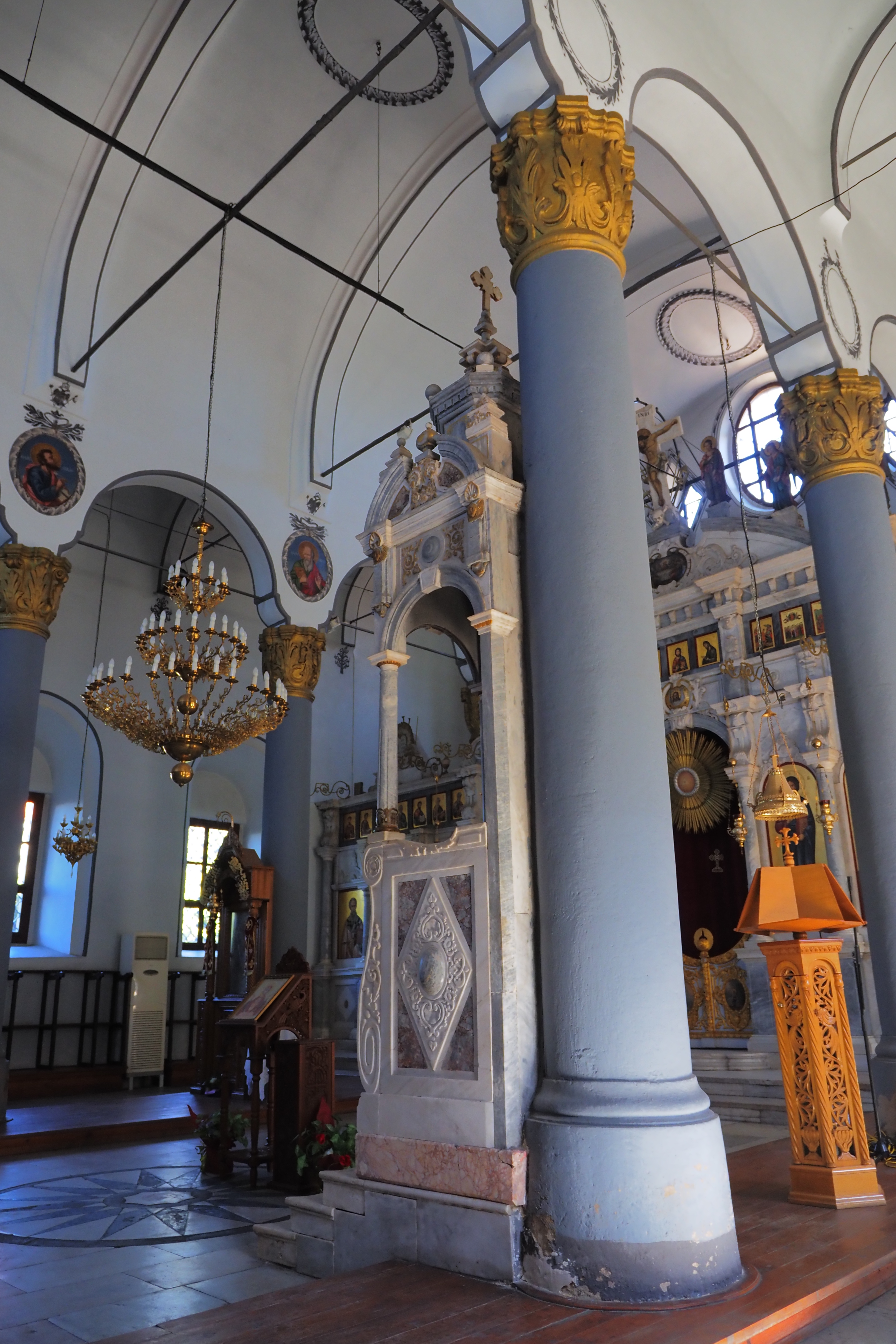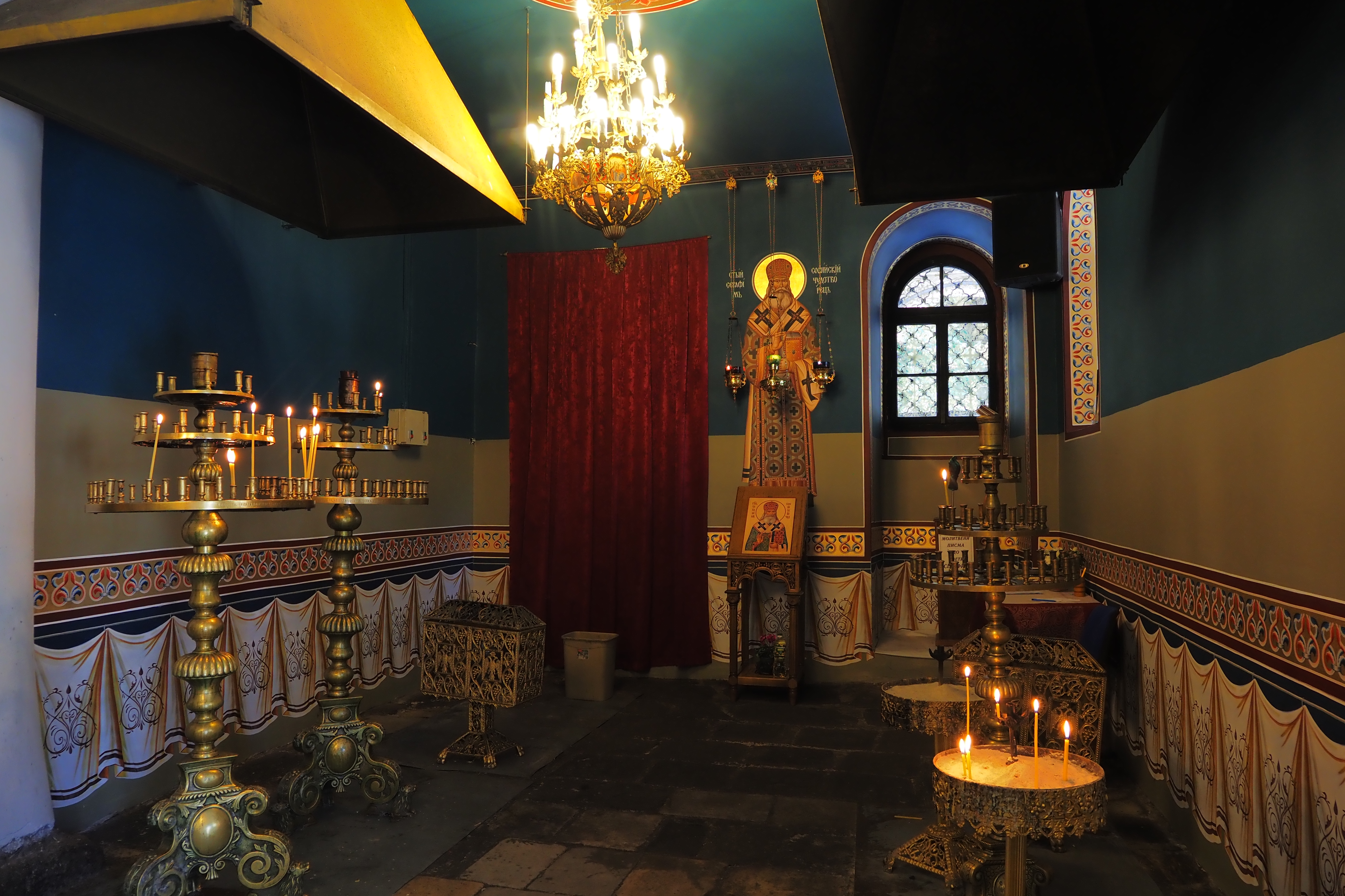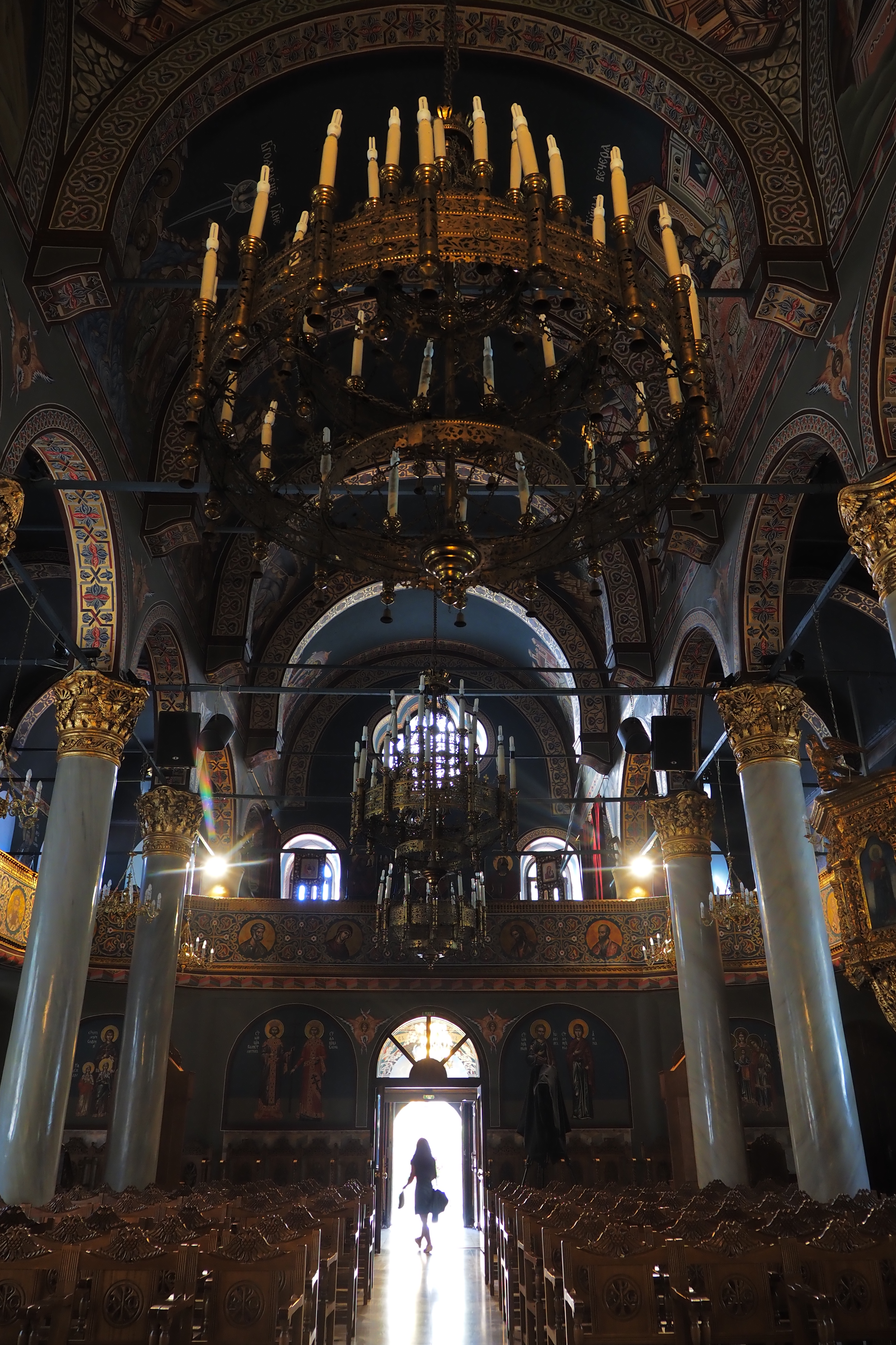 金の柱頭と、白基調の壁面が全体的に純潔な印象だ。教会が建てられたのは1838年ということみたいだけど、どこかのタイミングで修復されていると思う。イコンの中にはそれよりもずっと古い 15世紀ごろのものが含まれているらしい。