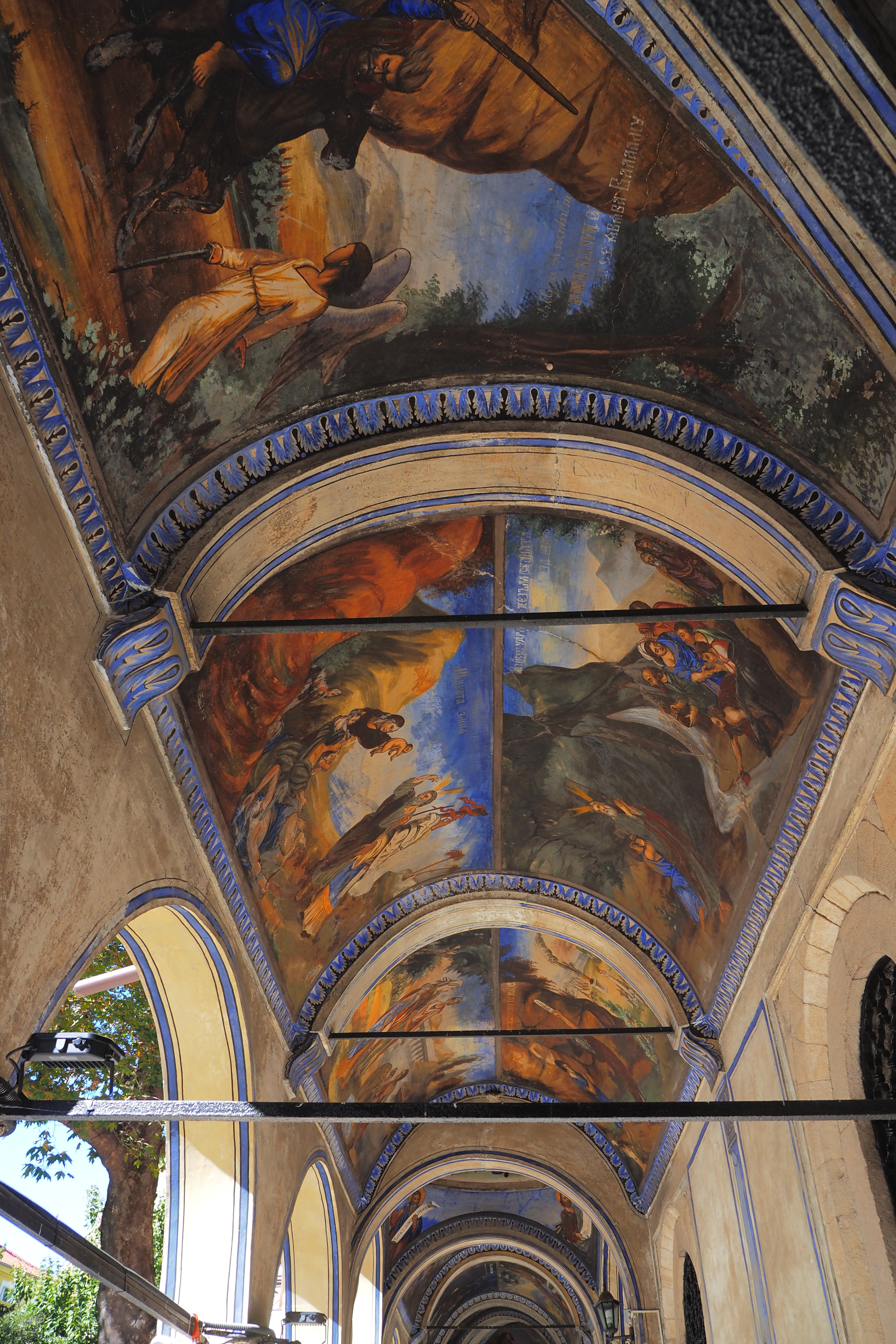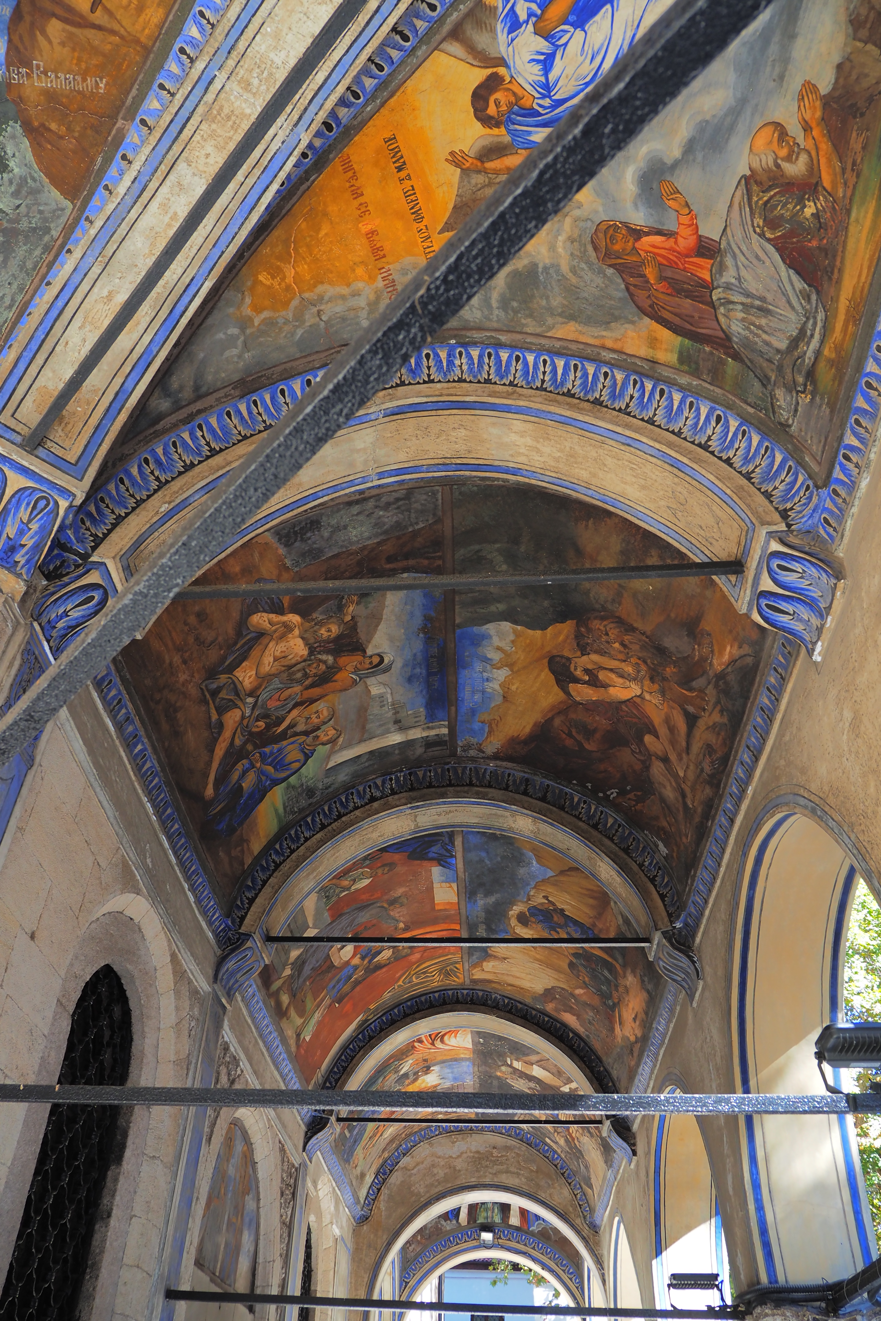 教会を囲む回廊には旧約聖書の場面などを描いた美しい天井画が施されている。
