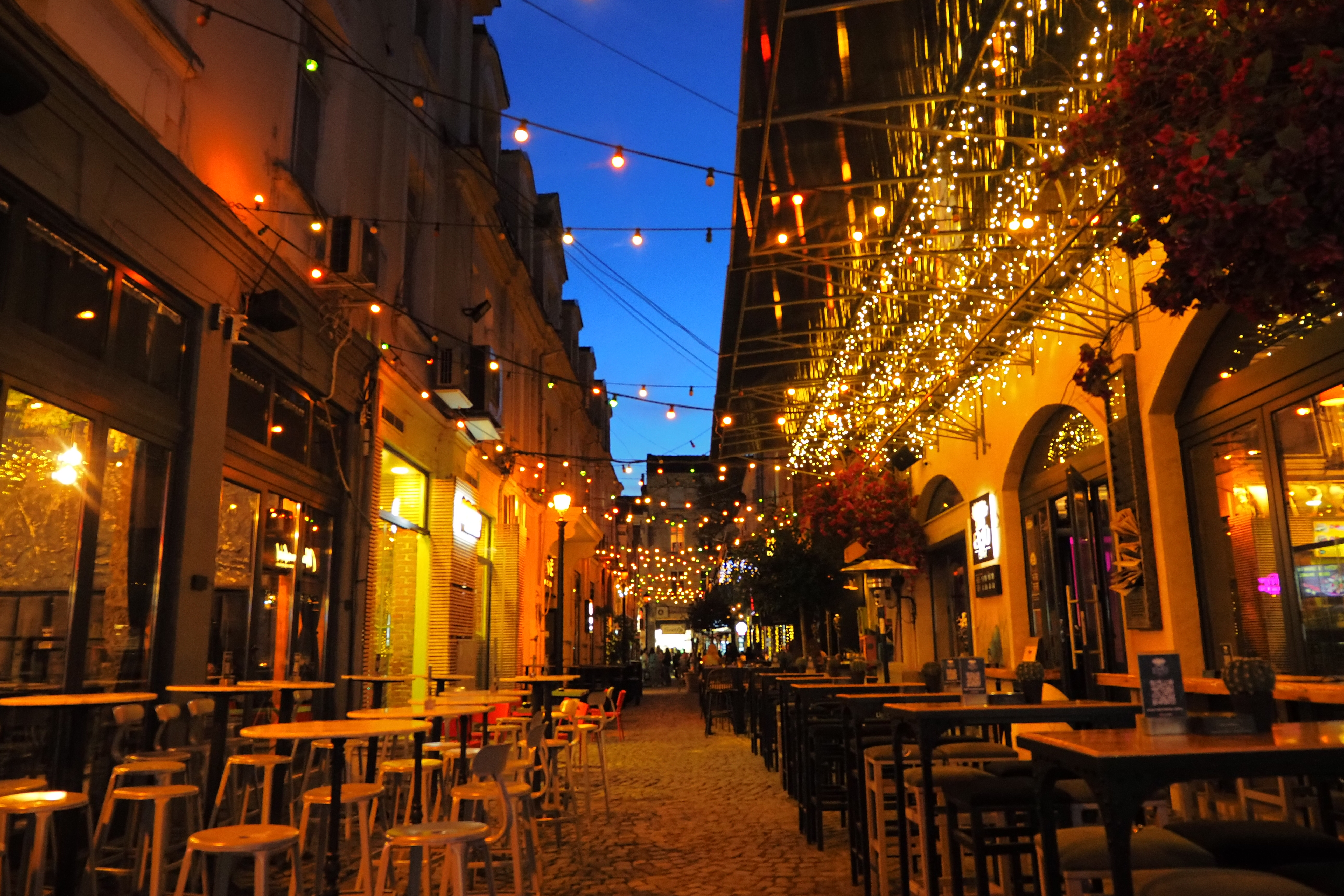 綺麗な色に塗られた建物が連なって、1階部分は色んな店舗になっている。