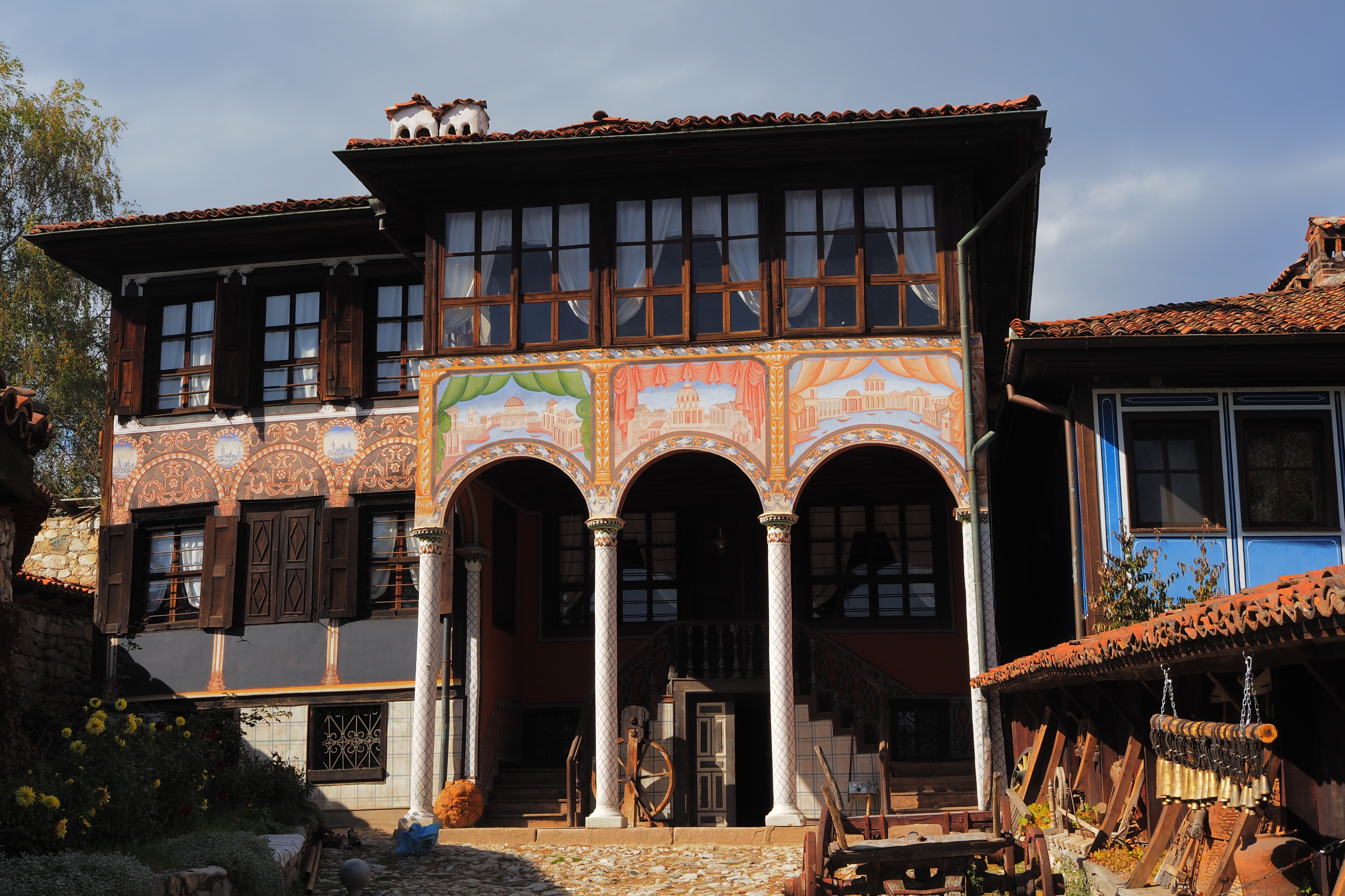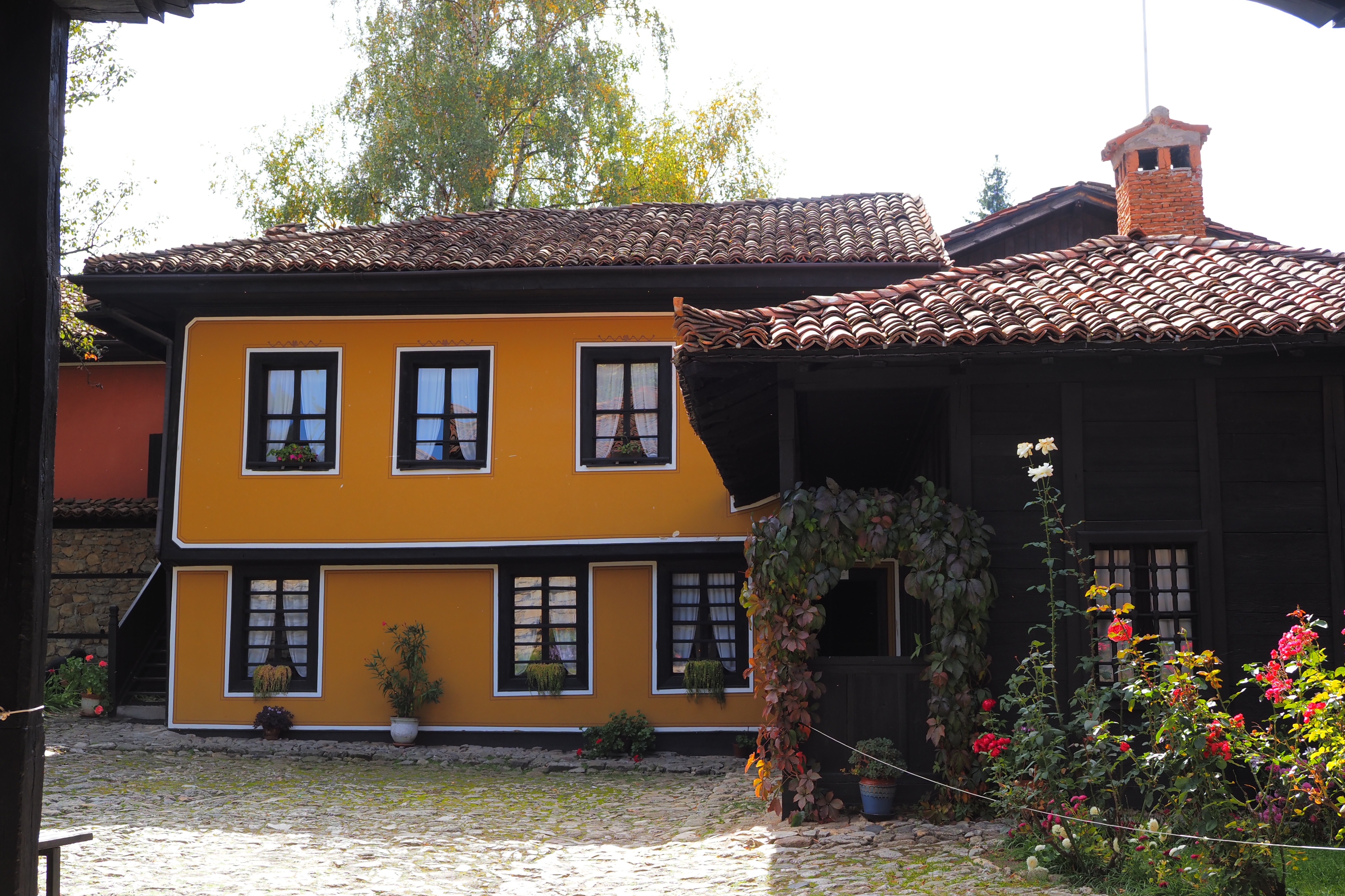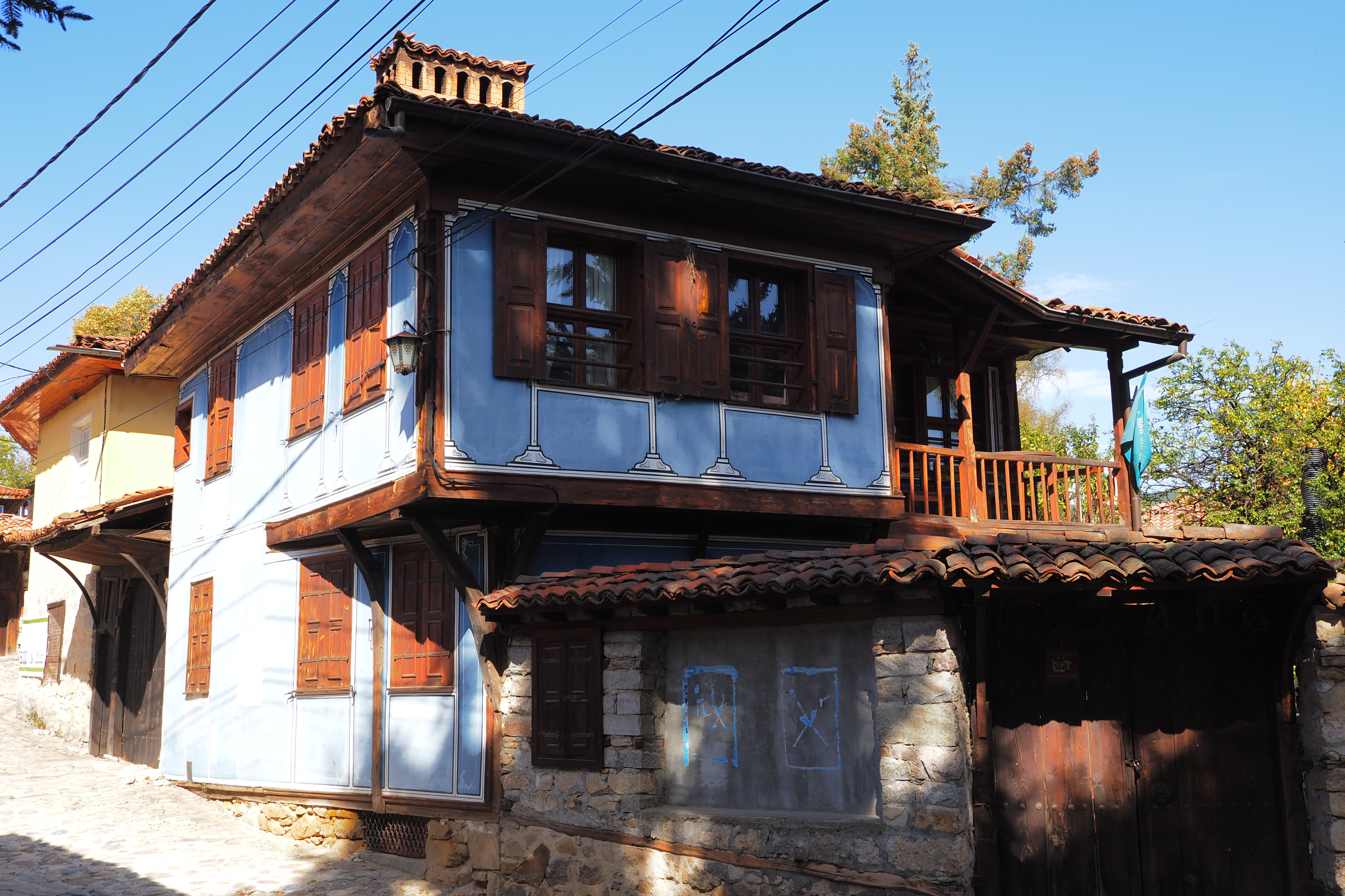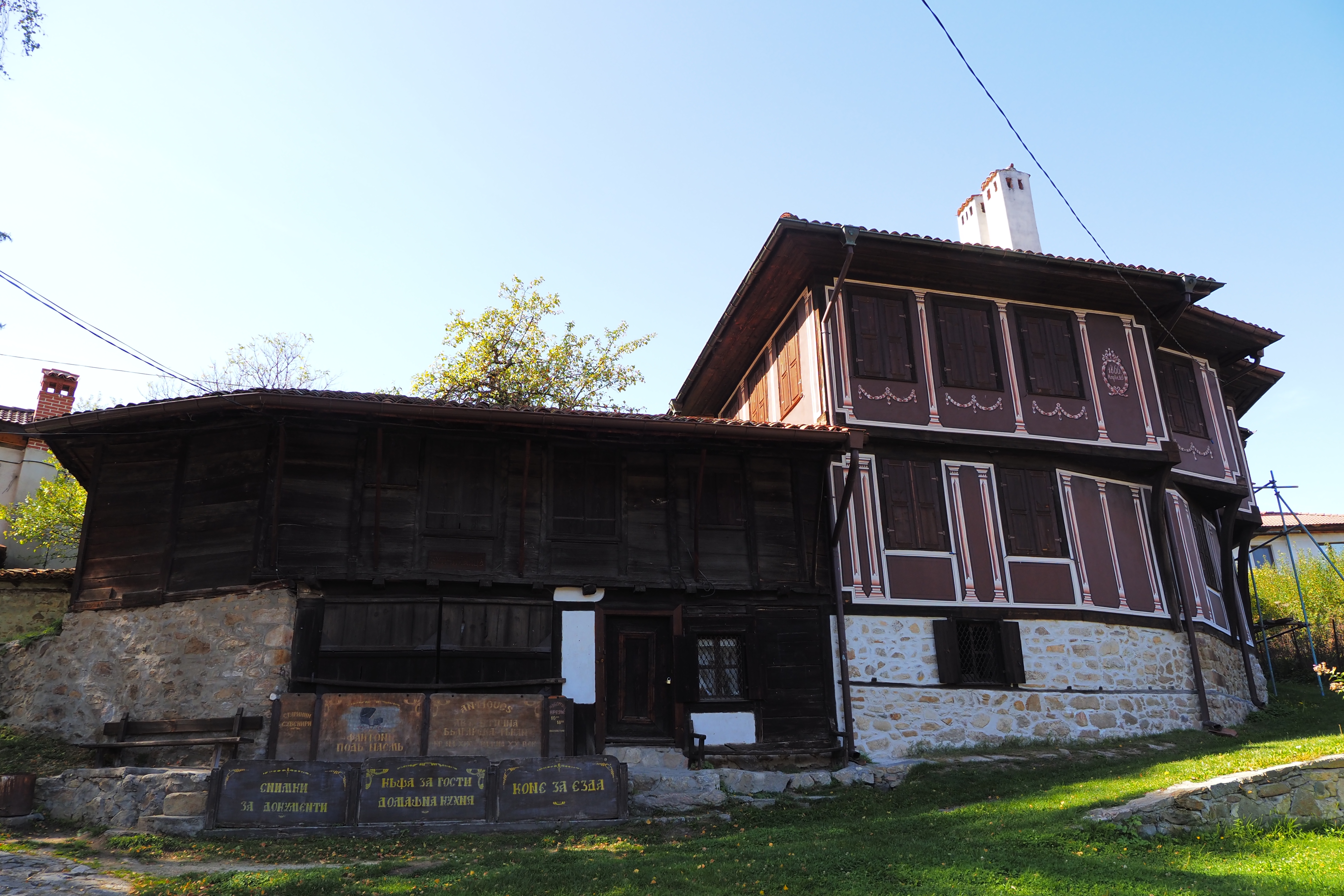 プロヴディヴ編でも触れた通り、露土戦争から1878年のブルガリア解放に至るまでのブルガリア民族復興運動が盛んになっていた時期に建てられた いわゆる「ブルガリア・ルネサンス」のリバイバル建築だけど、1階部分が石づくりで2階部分に張り出しの木造がのる典型的なパターンとは少し違う。鮮やかなパステルカラーに彩色された外壁と、木造の階段・列柱、窓枠なんかが共通してる。