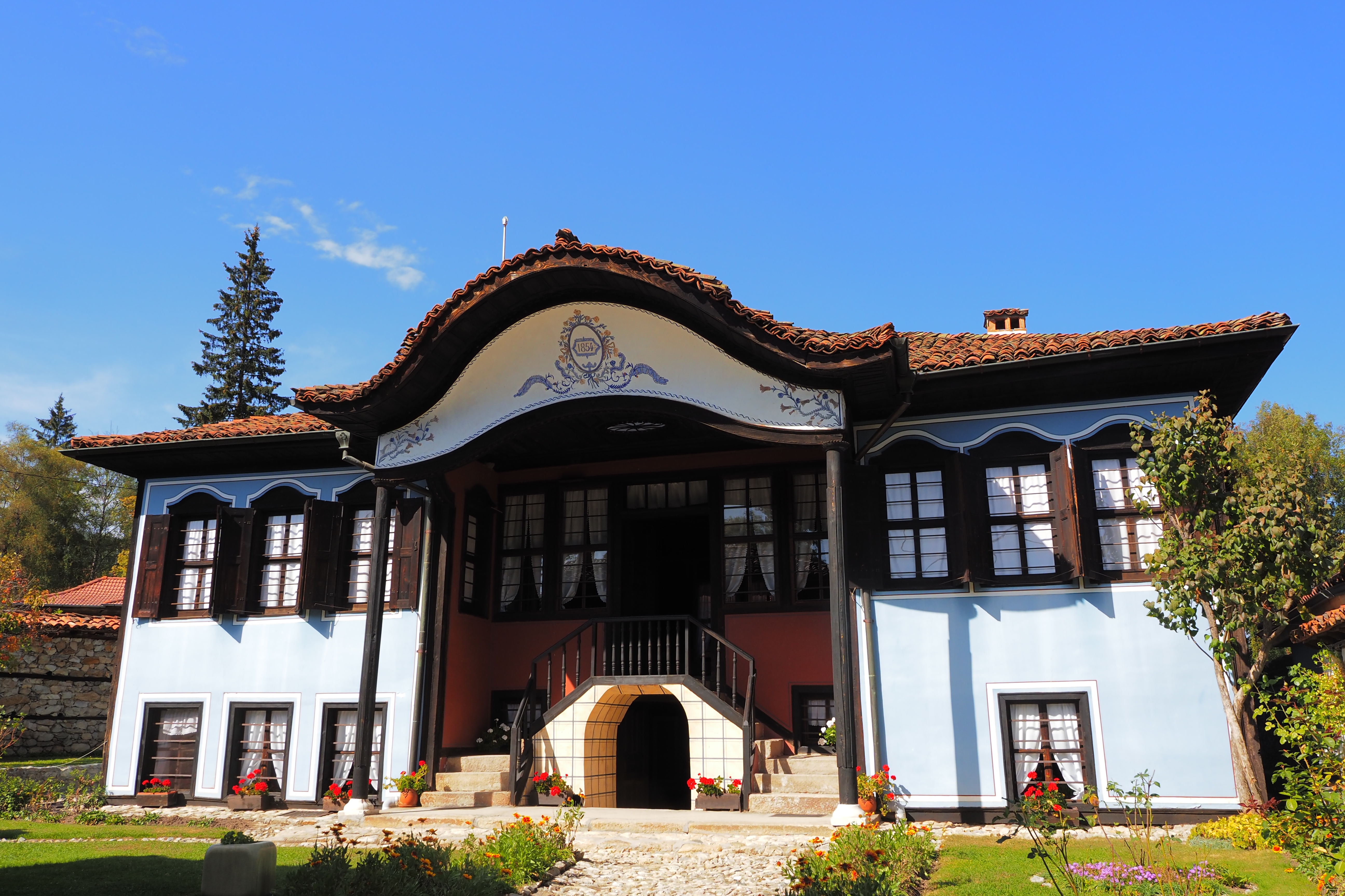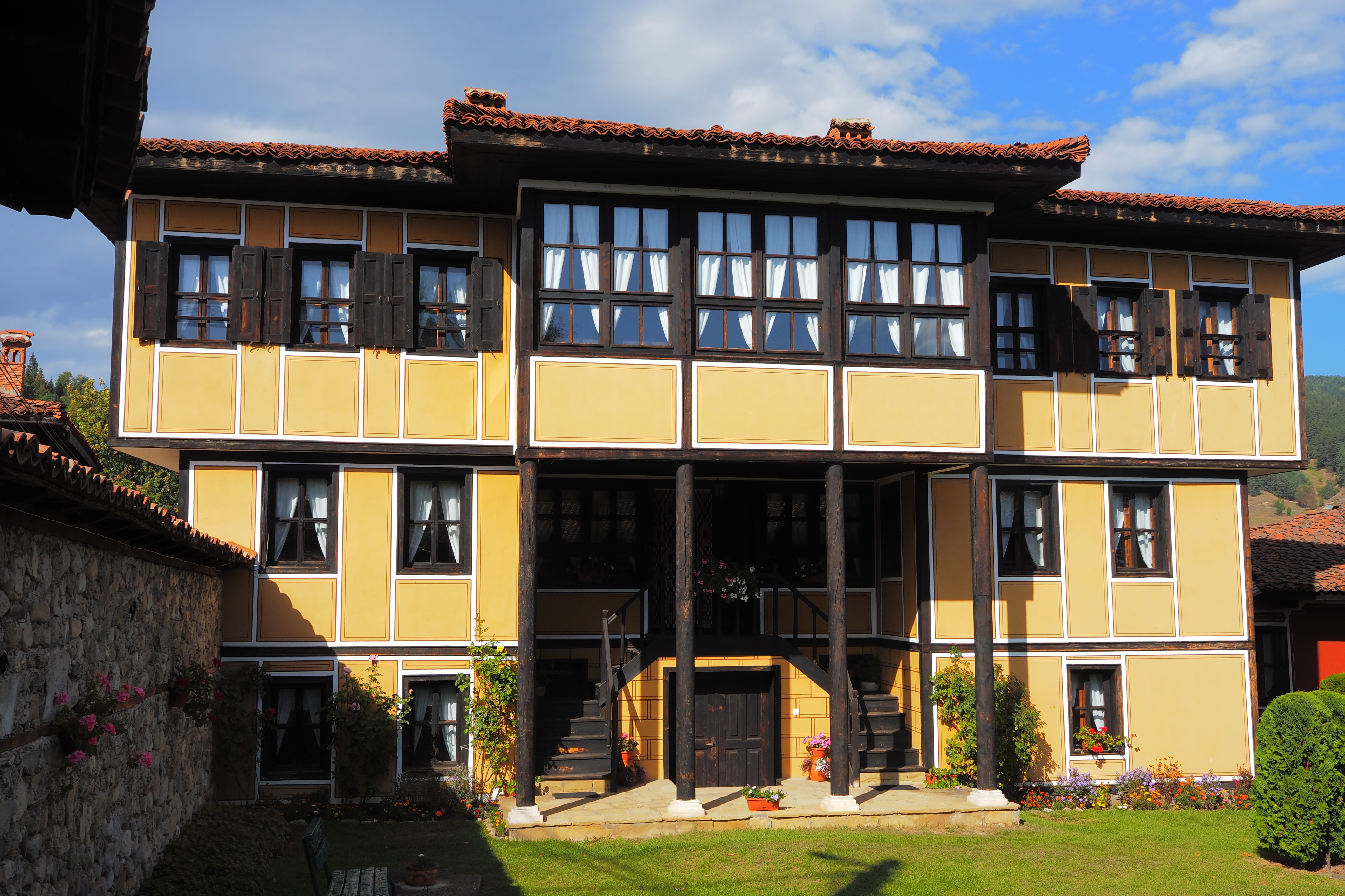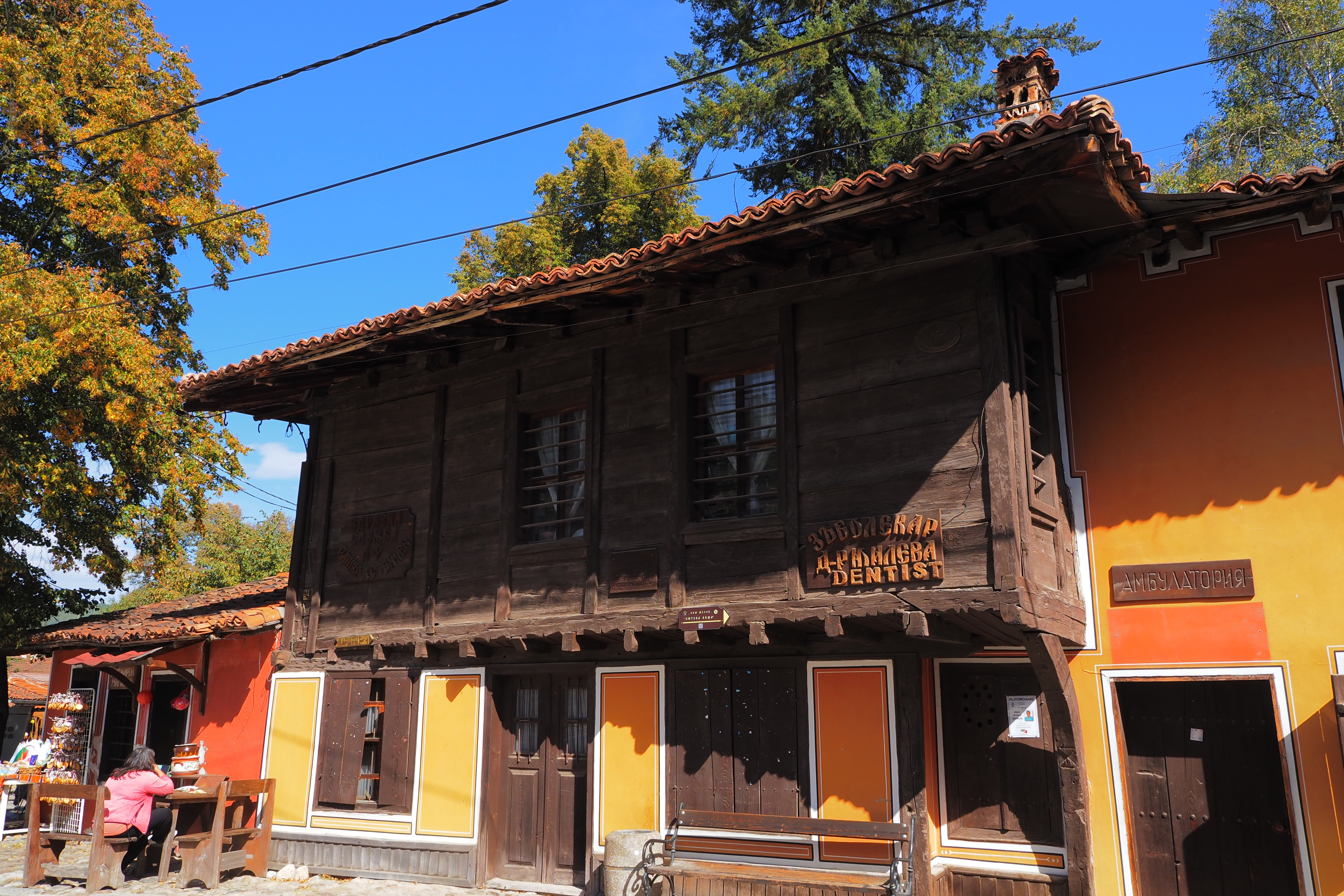 プロヴディヴ編でも触れた通り、露土戦争から1878年のブルガリア解放に至るまでのブルガリア民族復興運動が盛んになっていた時期に建てられた いわゆる「ブルガリア・ルネサンス」のリバイバル建築だけど、1階部分が石づくりで2階部分に張り出しの木造がのる典型的なパターンとは少し違う。鮮やかなパステルカラーに彩色された外壁と、木造の階段・列柱、窓枠なんかが共通してる。
