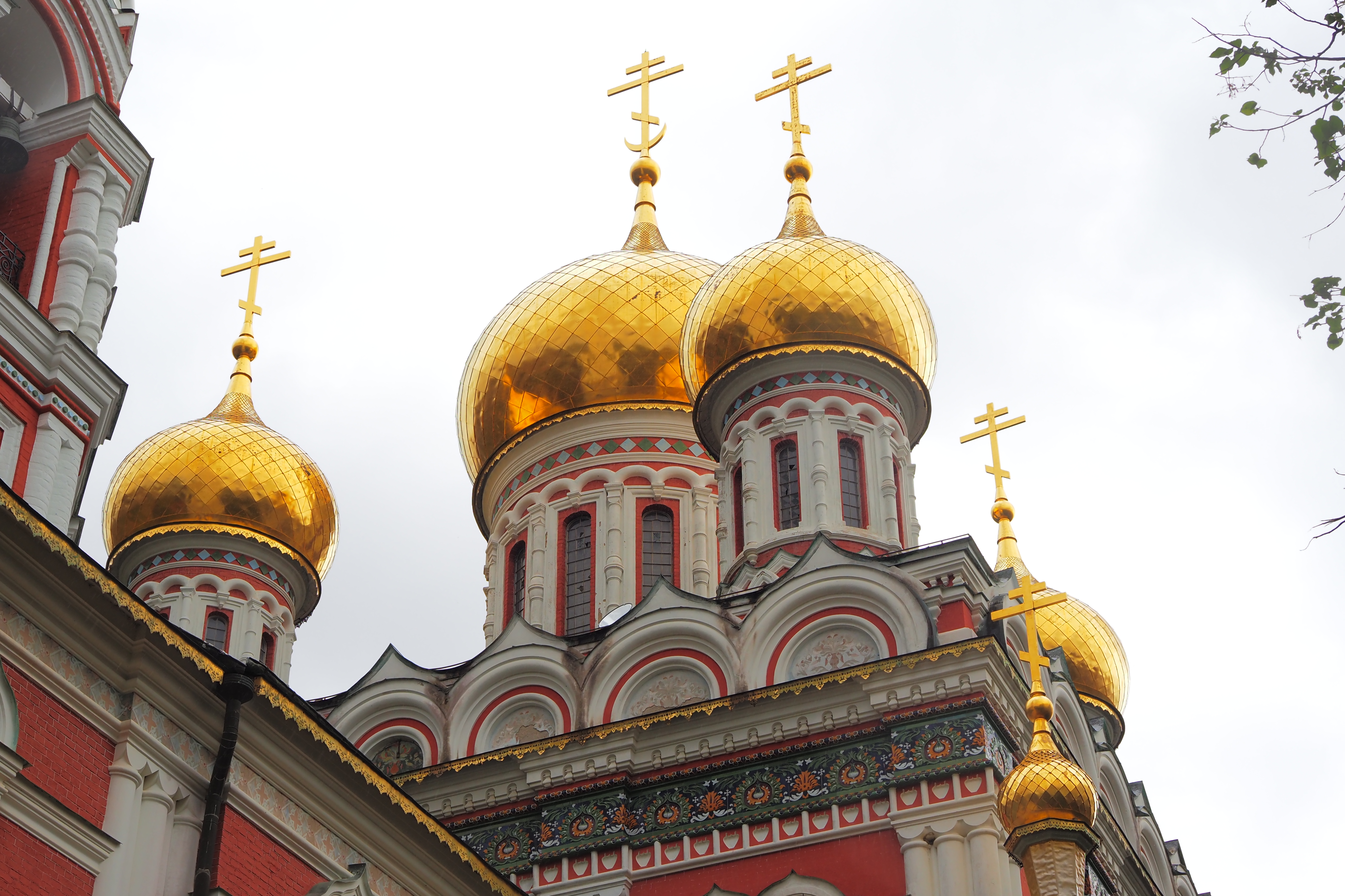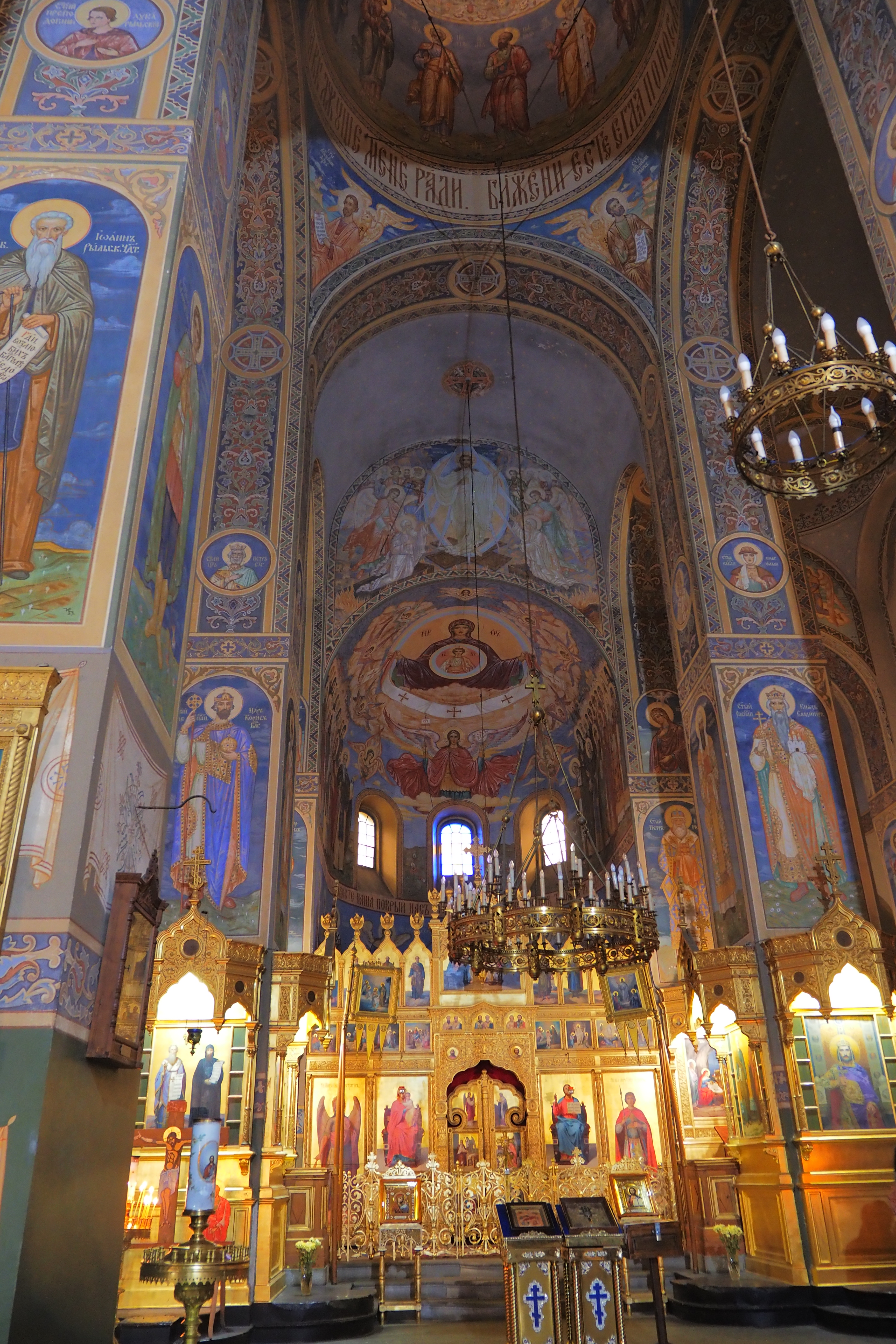 教会内。黄金に輝くイコノスタシスとフレスコ画で覆われた柱・アーチが絢爛な雰囲気を放っていた。