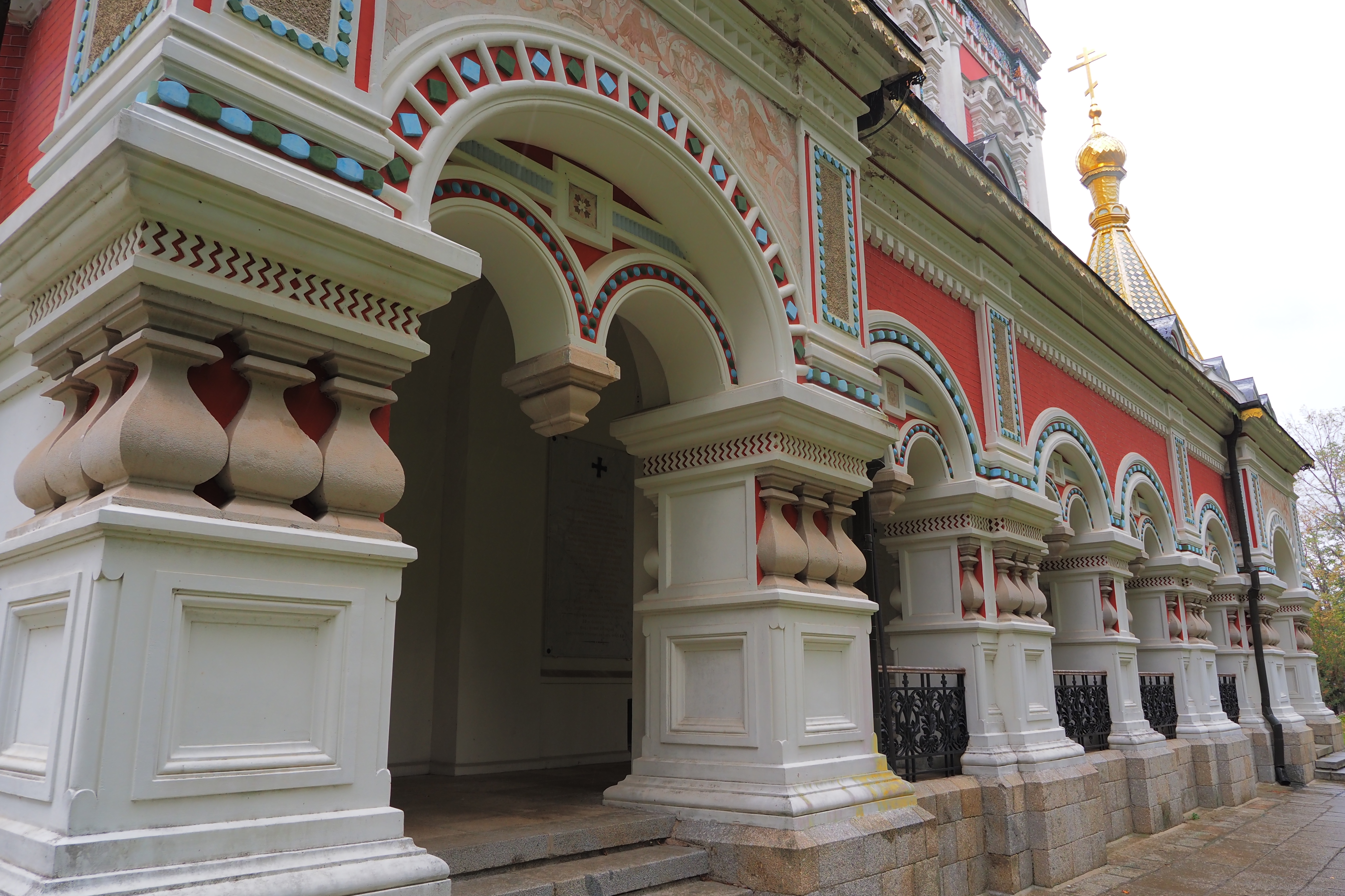 鐘楼の高さは53mもあって、鐘楼ドームの複雑なデコレーションや、カラフルな外壁、礼拝室側の黄金ドームが相まって 今まで見て来たやや質素なブルガリア正教会とは全く異質な見た目だ。
