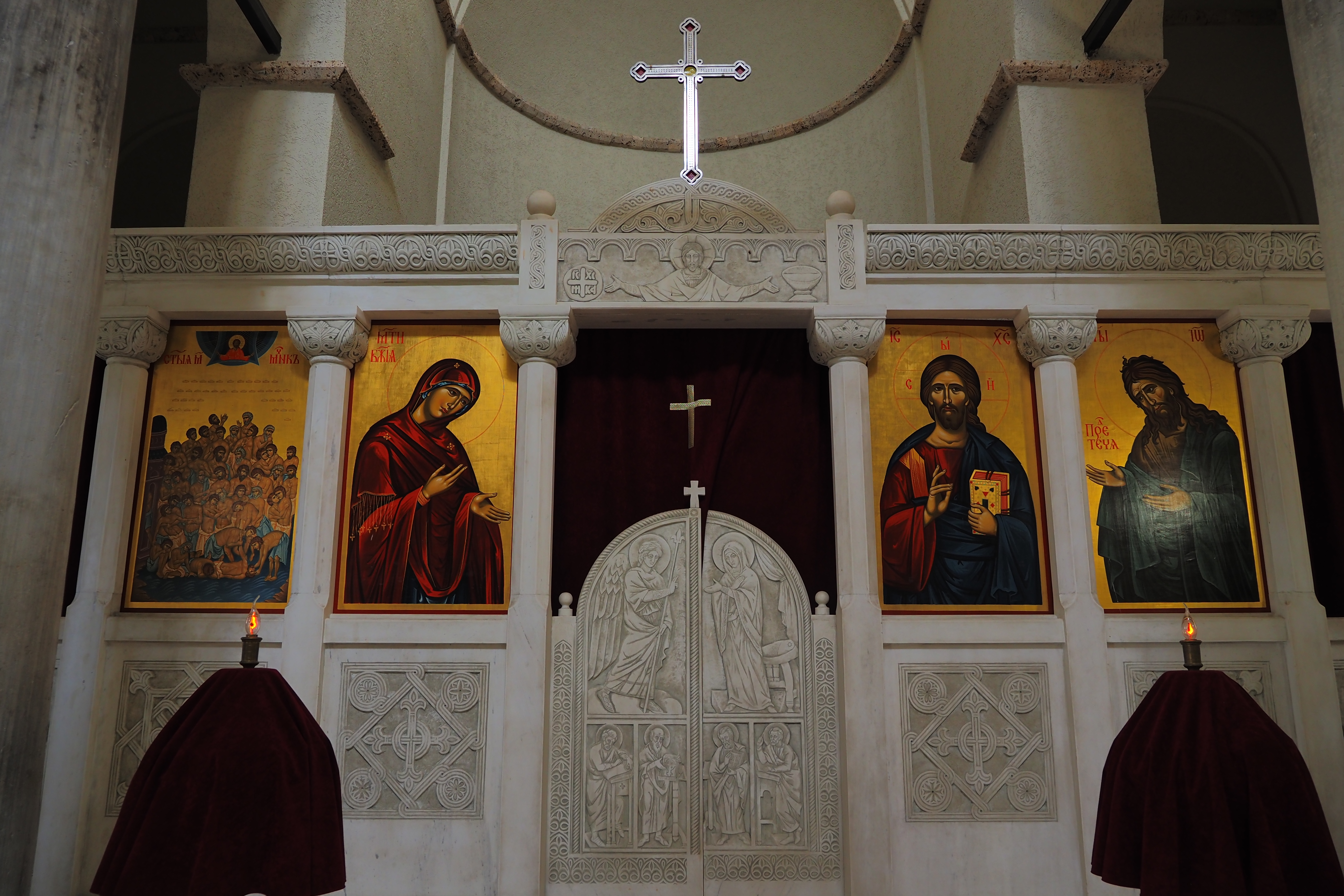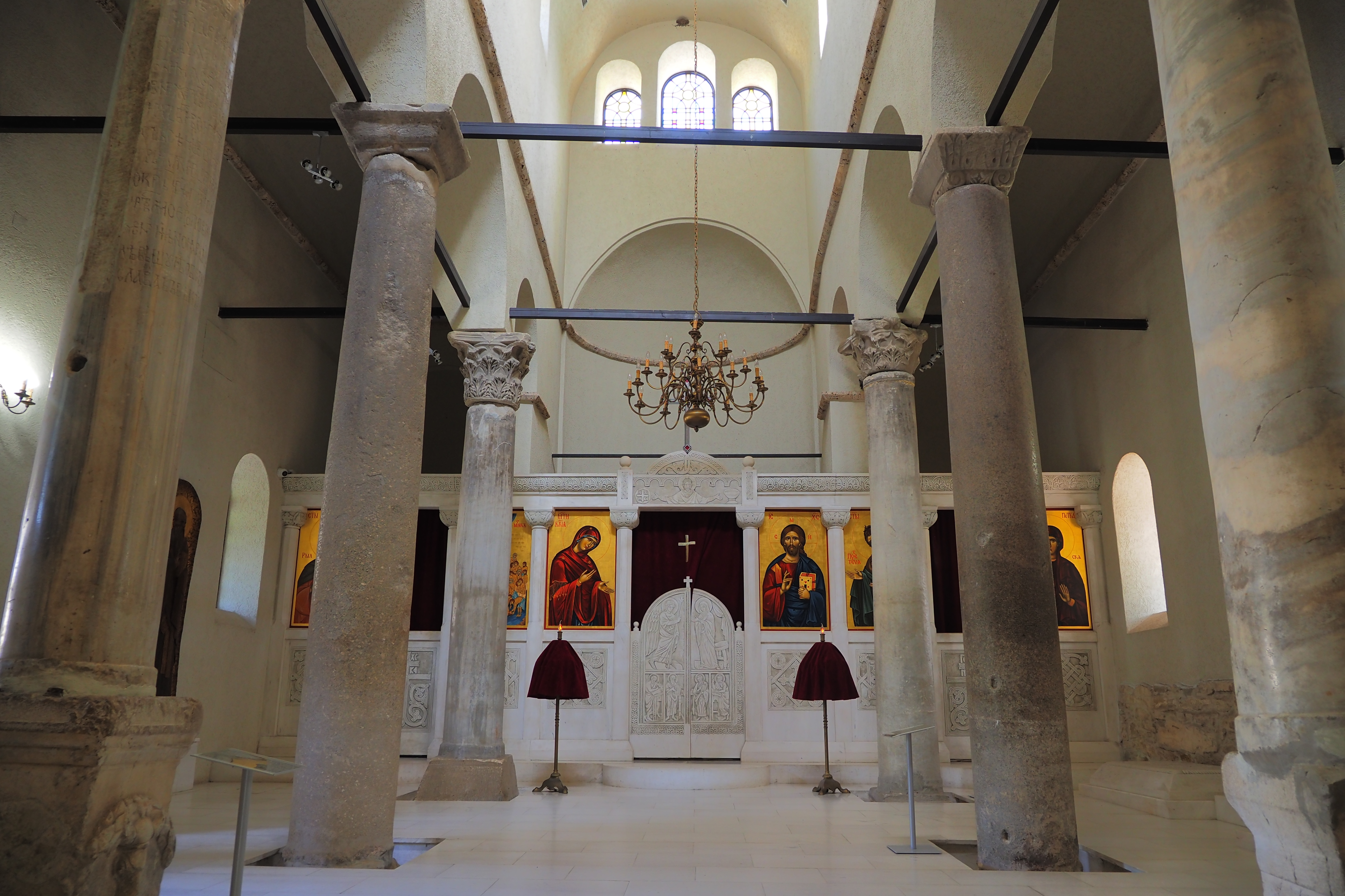 教会内部。3廊式バシリカで、イコノスタシスは大理石製だ。