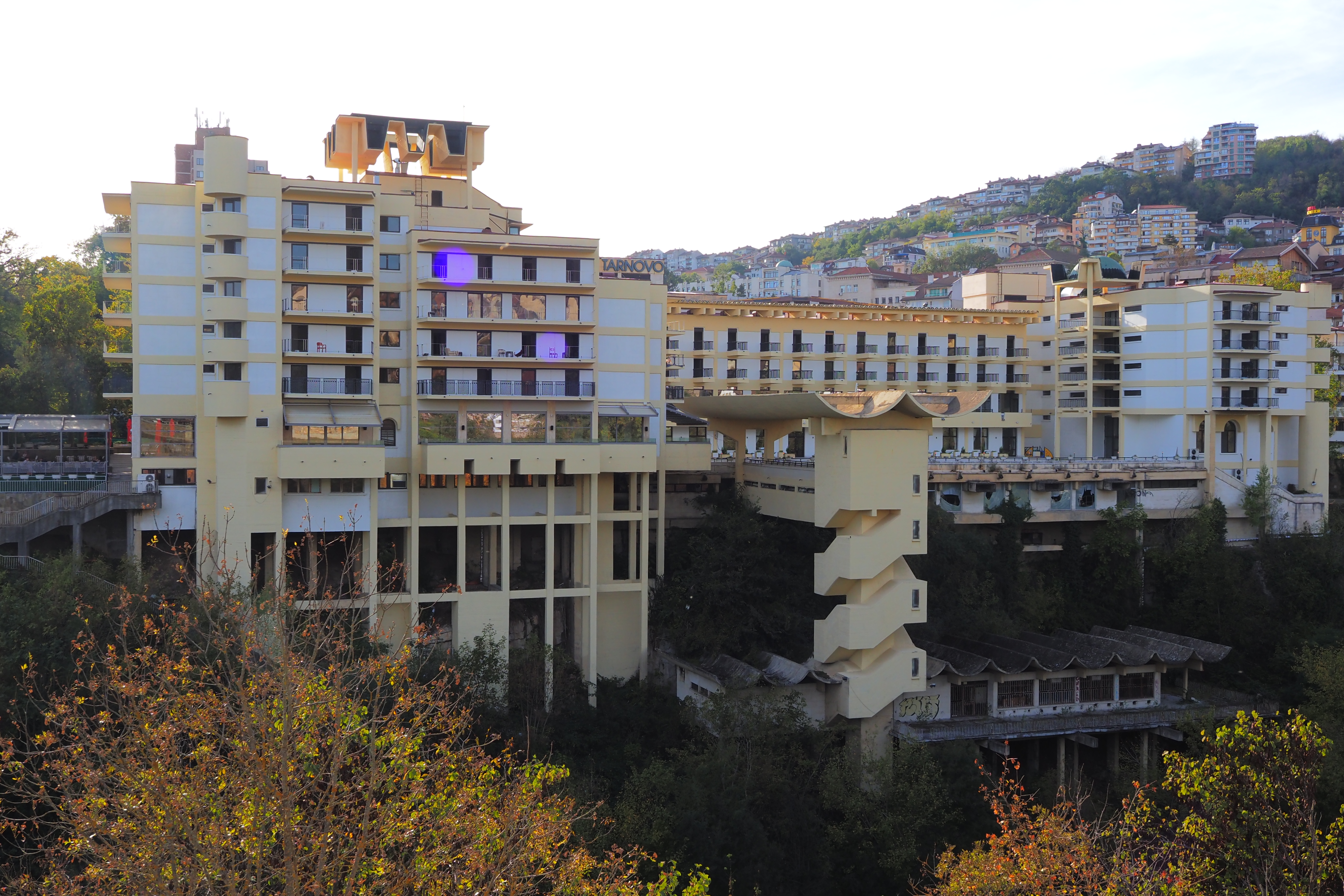 川の西側には、谷底から支柱が延びたような独特な建築の Grand Hotel Veliko Tarnovo が建つ。