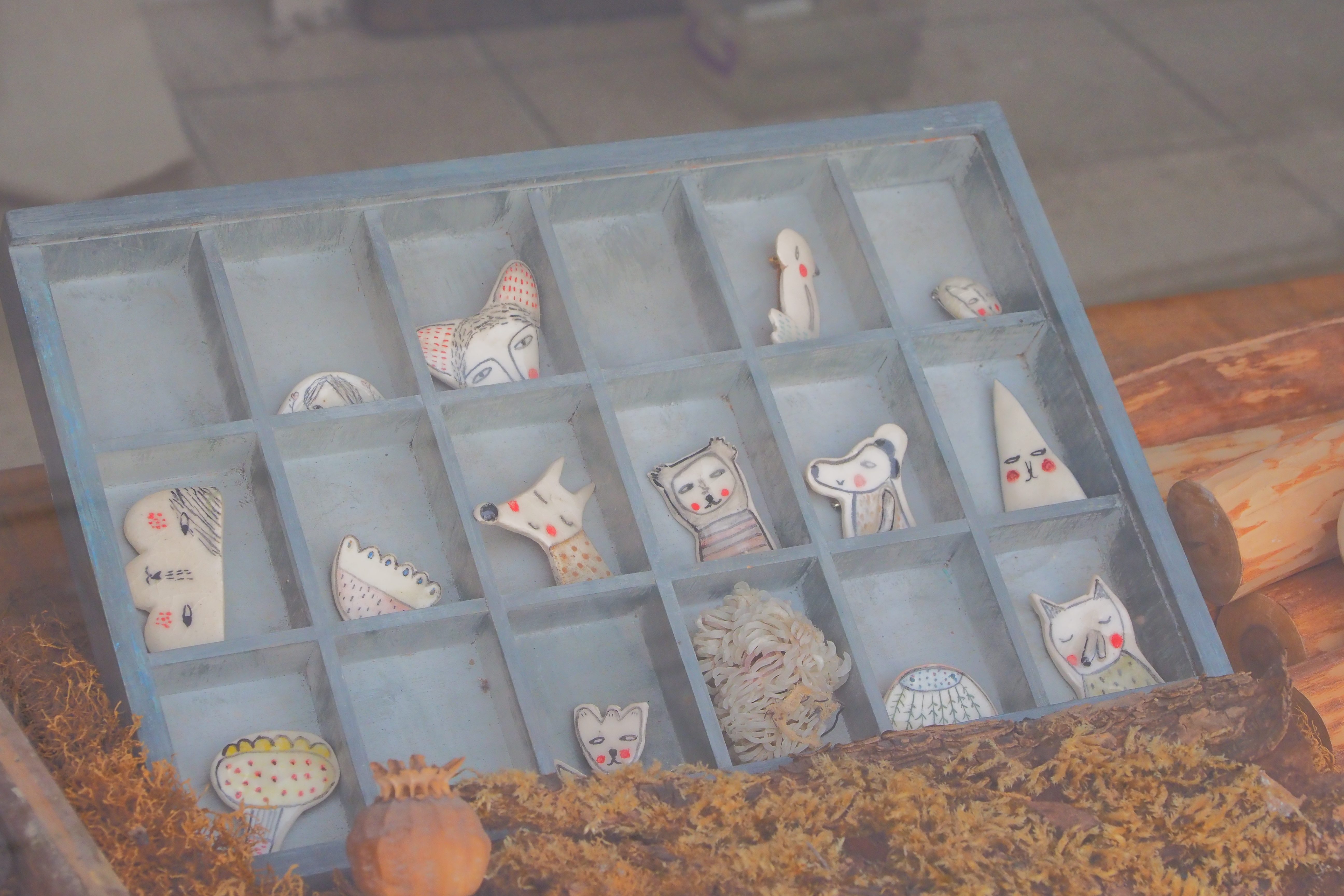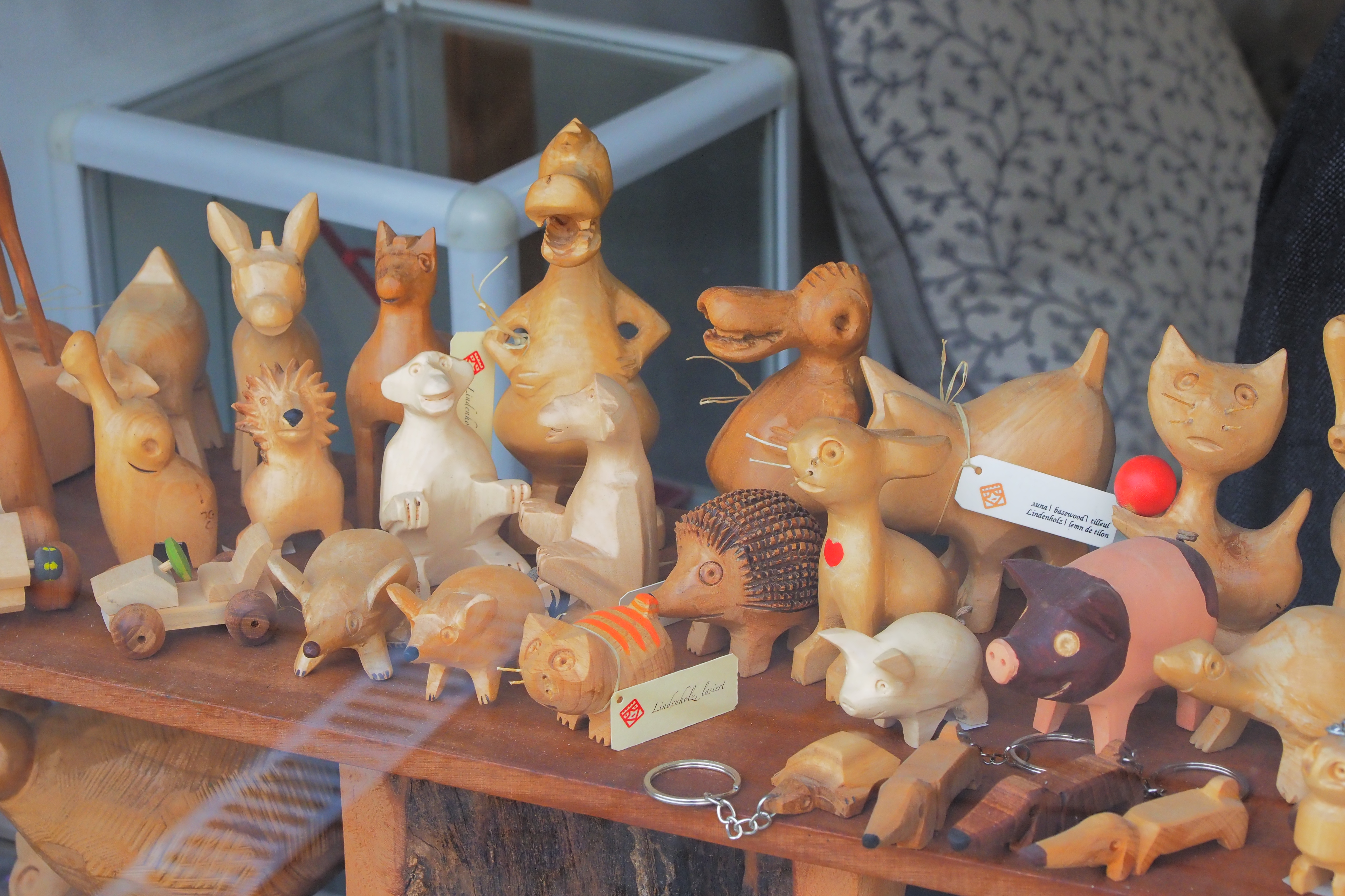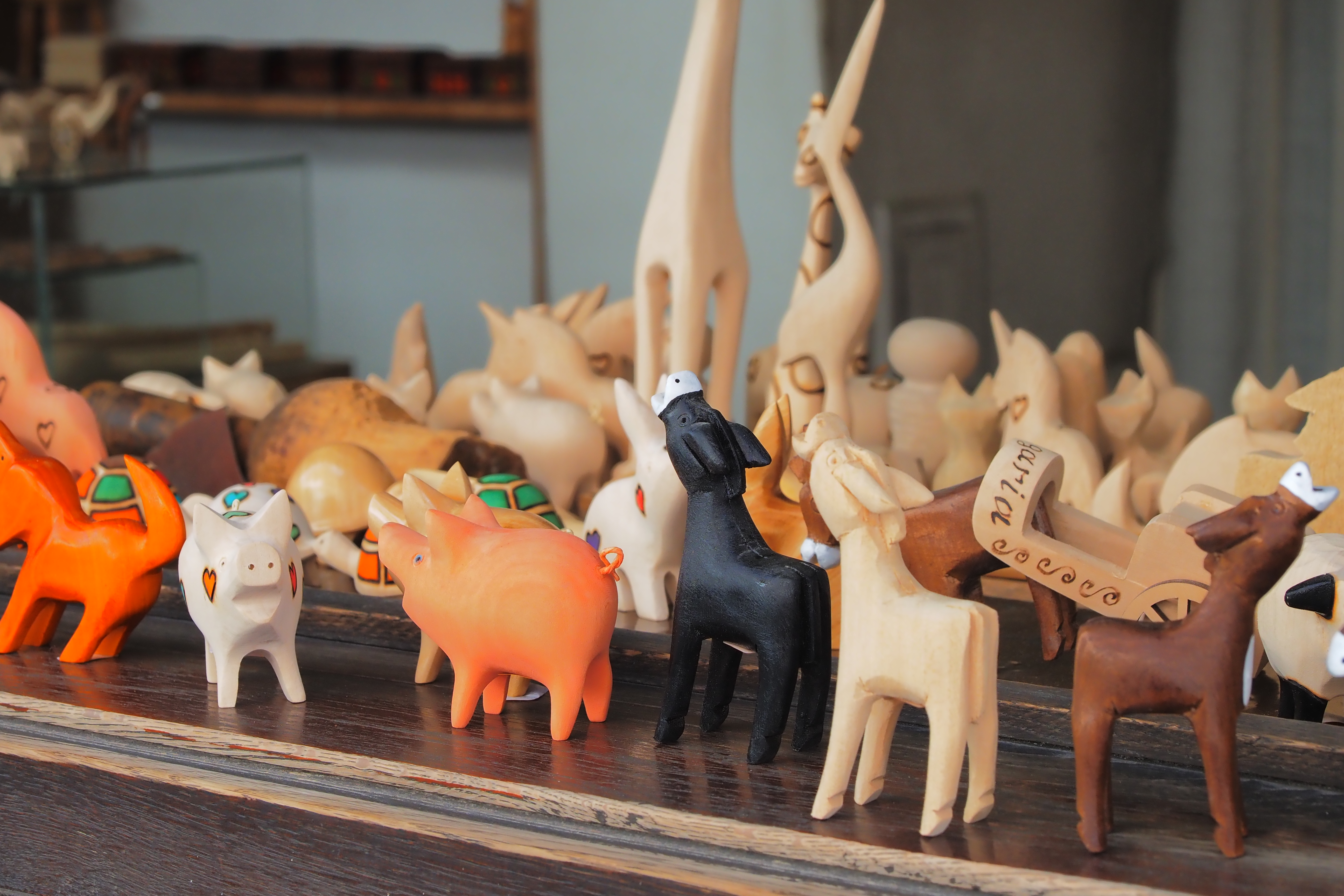 木材を組み合わせたアートワークや、小さい動物の置物。