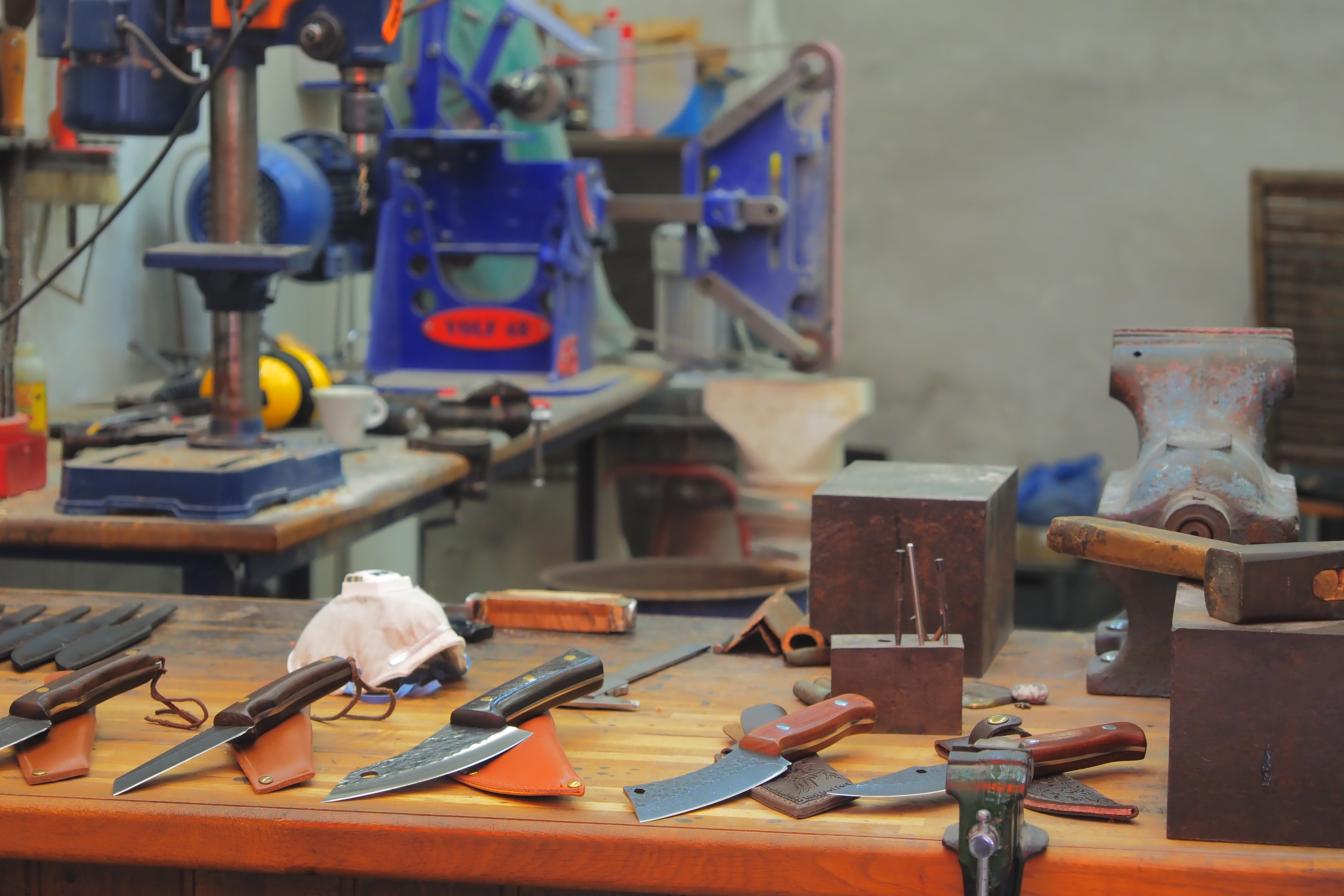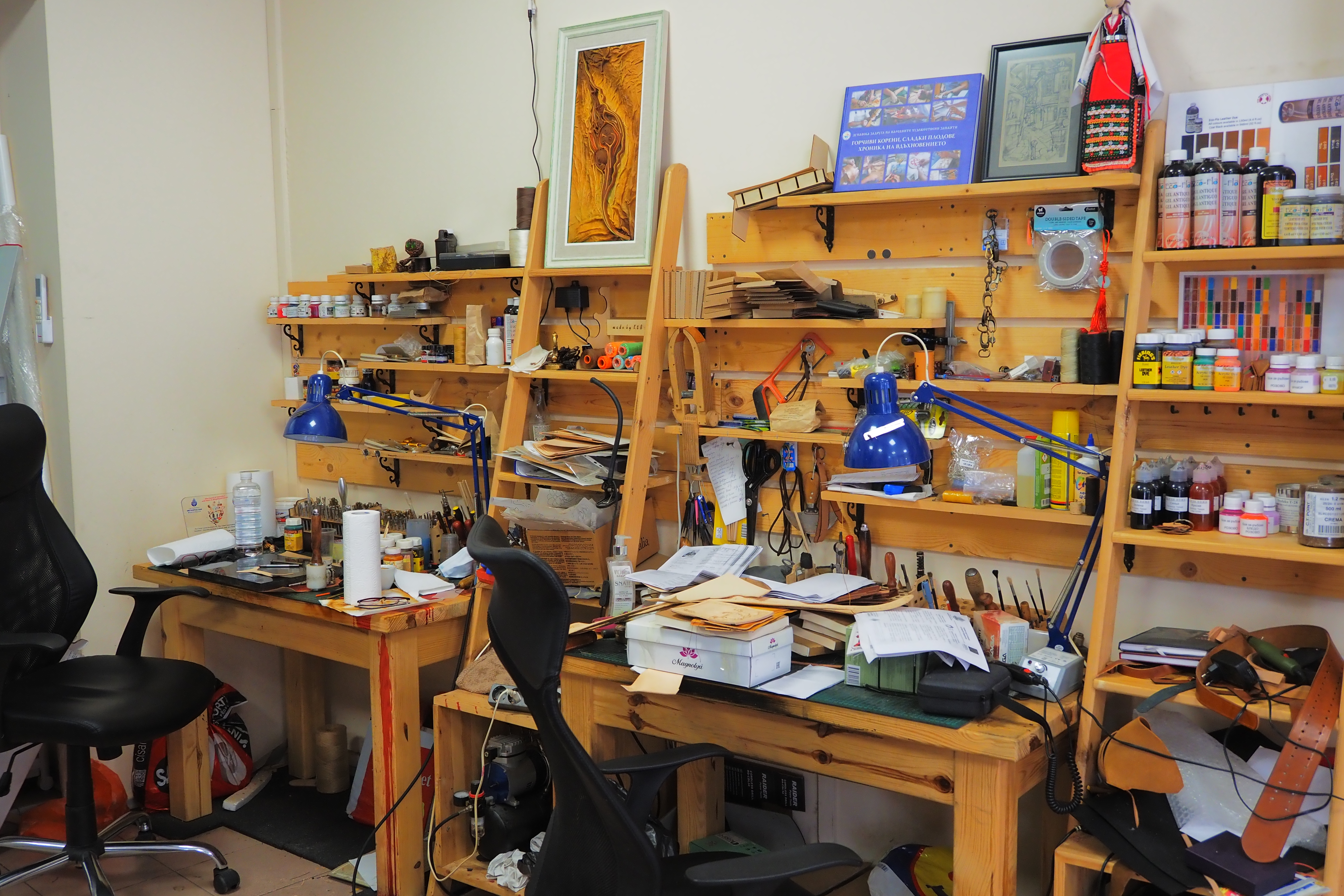淡い色合いと何ともユニークなデザインのお皿や、職人さんの作業台。