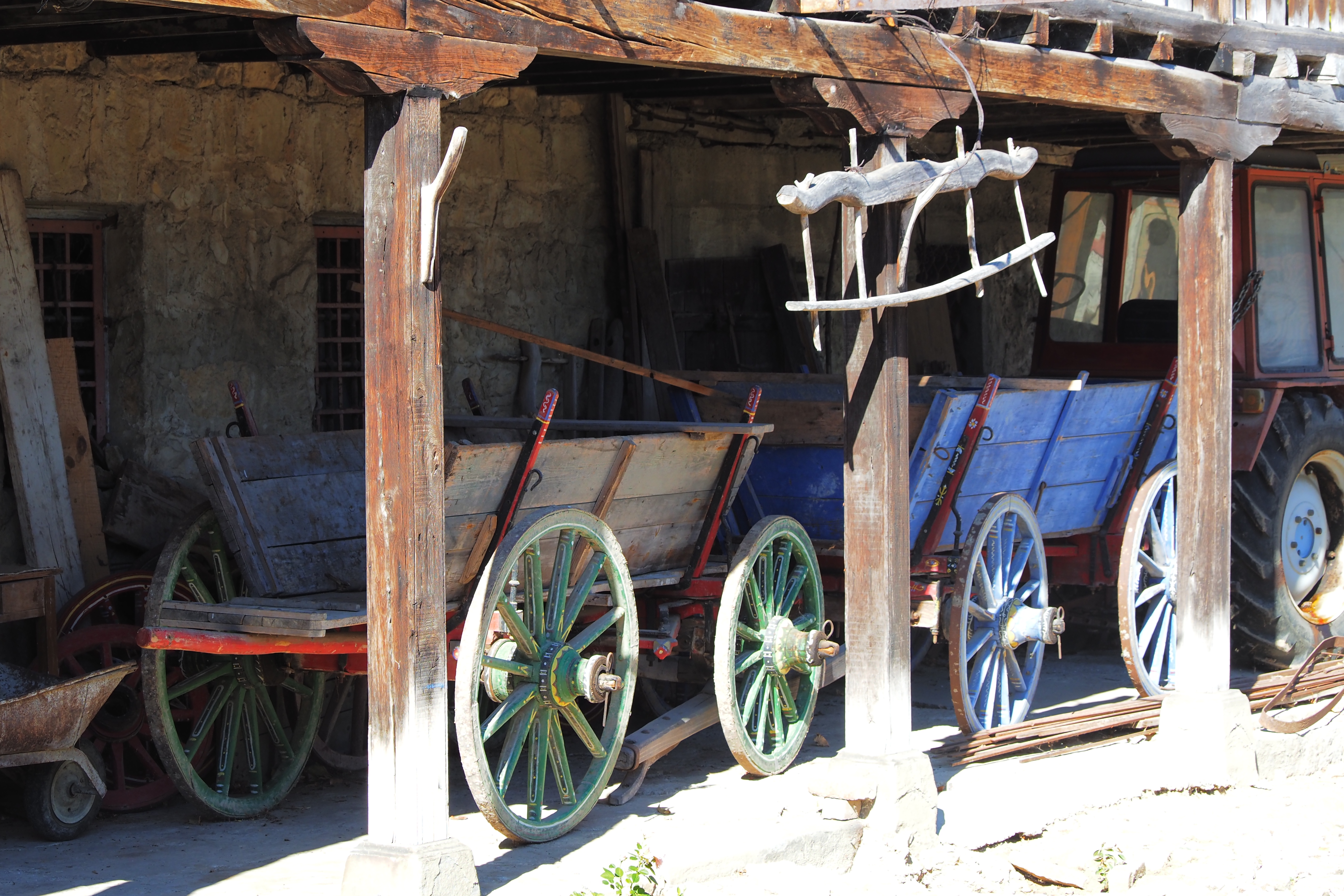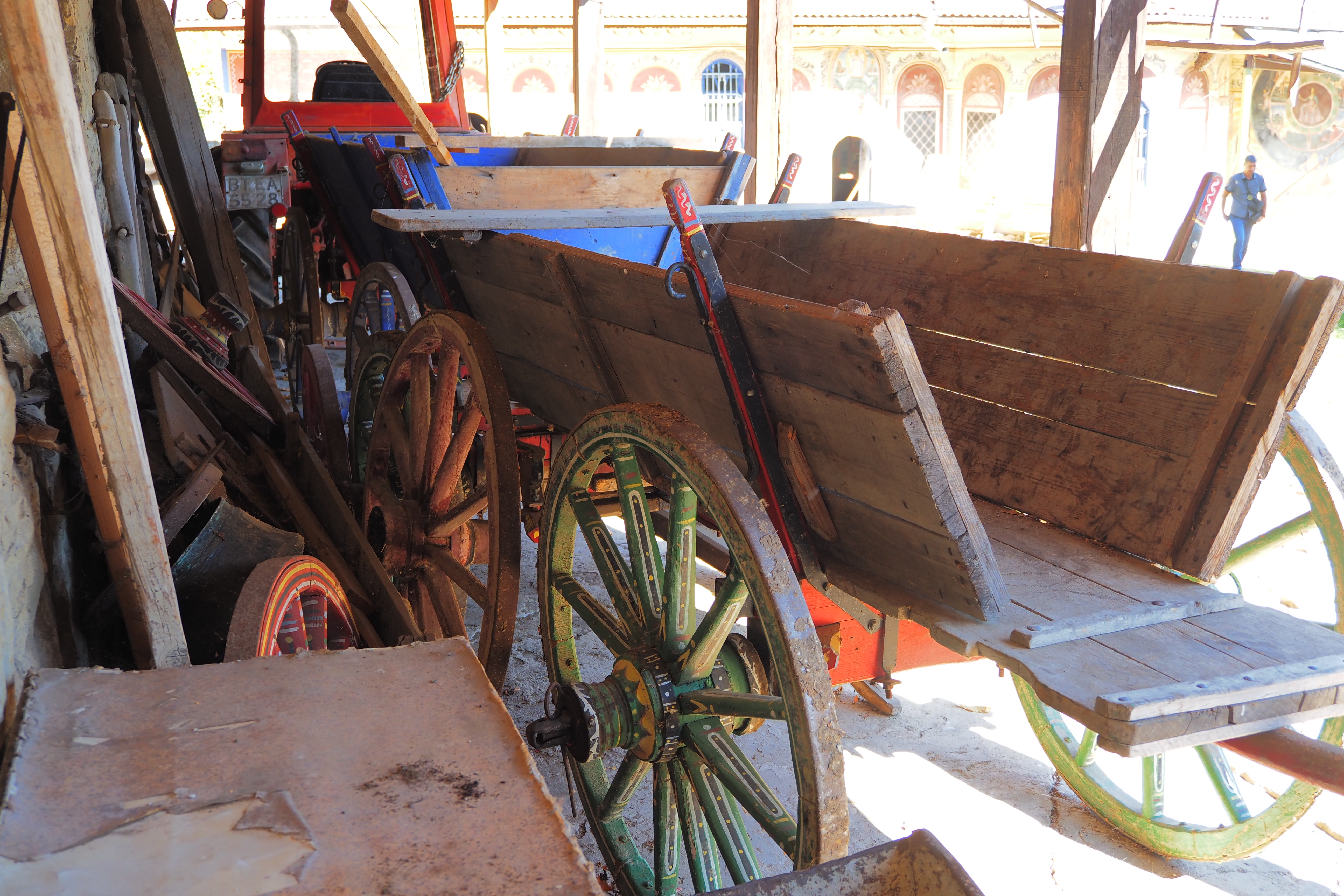 修道院を取り巻く木造の建物群と、そこに無造作に置かれた荷車など。