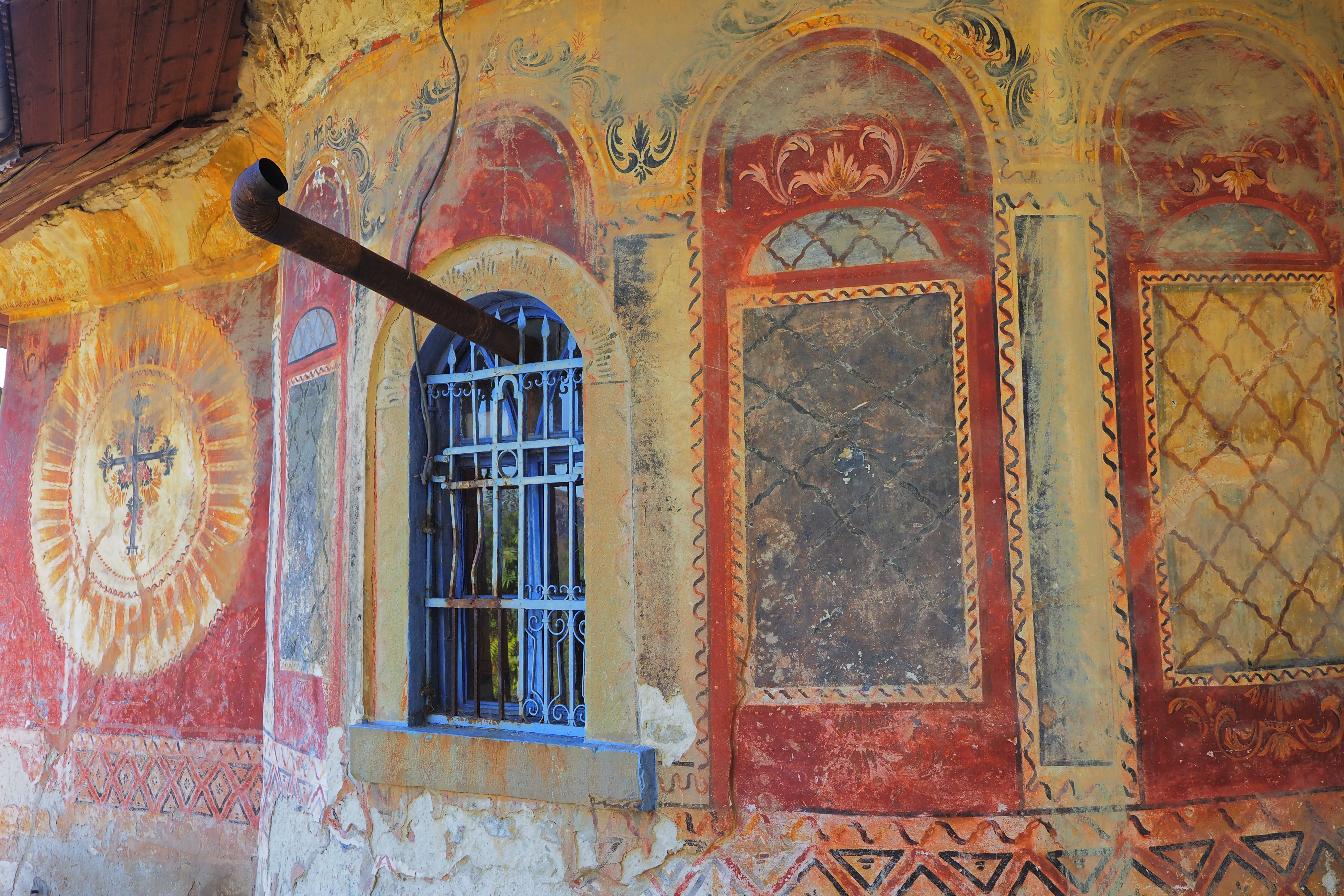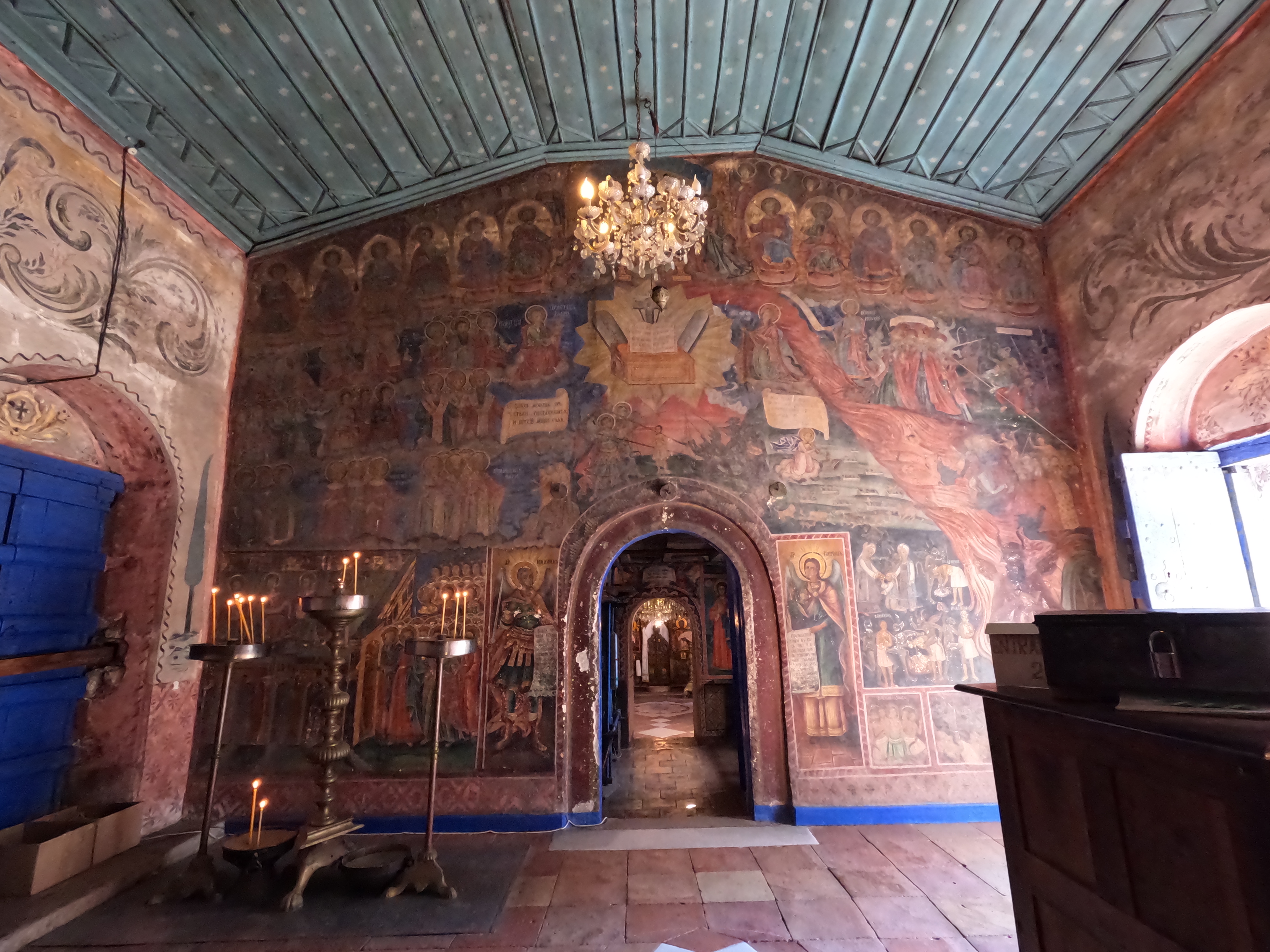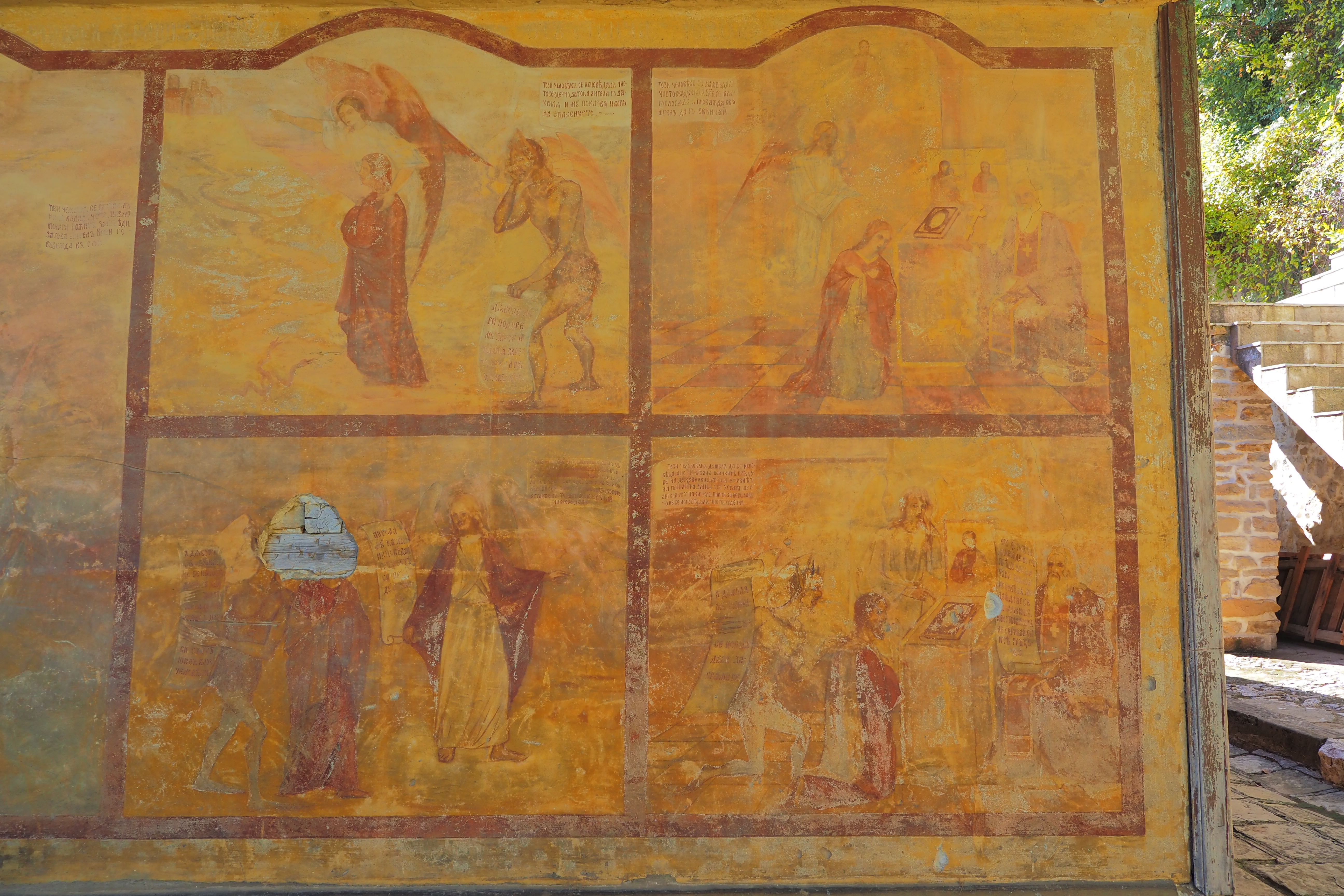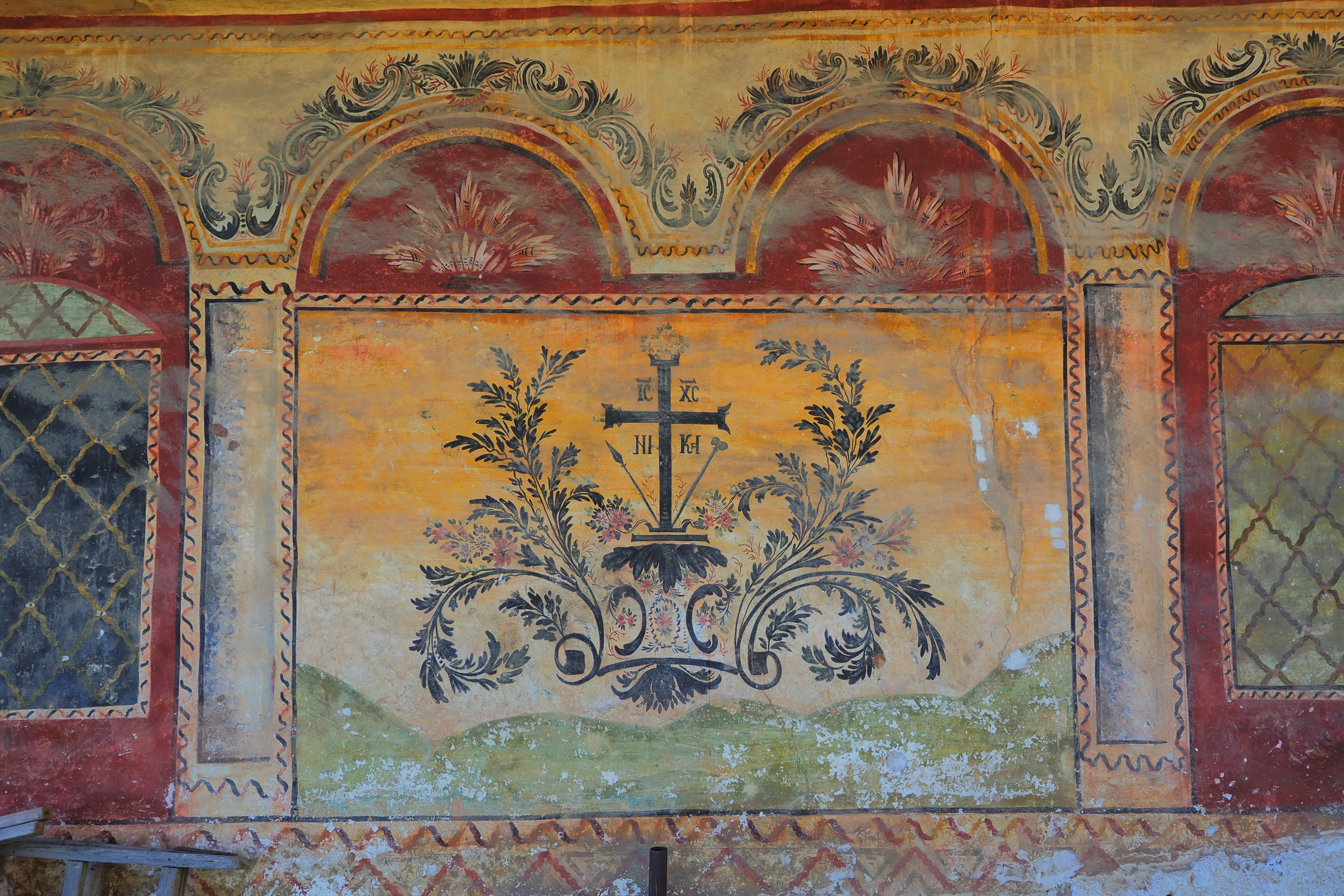 いくつかの壁で区切られた単廊の教会内も 壁画で覆われている。
