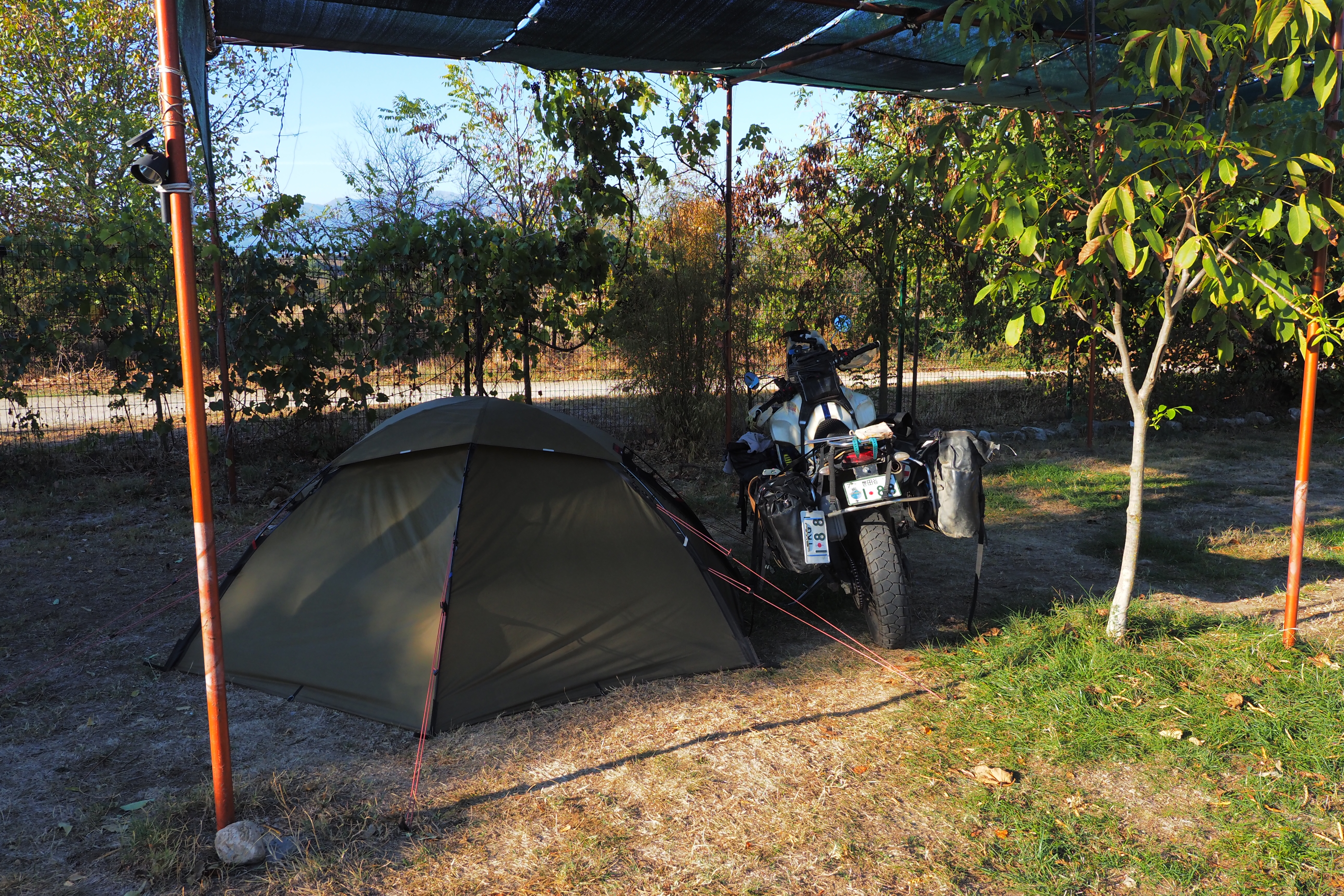 朝。昨夜は屋根付きのスペースにテントを張らせてもらえた。