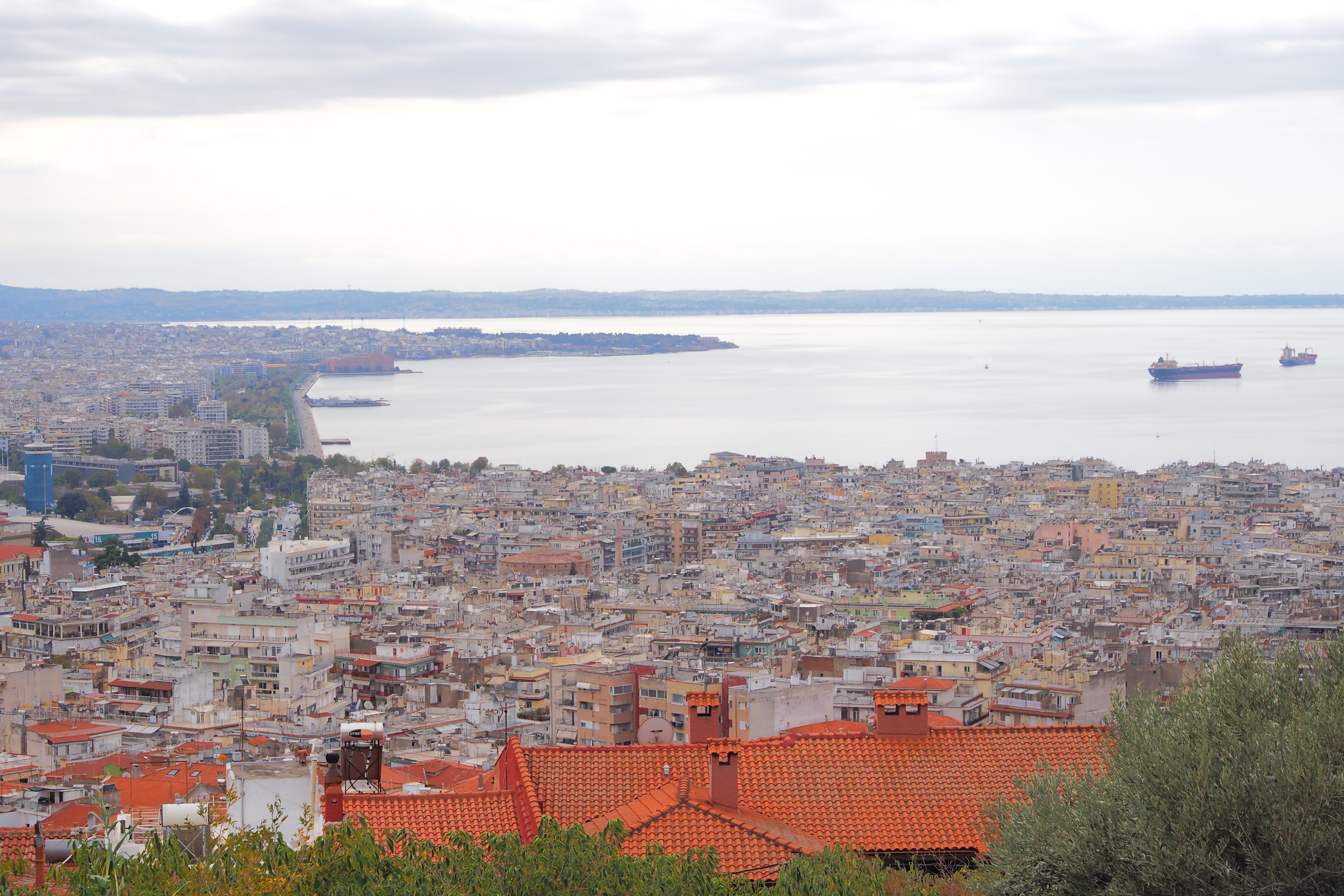 修道院の後ろからテルマイコス湾が一望される。