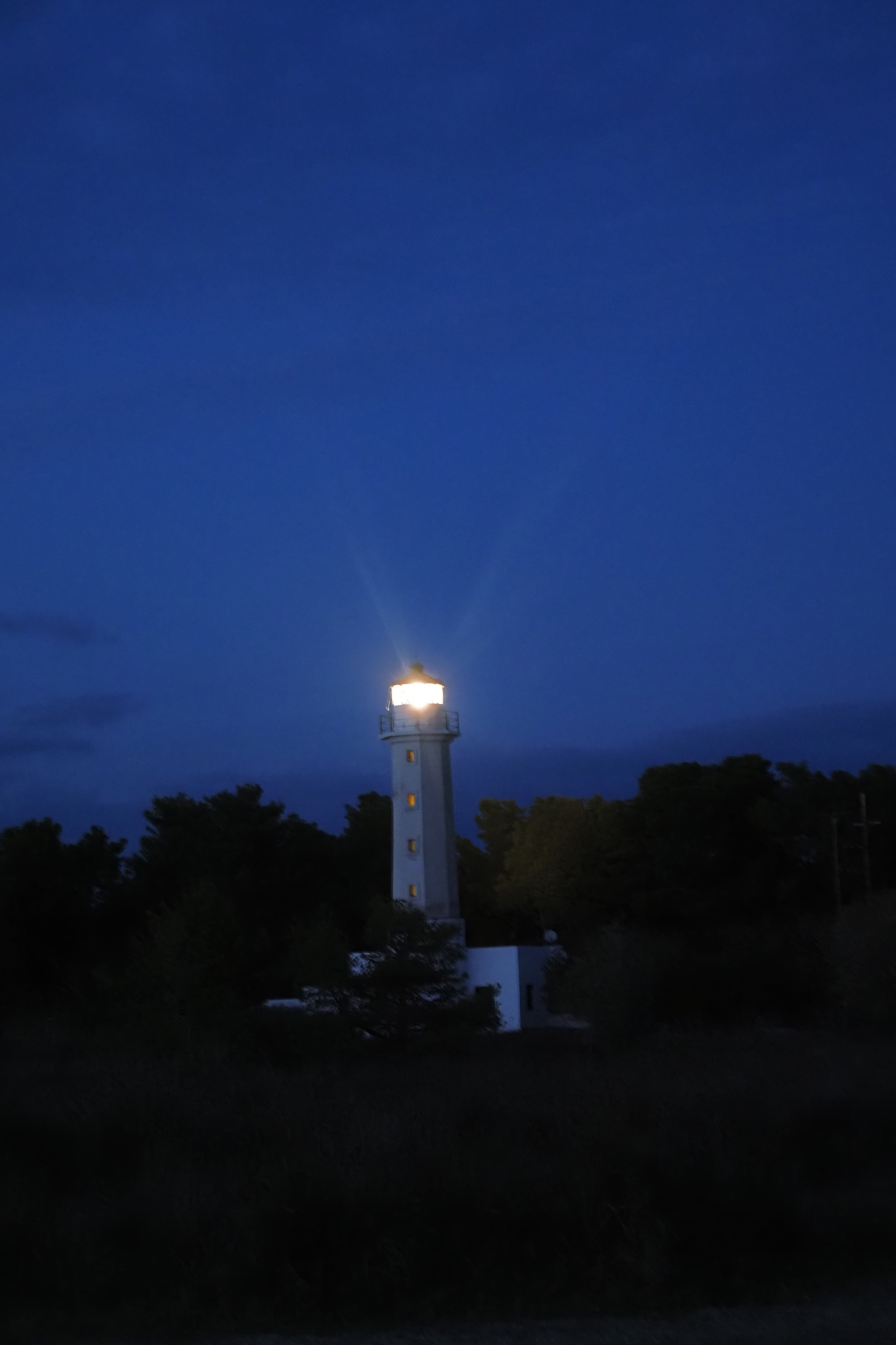 暗くなると、廃墟かと思ってたさっきのポッシディ灯台に灯が点いた。