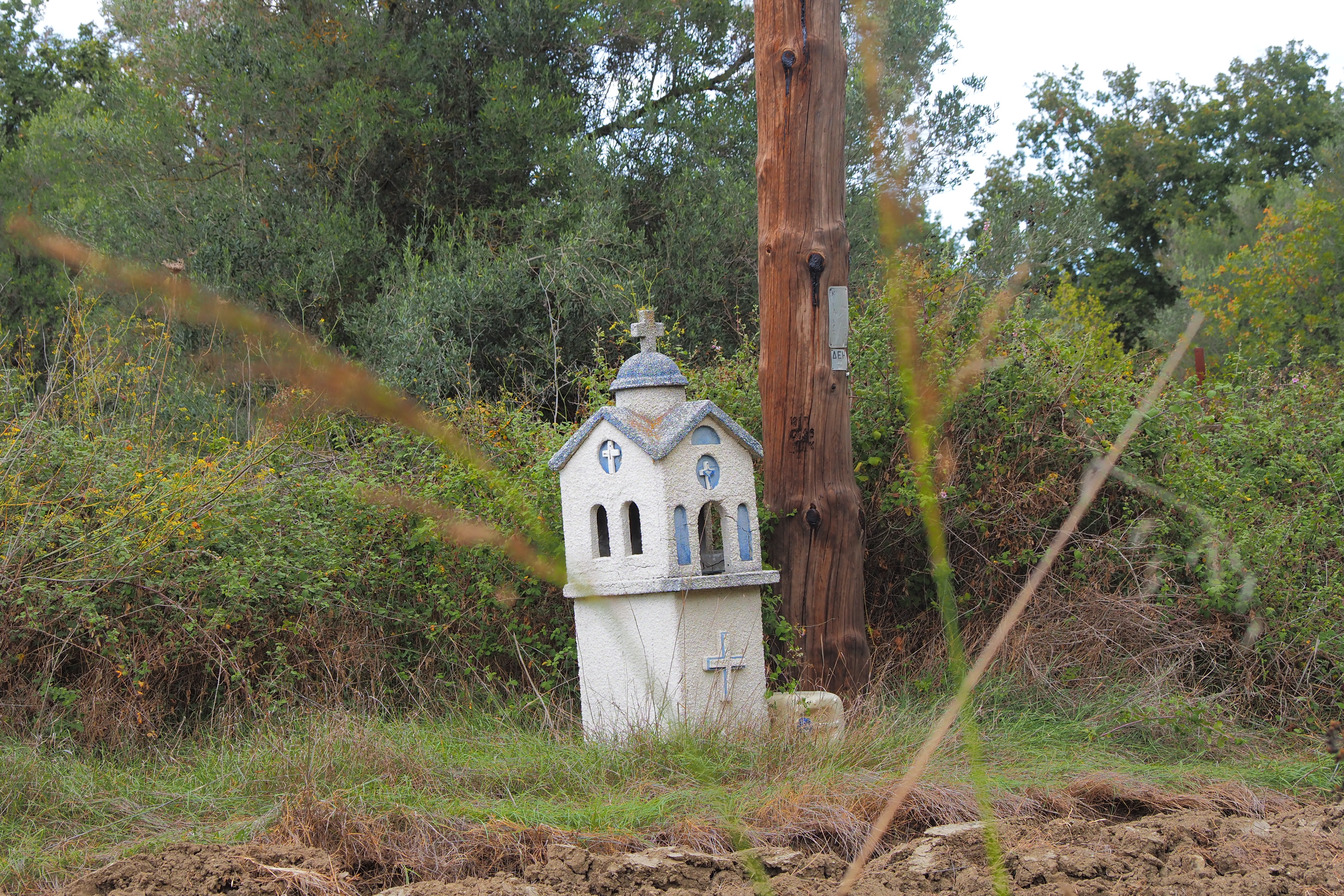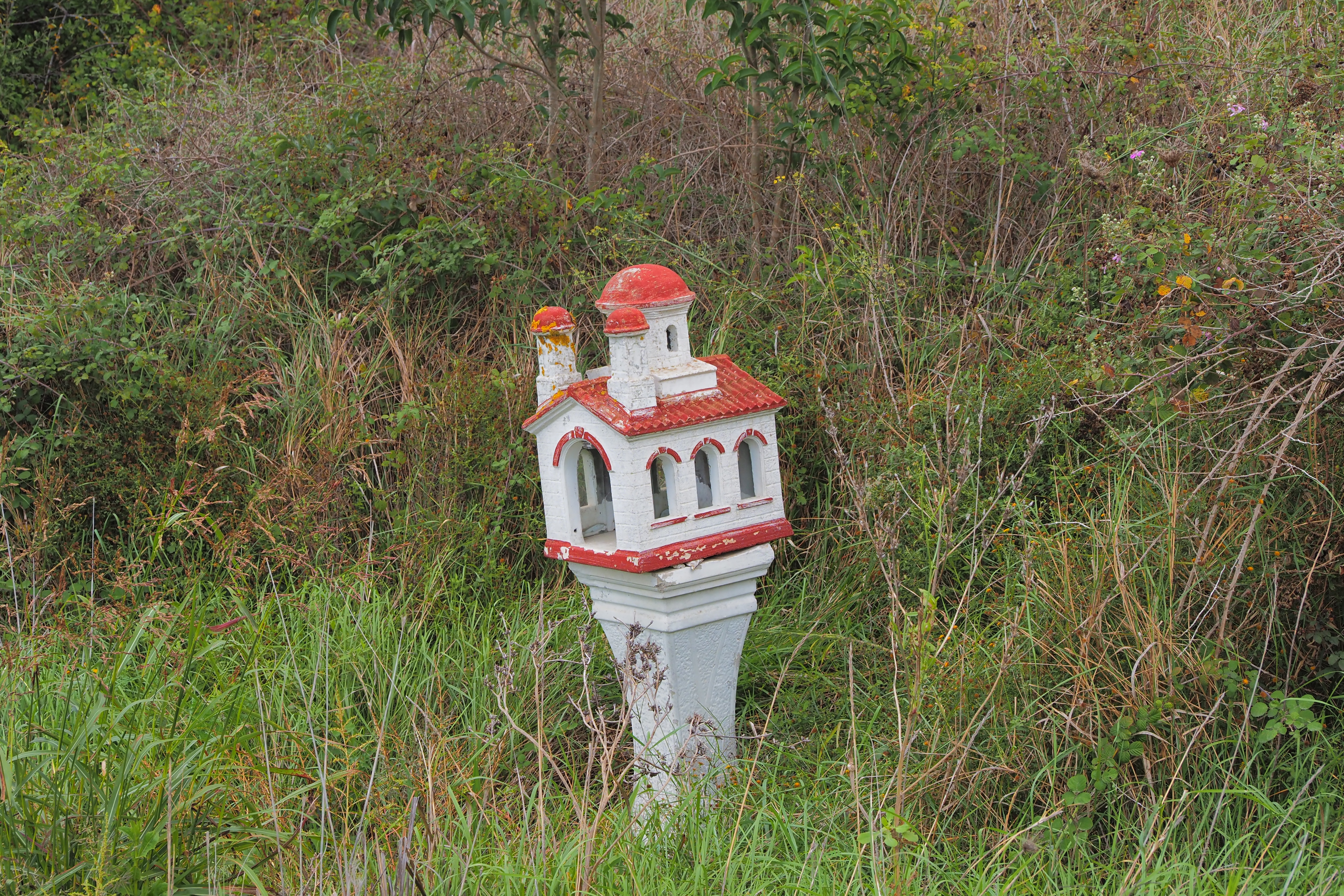 これは καντηλάκια; カンディラキア と呼ばれるモニュメントで 多くの場合は交通事故で無くなった人を追悼する意味で置かれているらしい。中を覗くと、亡くなった方ゆかりの品や写真、あるいはイコンと蝋燭が入っていることもある。