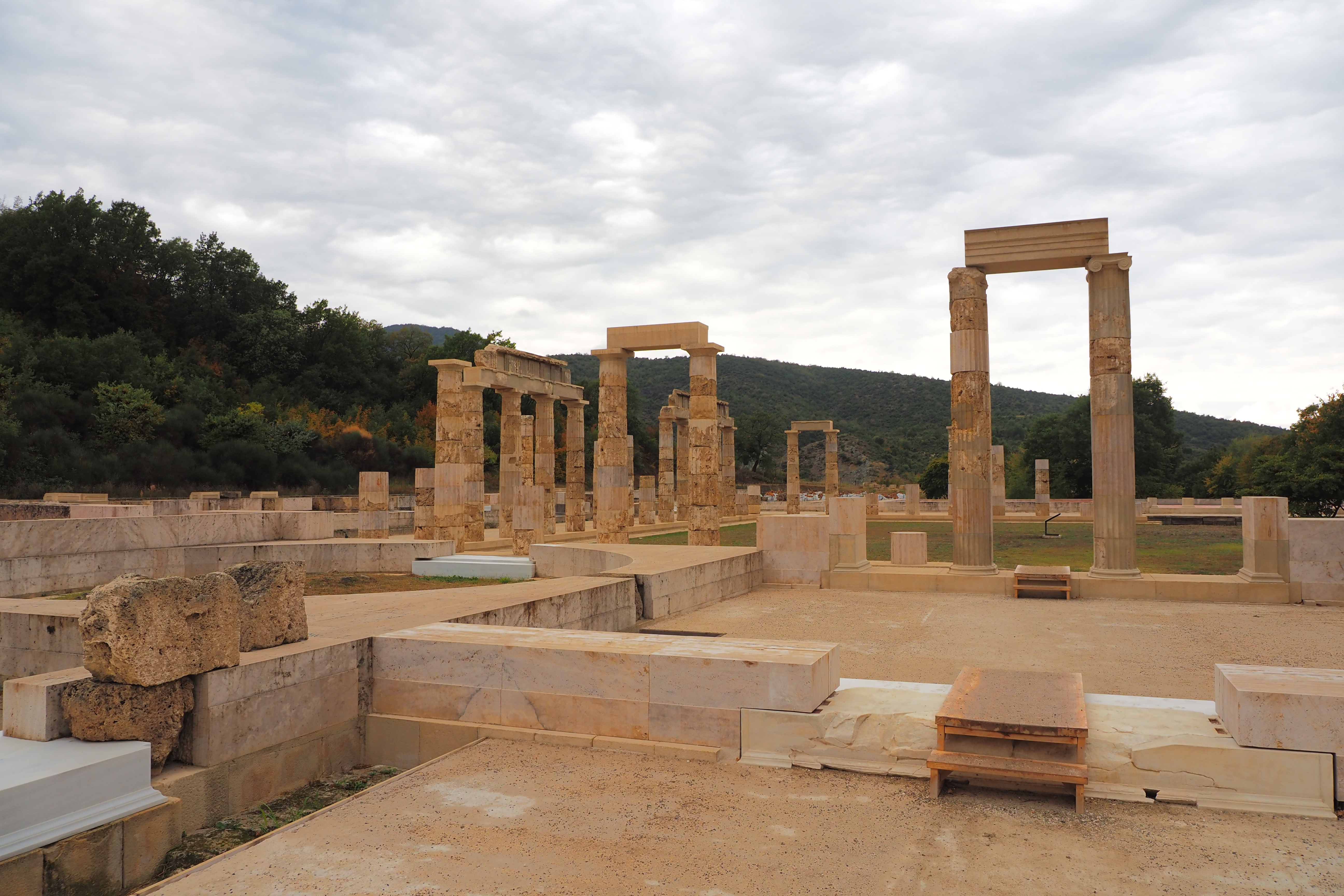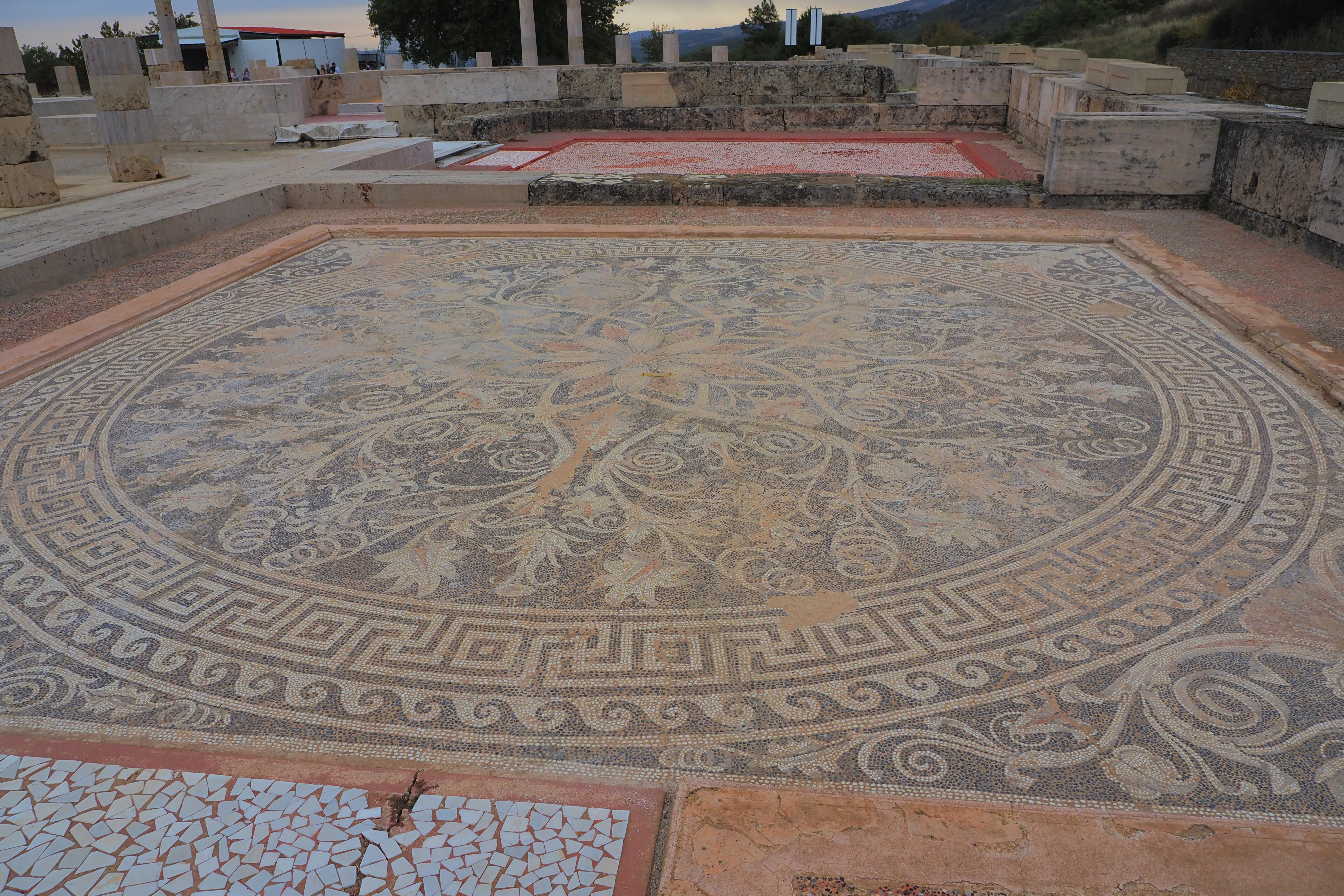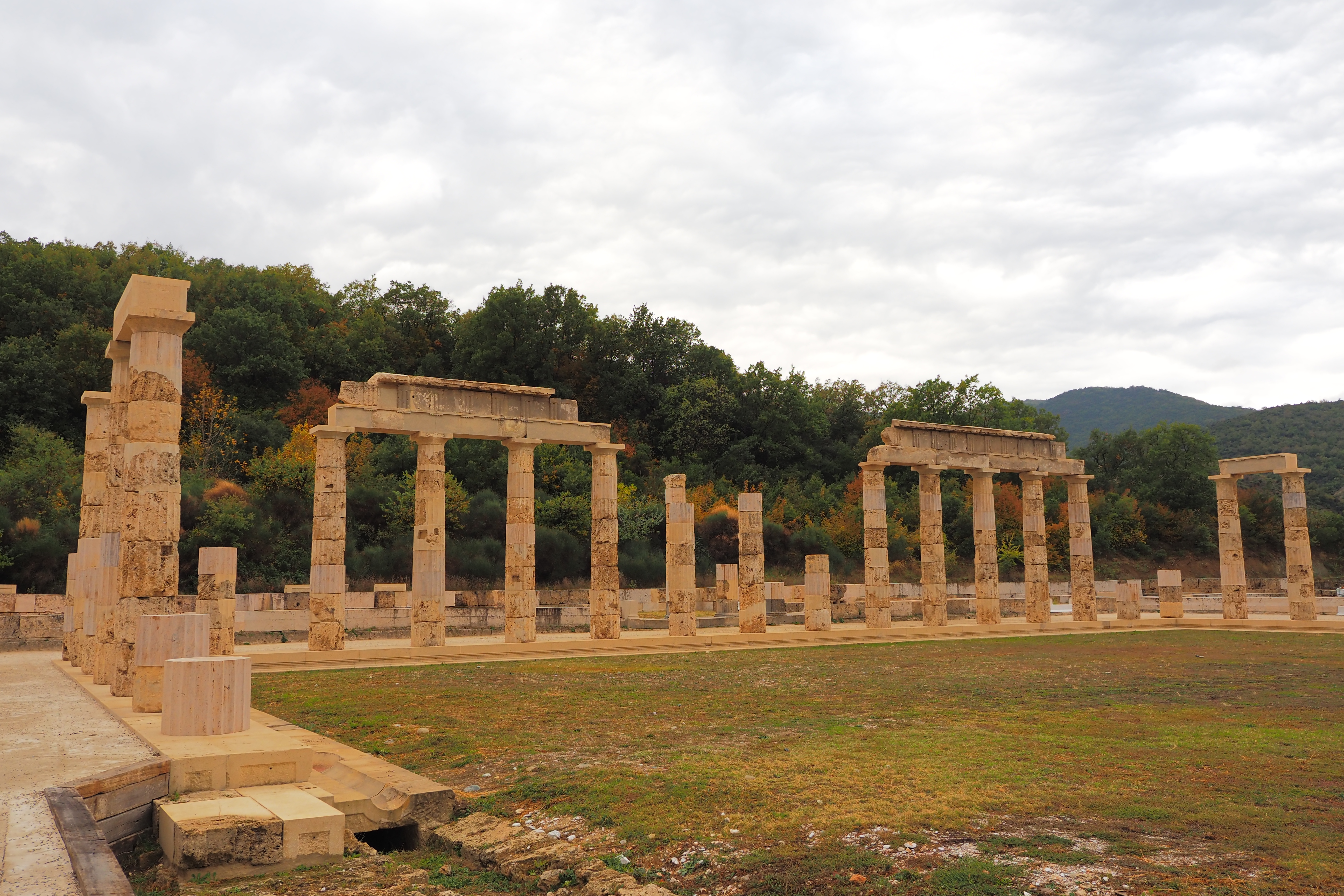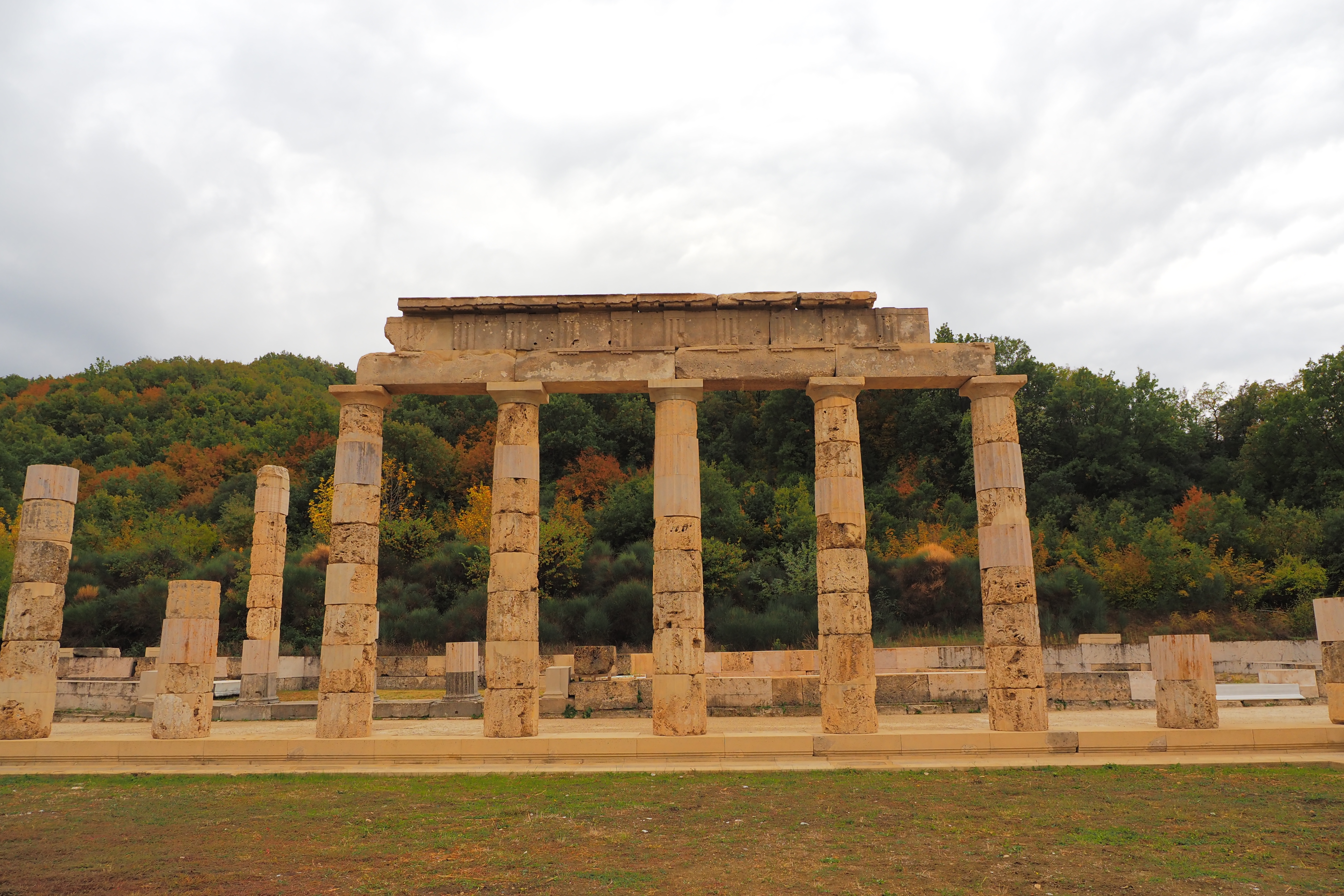 ドーリア式の列柱ペリスタイルに囲まれた広大な中庭が特徴的な遺構で、紀元前413年にPella; ペラに遷都されるまで古代マケドニア王国の首都だった場所だ。遺跡自体はかなり地味だけど、ここにかつて建っていたアイガイ宮殿は、あの有名なアテネのパルテノン神殿などと並んで古代ギリシア最大の建築物のひとつだったらしい。