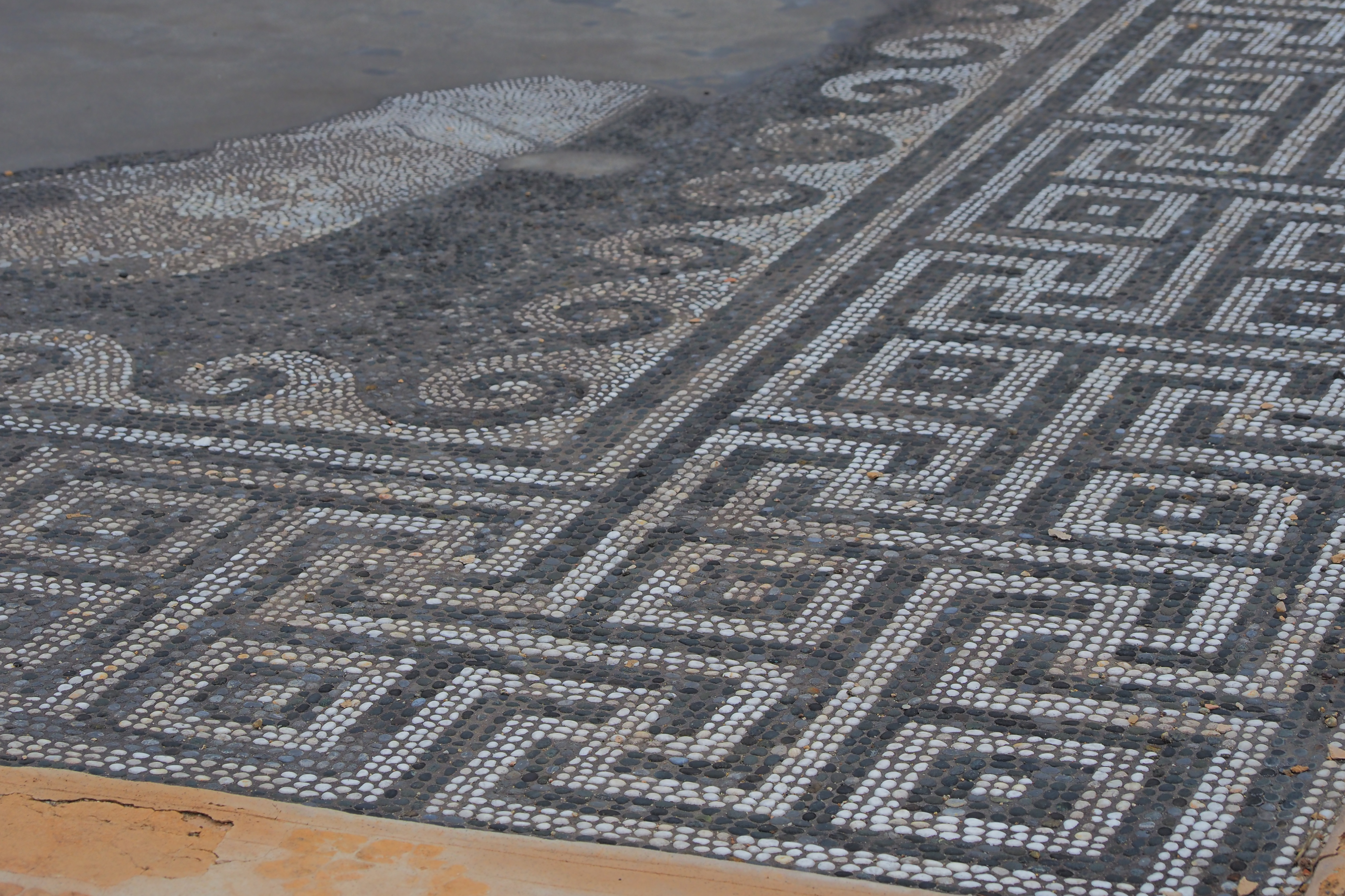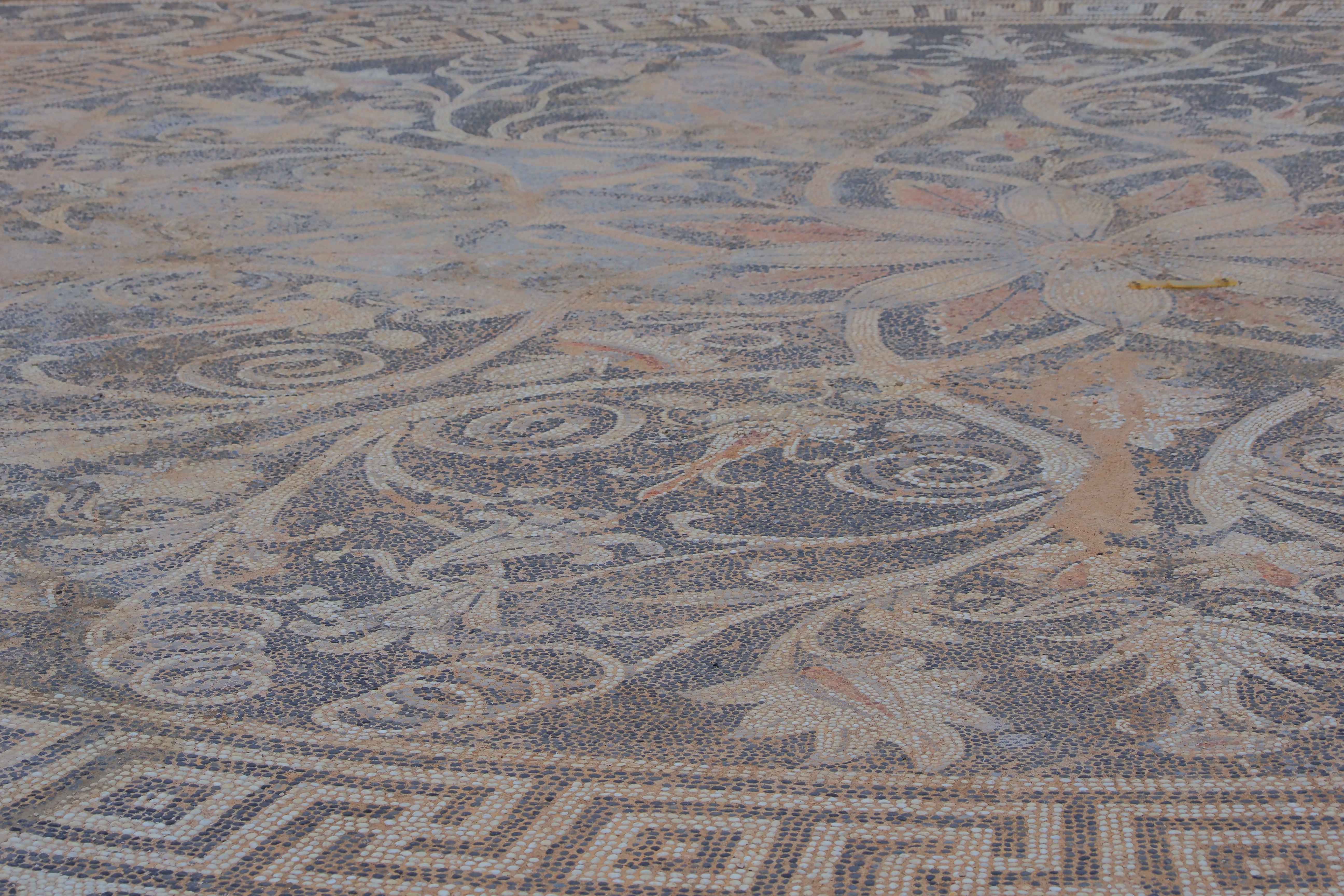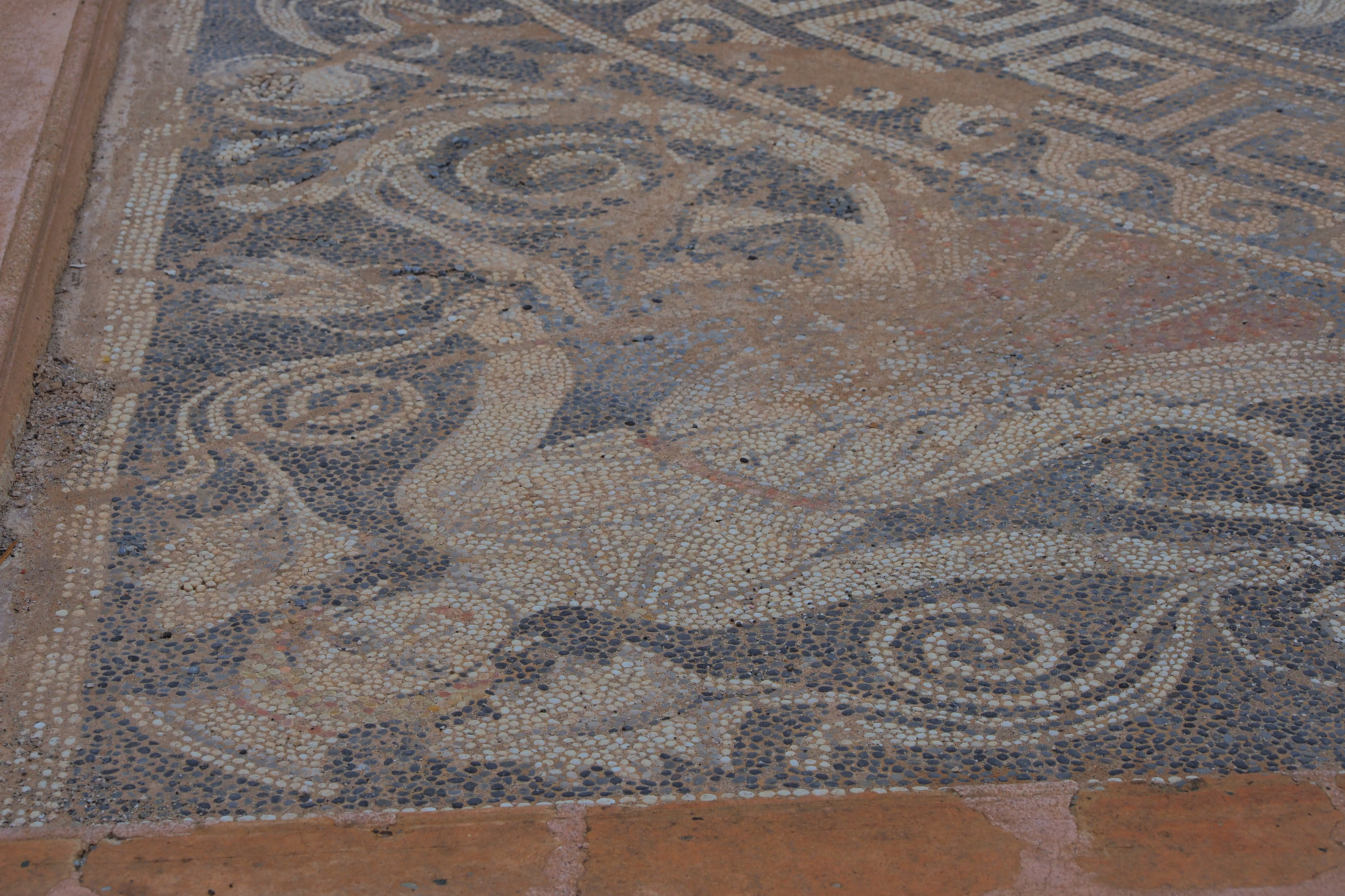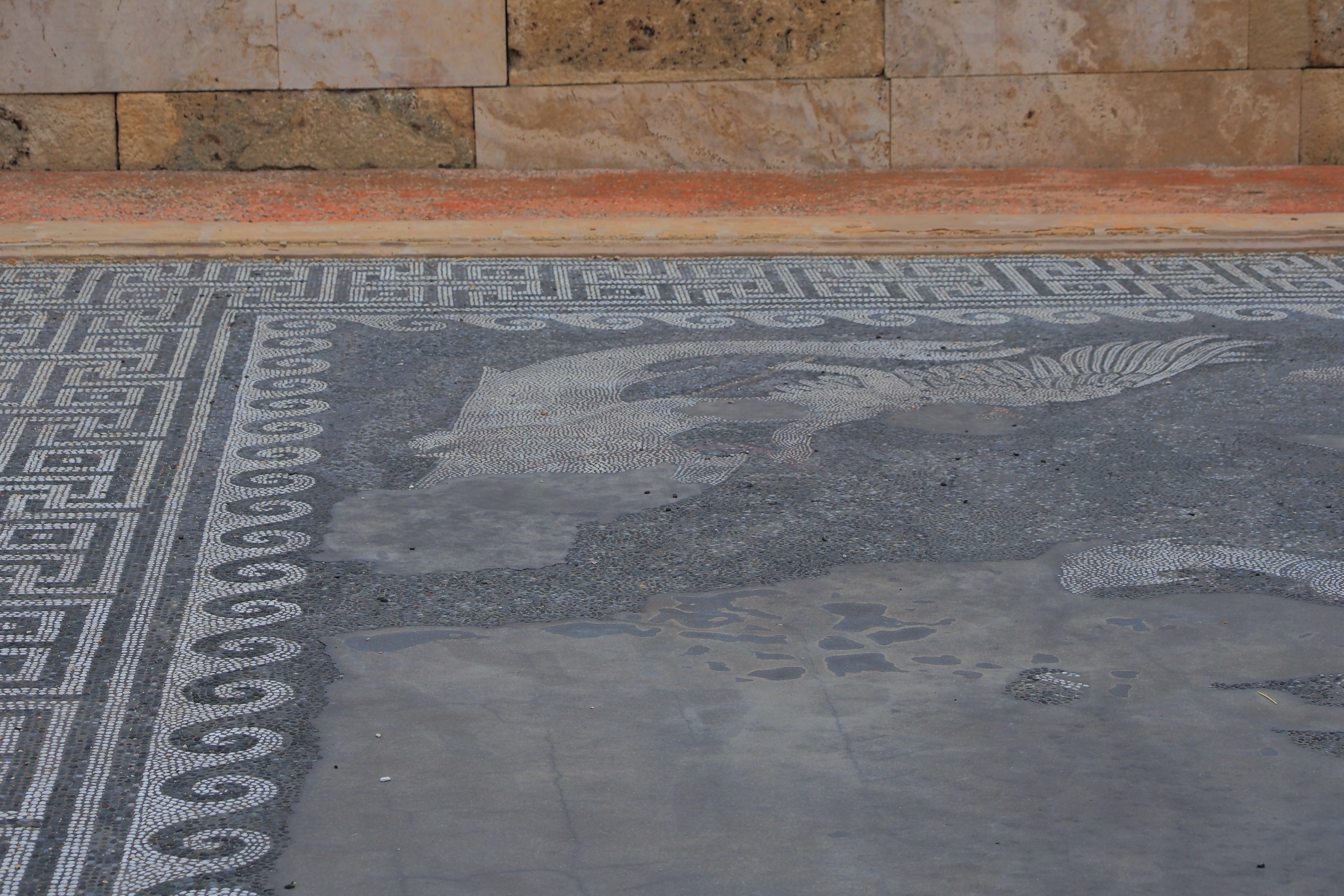 地滑りによって遺跡上に大量の土砂が積もって、この2千数百年前のモザイクが保存されたんだと。