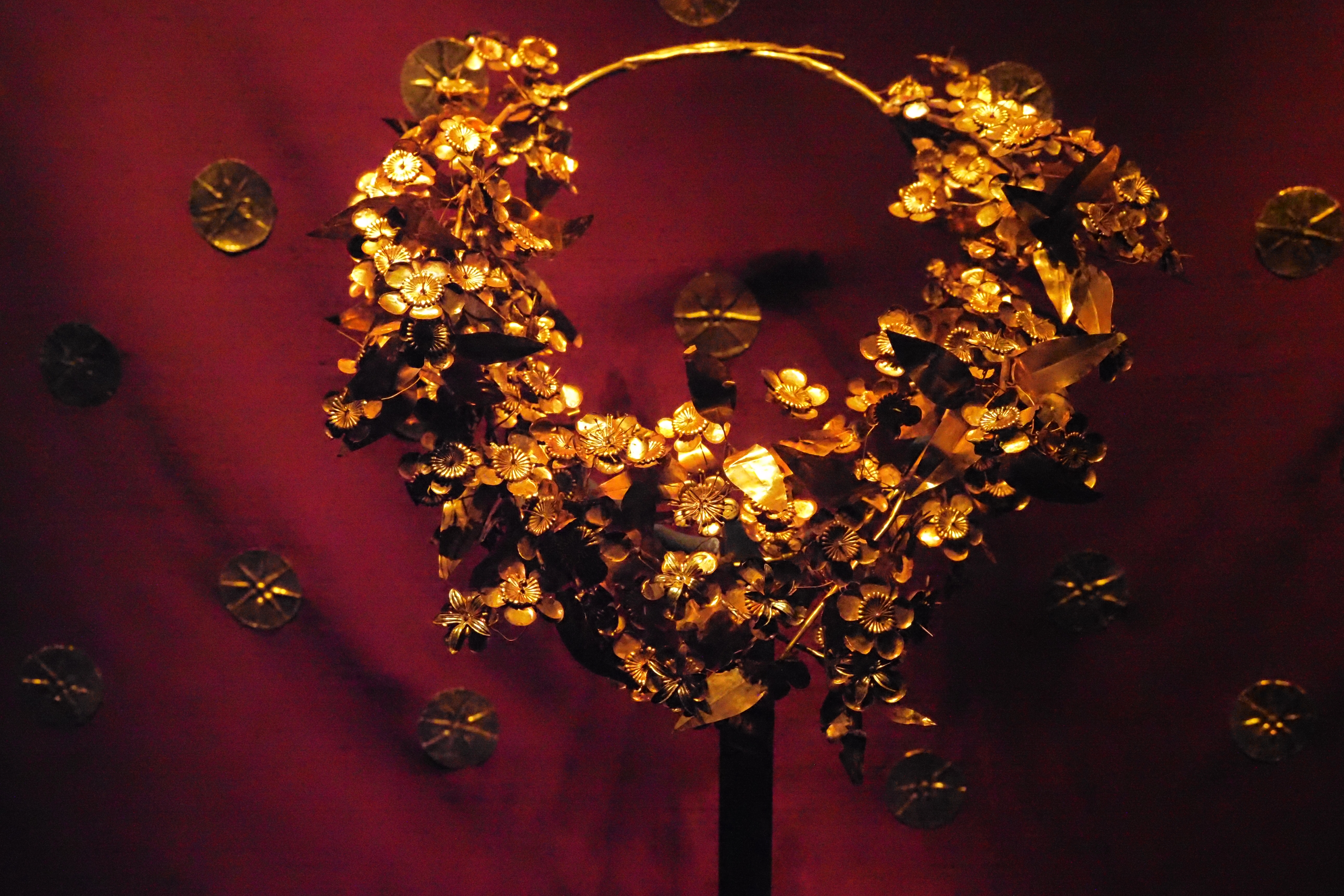 同じく前室で発見されたフィリッポスⅡ世の妻が身に着けていた黄金の月桂冠。