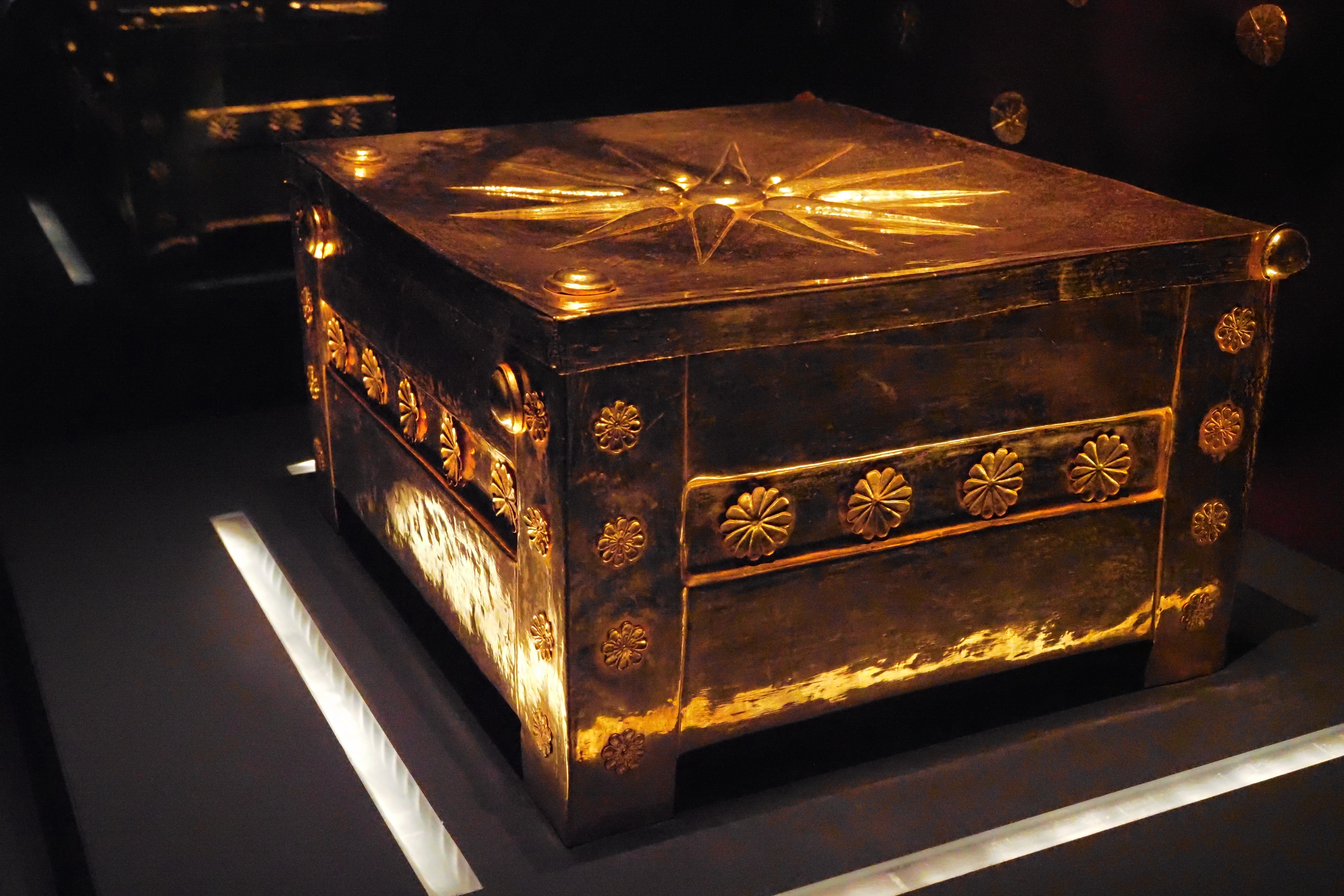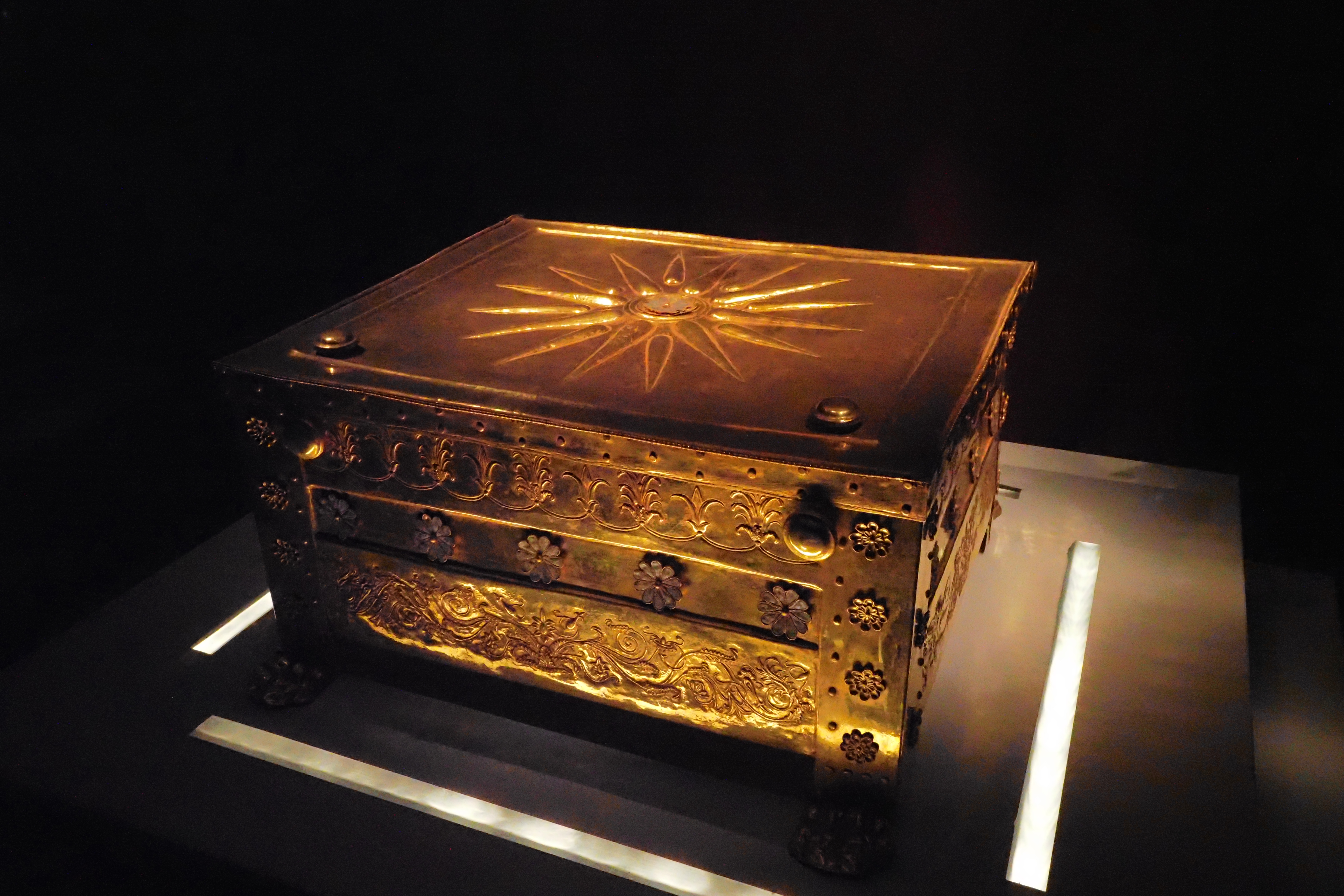 そしてこれがフィリッポスⅡ世の妻のひとり、トラキア王女 Meda; メダ の遺骨、ないし遺灰を納めていた Larnax; ラルナックスとよばれる黄金の箱だ。上部には Vergina Sun; ヴェルギナの太陽があしらわれている。