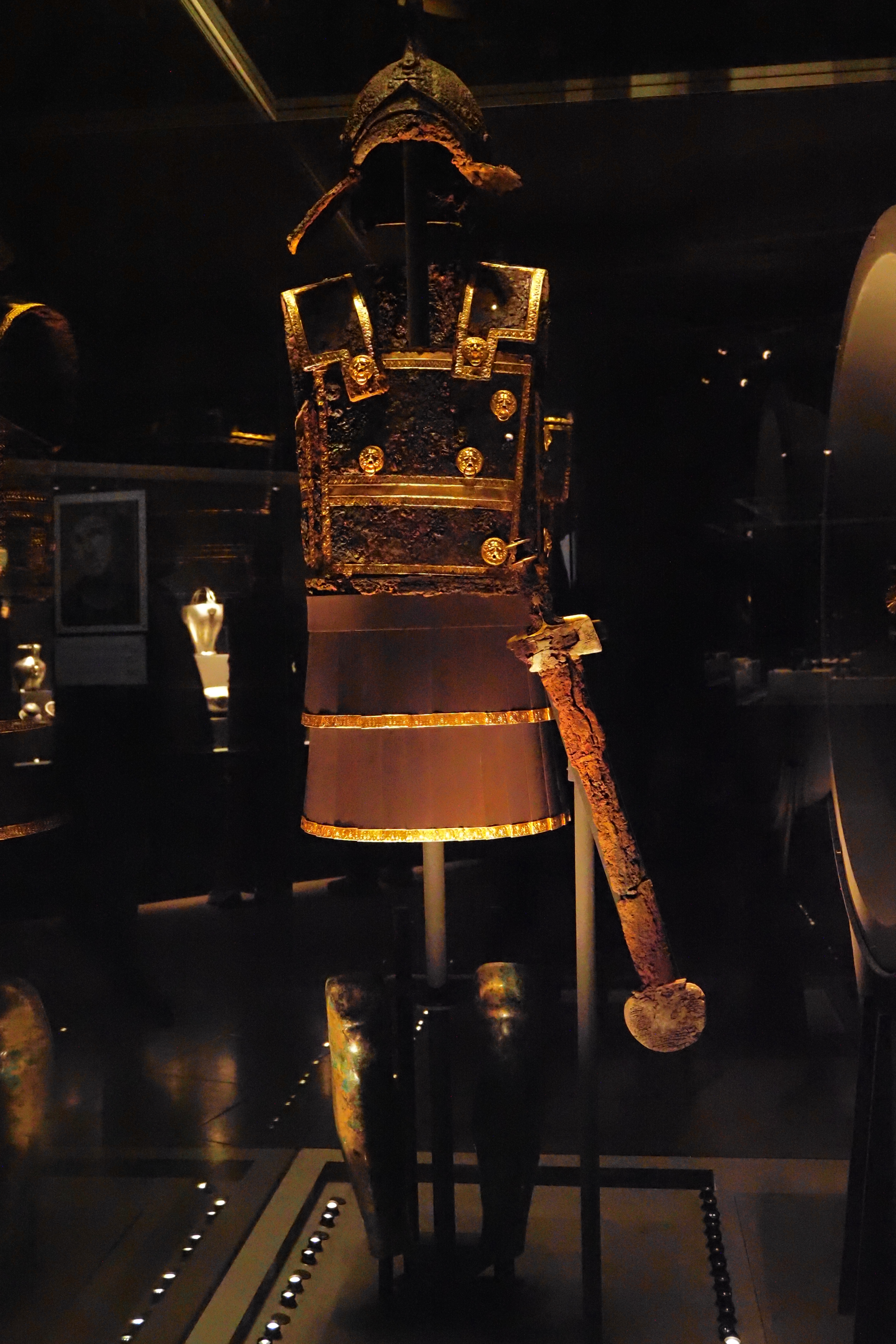 フィリッポスⅡ世が身に着けていた鎧と、象嵌が見事な盾。とくに青銅製の脛当ては 骨折が真っ直ぐ治癒しなかった王の前脛に合わせて特別に作られたらしい。