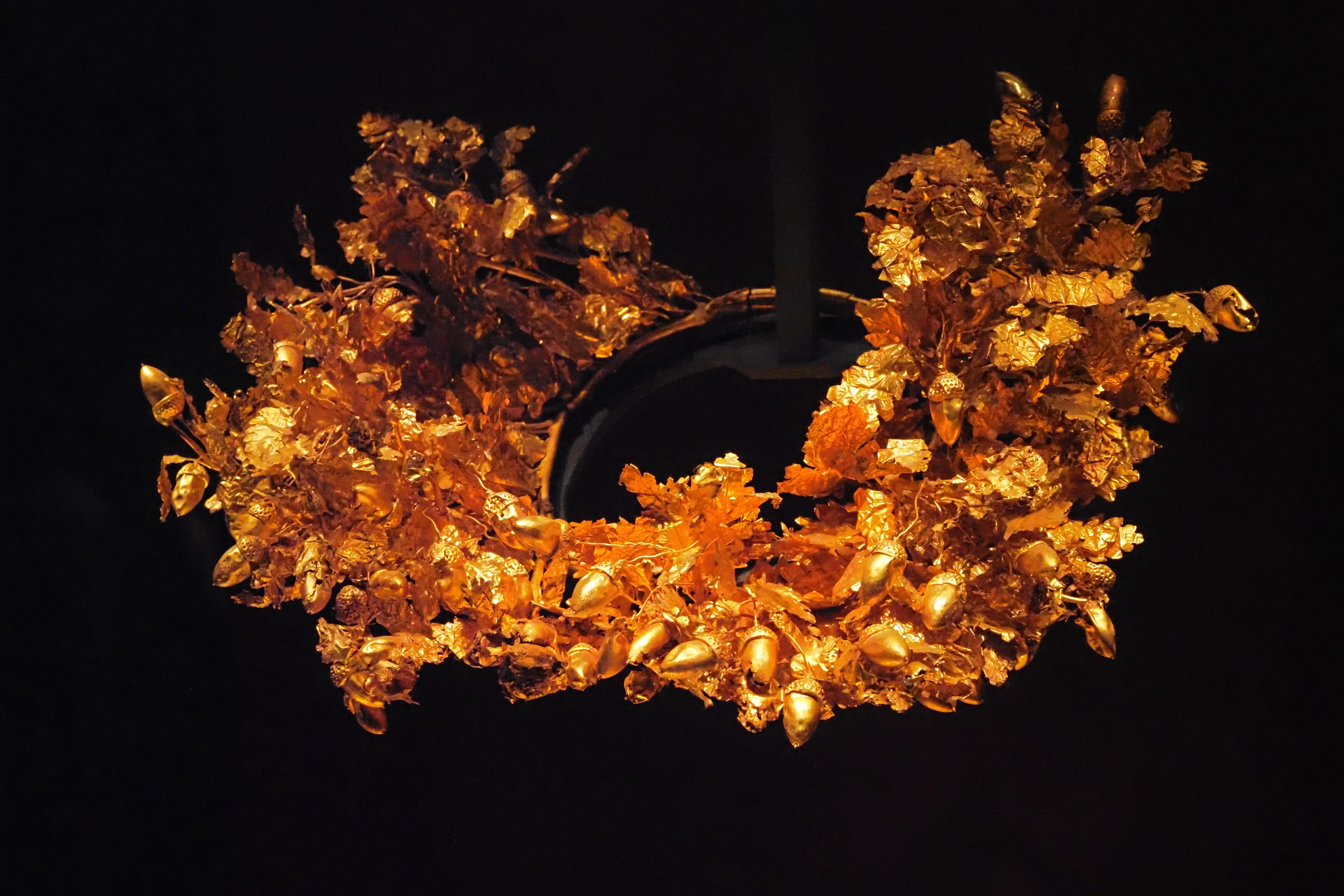 フィリッポス2世の、黄金の月桂冠。オークの葉とどんぐりが精密につくりこまれていて、思わず見入ってしまう。