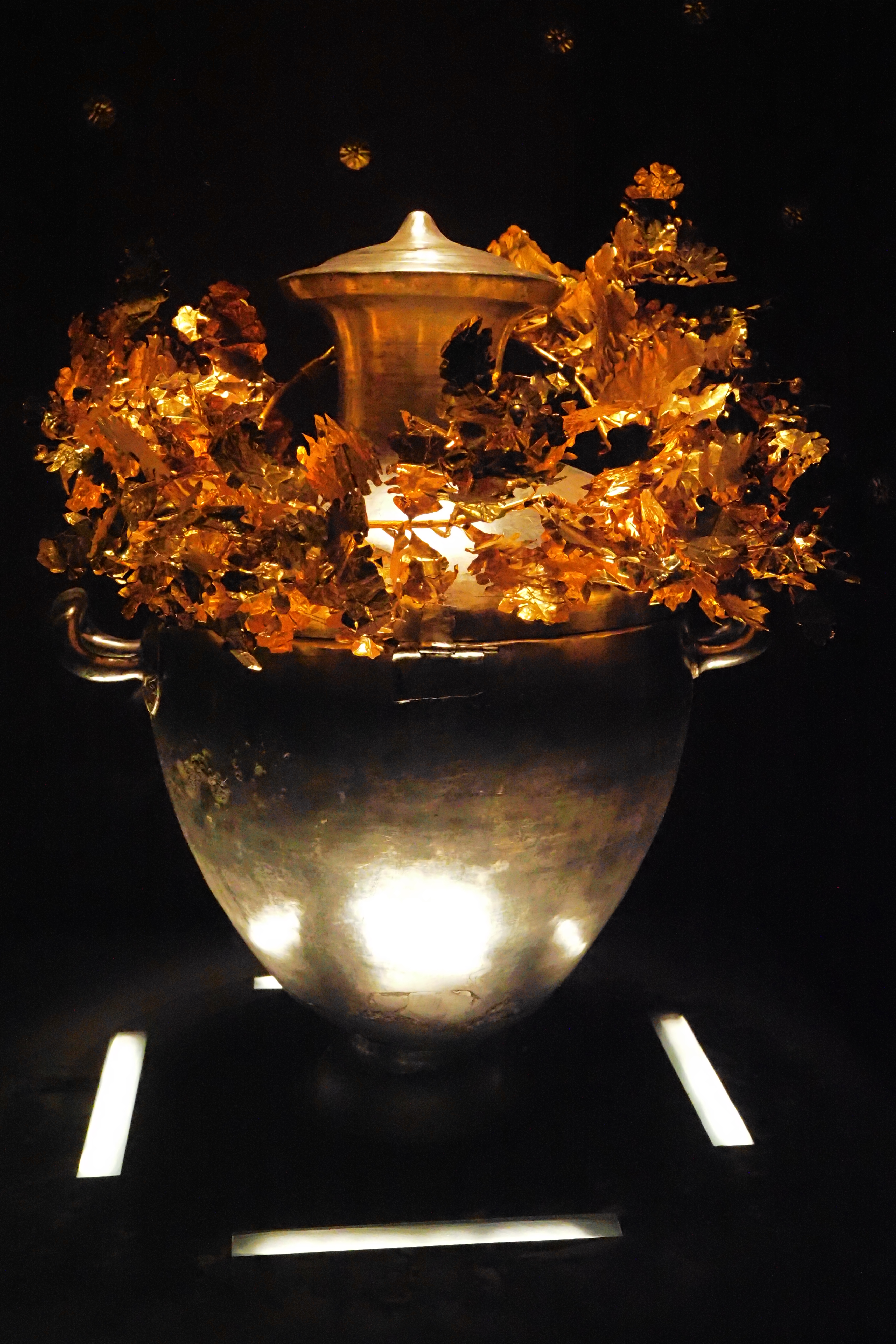 これは、Tomb Ⅲ より発見された 若い男性の遺骨(アレクサンダー大王の息子 Alexander Ⅳ; アレクサンダーⅣ世 と考えられている)を治めていた壺と、月桂冠(厳密にはオーク冠と言う方が正しいのかな・・・)。
