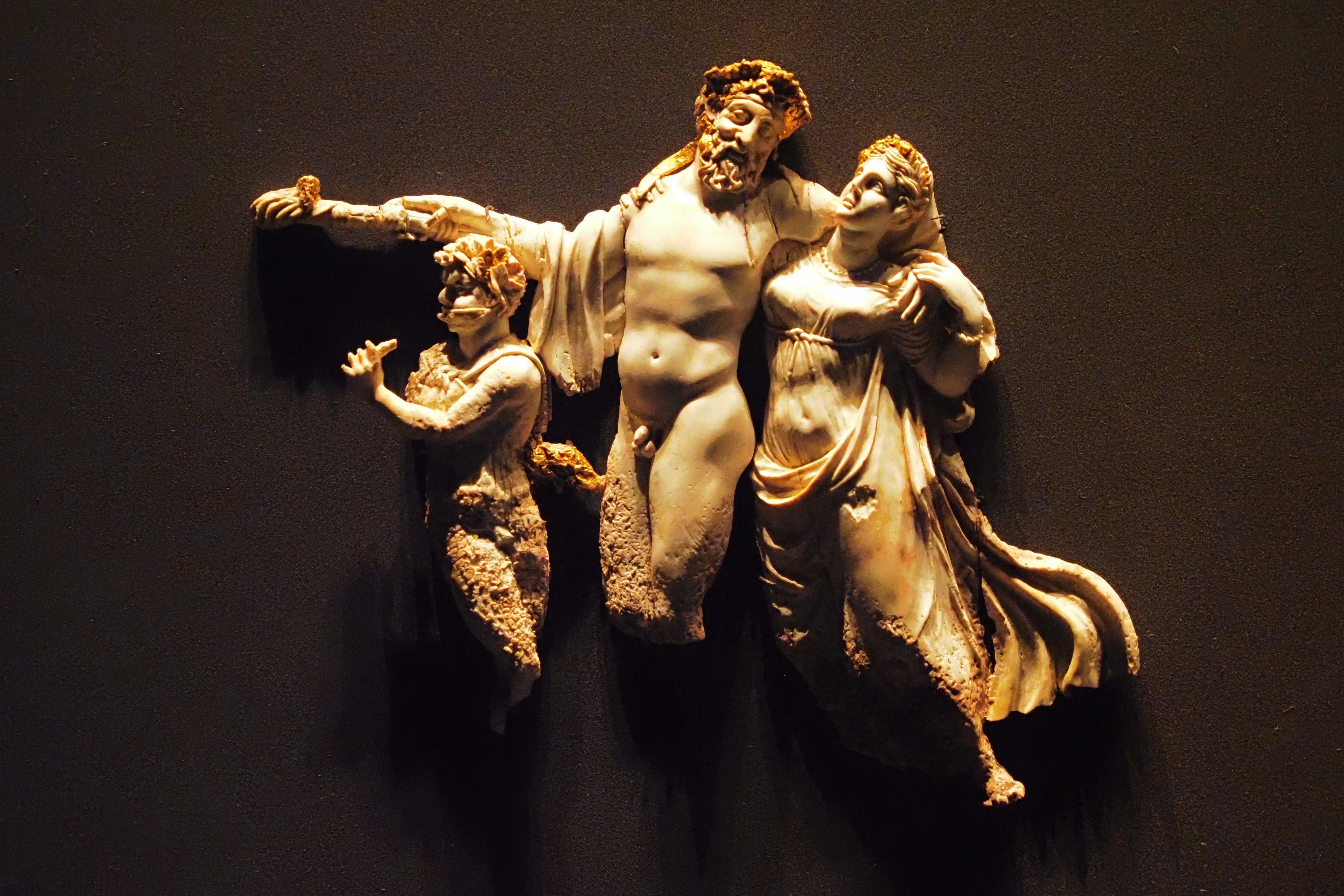 ワインと豊穣の神 Dionysus; ディオニュソス が 右手に松明を持ち、左手を伴侶の肩にまわし、そして笛を吹く牧神 Pan の後を追いかける というシーンがめちゃくちゃ精密に彫り込まれた象牙。