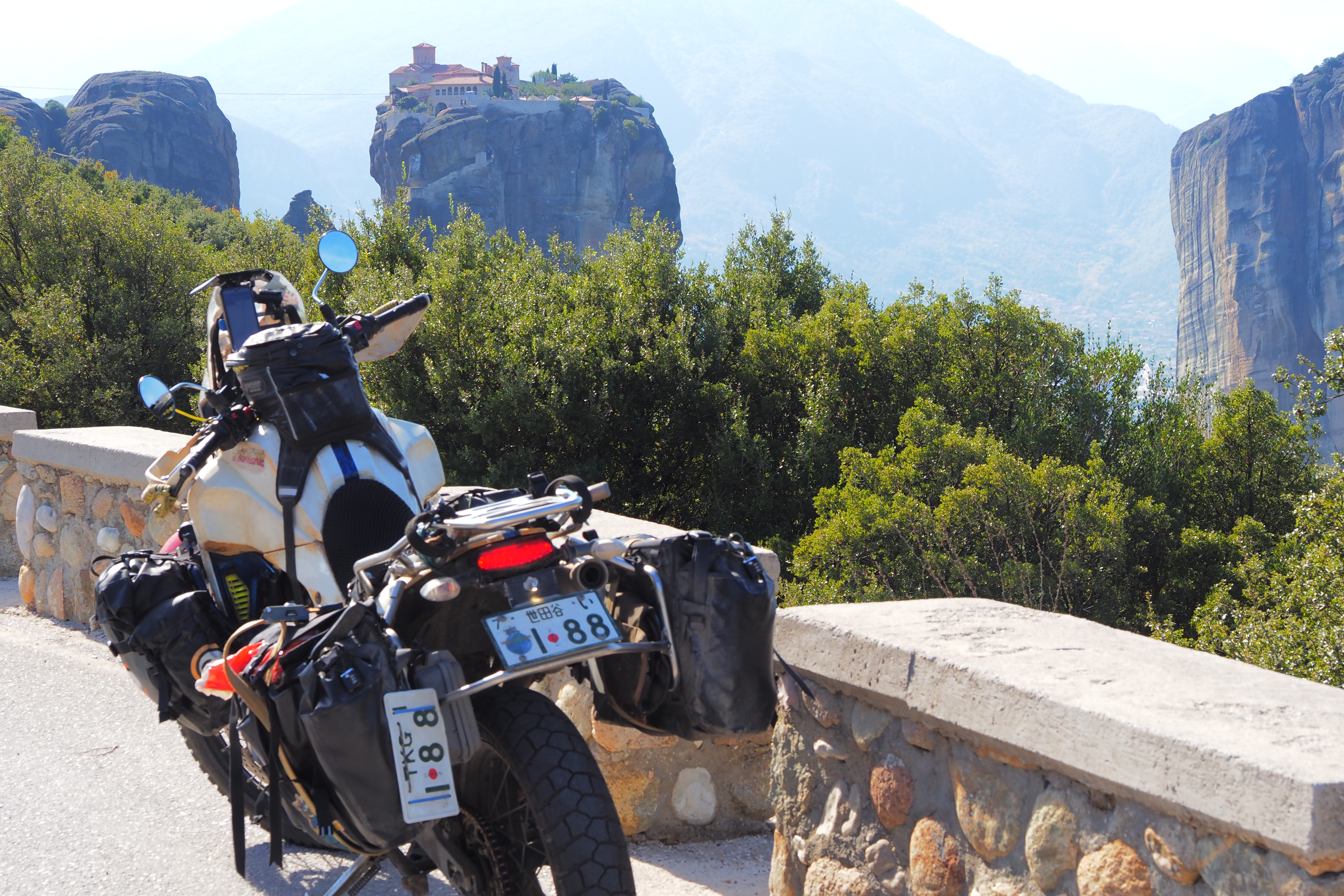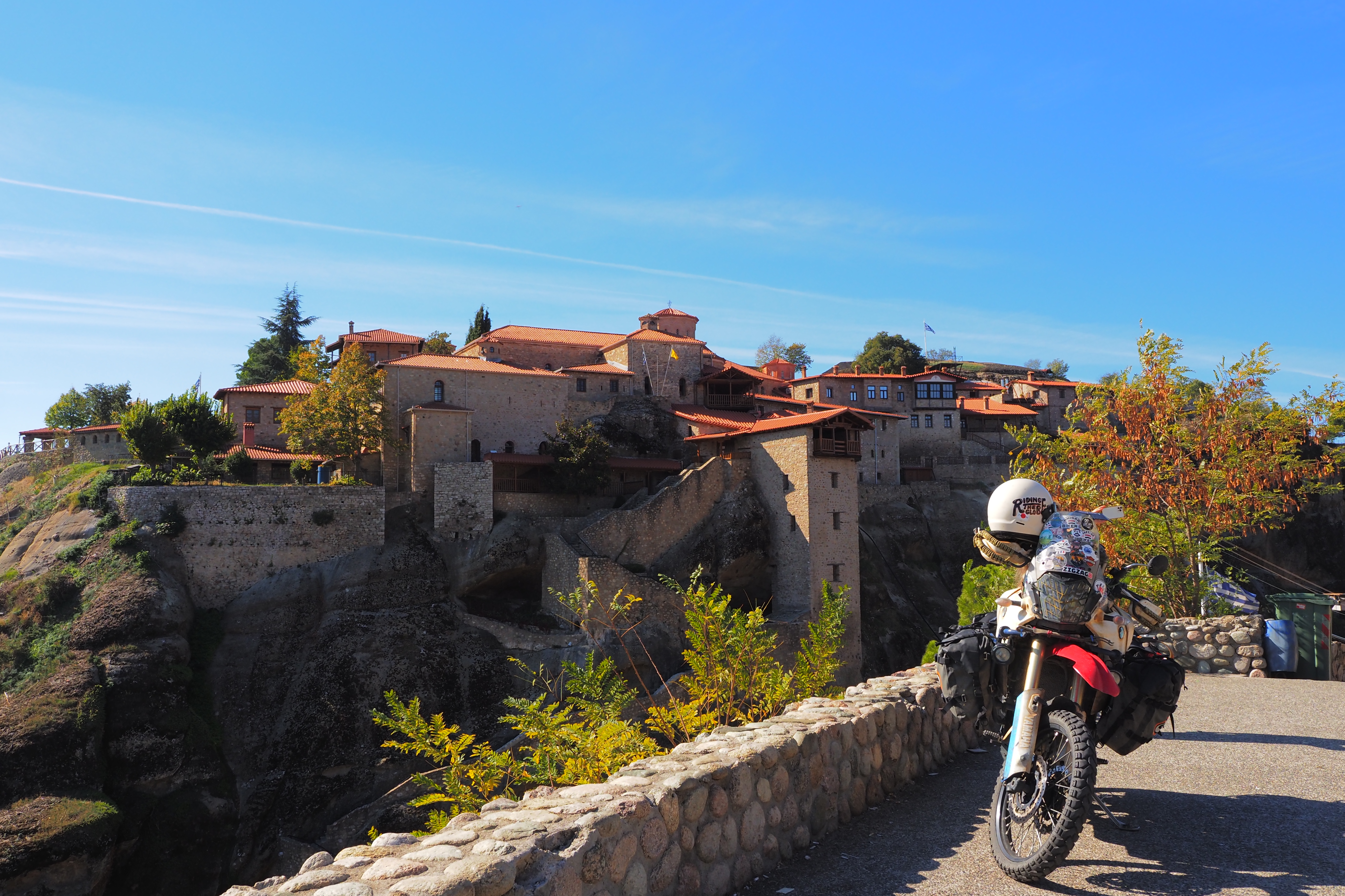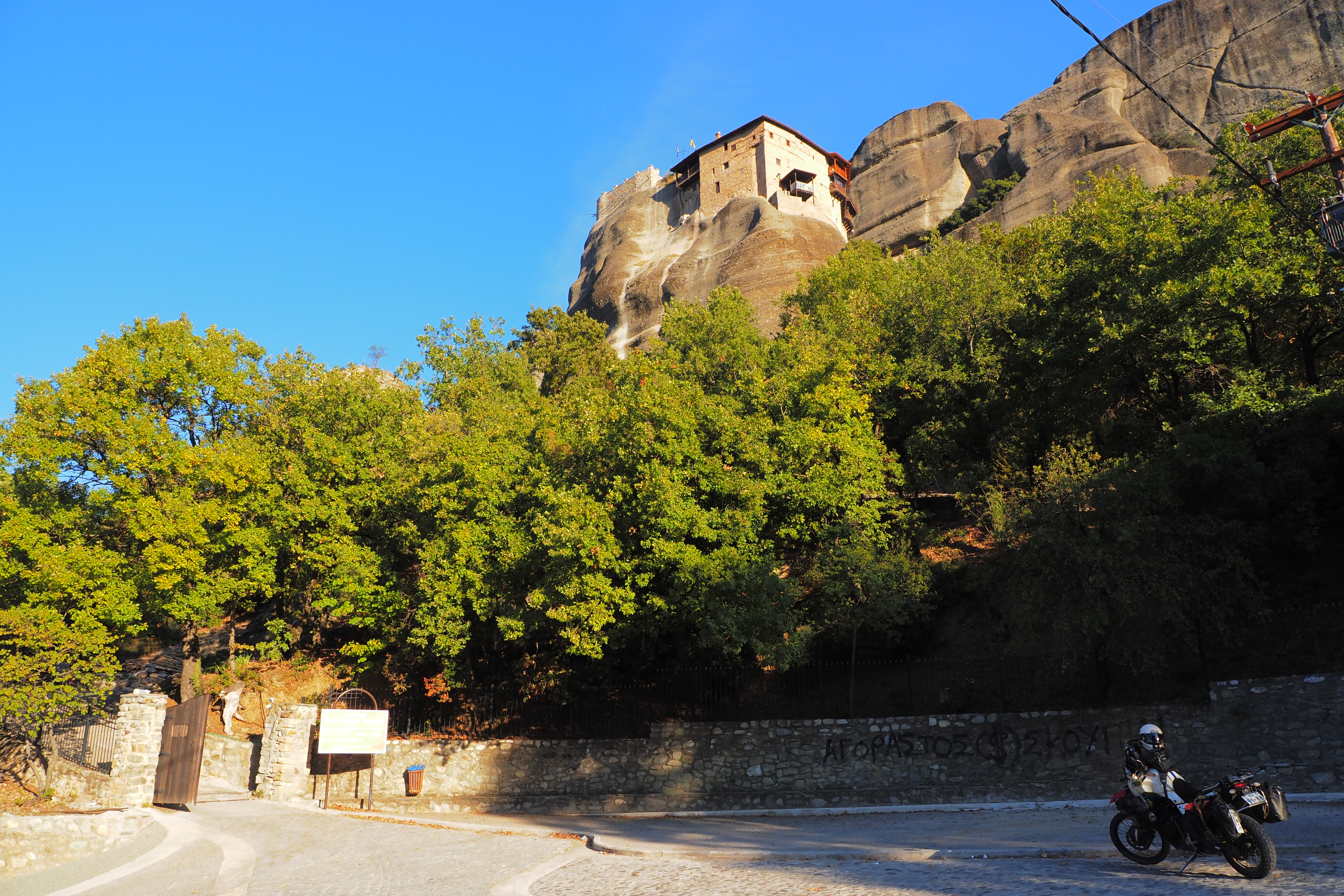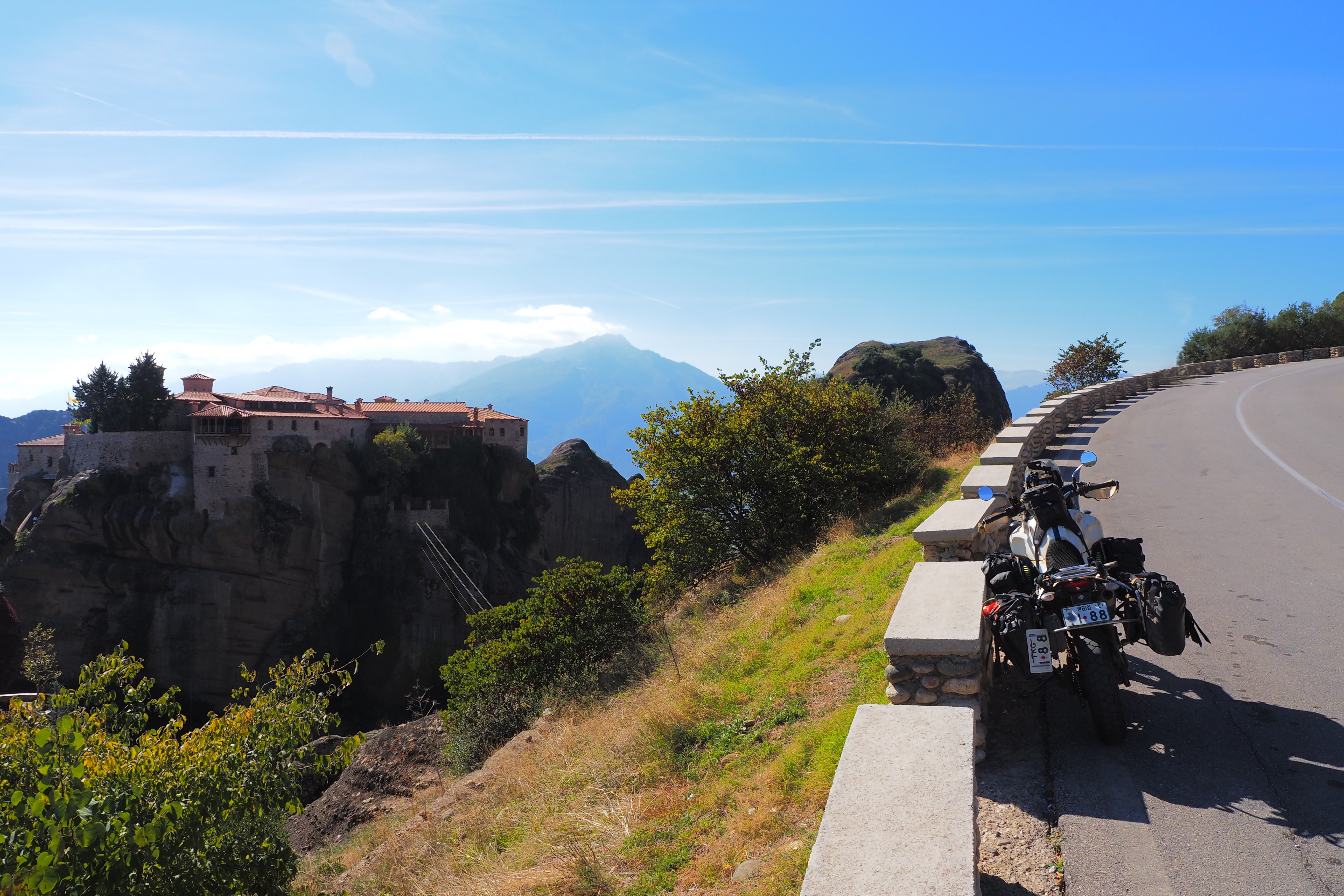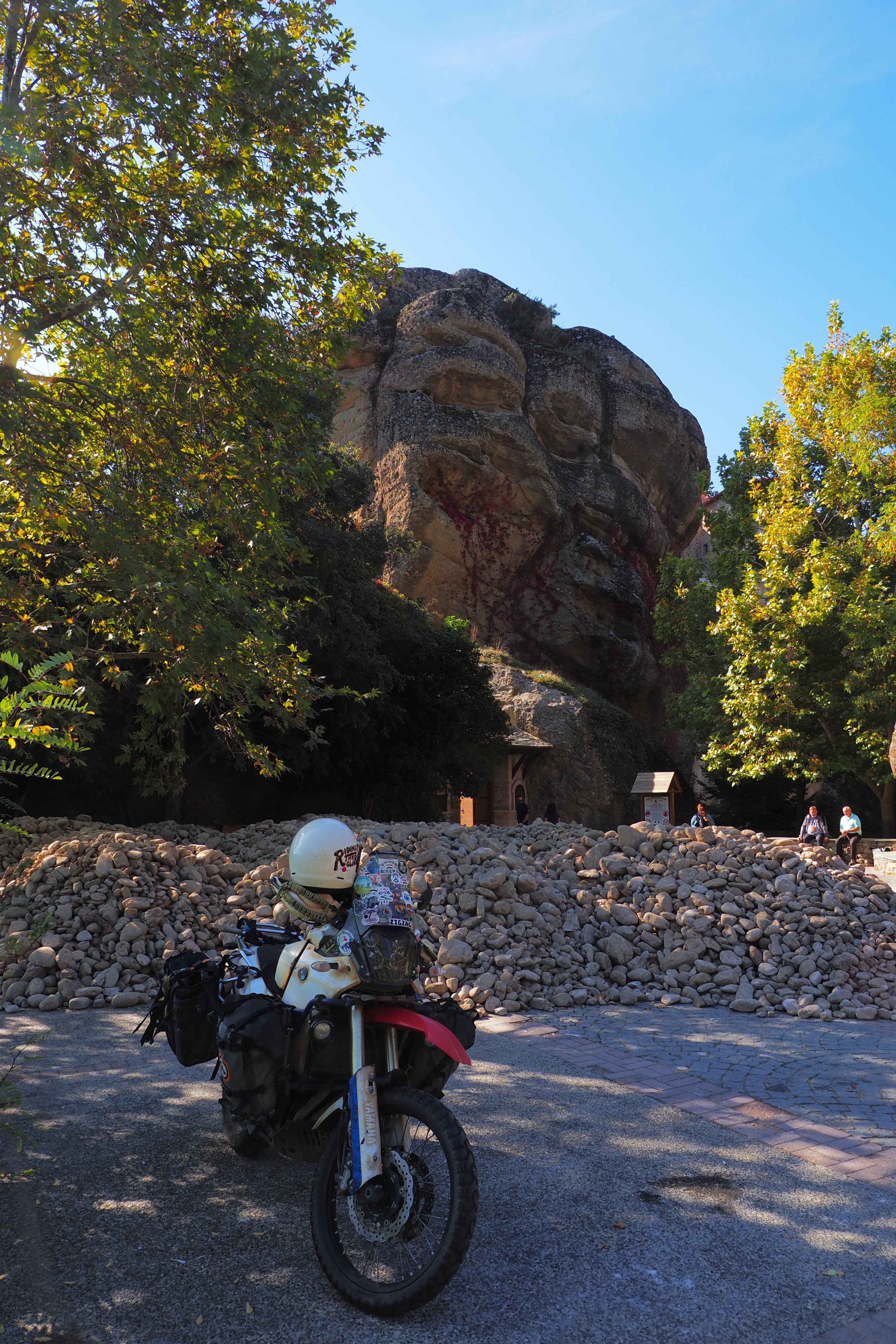 修道院はどこも聳え立つ断崖の上に建っていて、それらを結ぶ道路の起伏も激しいので、効率よく移動するには車などの移動手段がないとかなりきついです。そんなわけで、街に着いたら徒歩で散策することが多いわけですが、メテオラではバイクの利を最大限に生かして観光しようと思います。