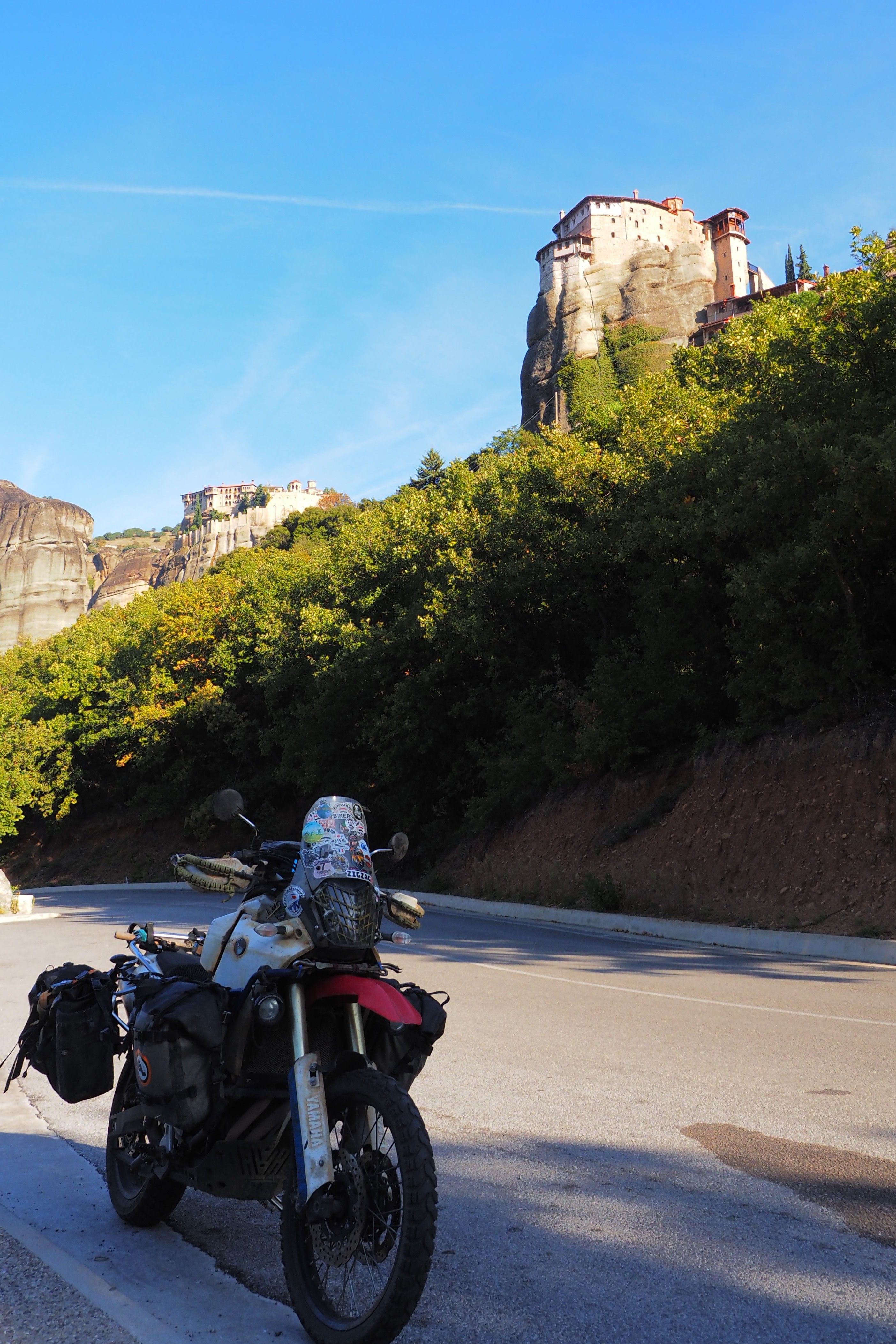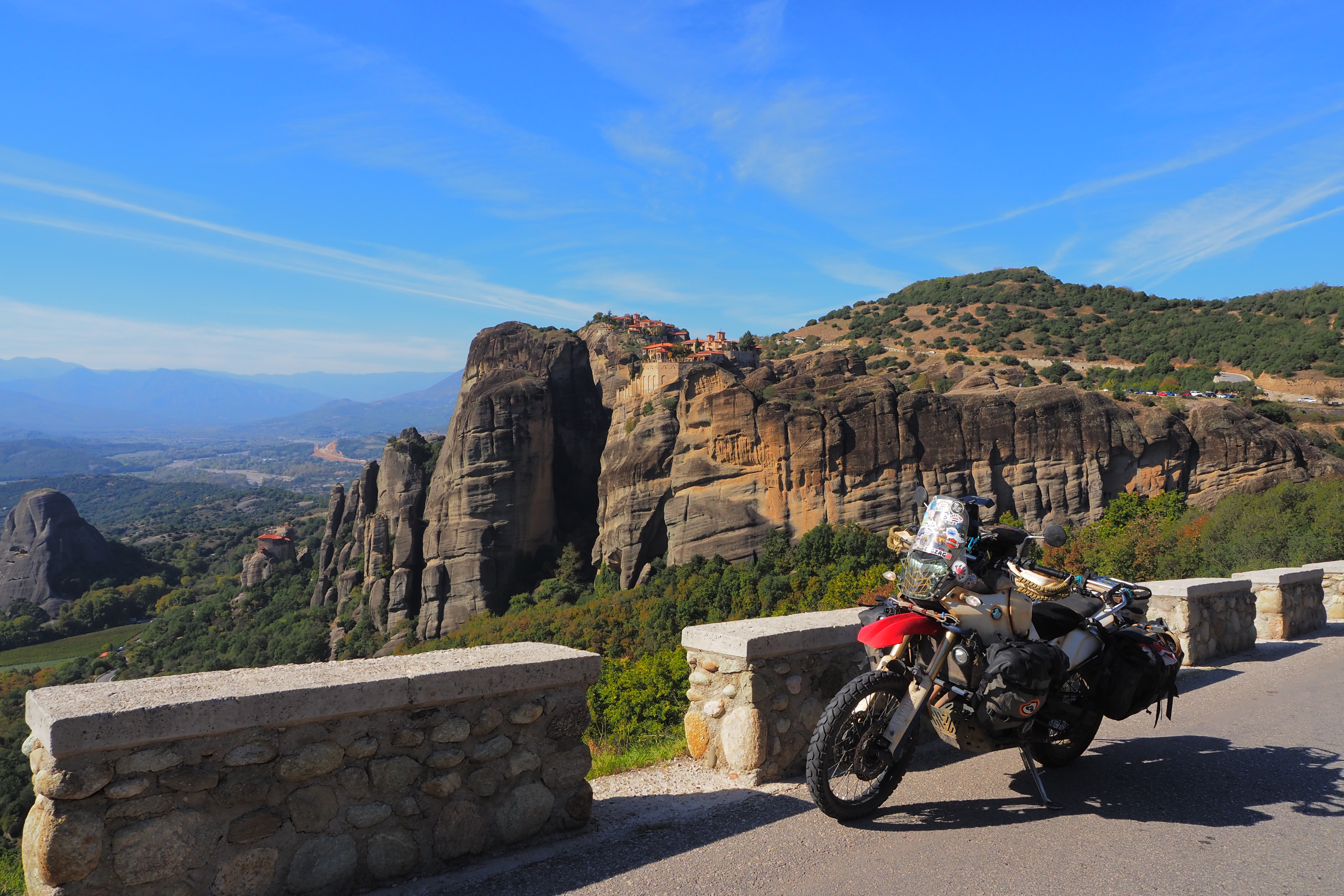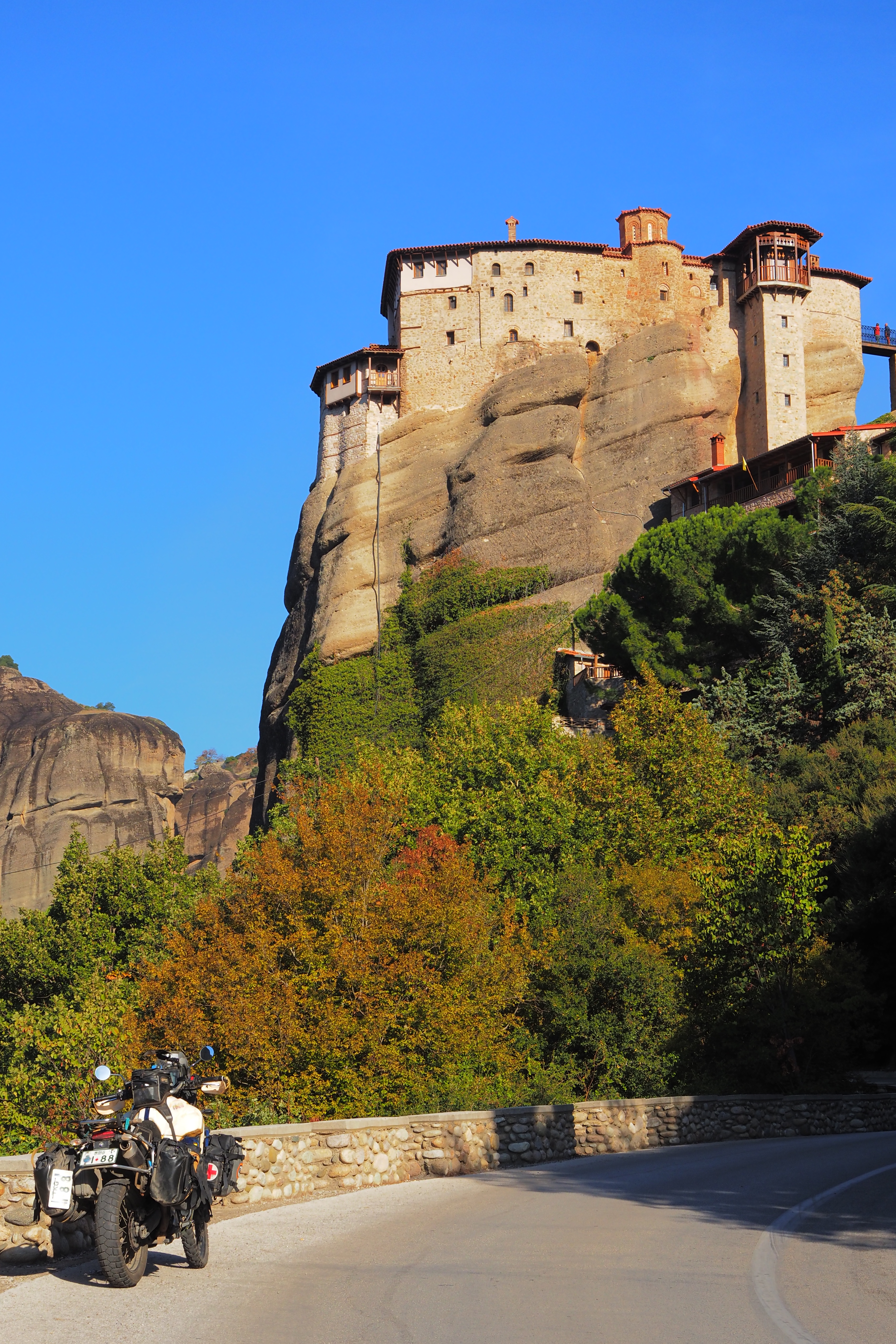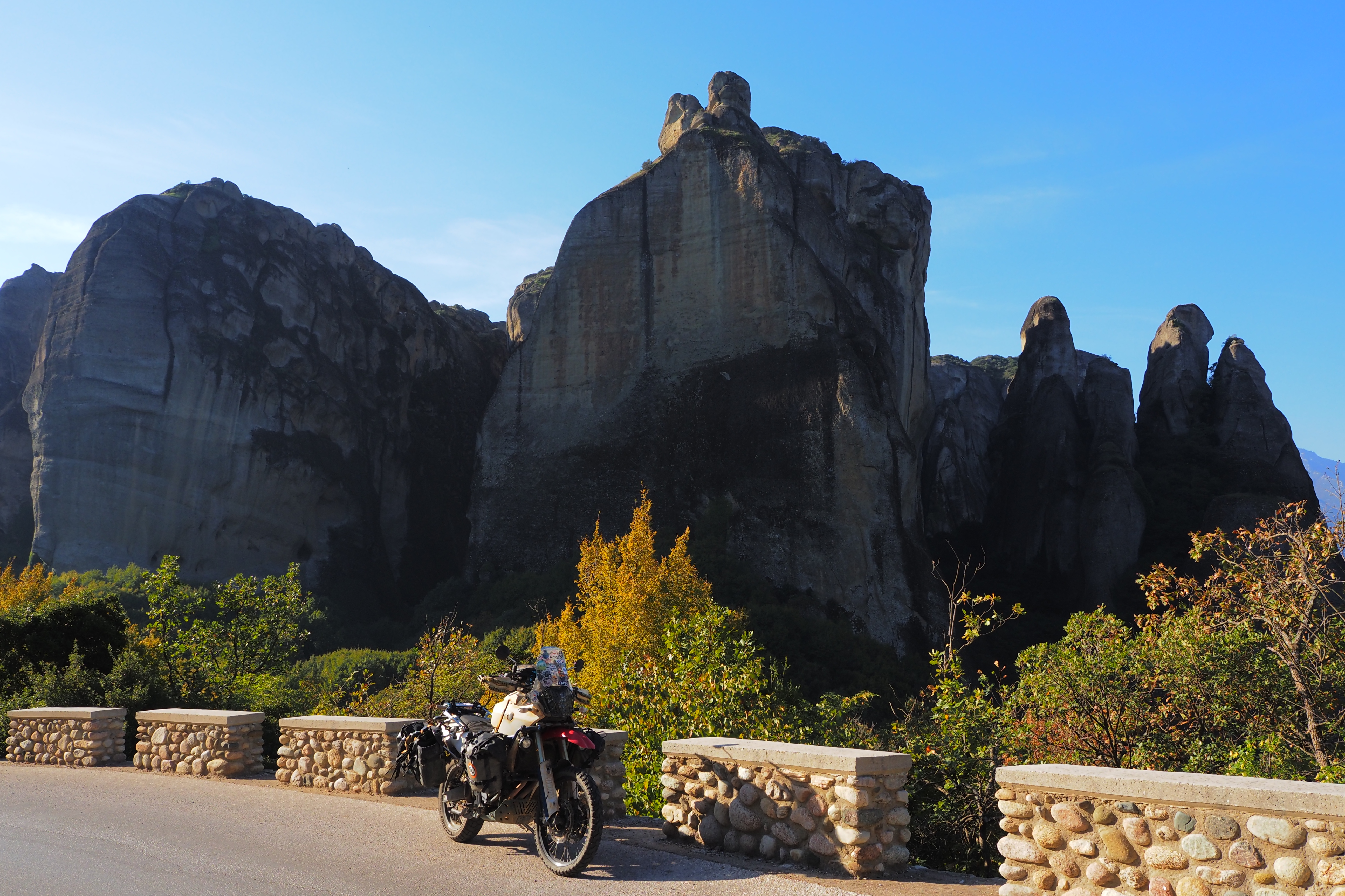 修道院はどこも聳え立つ断崖の上に建っていて、それらを結ぶ道路の起伏も激しいので、効率よく移動するには車などの移動手段がないとかなりきついです。そんなわけで、街に着いたら徒歩で散策することが多いわけですが、メテオラではバイクの利を最大限に生かして観光しようと思います。