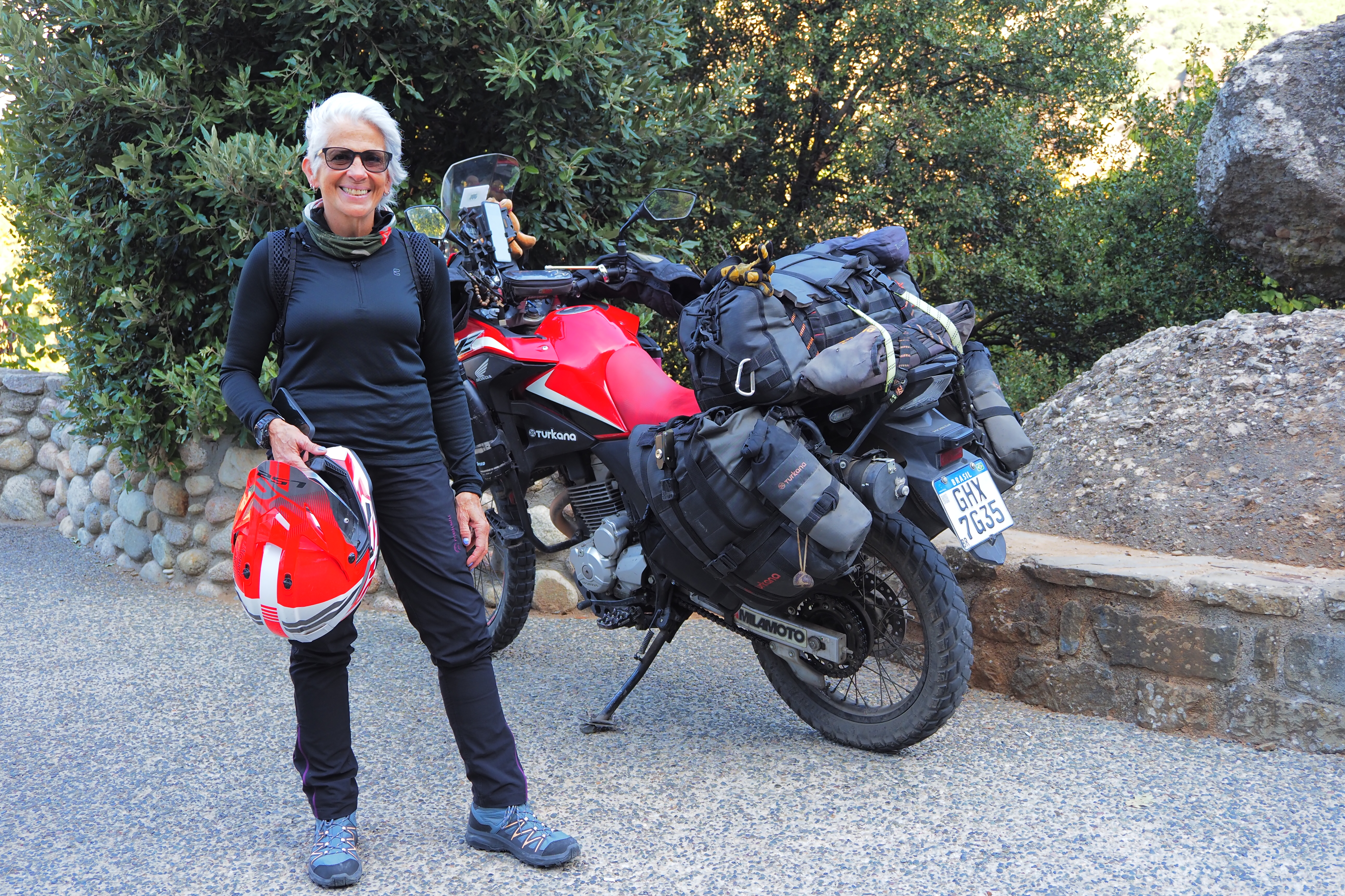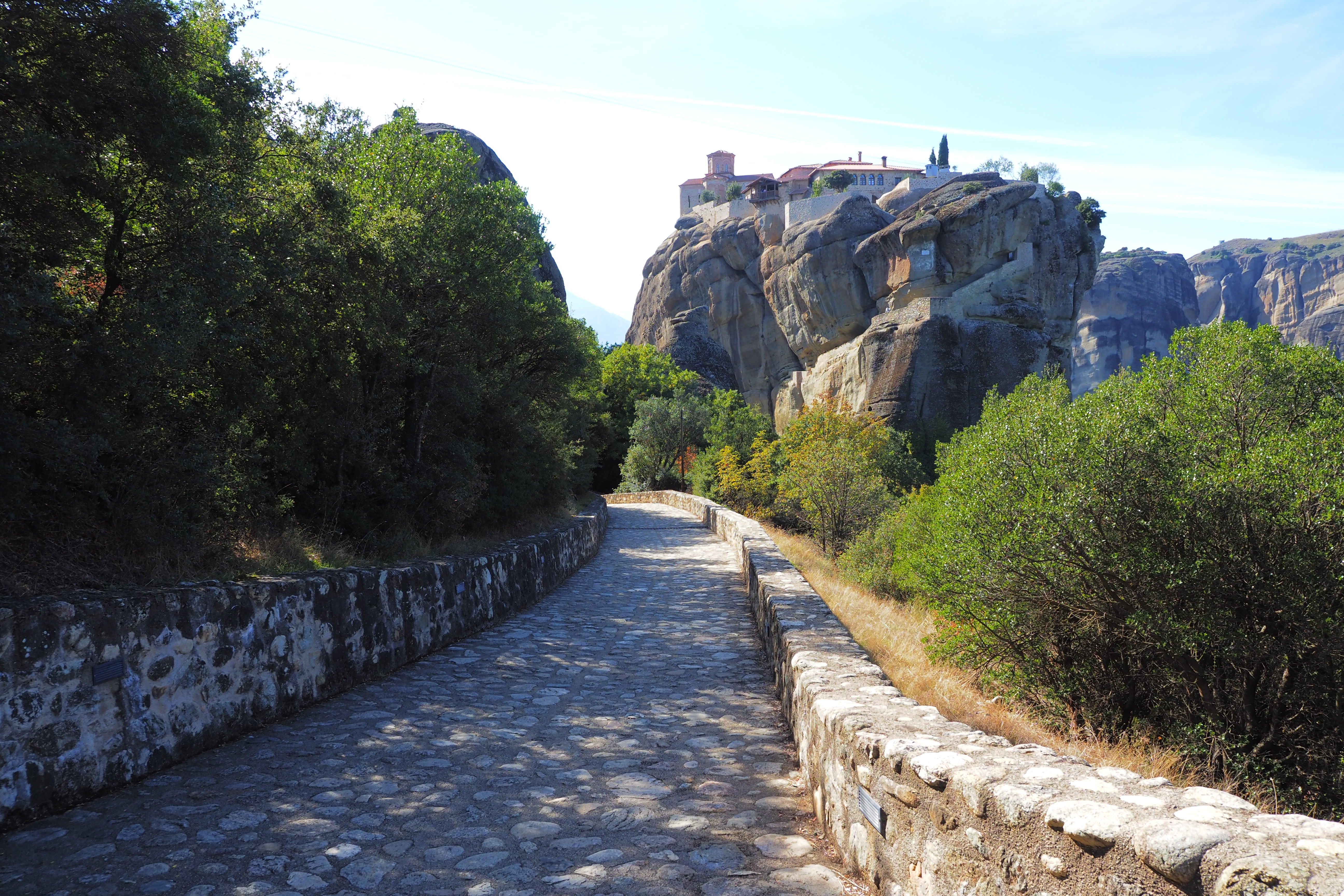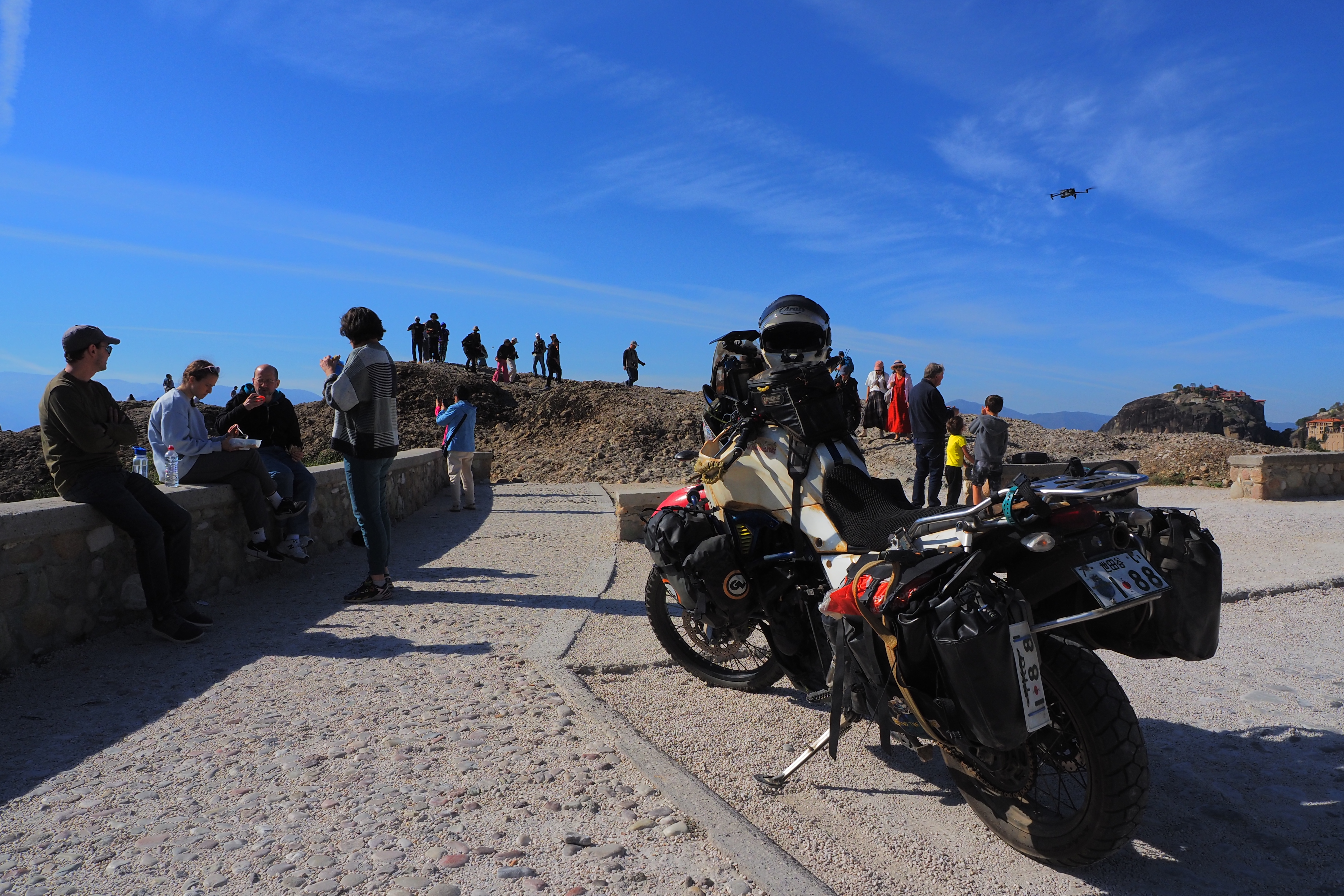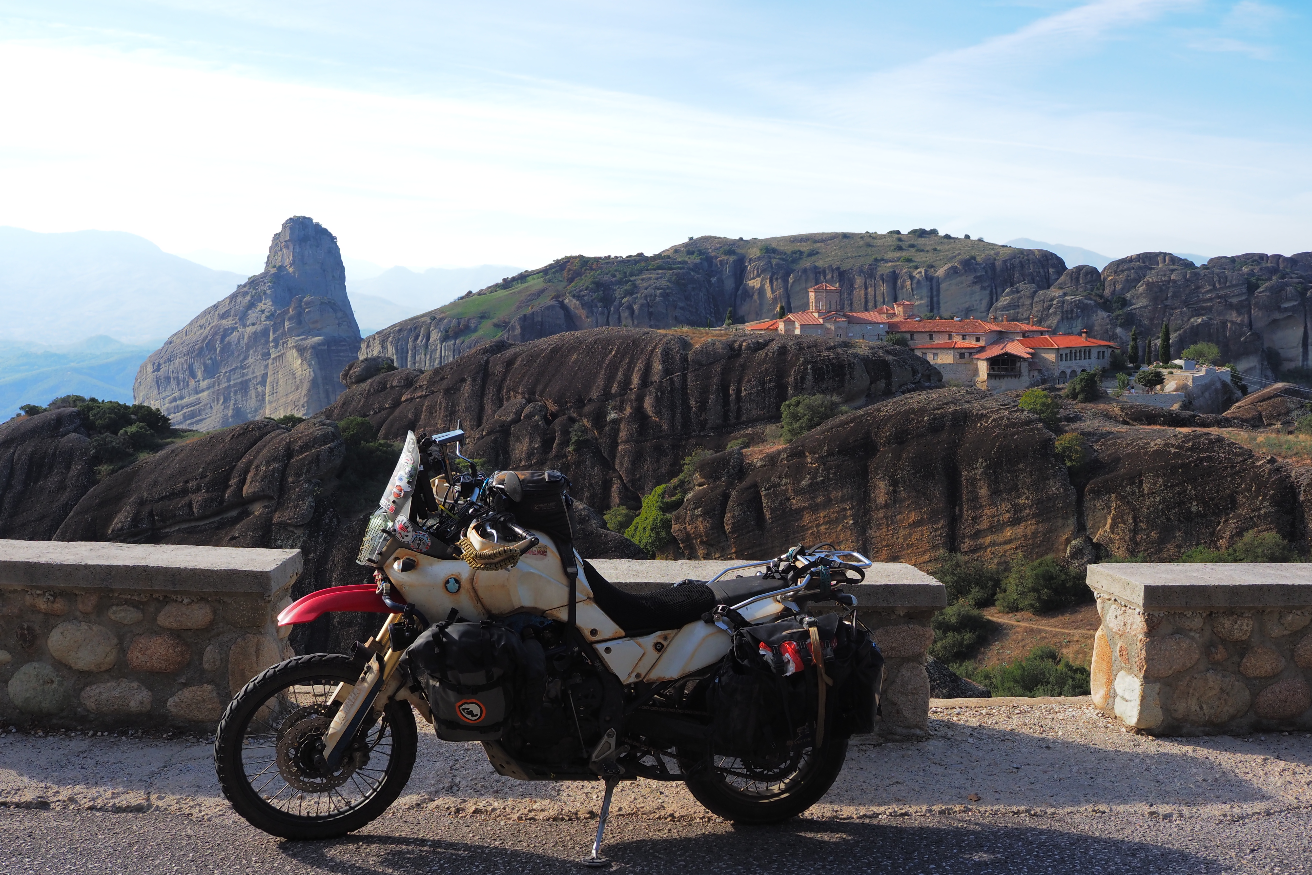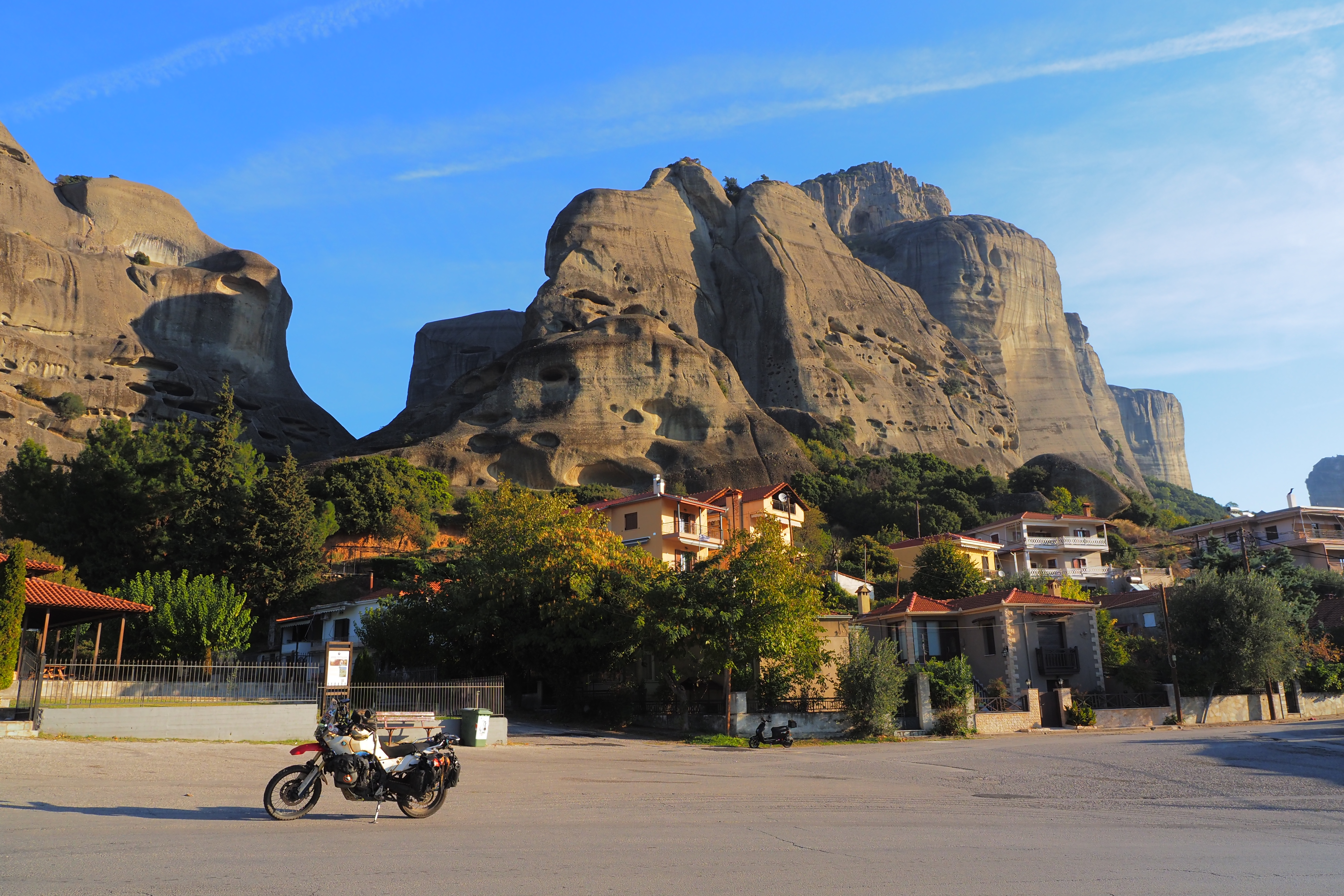 修道院はどこも聳え立つ断崖の上に建っていて、それらを結ぶ道路の起伏も激しいので、効率よく移動するには車などの移動手段がないとかなりきついです。そんなわけで、街に着いたら徒歩で散策することが多いわけですが、メテオラではバイクの利を最大限に生かして観光しようと思います。