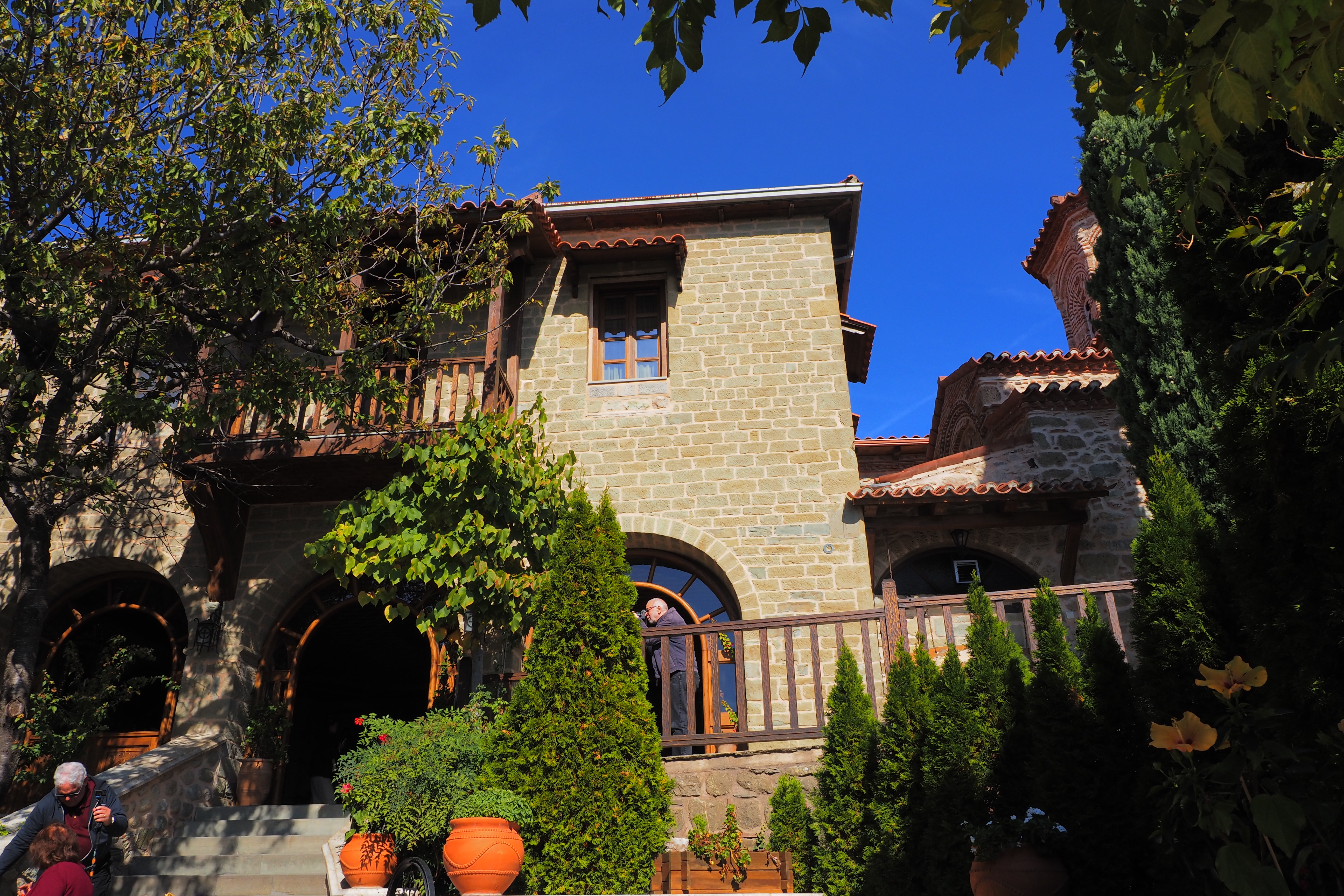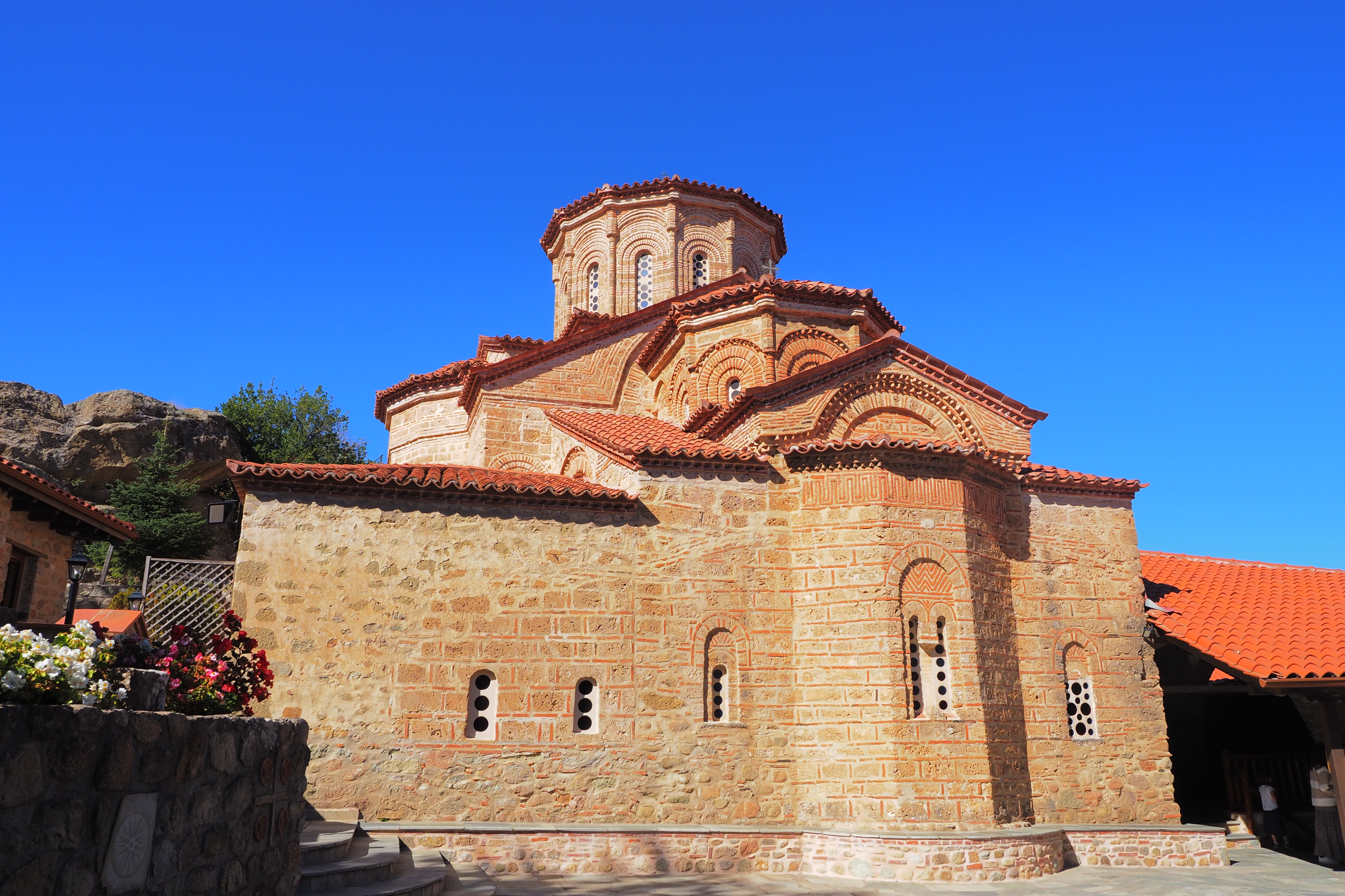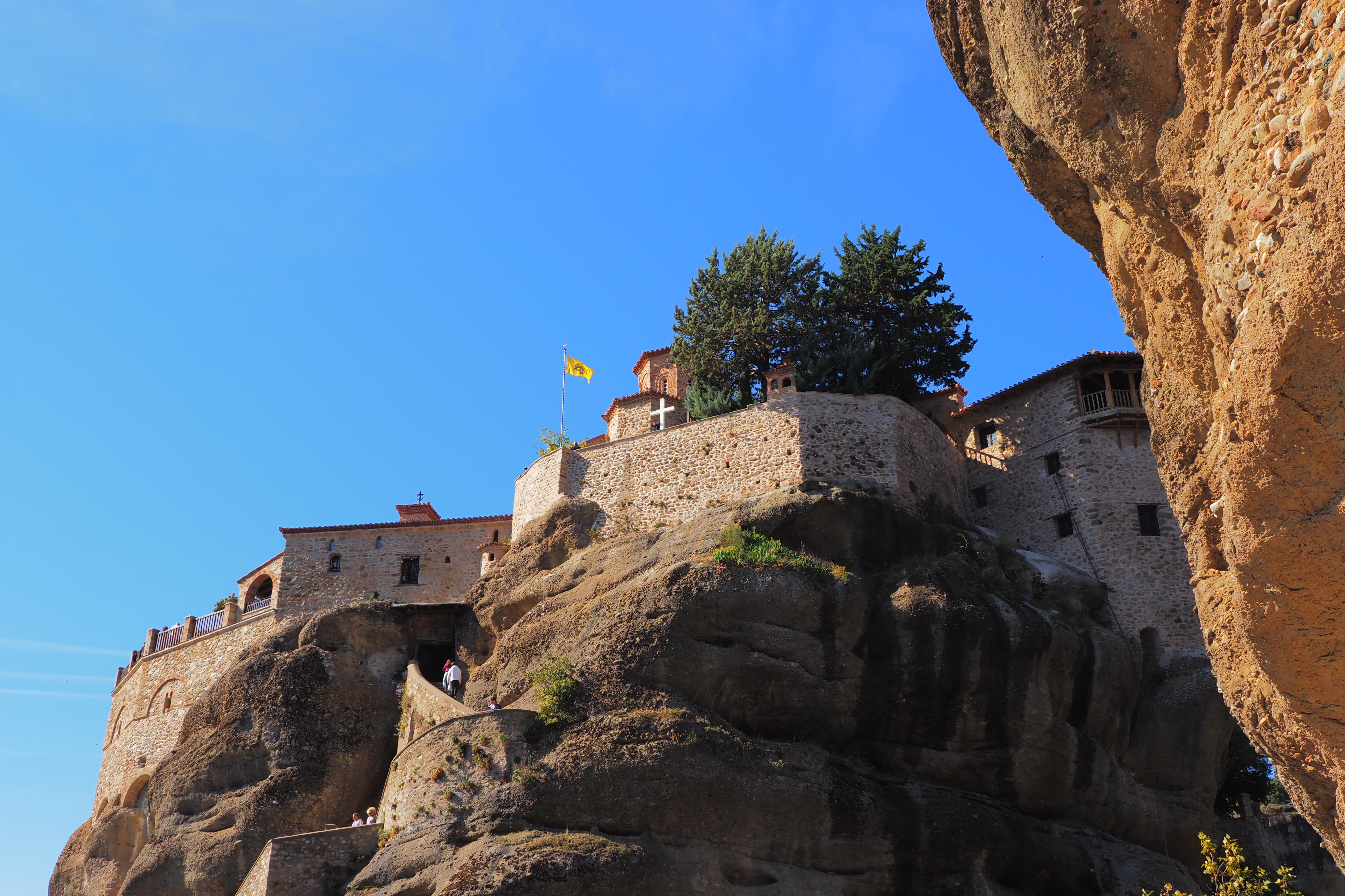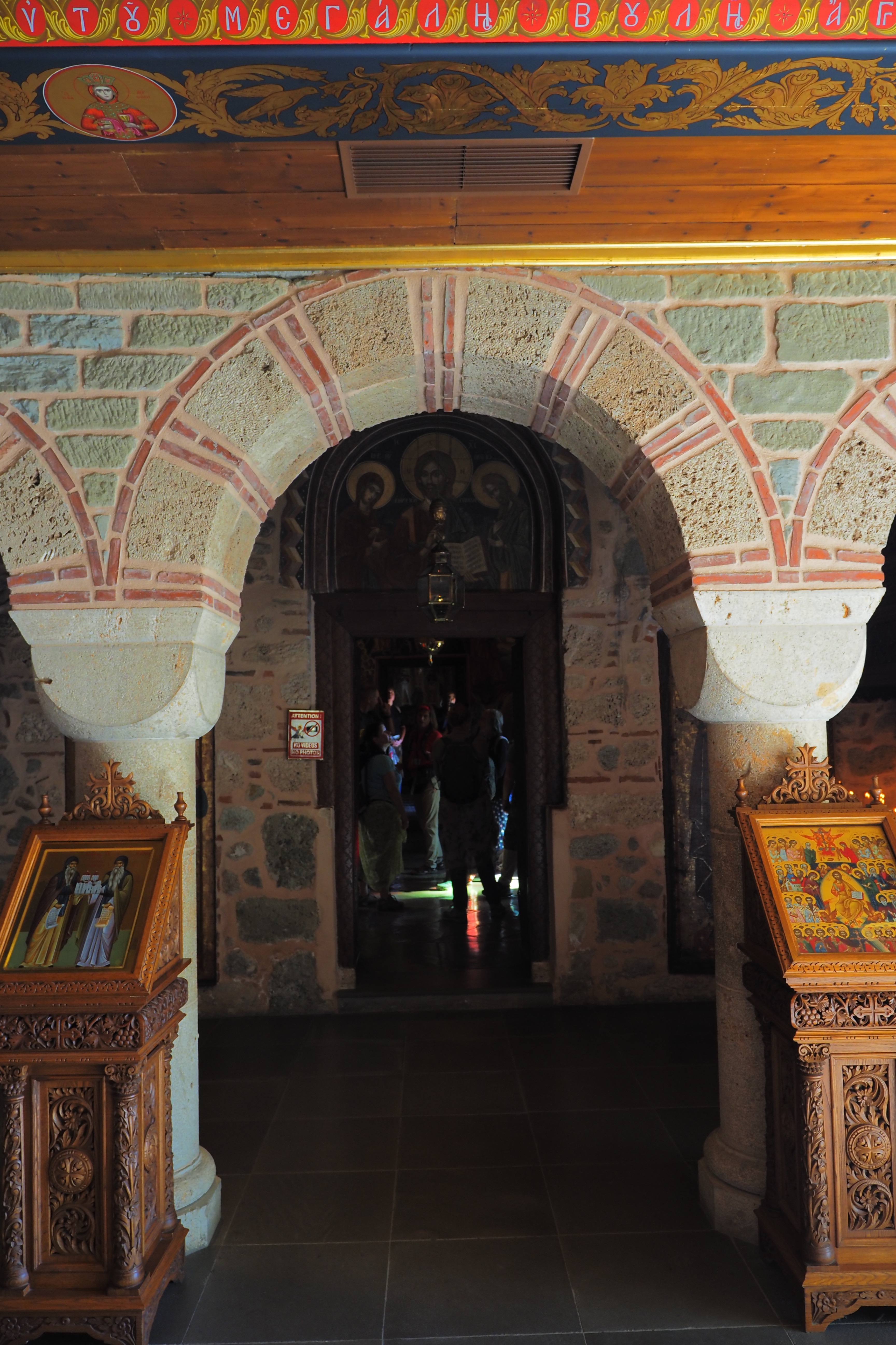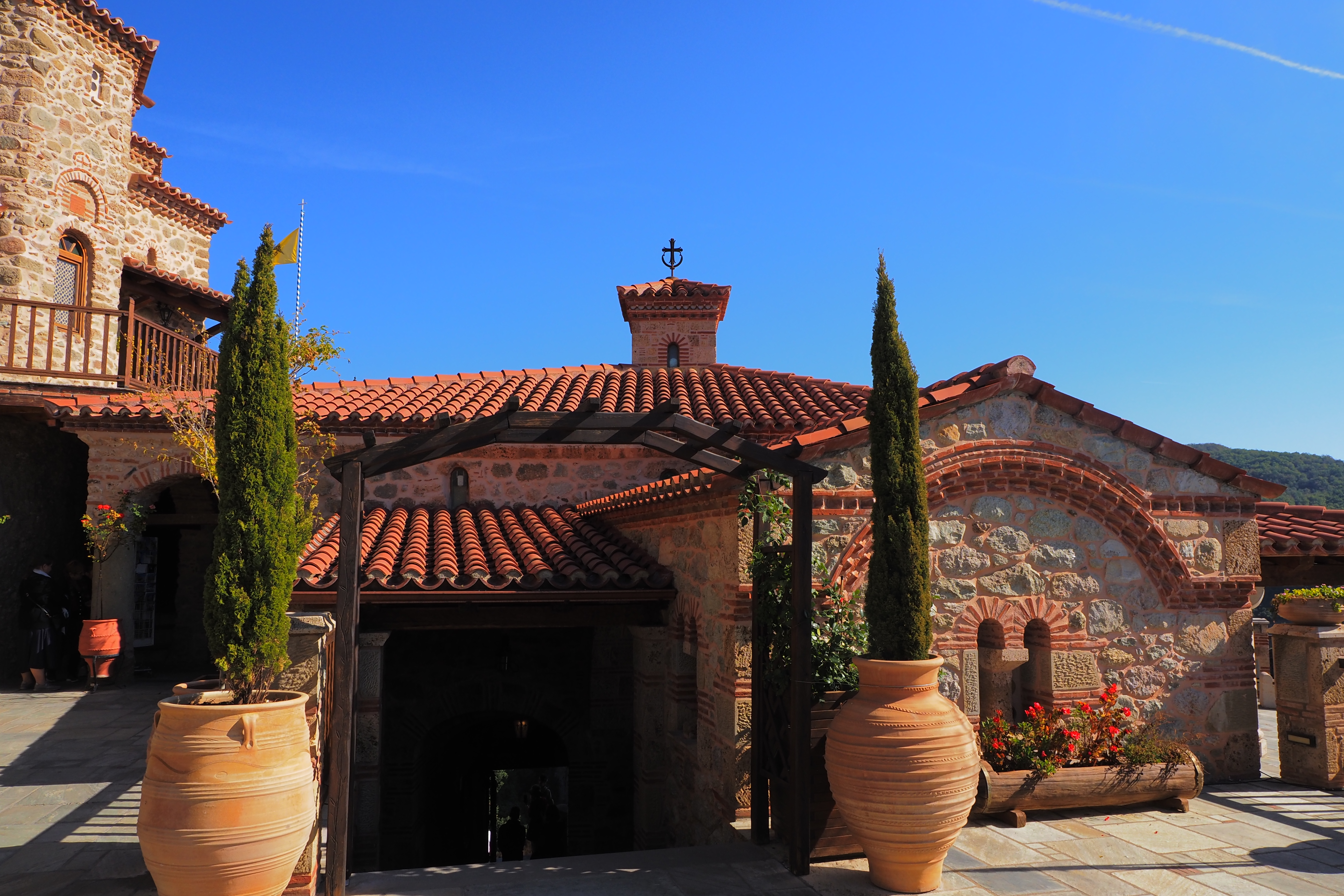 背景に見えるような奇岩群が成す険しい地形は、14世紀当時 俗世から断絶し 祈りに人生を捧げようという修道士たちにとって理想的な場所だったらしい。特に現在のギリシア北部がセルビア王国の版図下にくみこまれていく中で、戦乱を避けるようにアトス山から移住してくる修道士たちも多かったという。