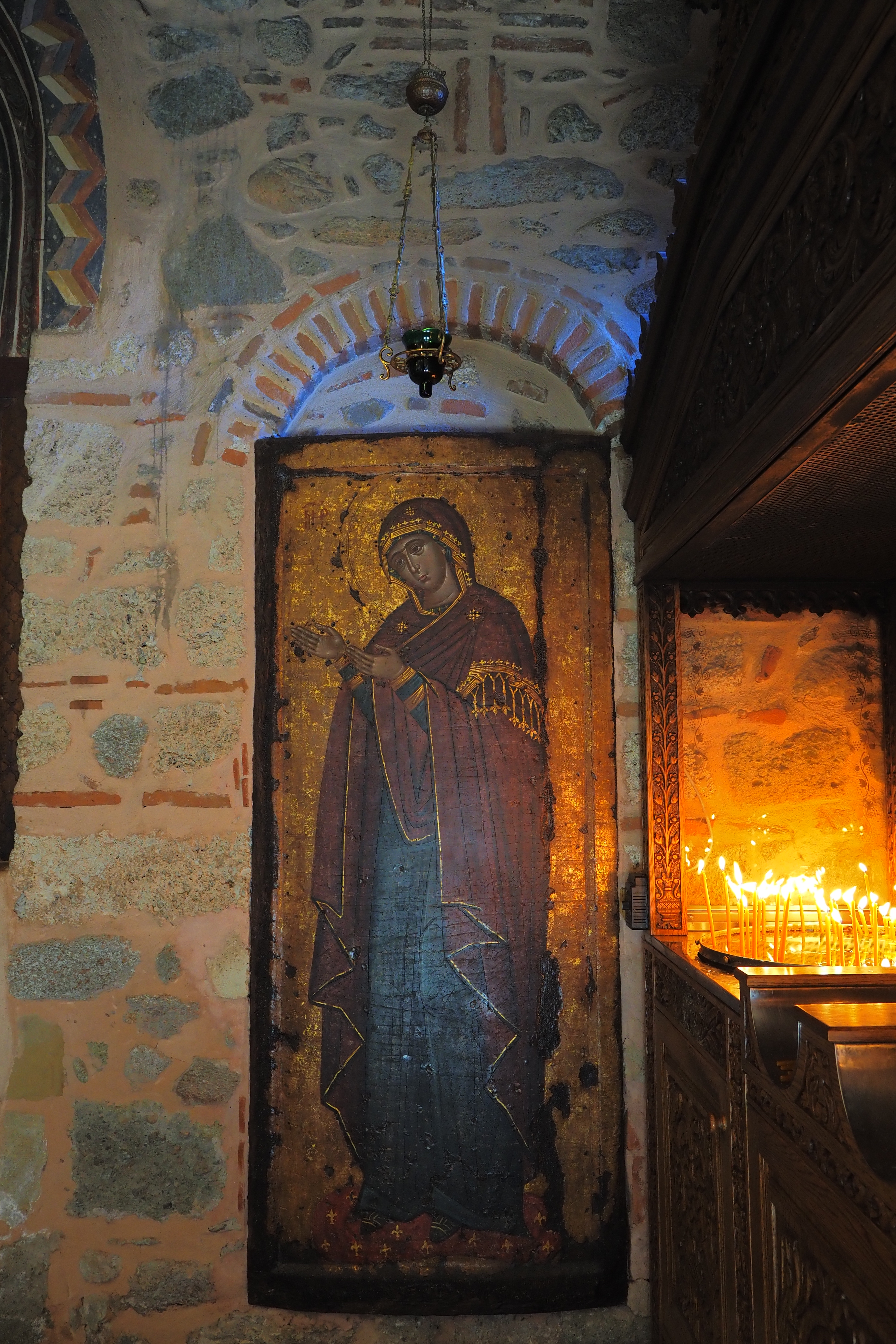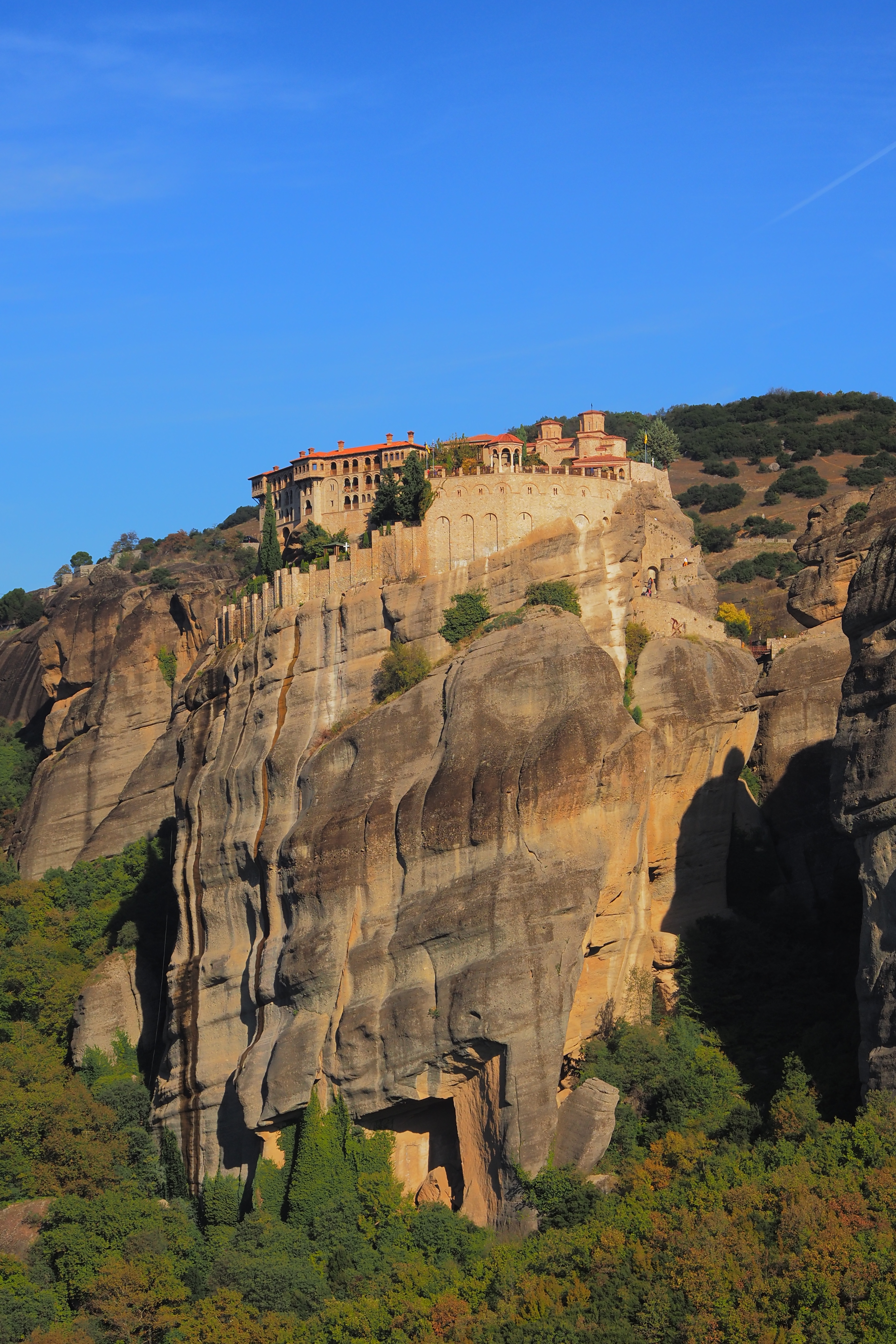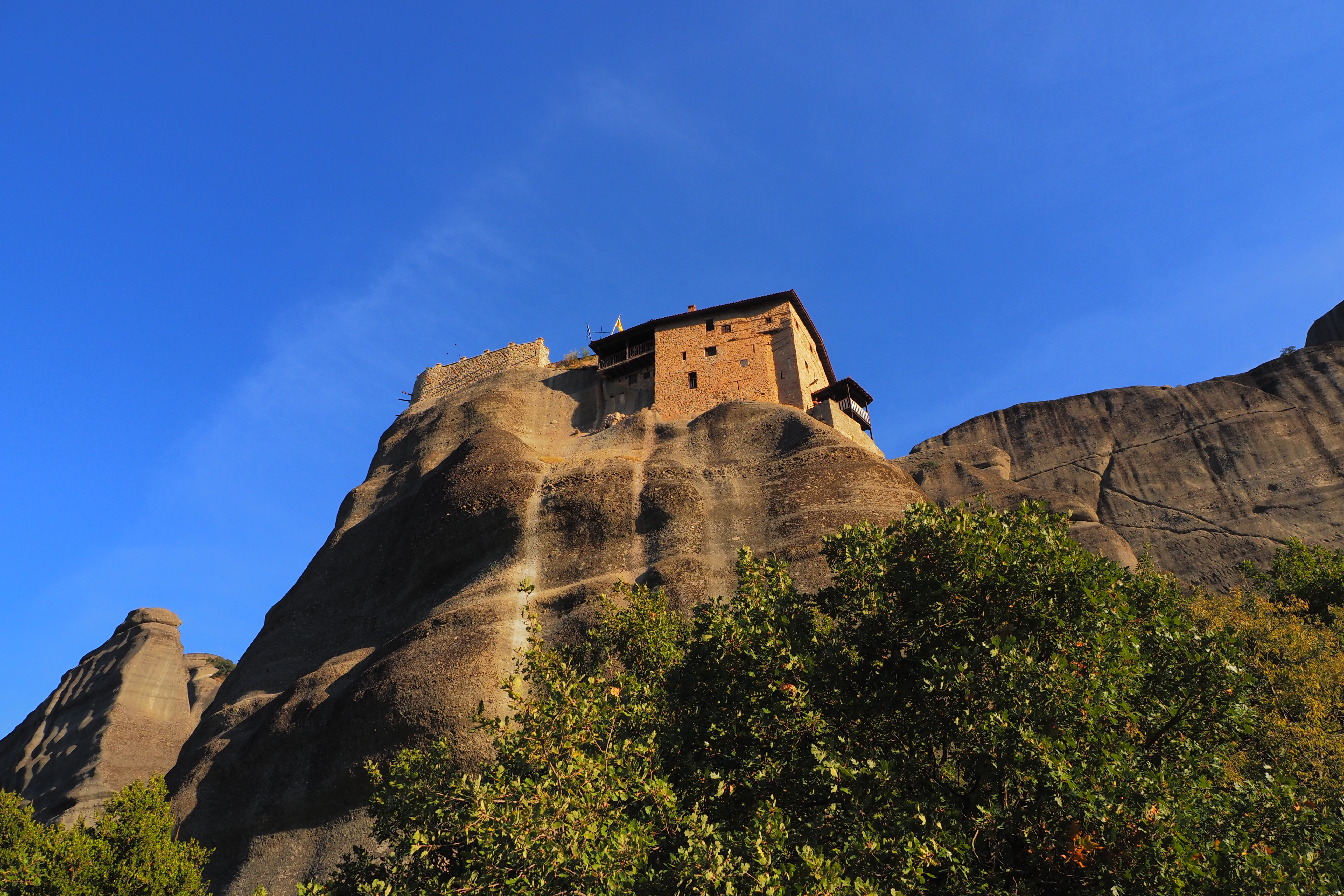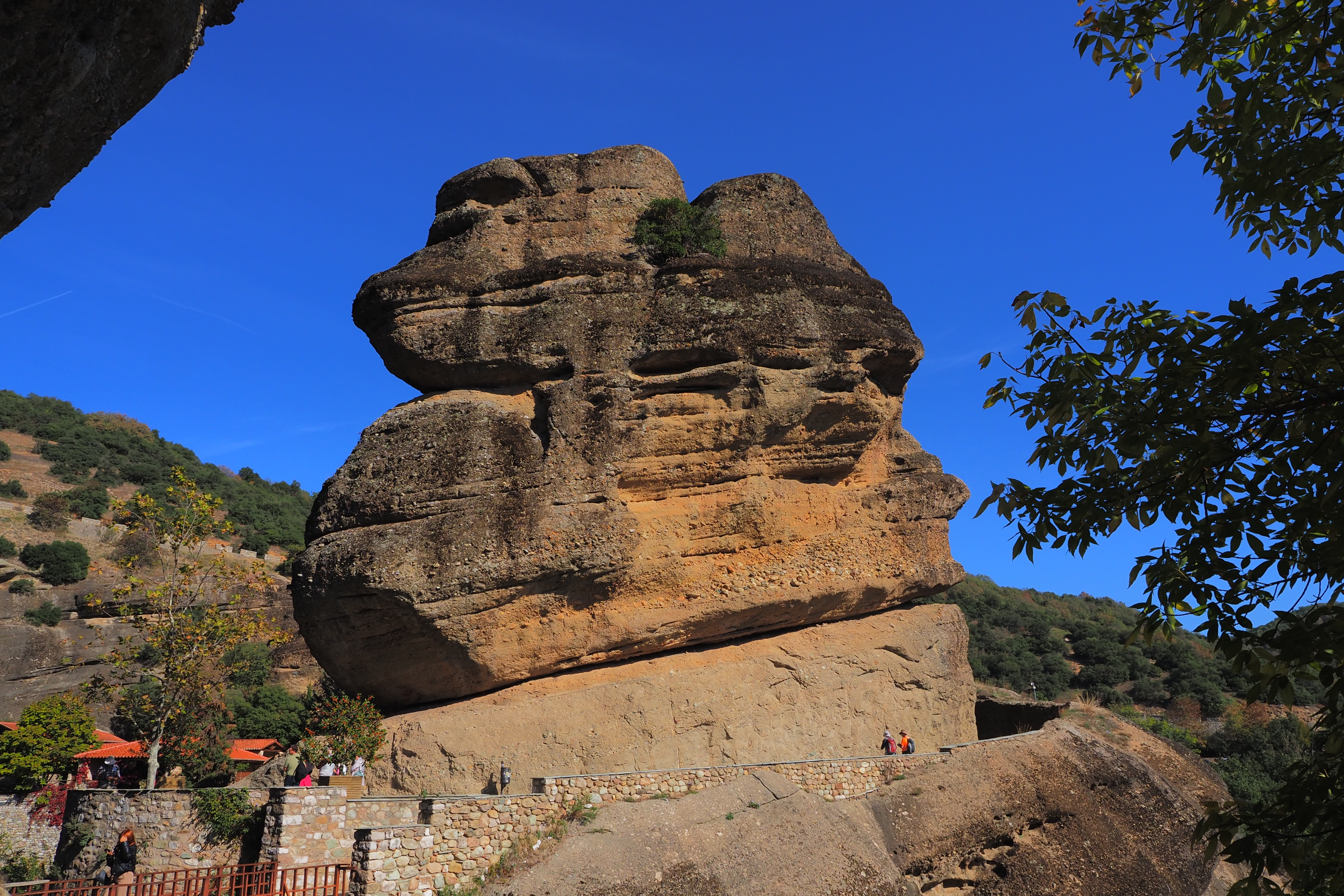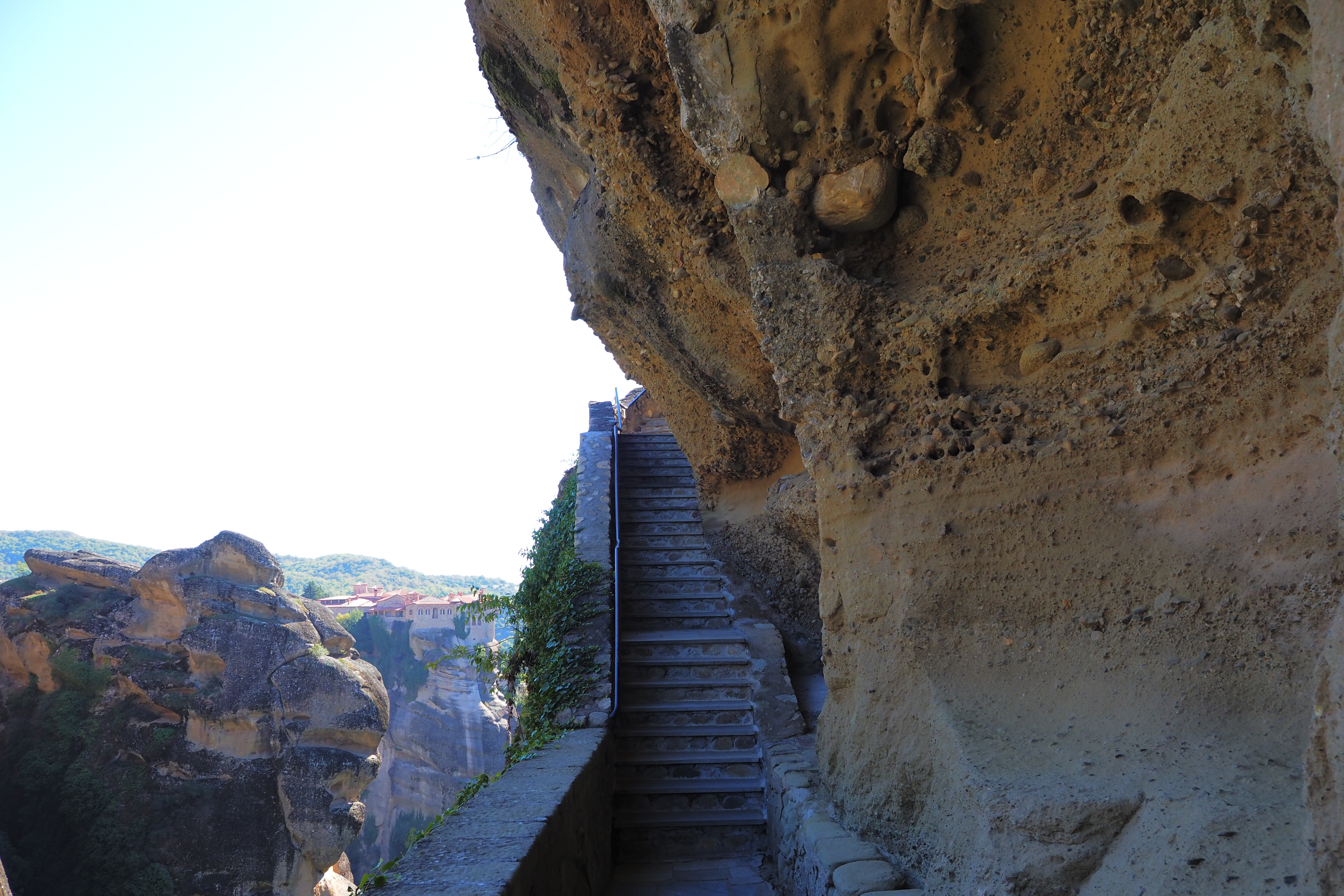 背景に見えるような奇岩群が成す険しい地形は、14世紀当時 俗世から断絶し 祈りに人生を捧げようという修道士たちにとって理想的な場所だったらしい。特に現在のギリシア北部がセルビア王国の版図下にくみこまれていく中で、戦乱を避けるようにアトス山から移住してくる修道士たちも多かったという。