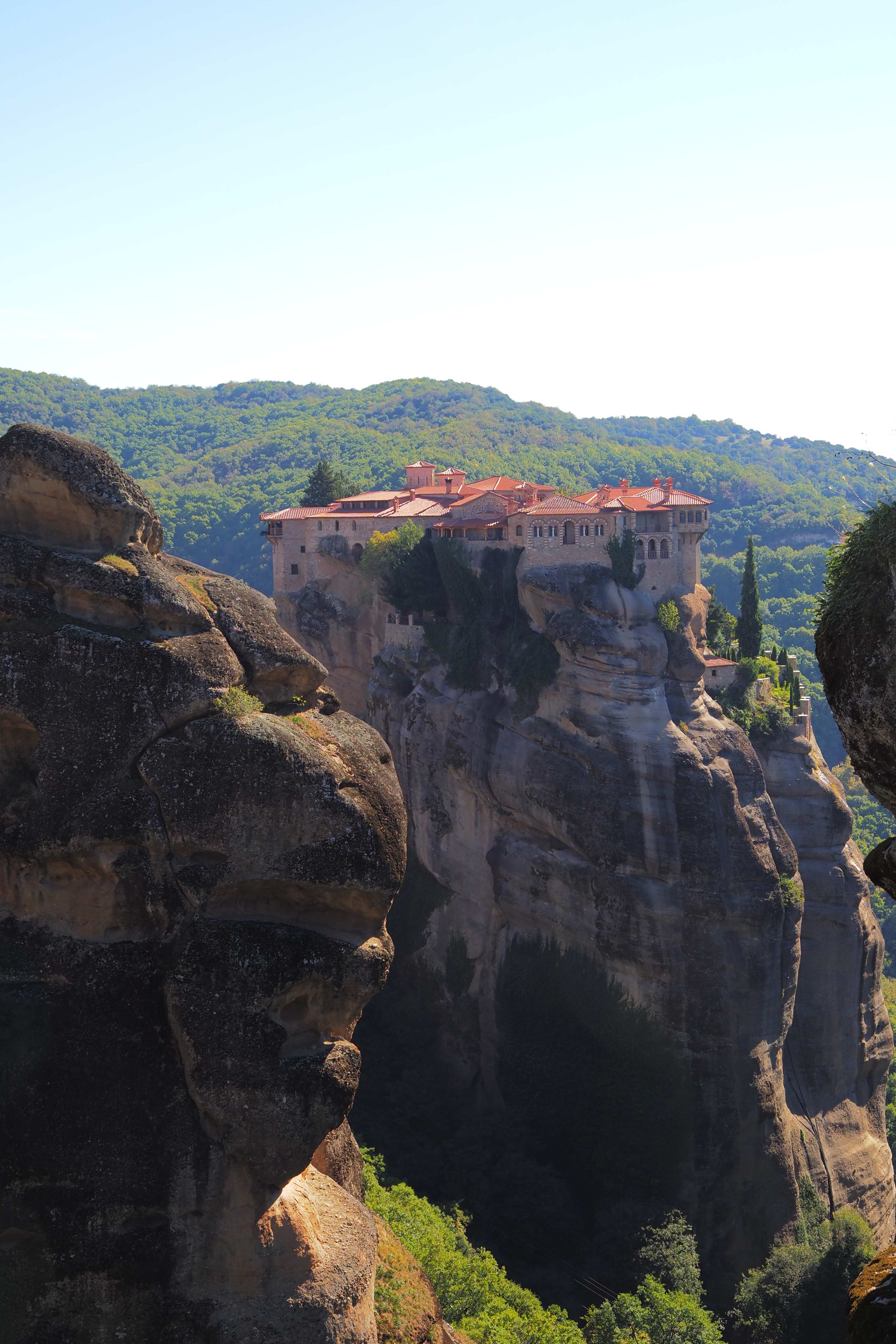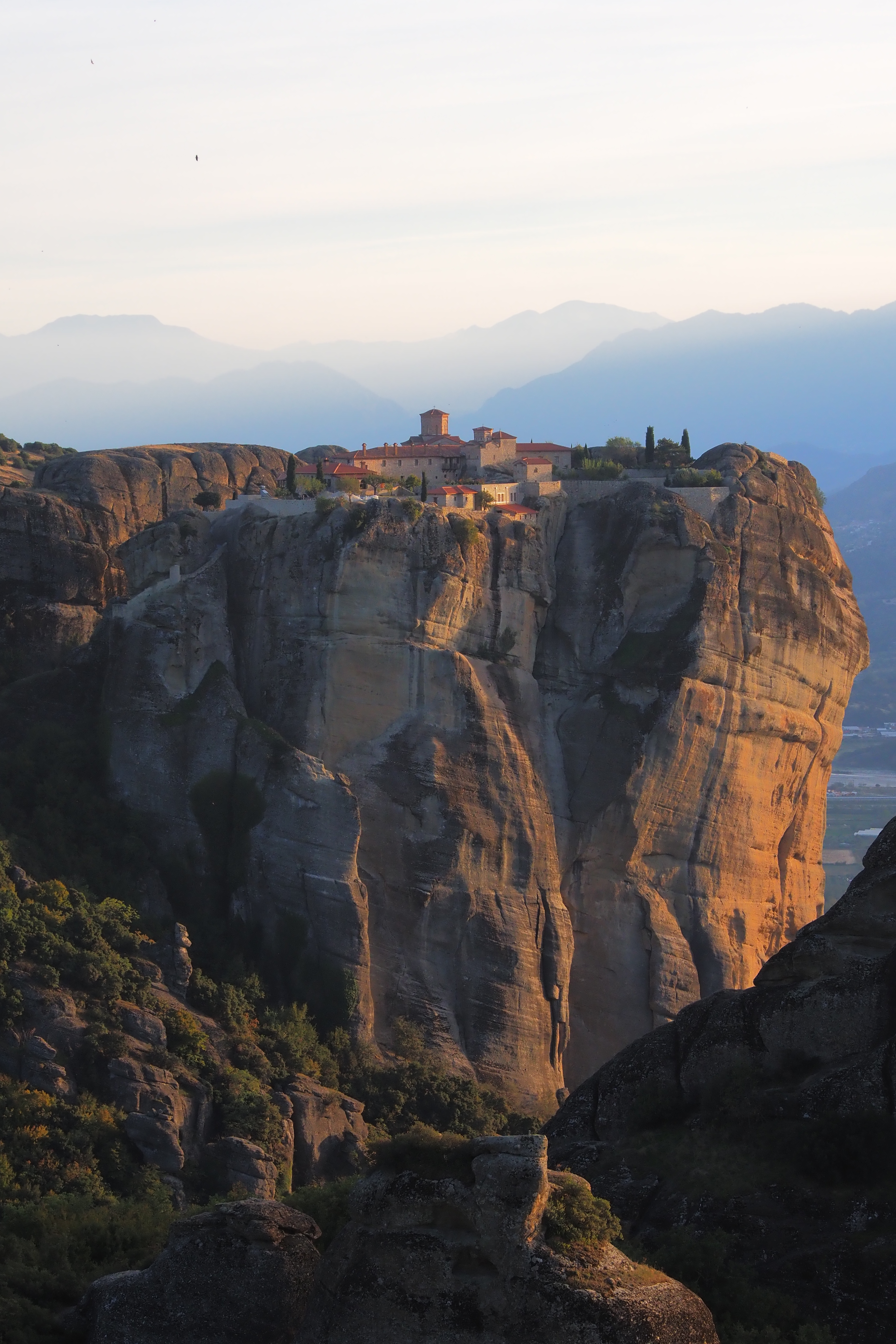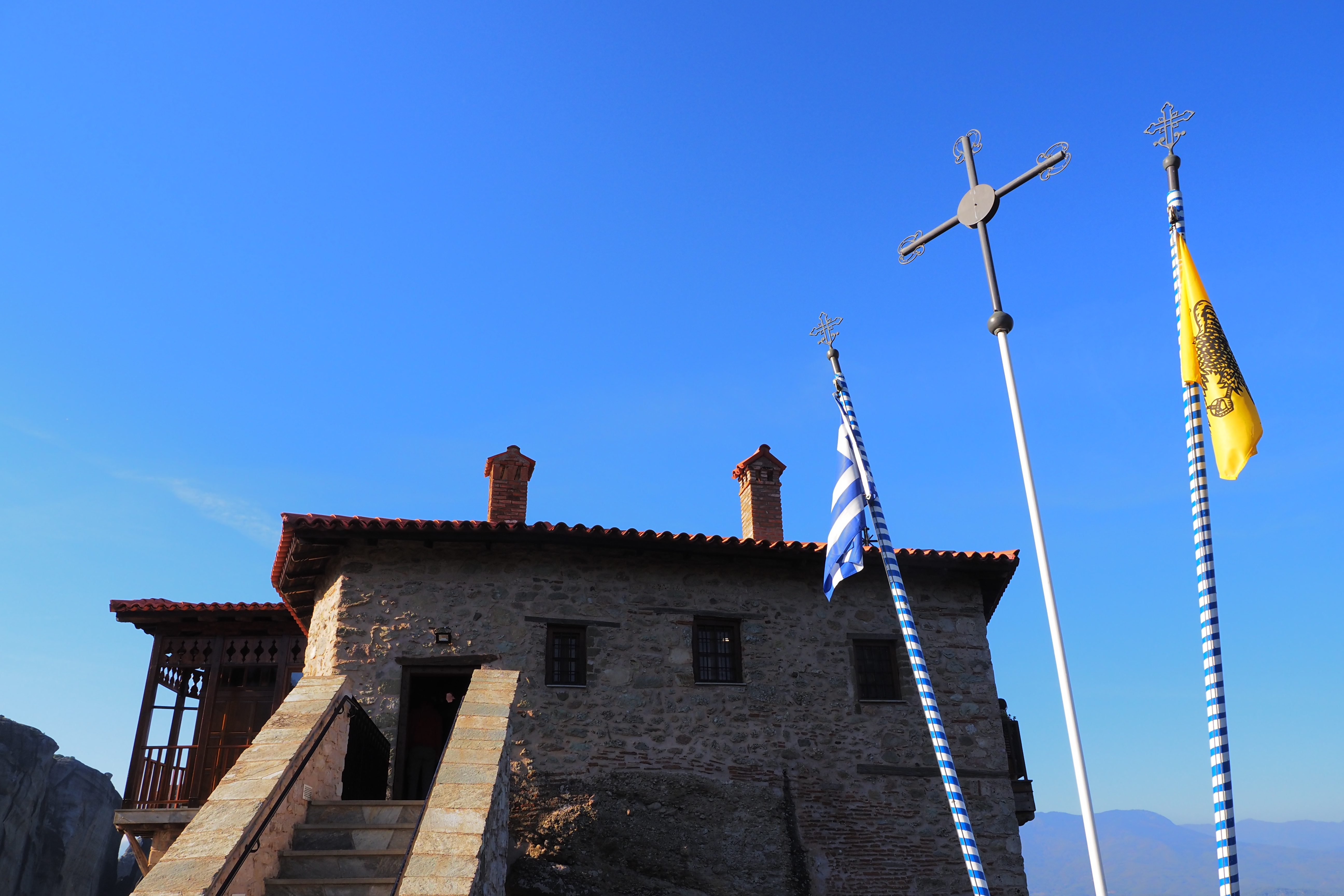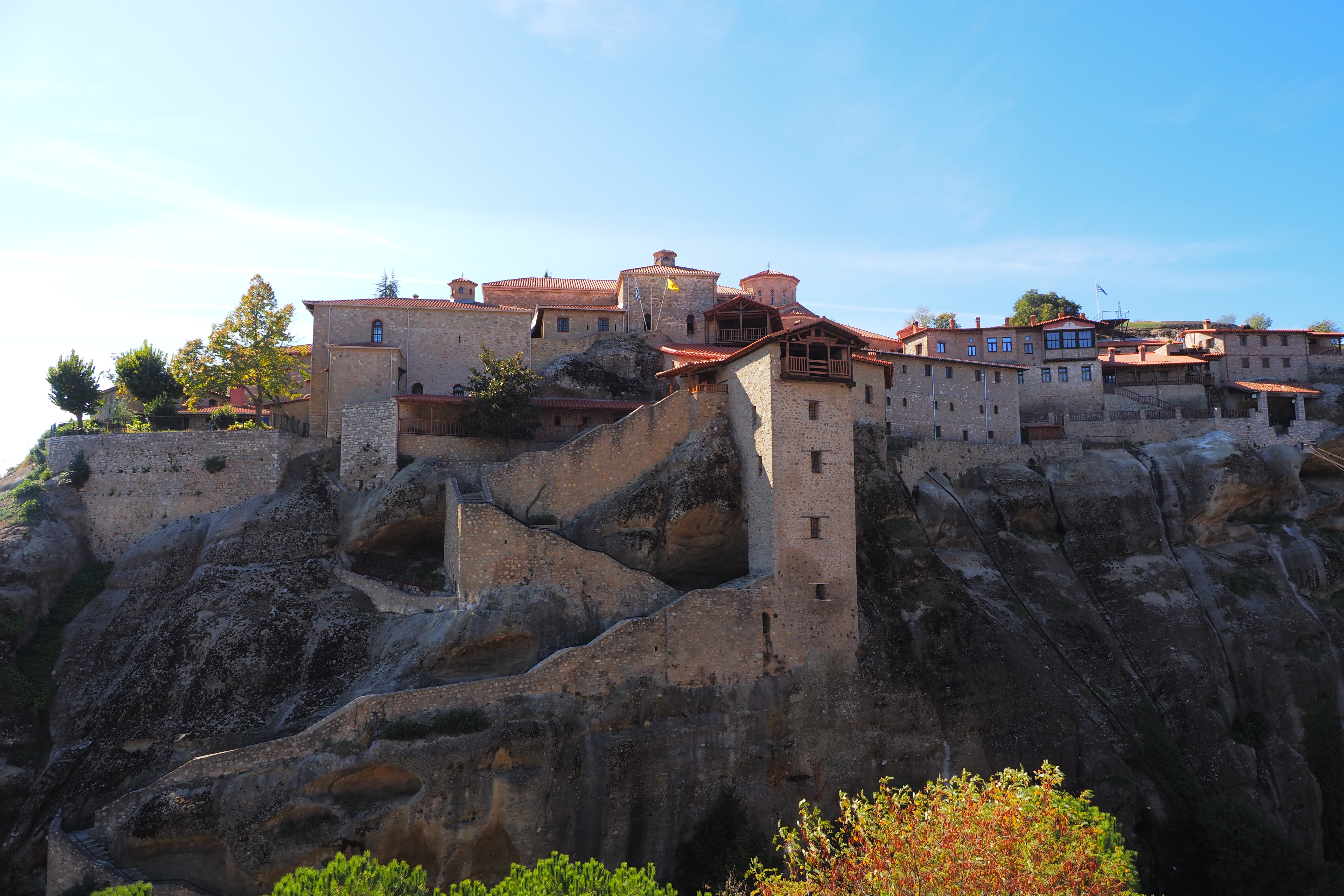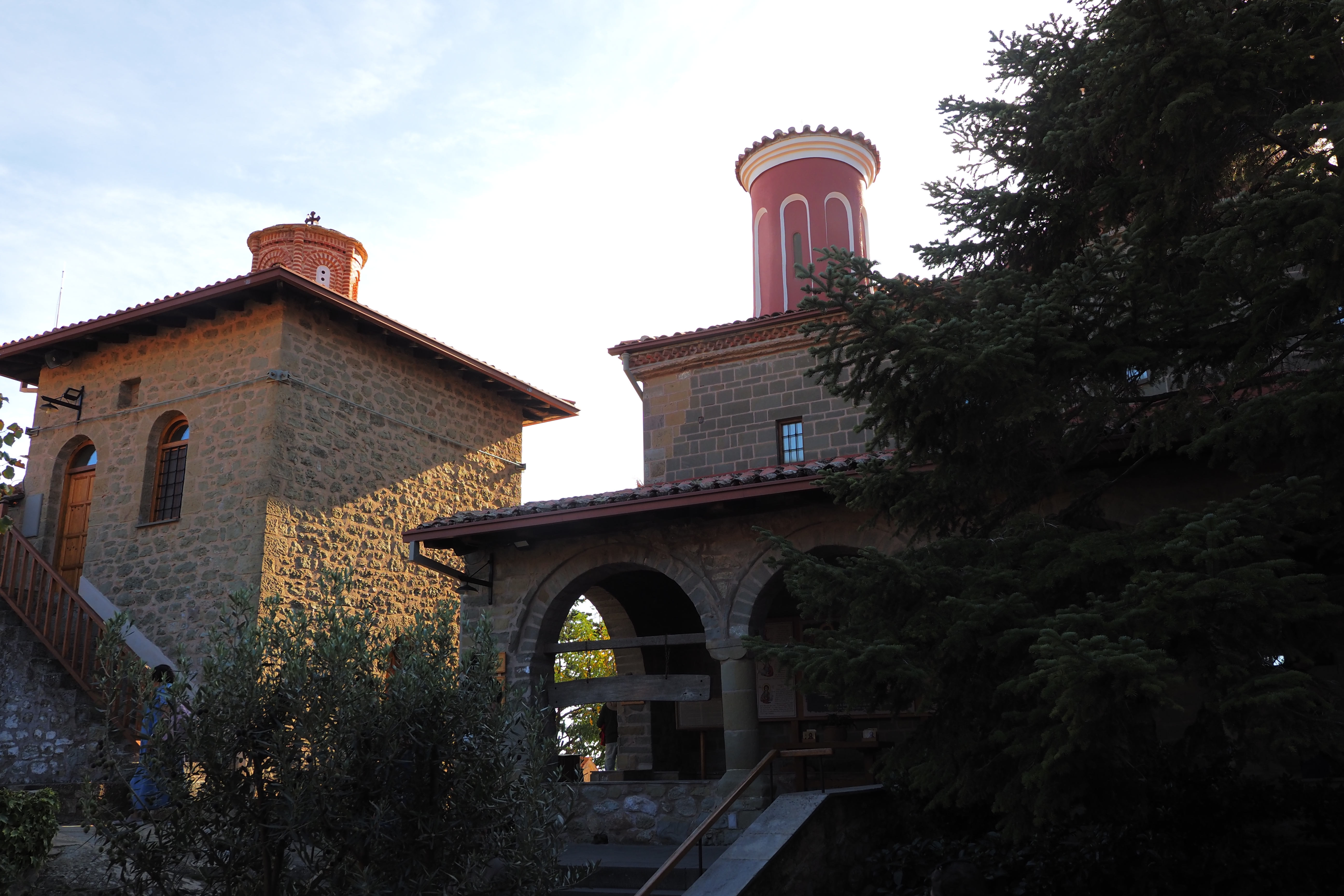 背景に見えるような奇岩群が成す険しい地形は、14世紀当時 俗世から断絶し 祈りに人生を捧げようという修道士たちにとって理想的な場所だったらしい。特に現在のギリシア北部がセルビア王国の版図下にくみこまれていく中で、戦乱を避けるようにアトス山から移住してくる修道士たちも多かったという。