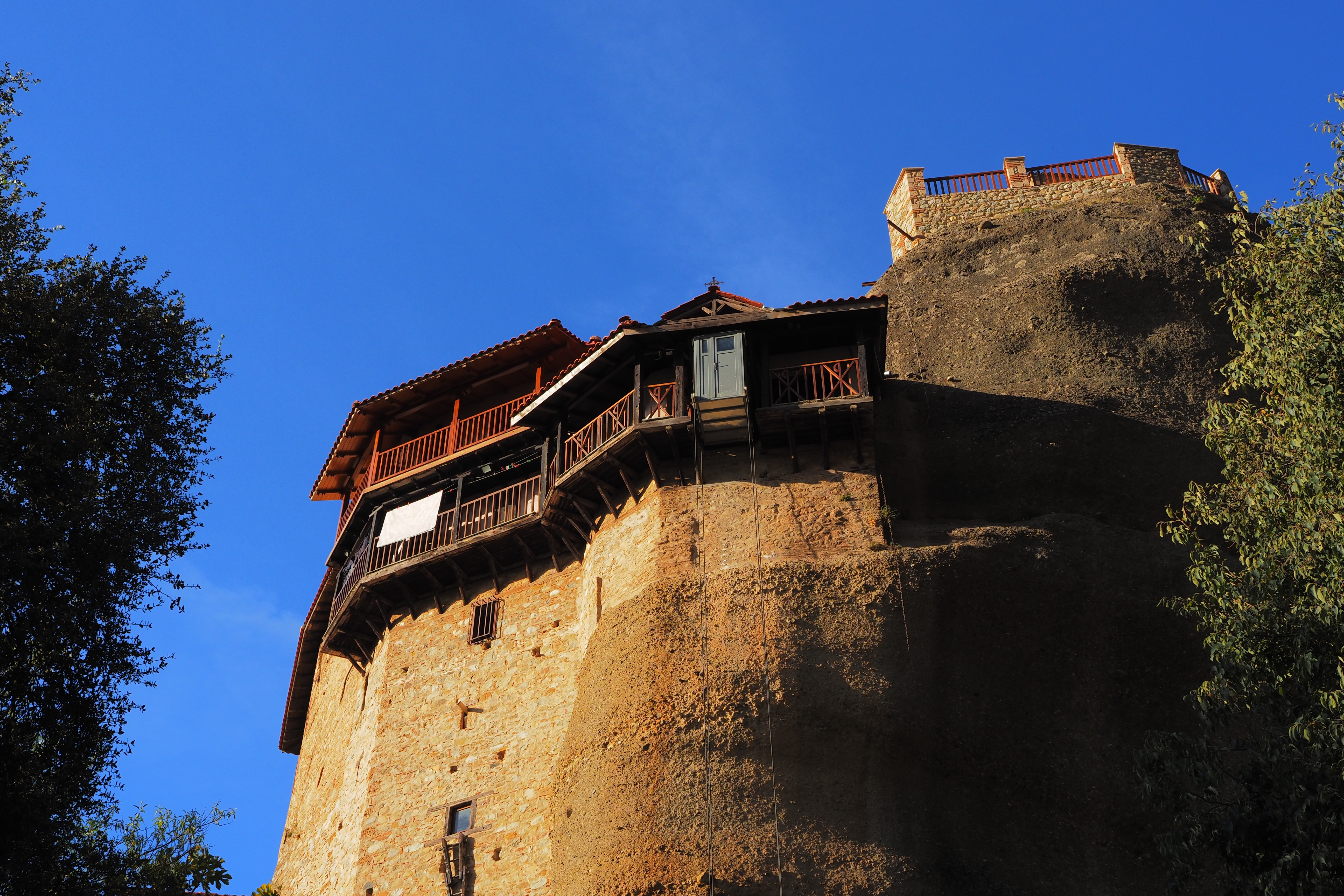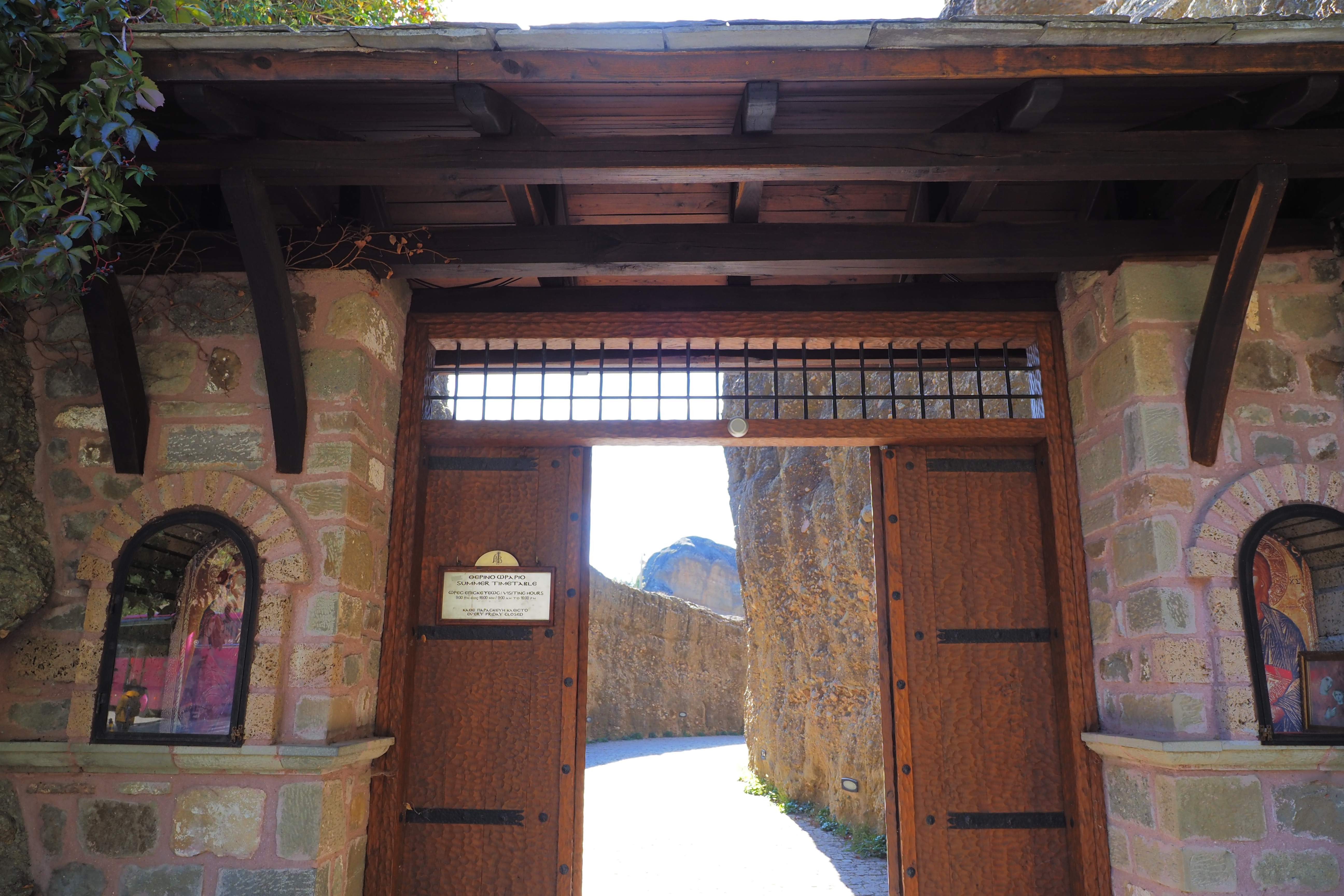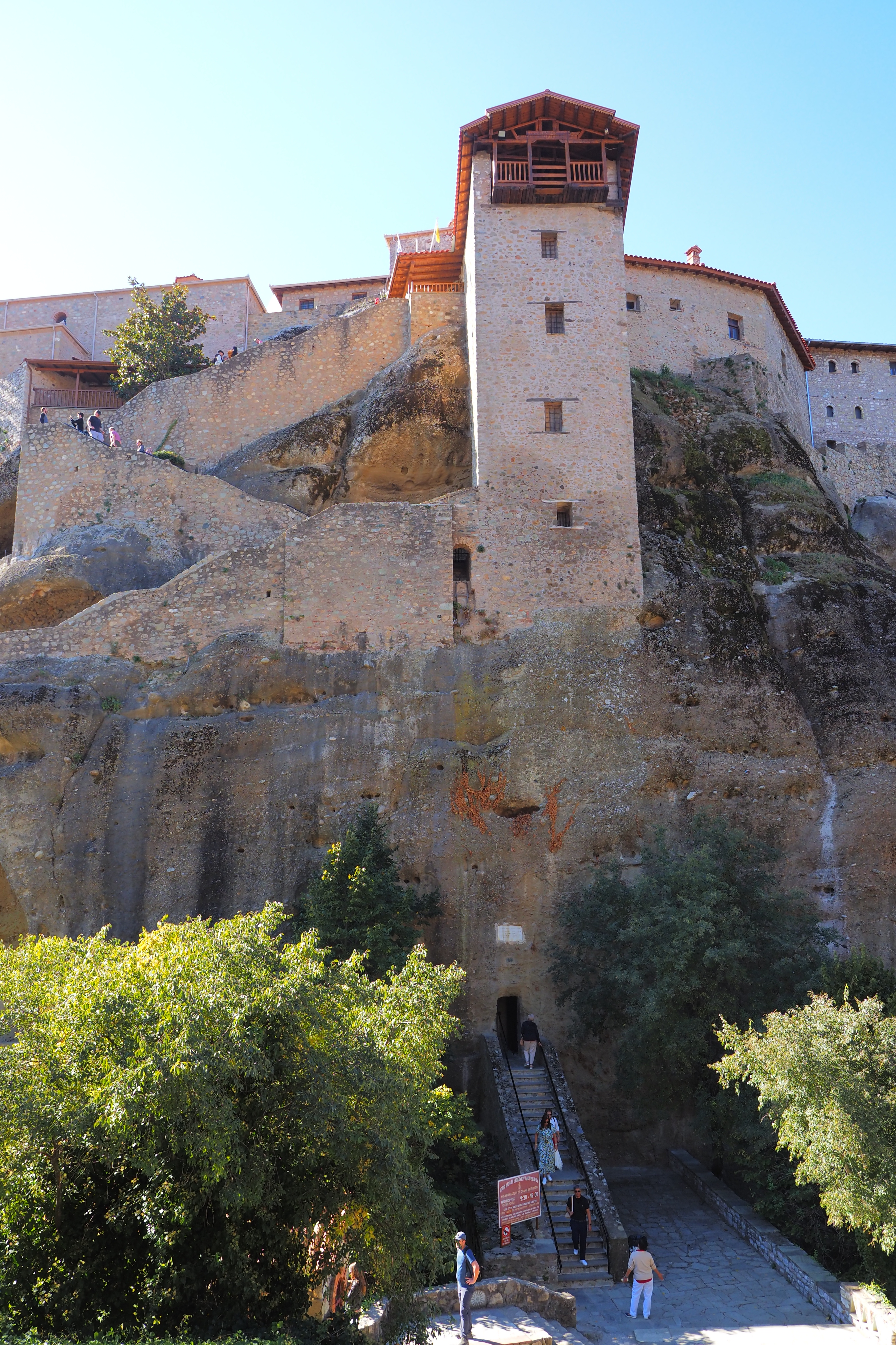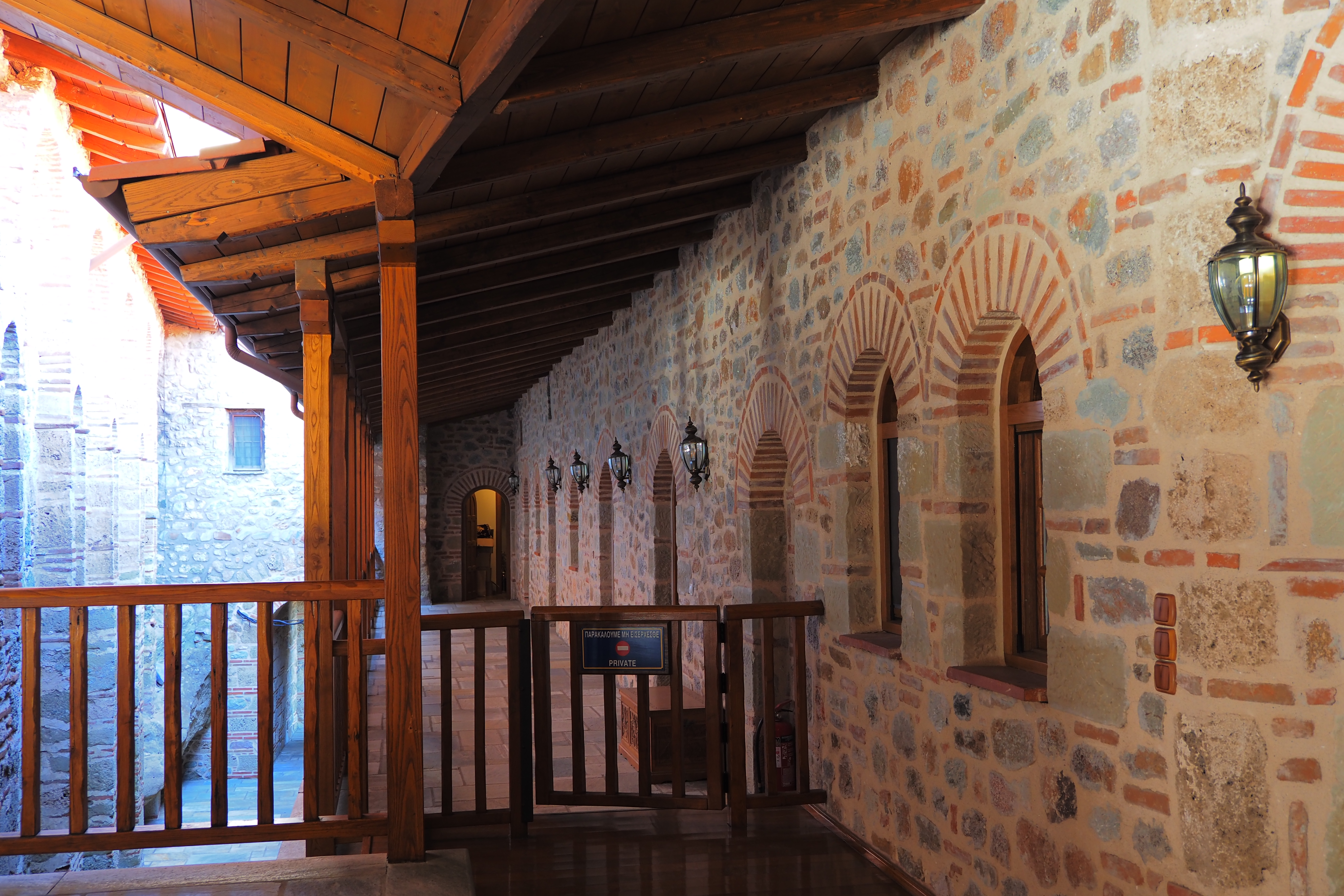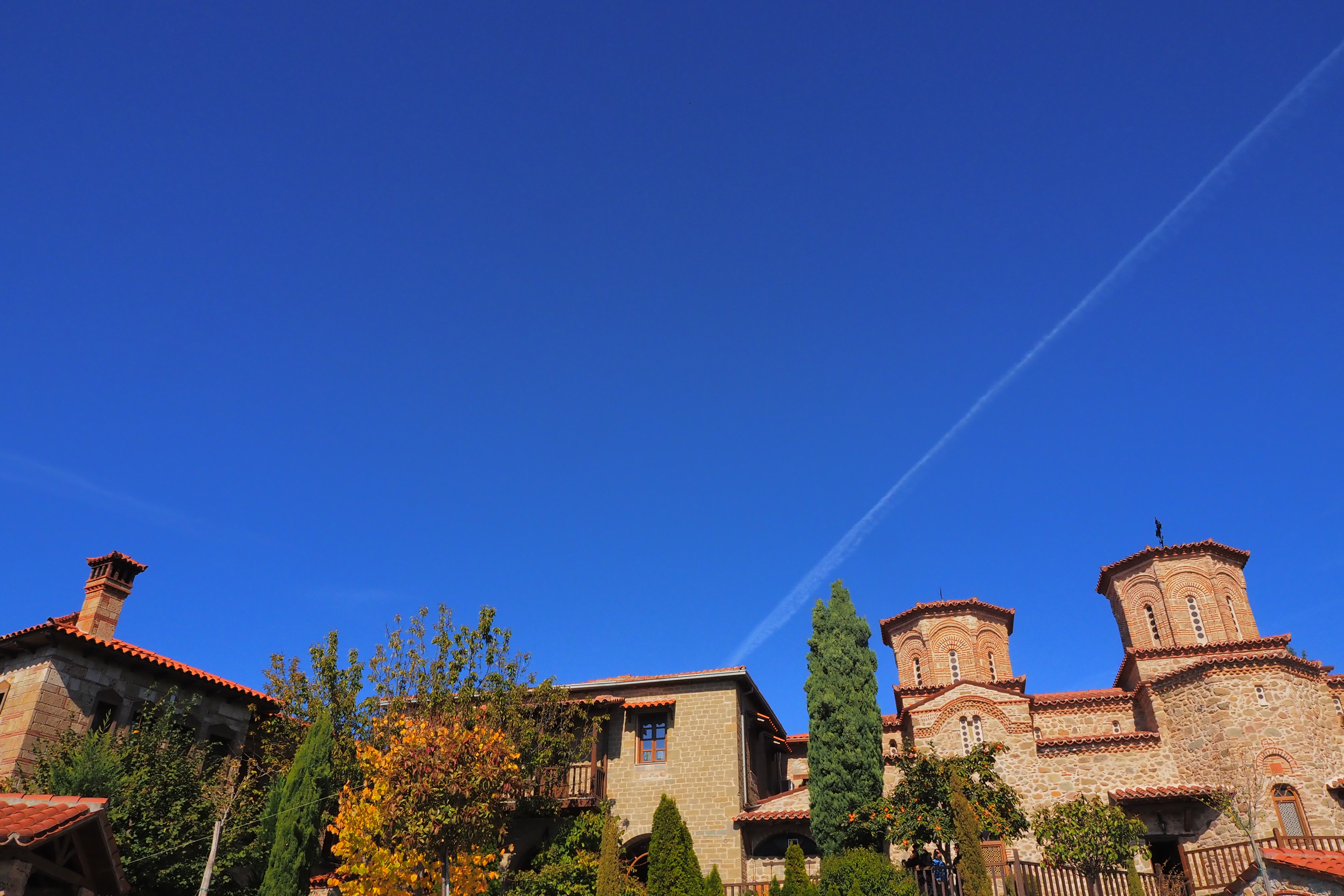 背景に見えるような奇岩群が成す険しい地形は、14世紀当時 俗世から断絶し 祈りに人生を捧げようという修道士たちにとって理想的な場所だったらしい。特に現在のギリシア北部がセルビア王国の版図下にくみこまれていく中で、戦乱を避けるようにアトス山から移住してくる修道士たちも多かったという。