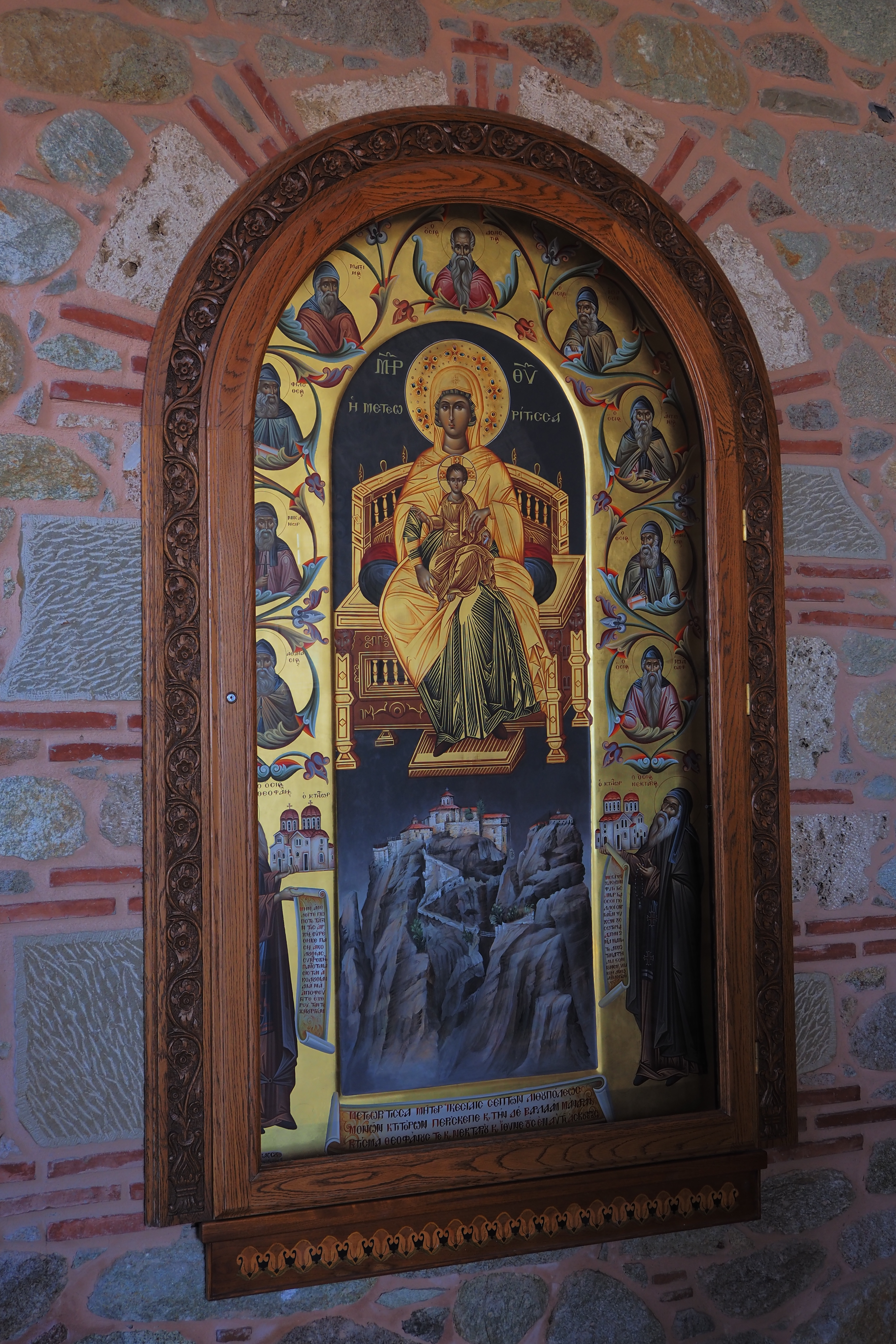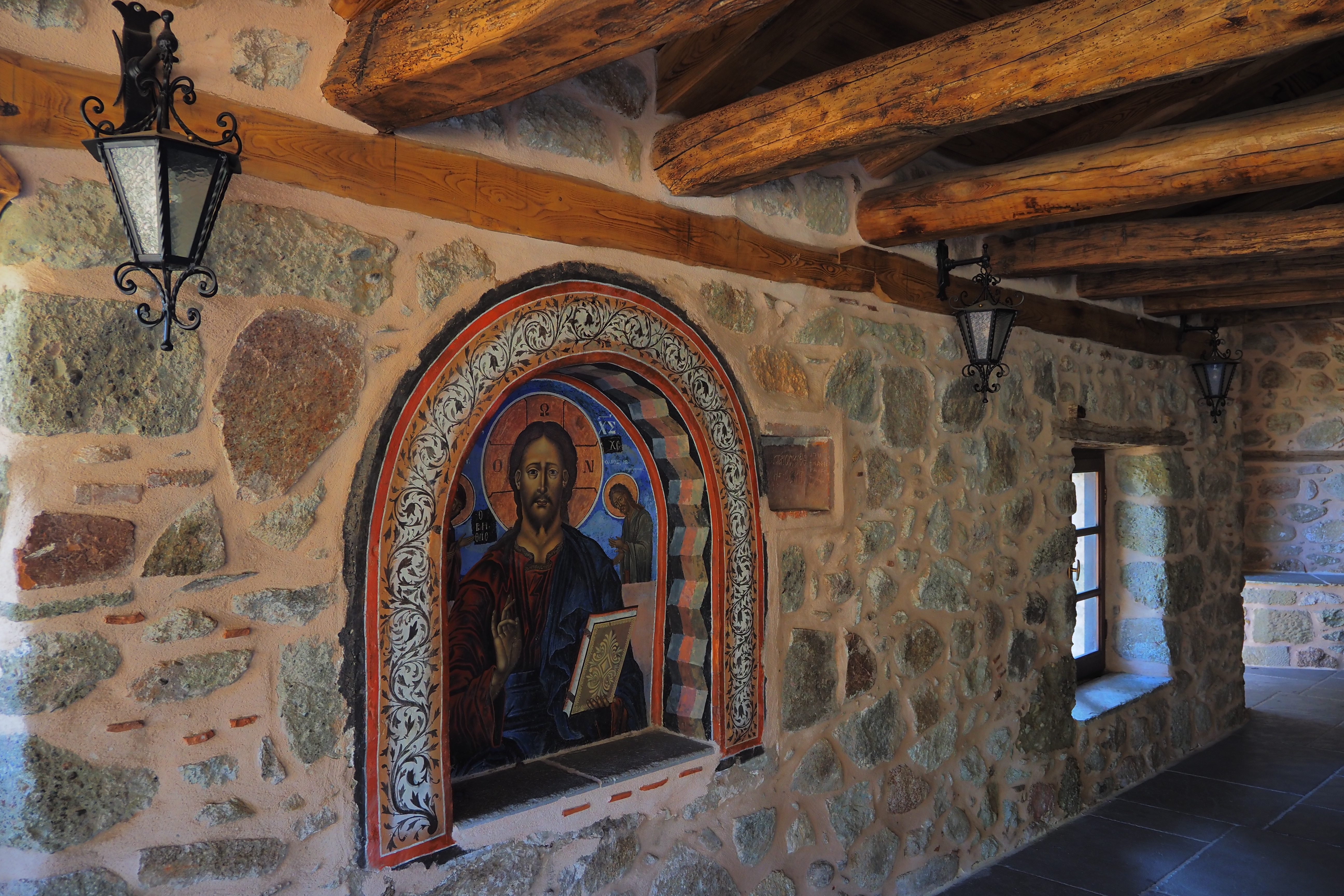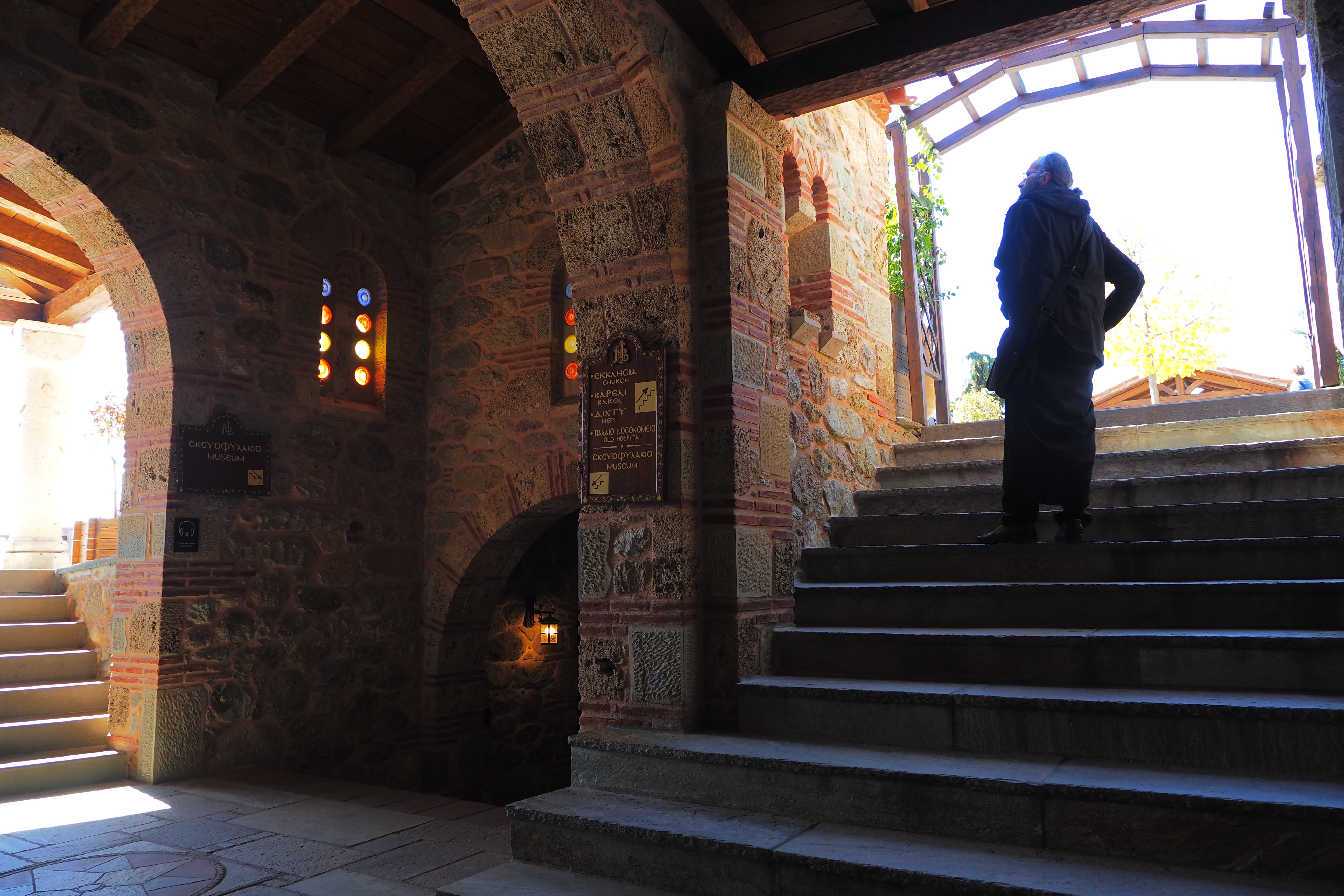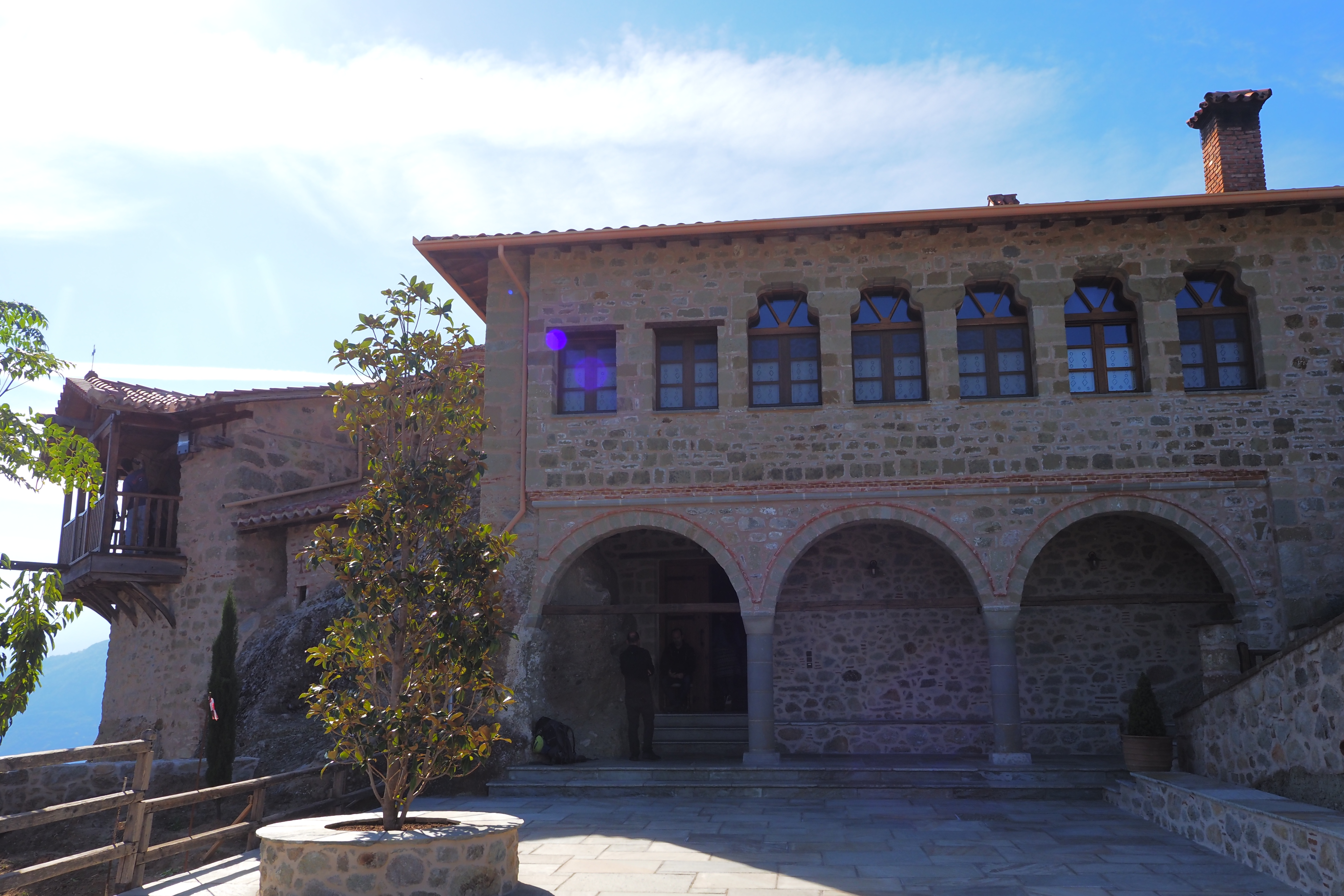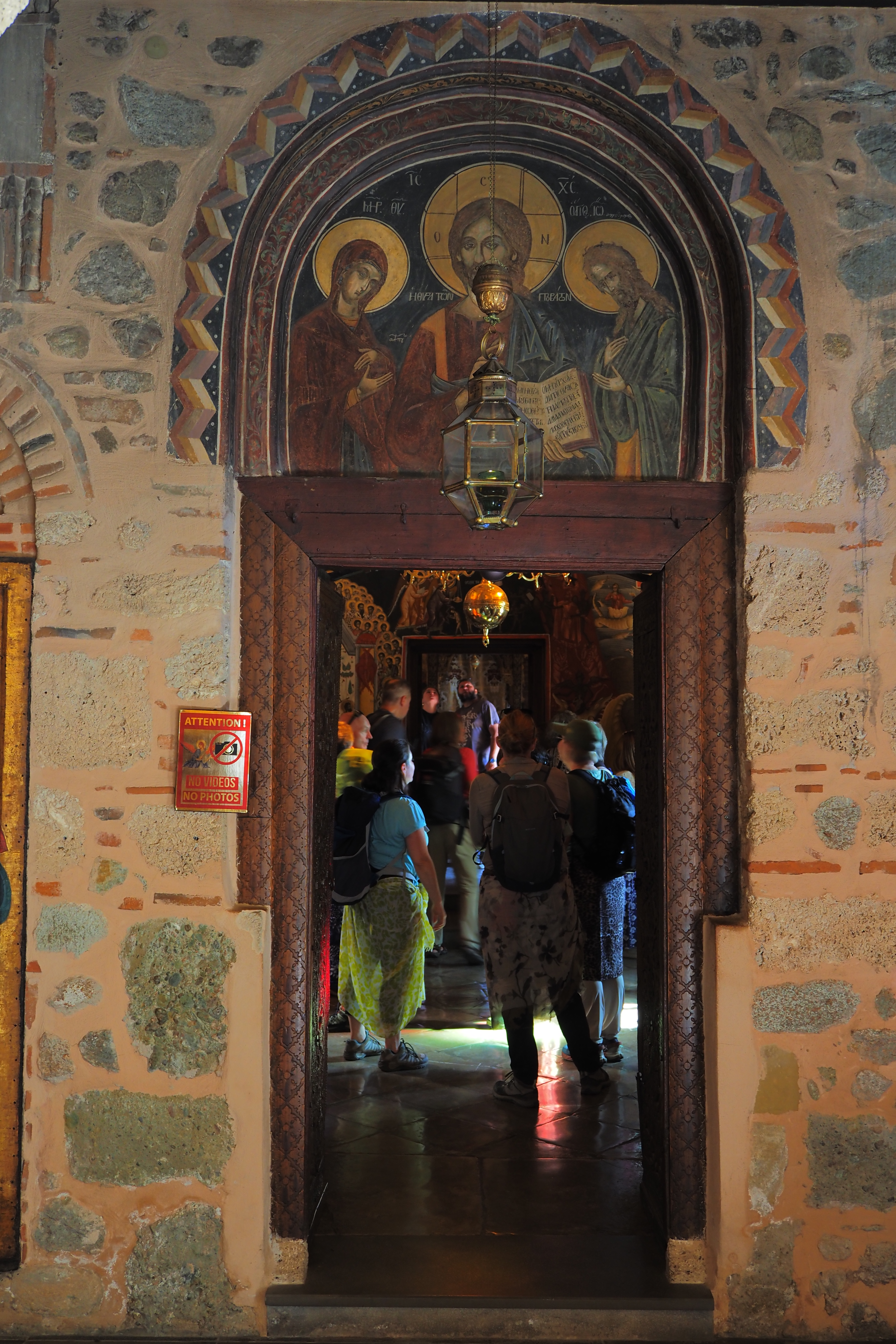 背景に見えるような奇岩群が成す険しい地形は、14世紀当時 俗世から断絶し 祈りに人生を捧げようという修道士たちにとって理想的な場所だったらしい。特に現在のギリシア北部がセルビア王国の版図下にくみこまれていく中で、戦乱を避けるようにアトス山から移住してくる修道士たちも多かったという。
