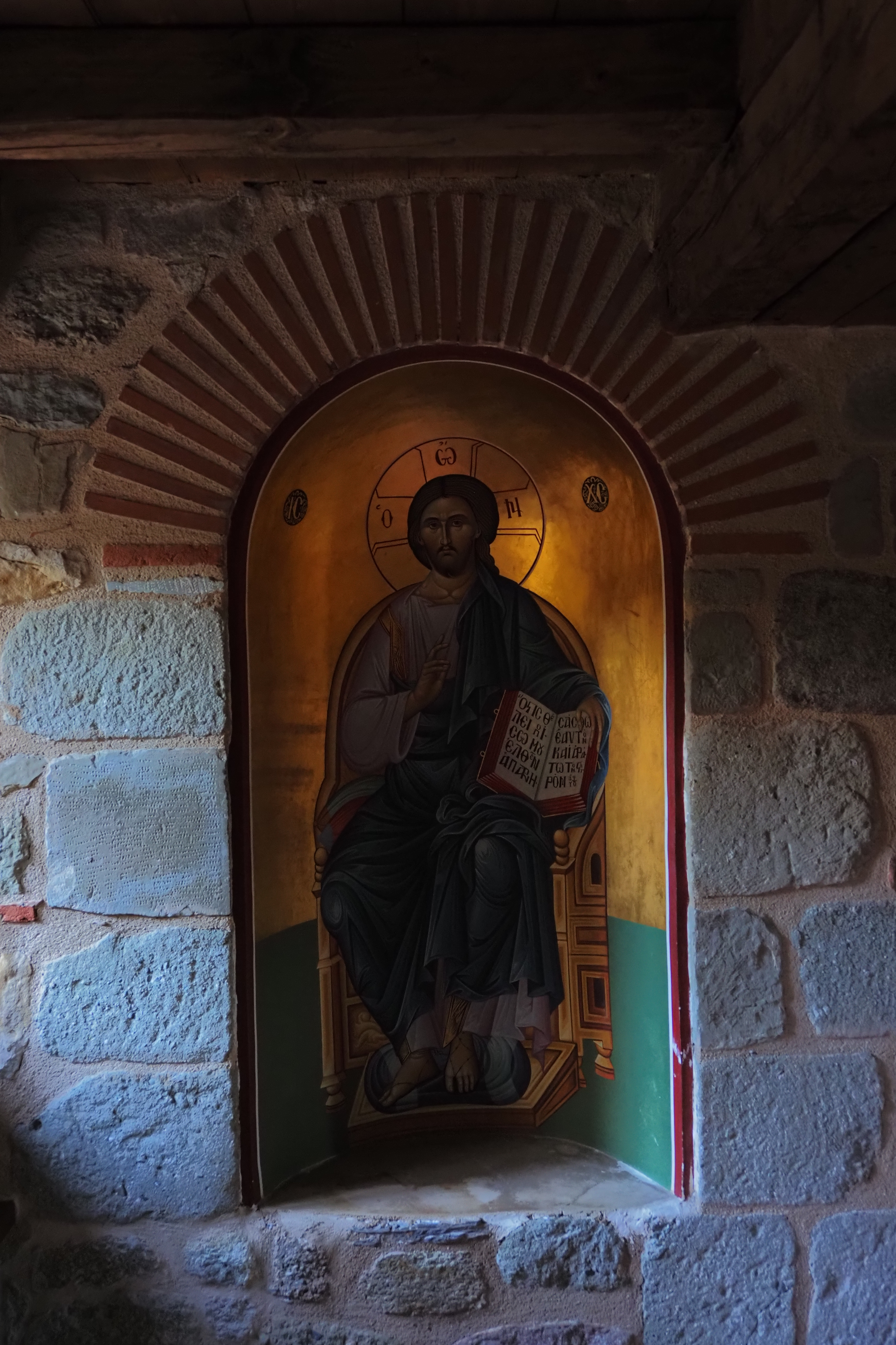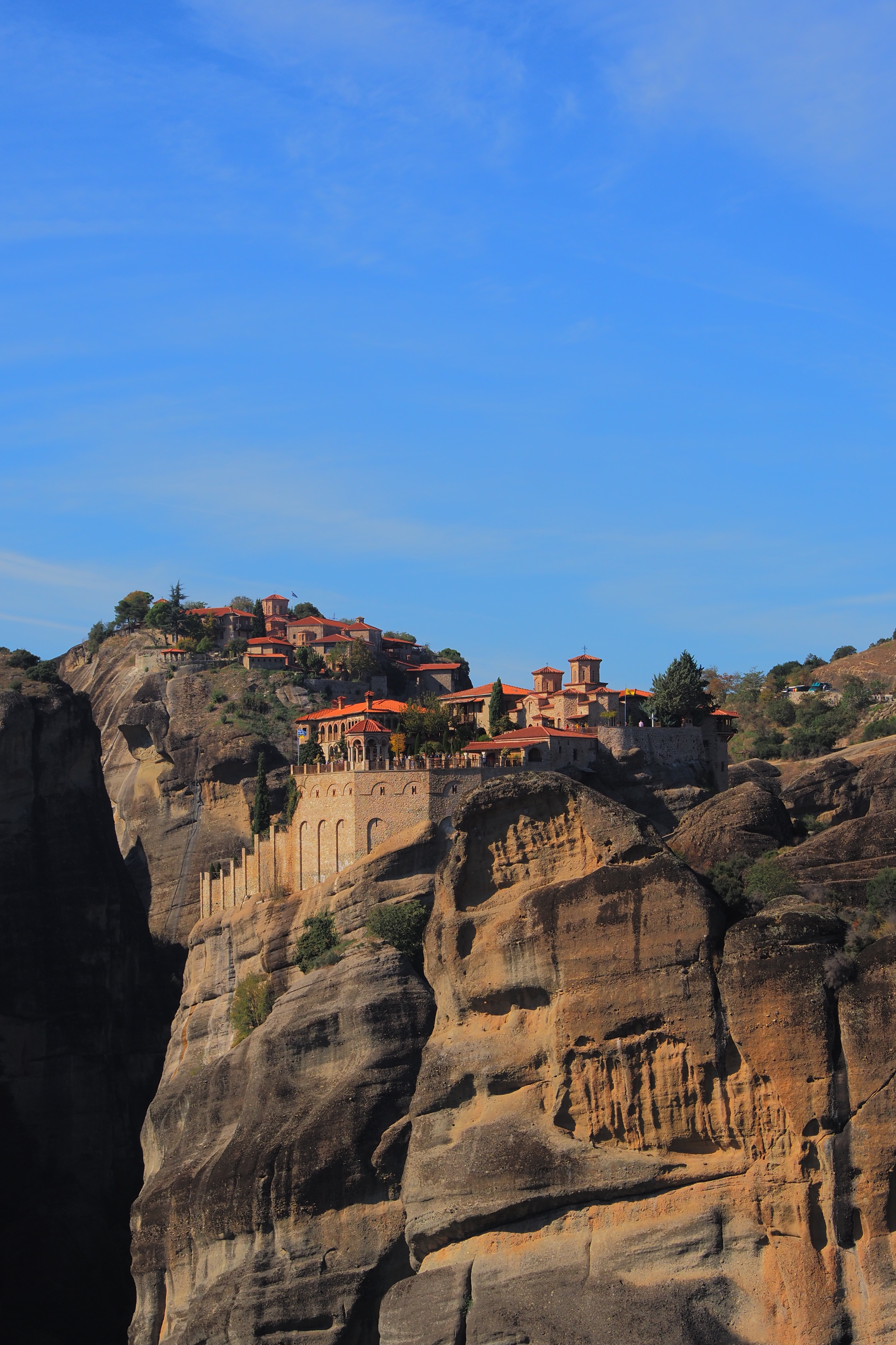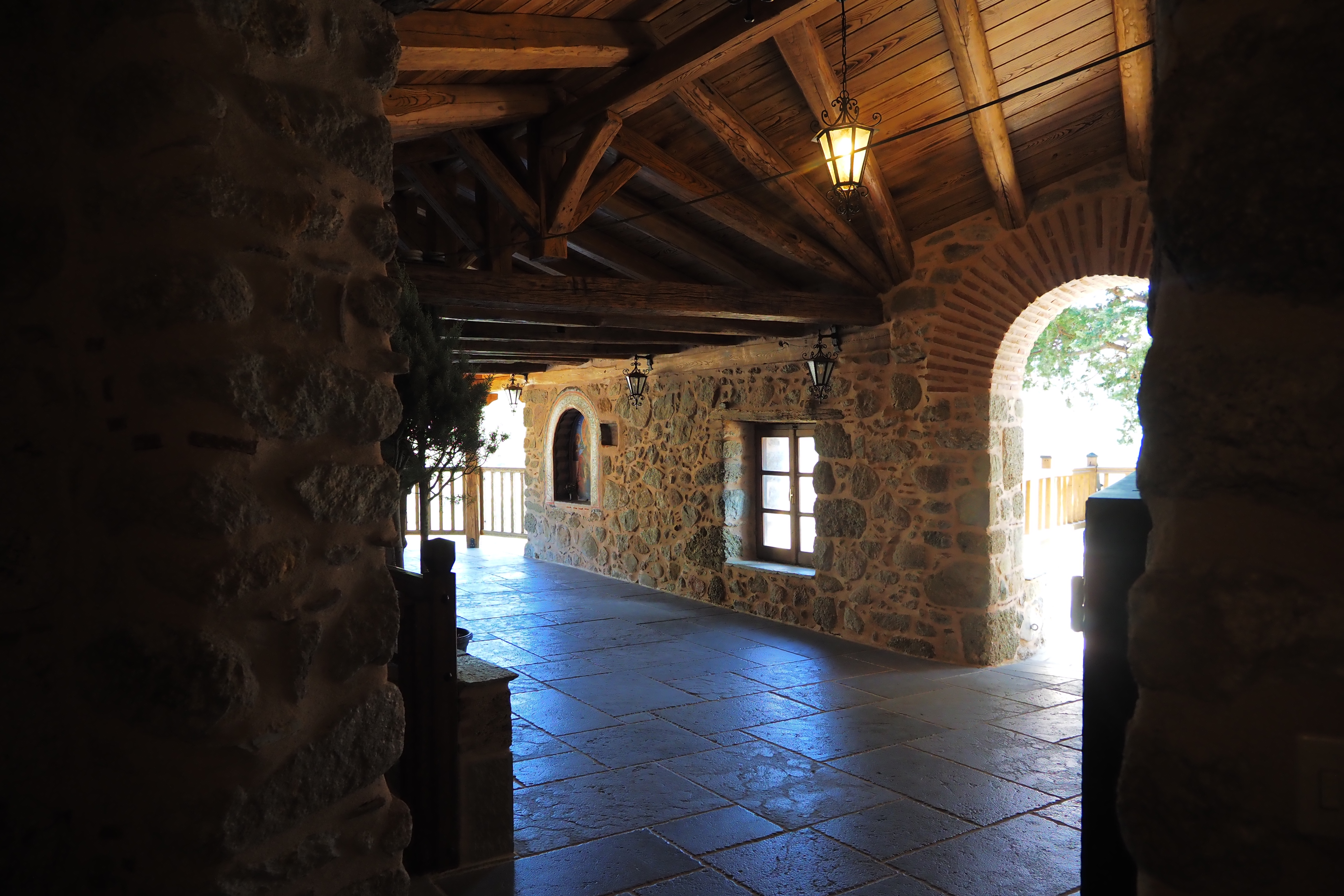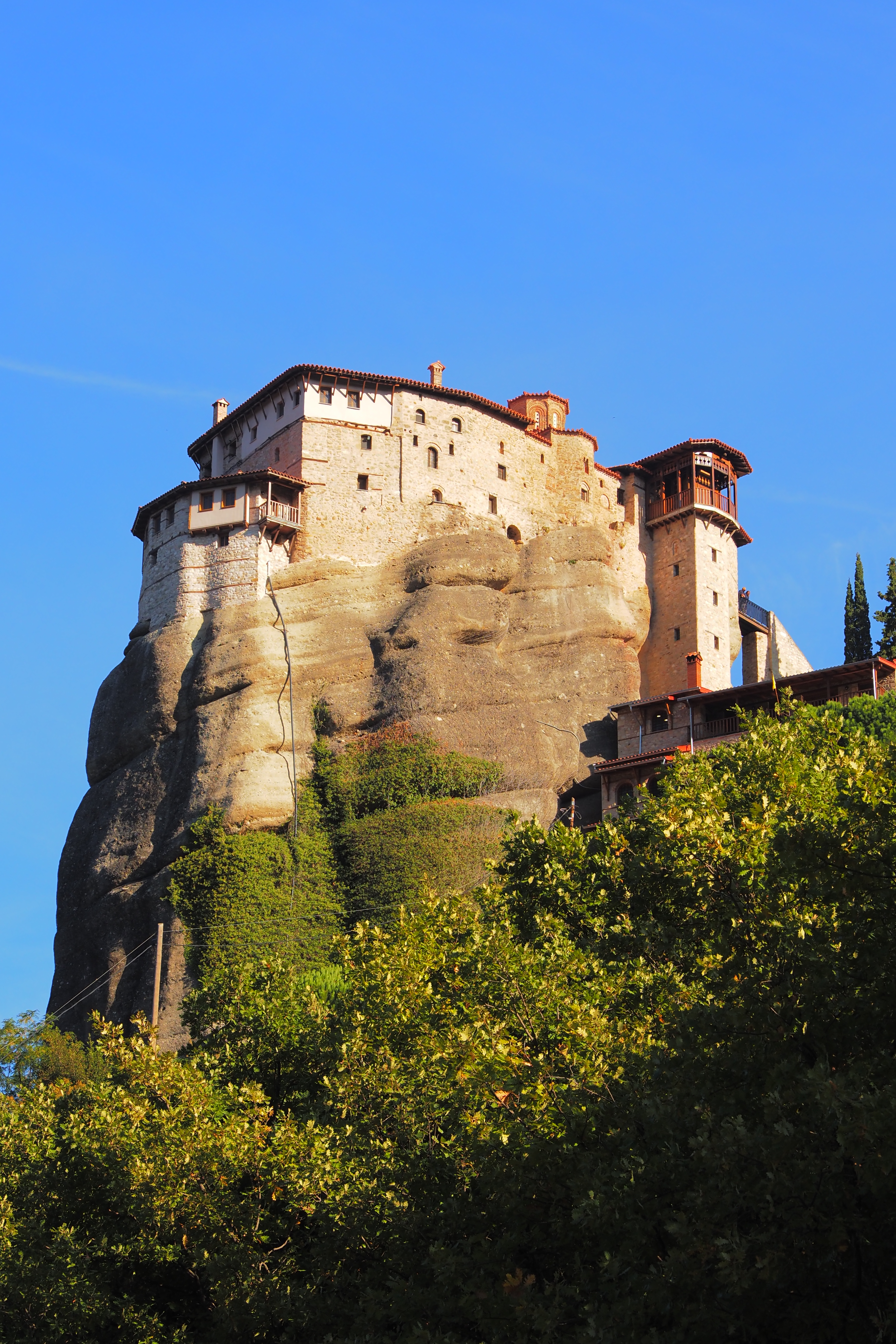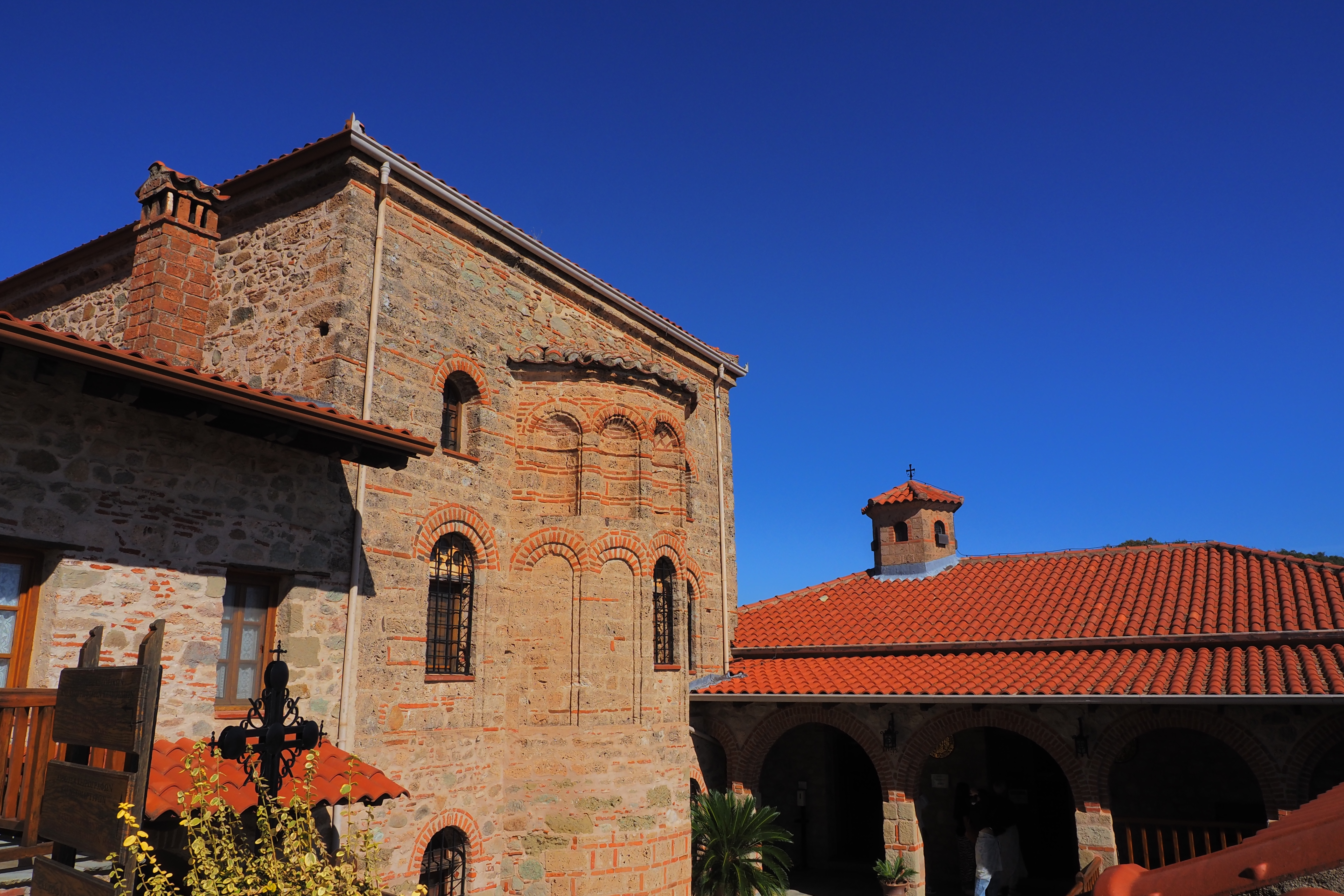 背景に見えるような奇岩群が成す険しい地形は、14世紀当時 俗世から断絶し 祈りに人生を捧げようという修道士たちにとって理想的な場所だったらしい。特に現在のギリシア北部がセルビア王国の版図下にくみこまれていく中で、戦乱を避けるようにアトス山から移住してくる修道士たちも多かったという。
