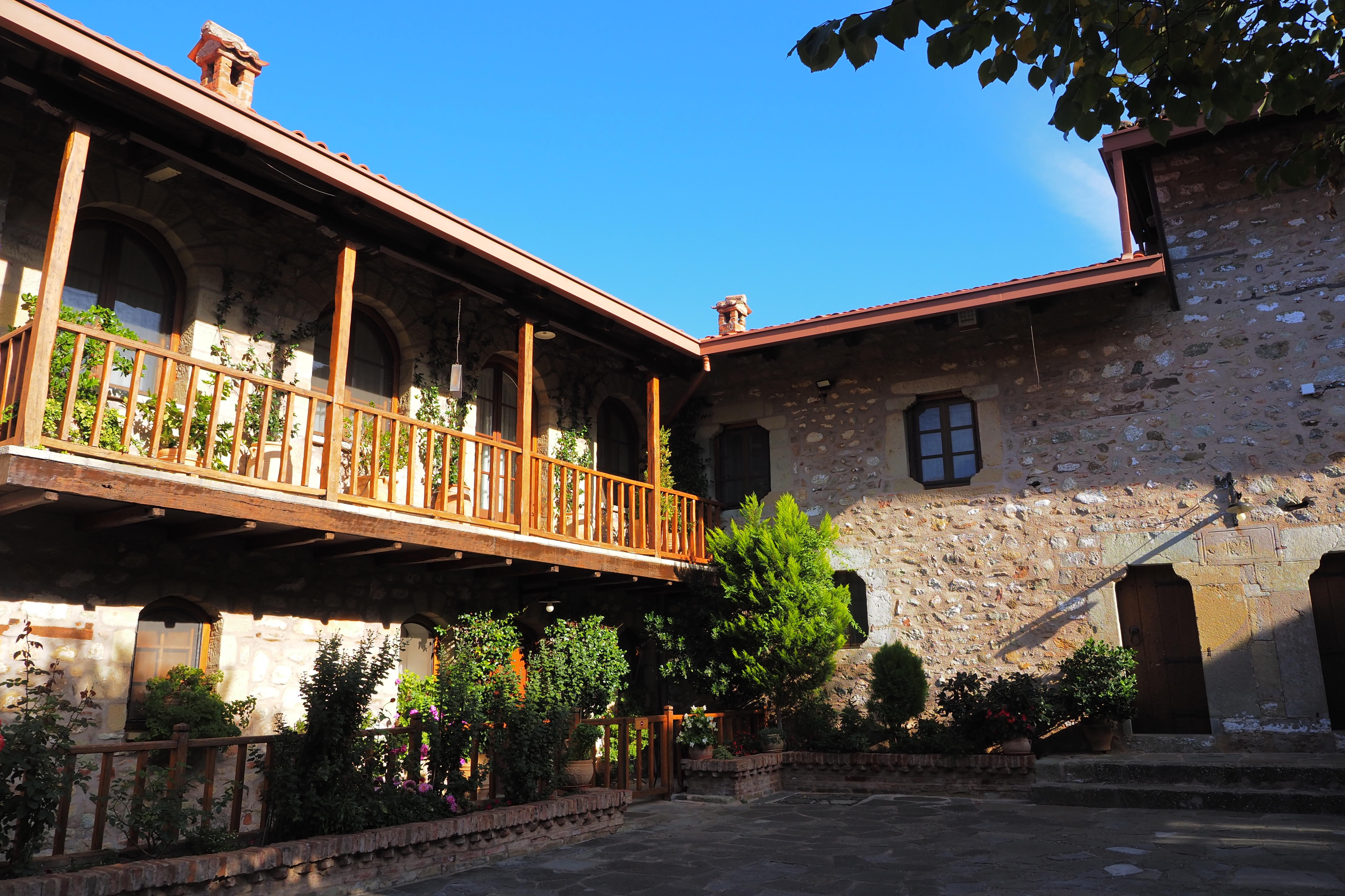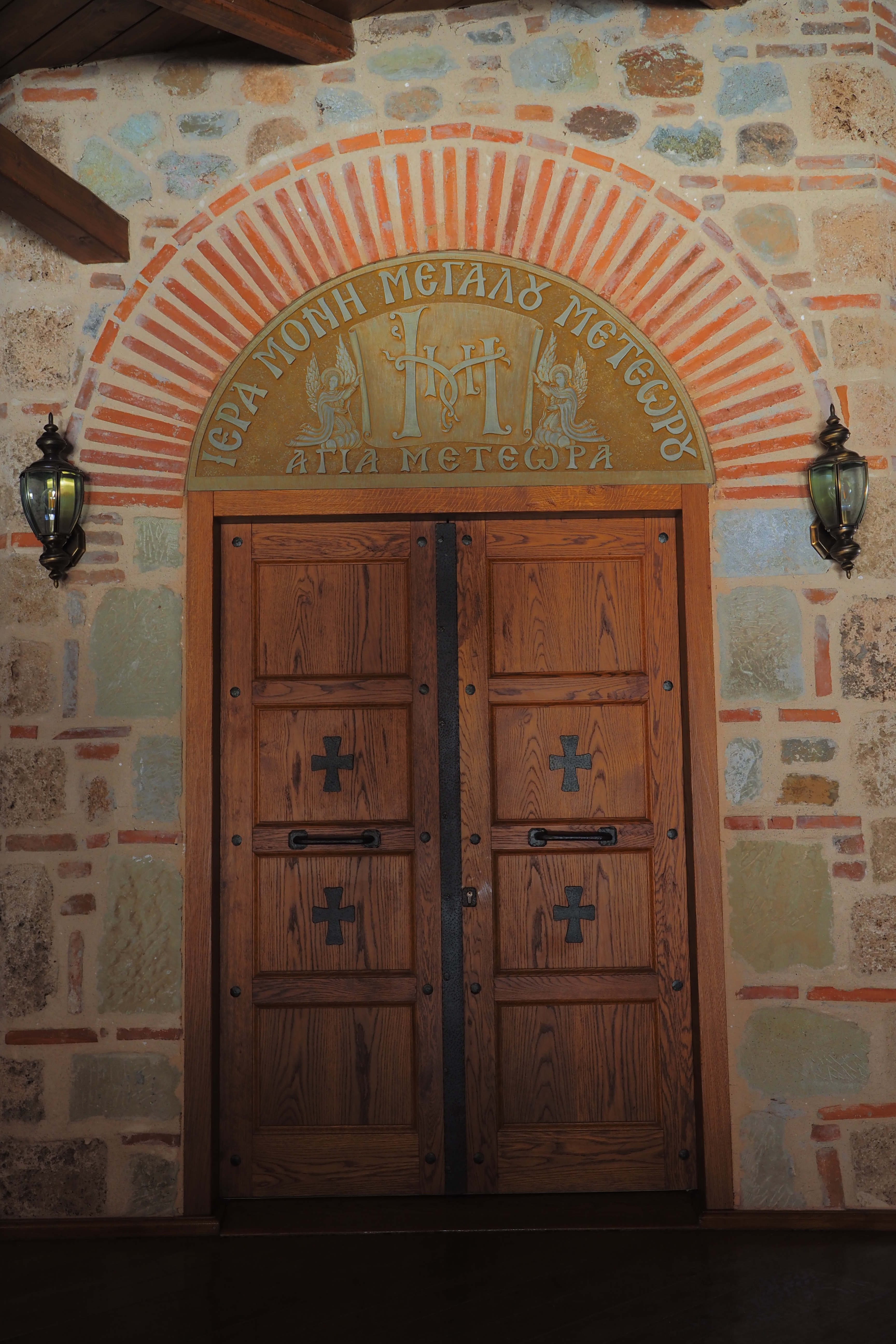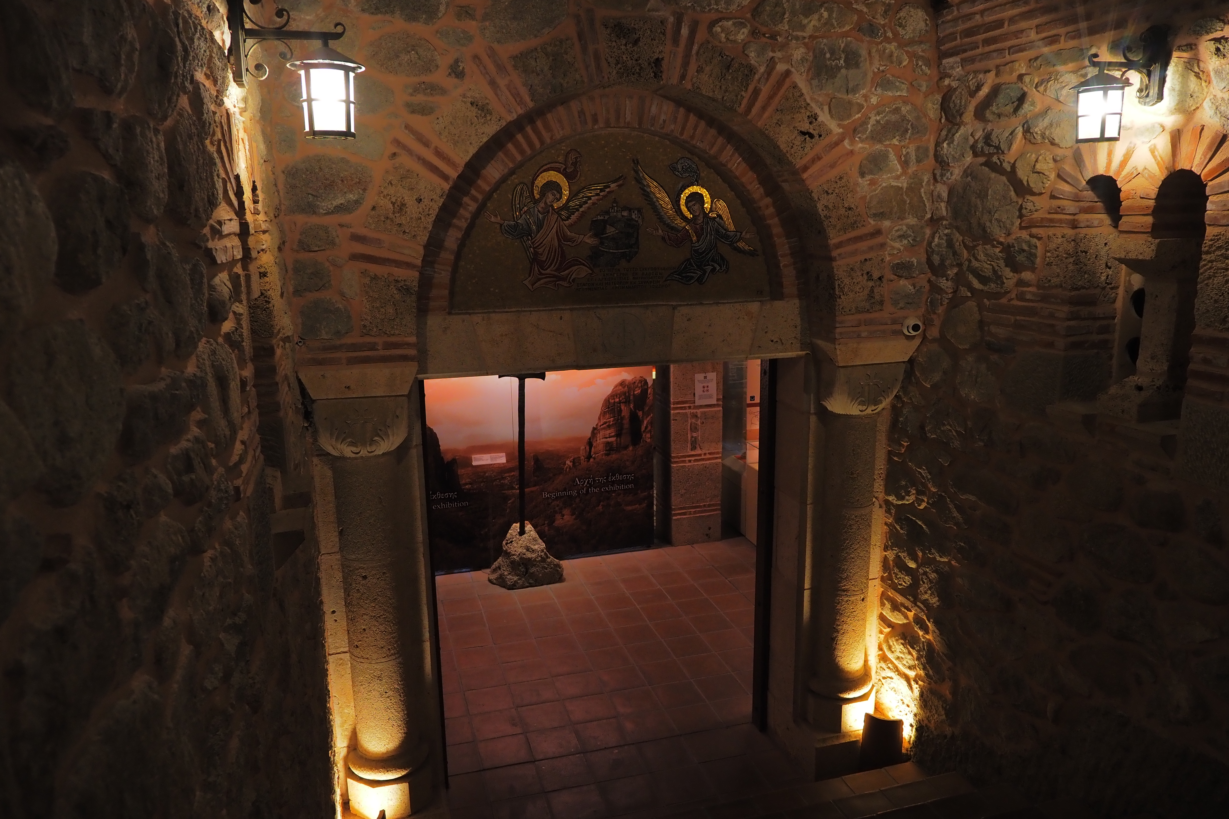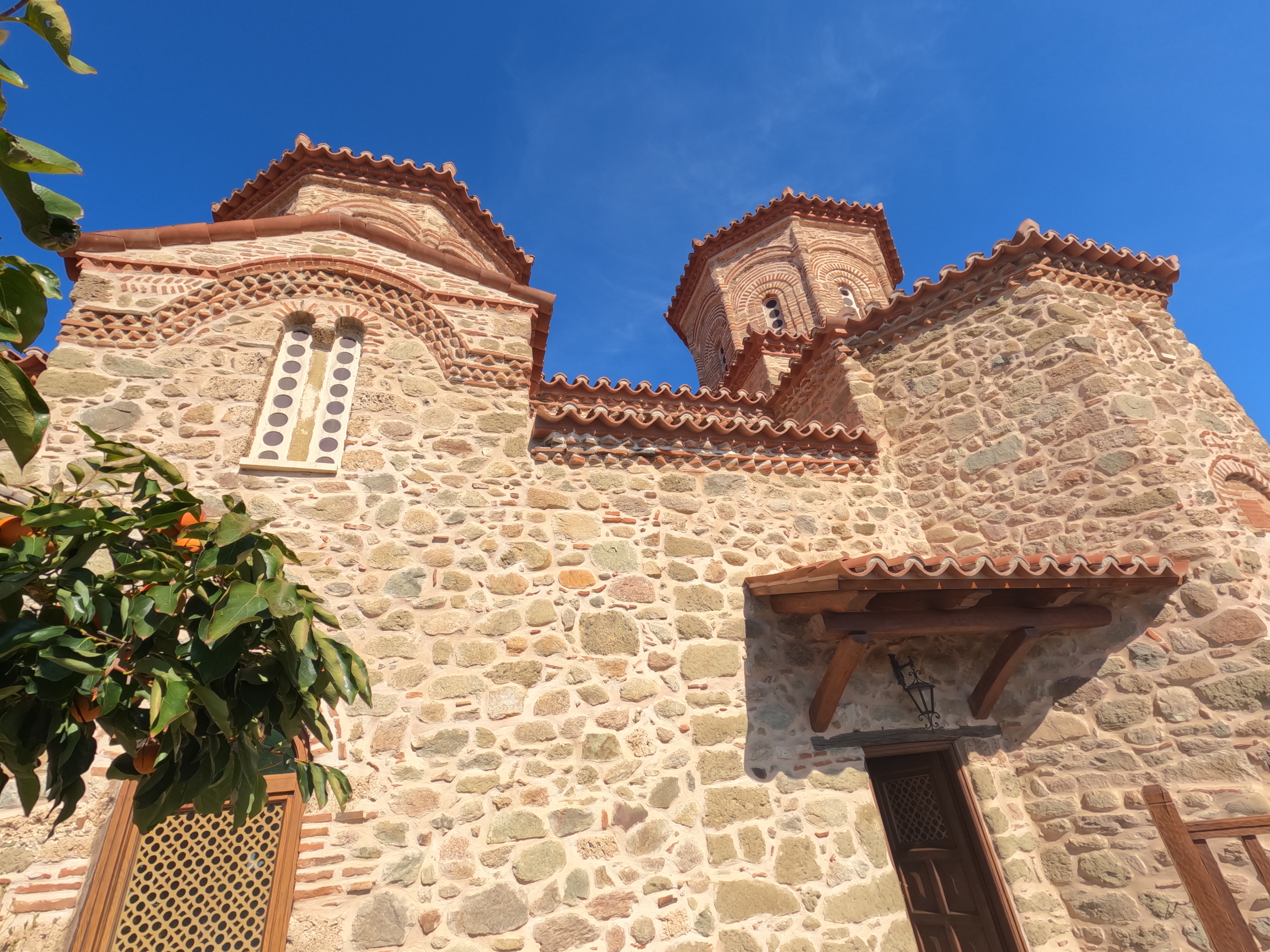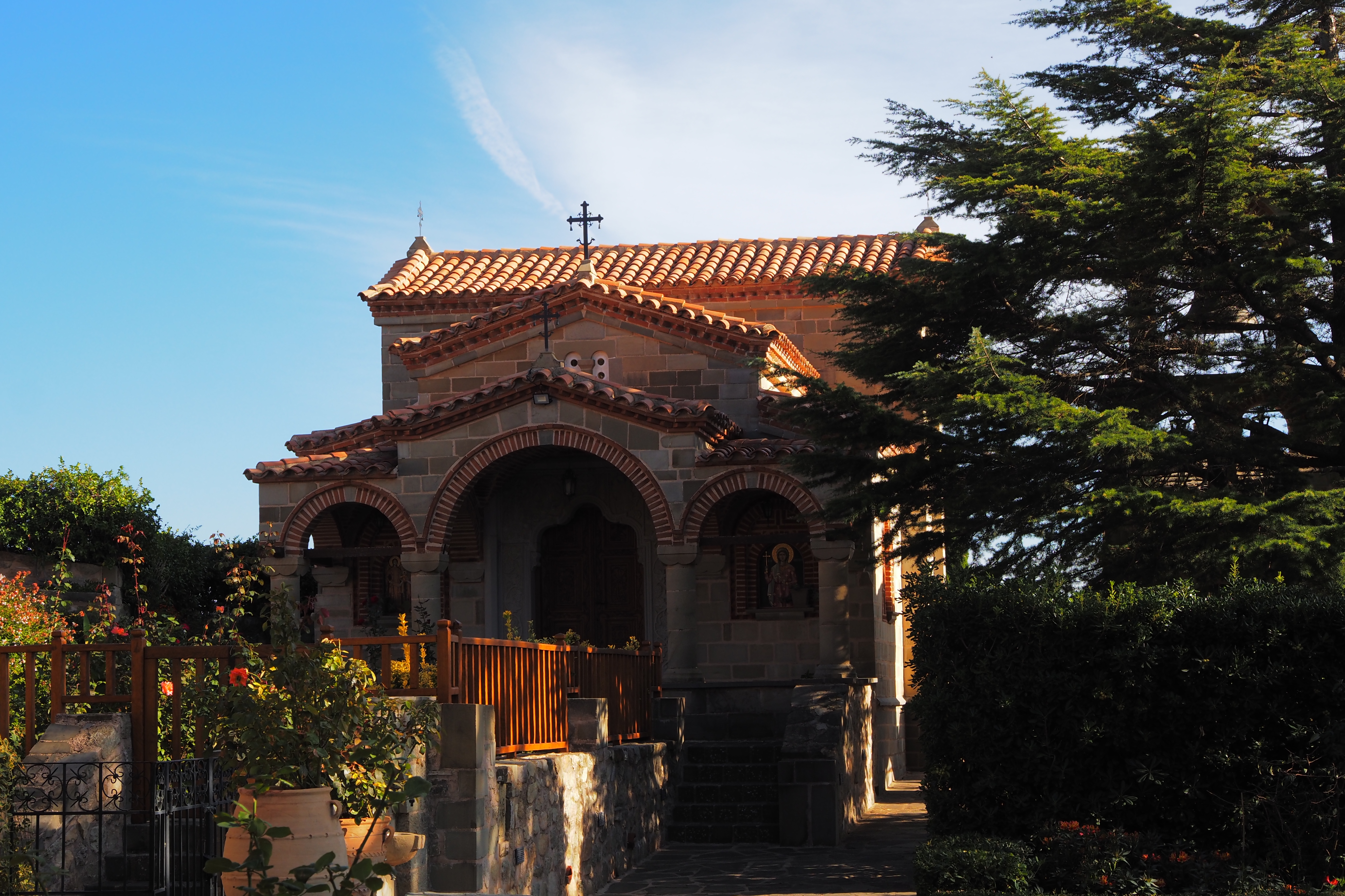 背景に見えるような奇岩群が成す険しい地形は、14世紀当時 俗世から断絶し 祈りに人生を捧げようという修道士たちにとって理想的な場所だったらしい。特に現在のギリシア北部がセルビア王国の版図下にくみこまれていく中で、戦乱を避けるようにアトス山から移住してくる修道士たちも多かったという。