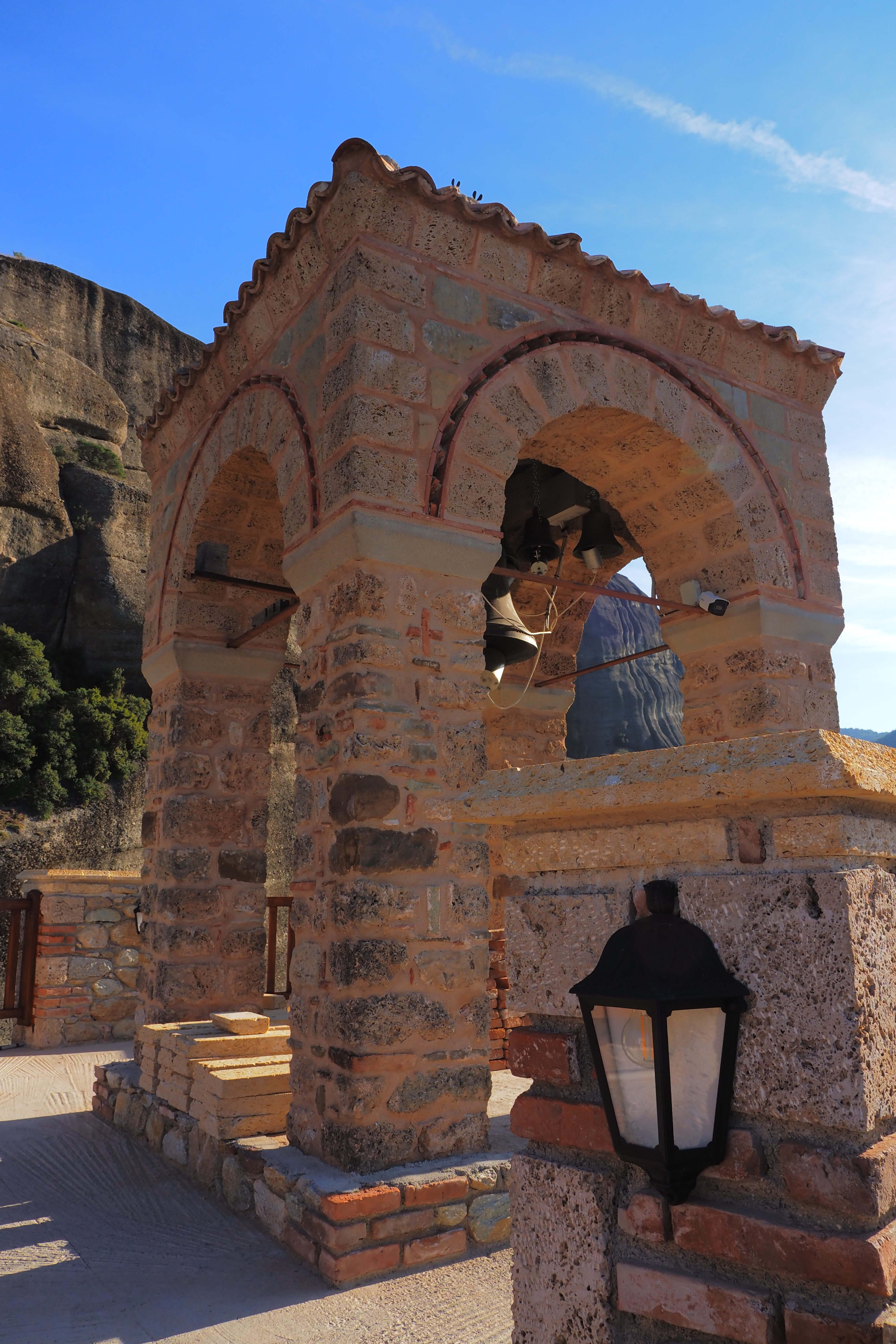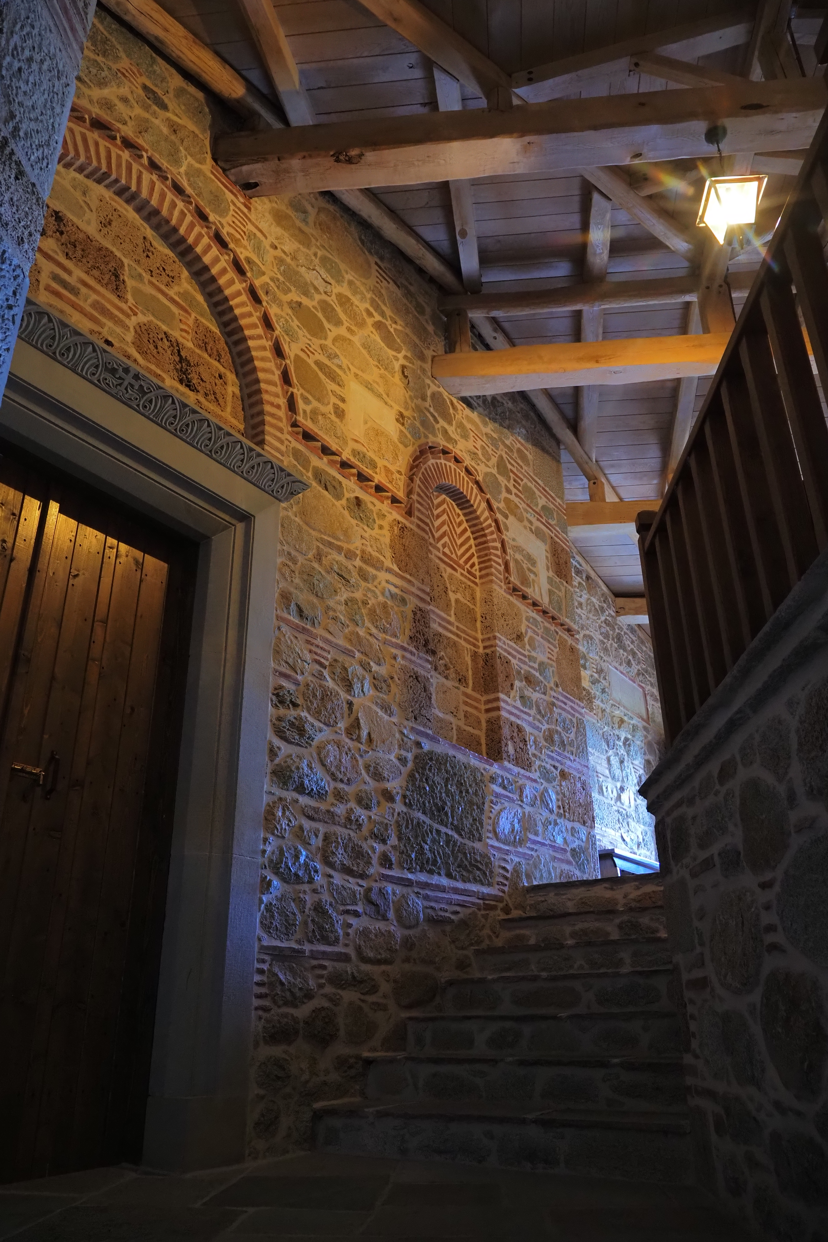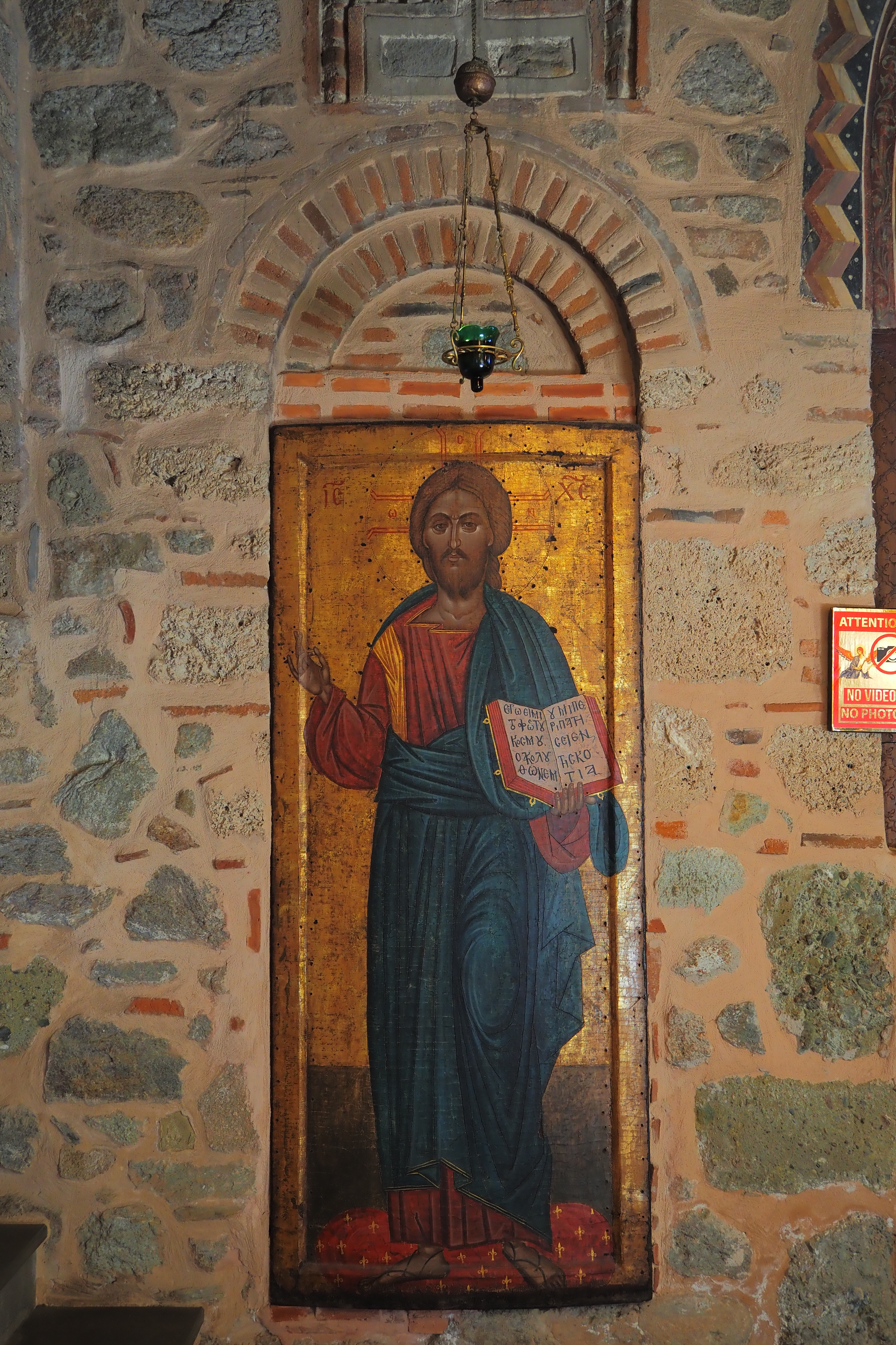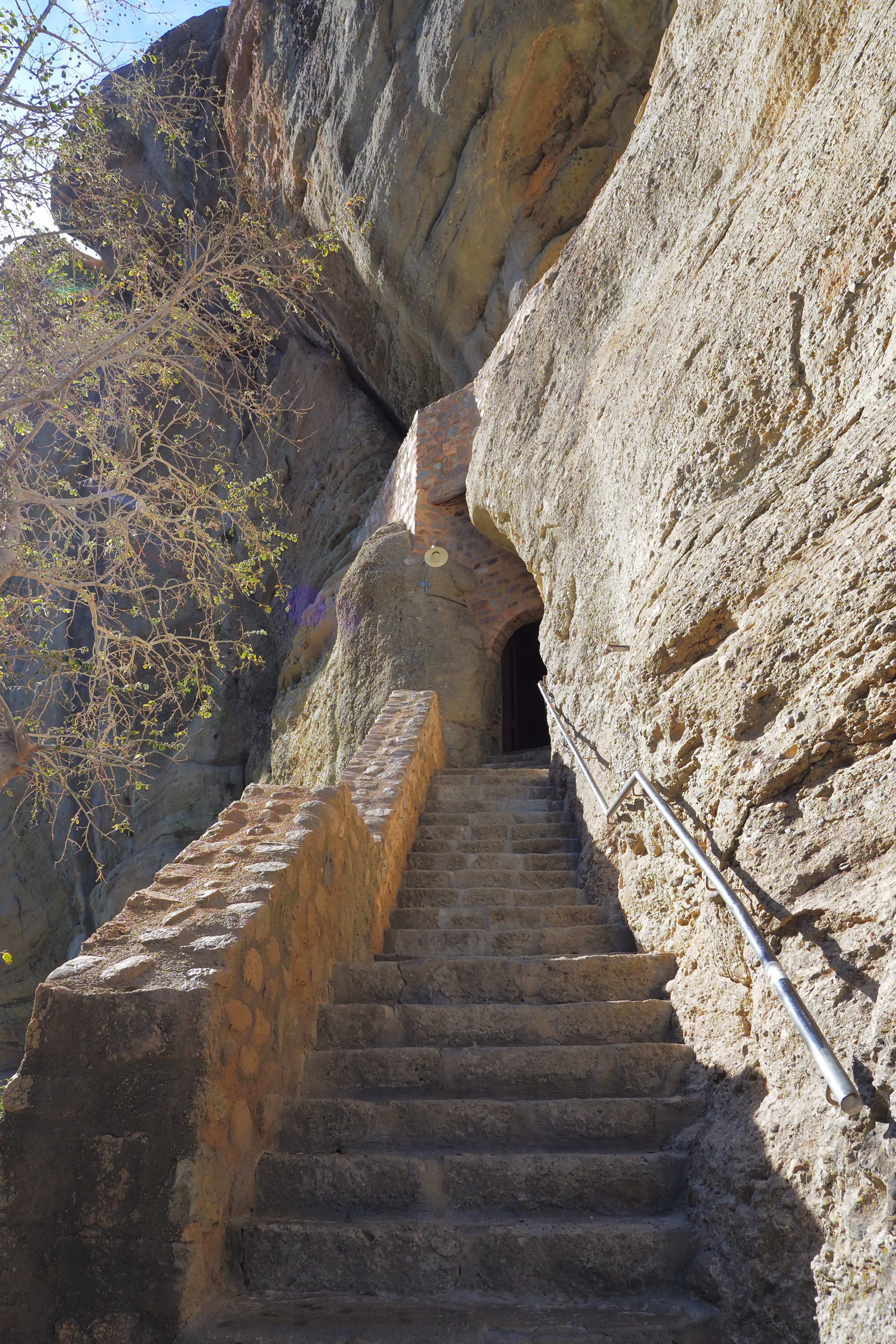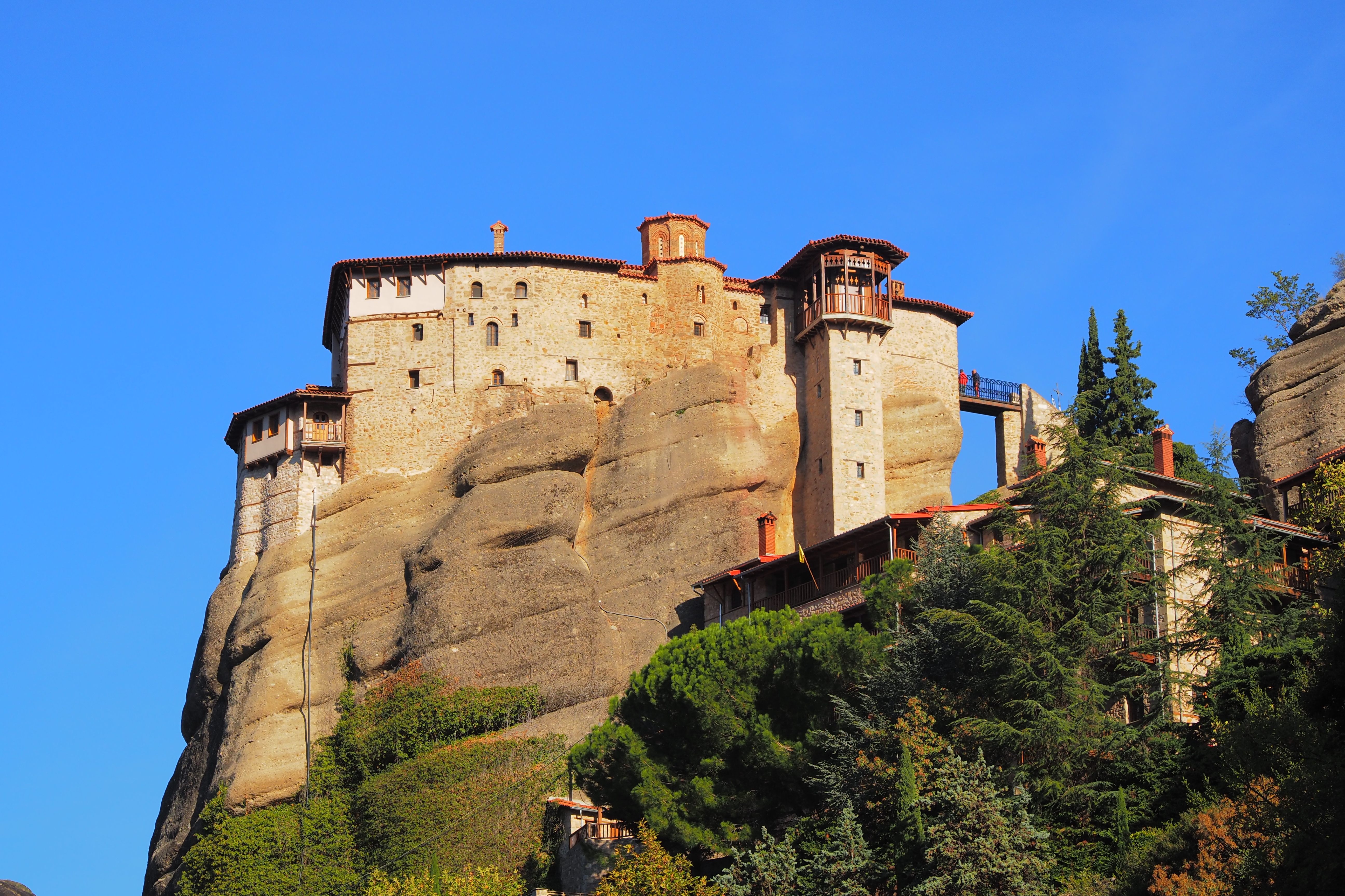 背景に見えるような奇岩群が成す険しい地形は、14世紀当時 俗世から断絶し 祈りに人生を捧げようという修道士たちにとって理想的な場所だったらしい。特に現在のギリシア北部がセルビア王国の版図下にくみこまれていく中で、戦乱を避けるようにアトス山から移住してくる修道士たちも多かったという。