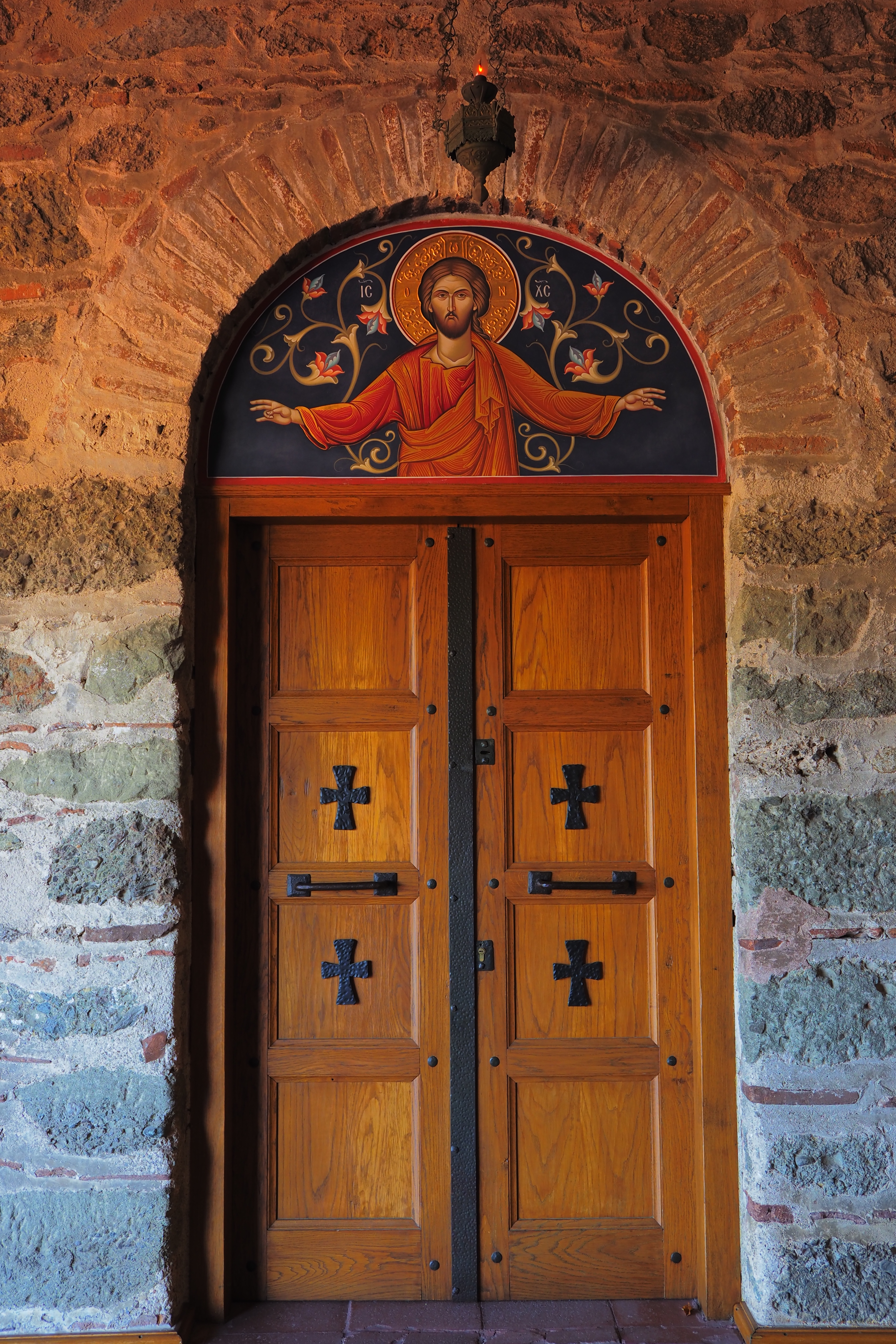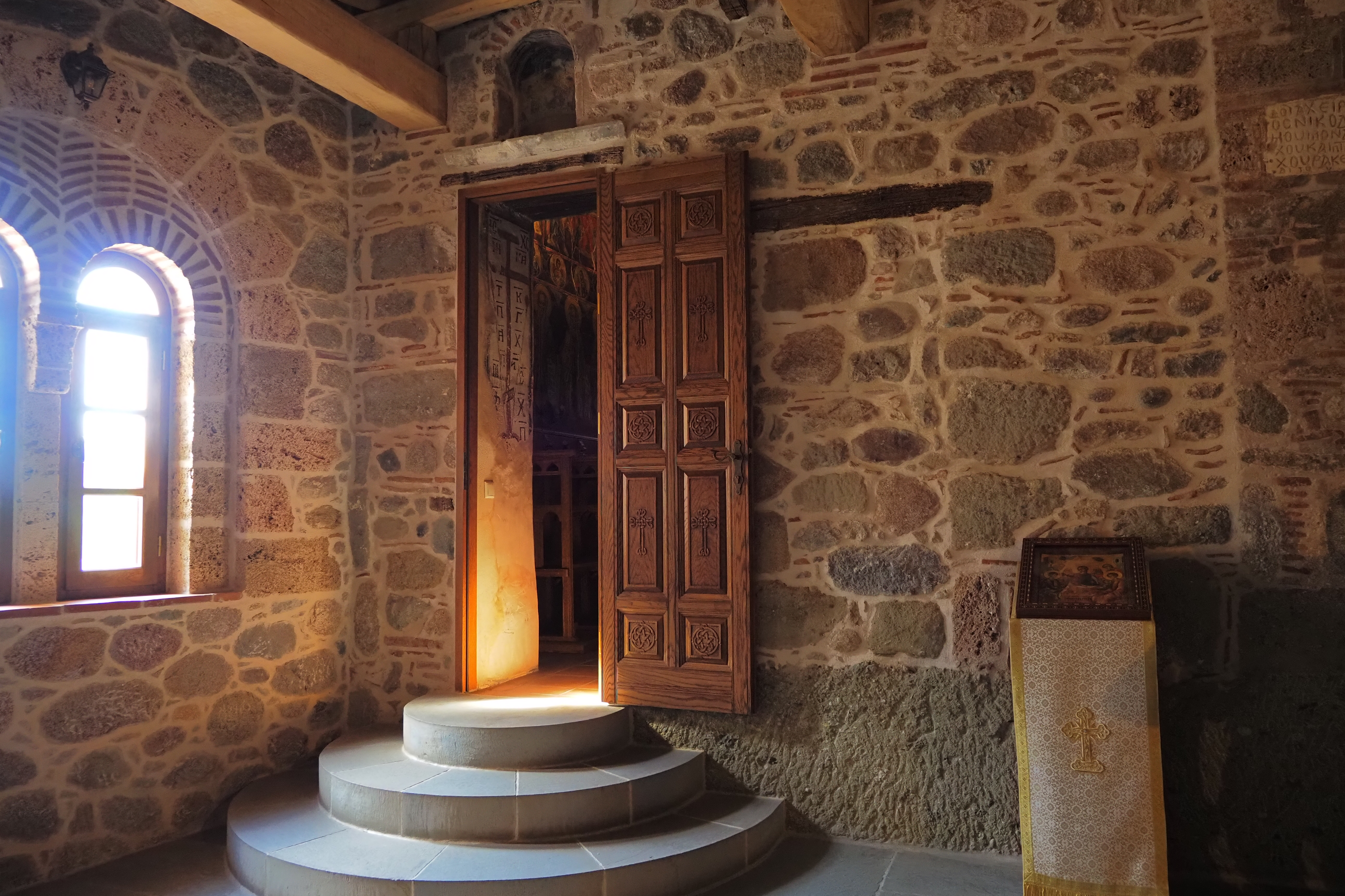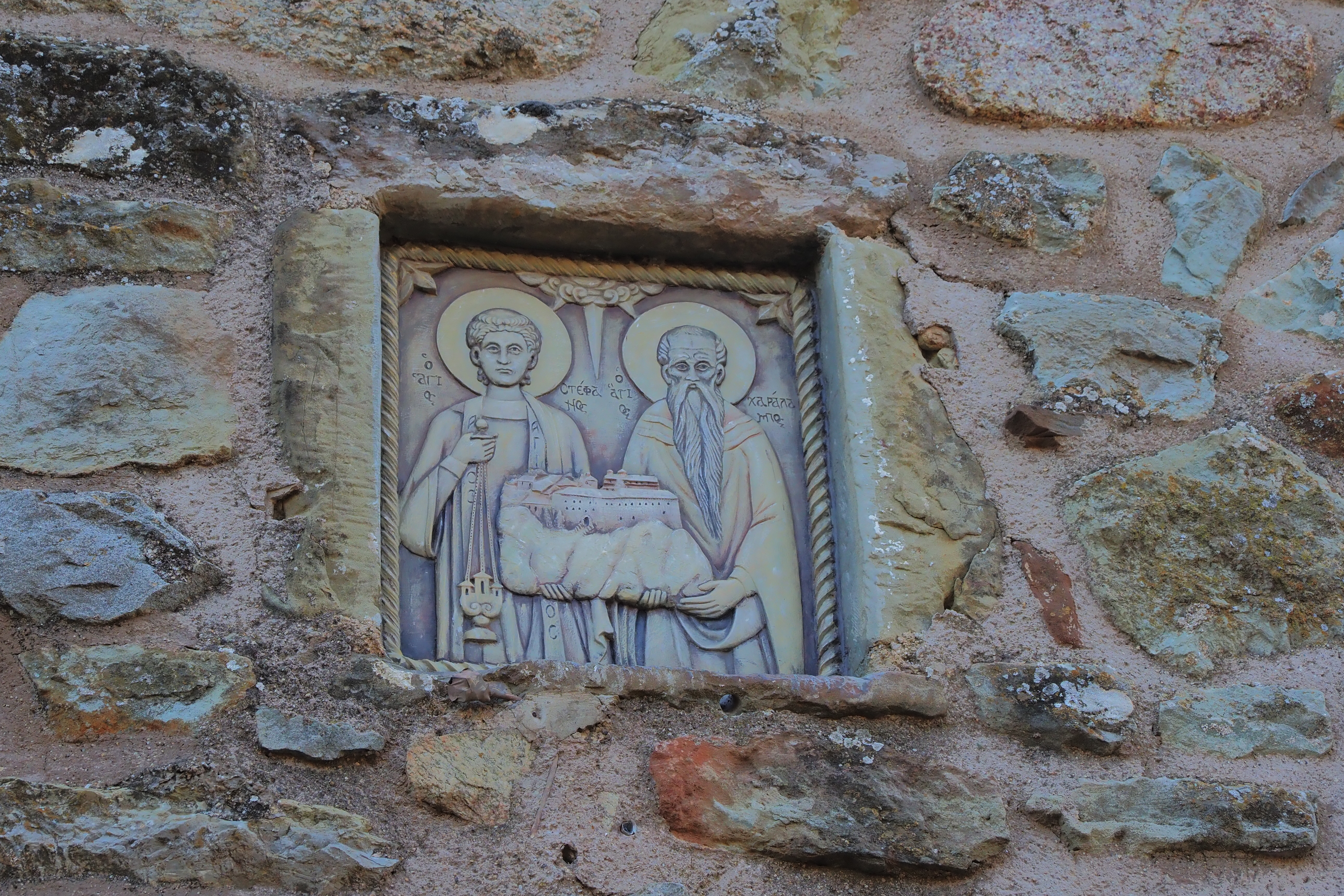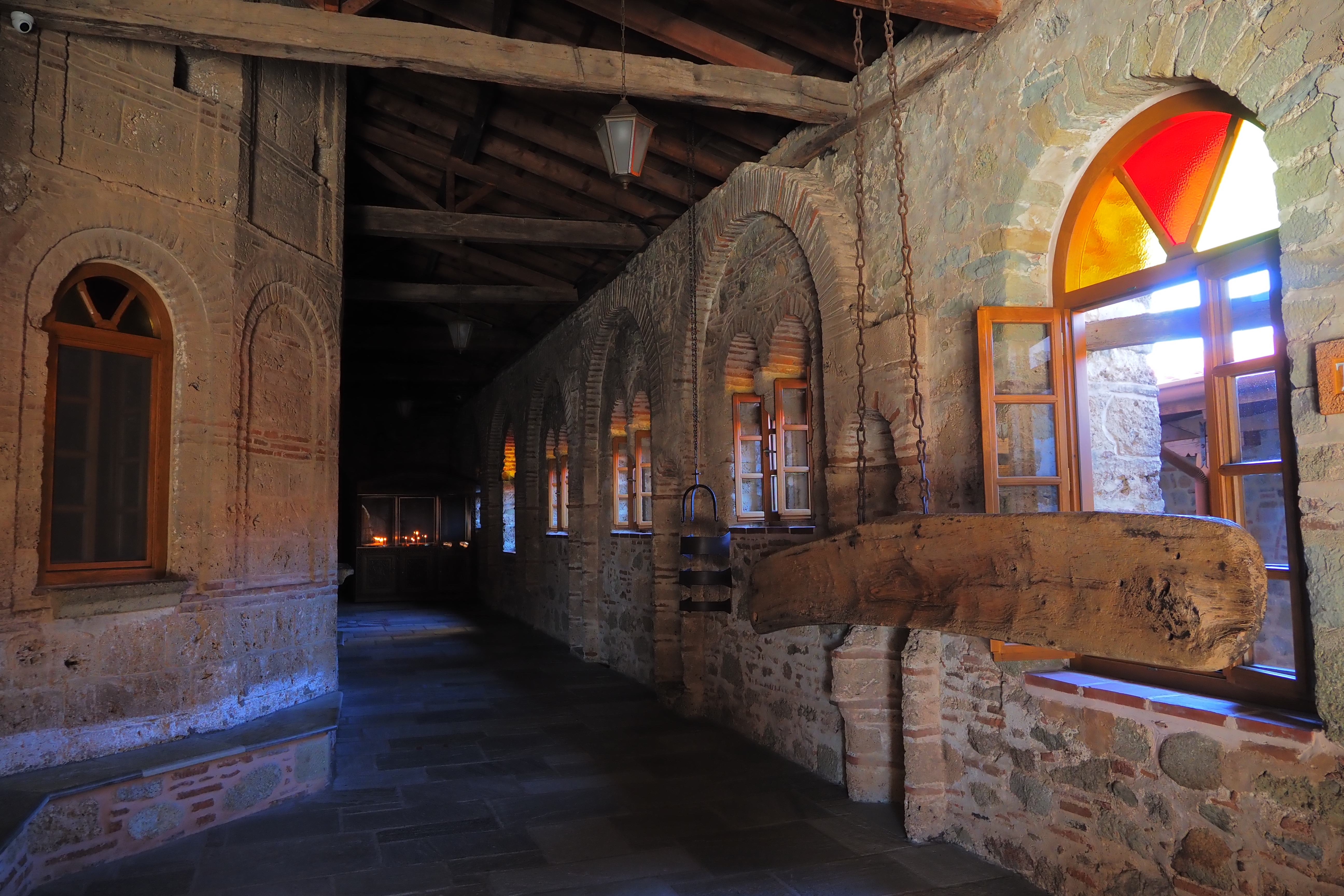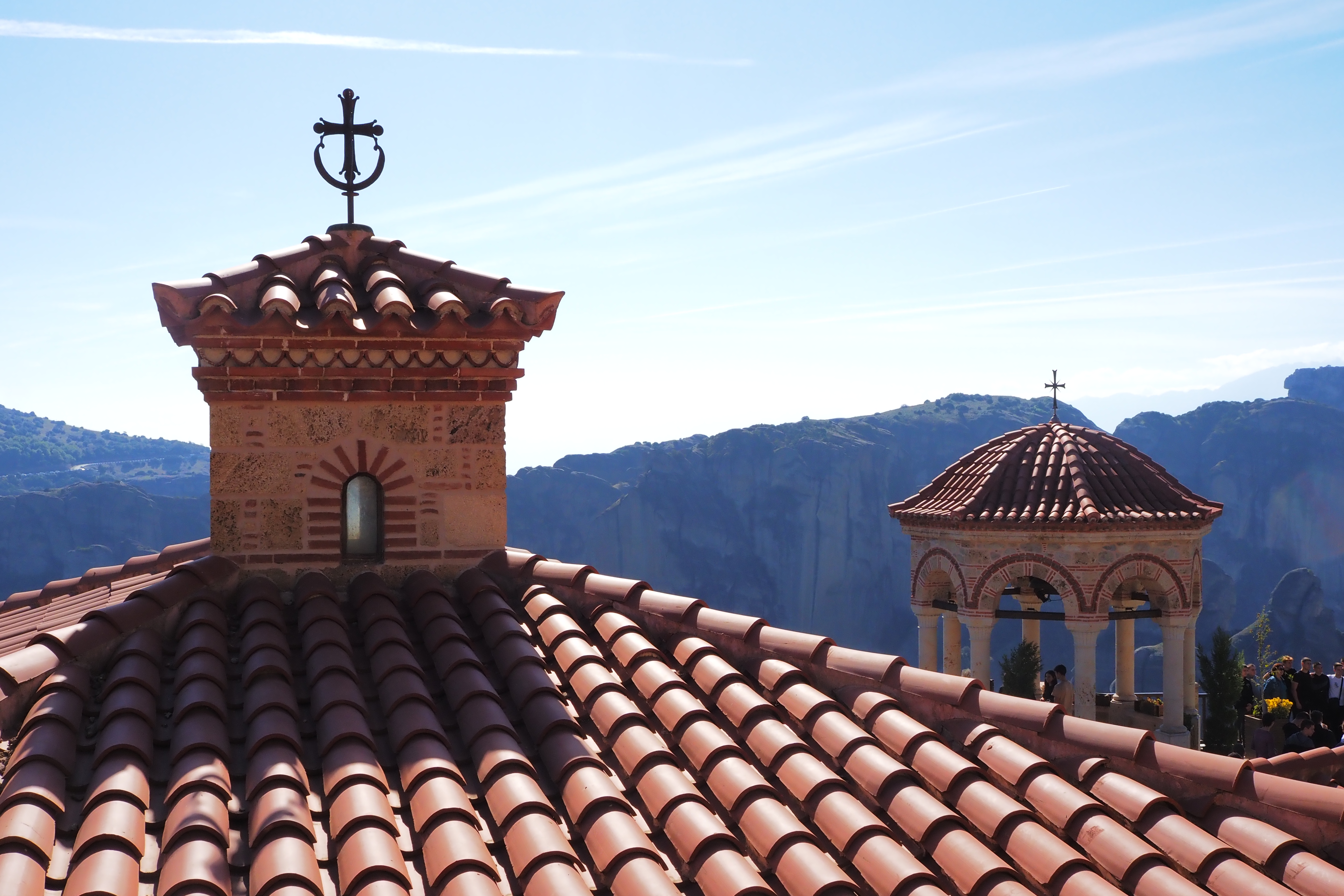 背景に見えるような奇岩群が成す険しい地形は、14世紀当時 俗世から断絶し 祈りに人生を捧げようという修道士たちにとって理想的な場所だったらしい。特に現在のギリシア北部がセルビア王国の版図下にくみこまれていく中で、戦乱を避けるようにアトス山から移住してくる修道士たちも多かったという。