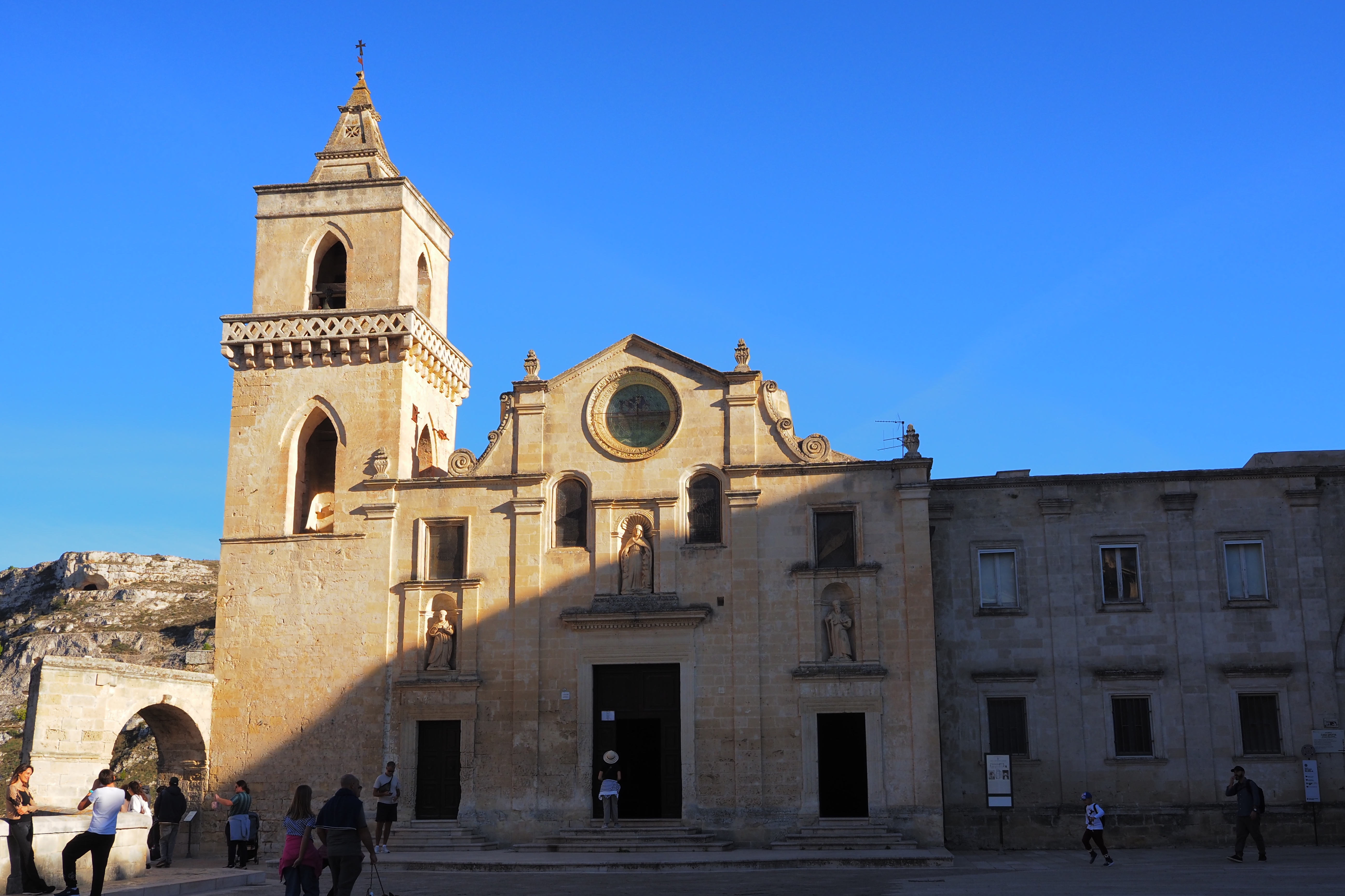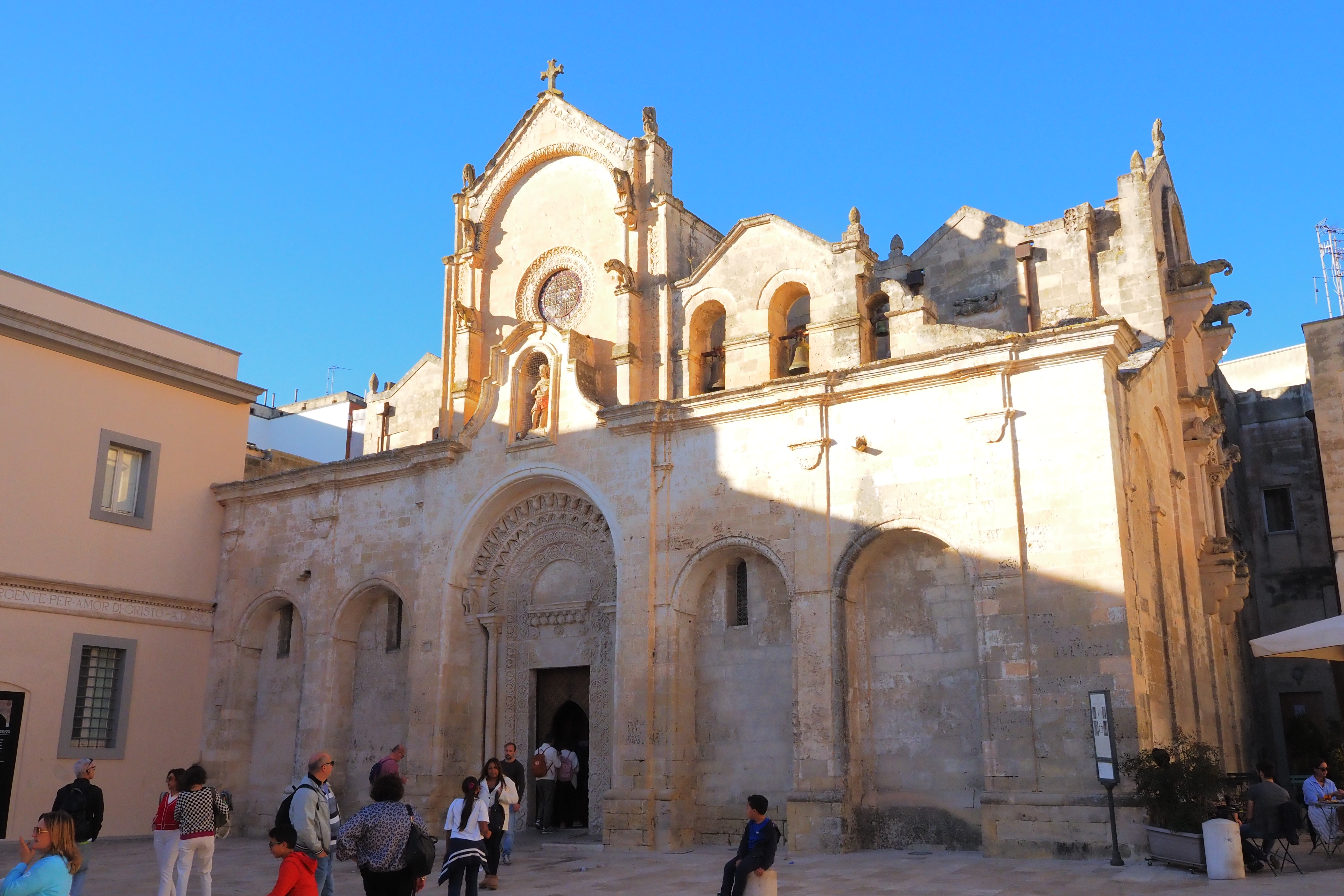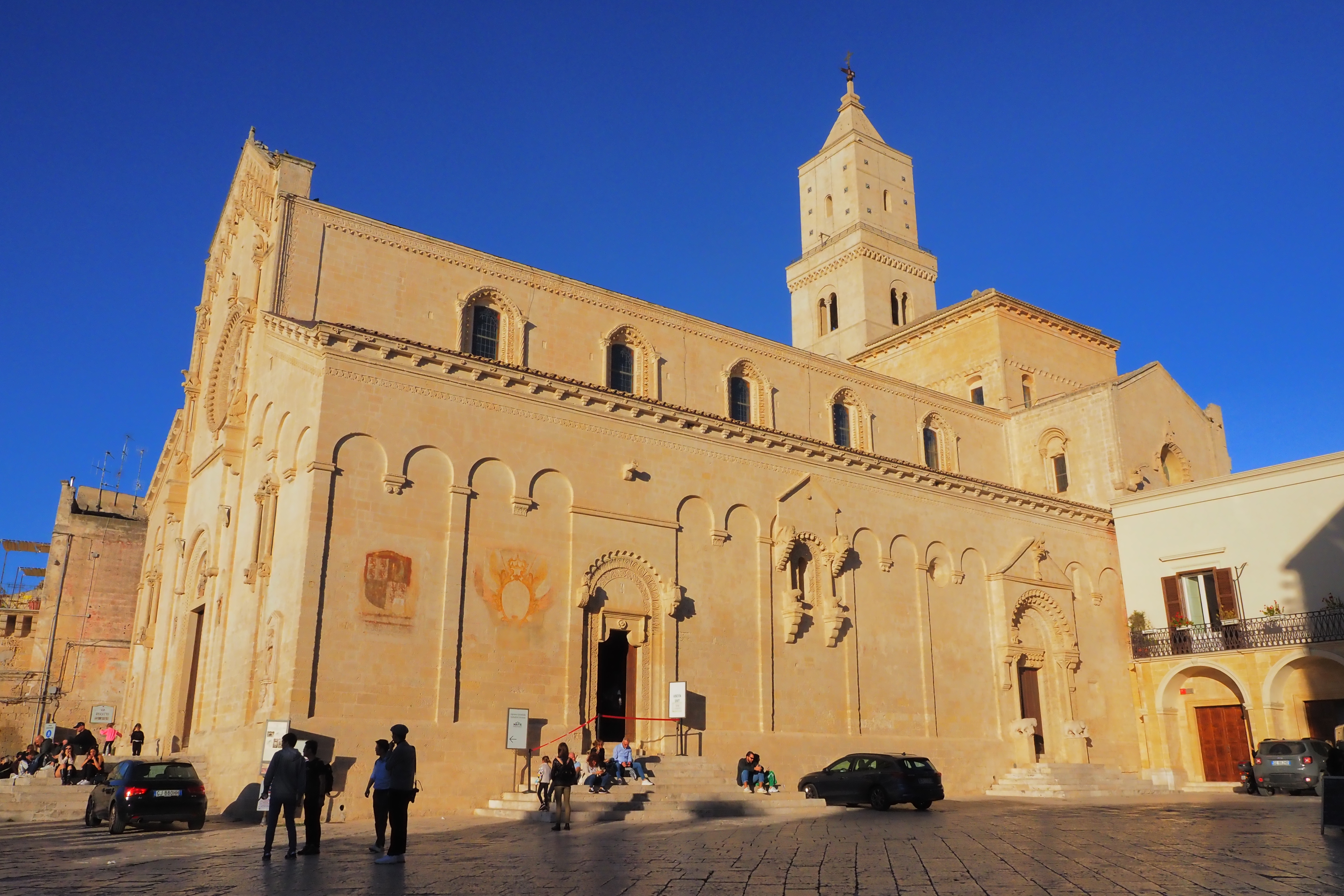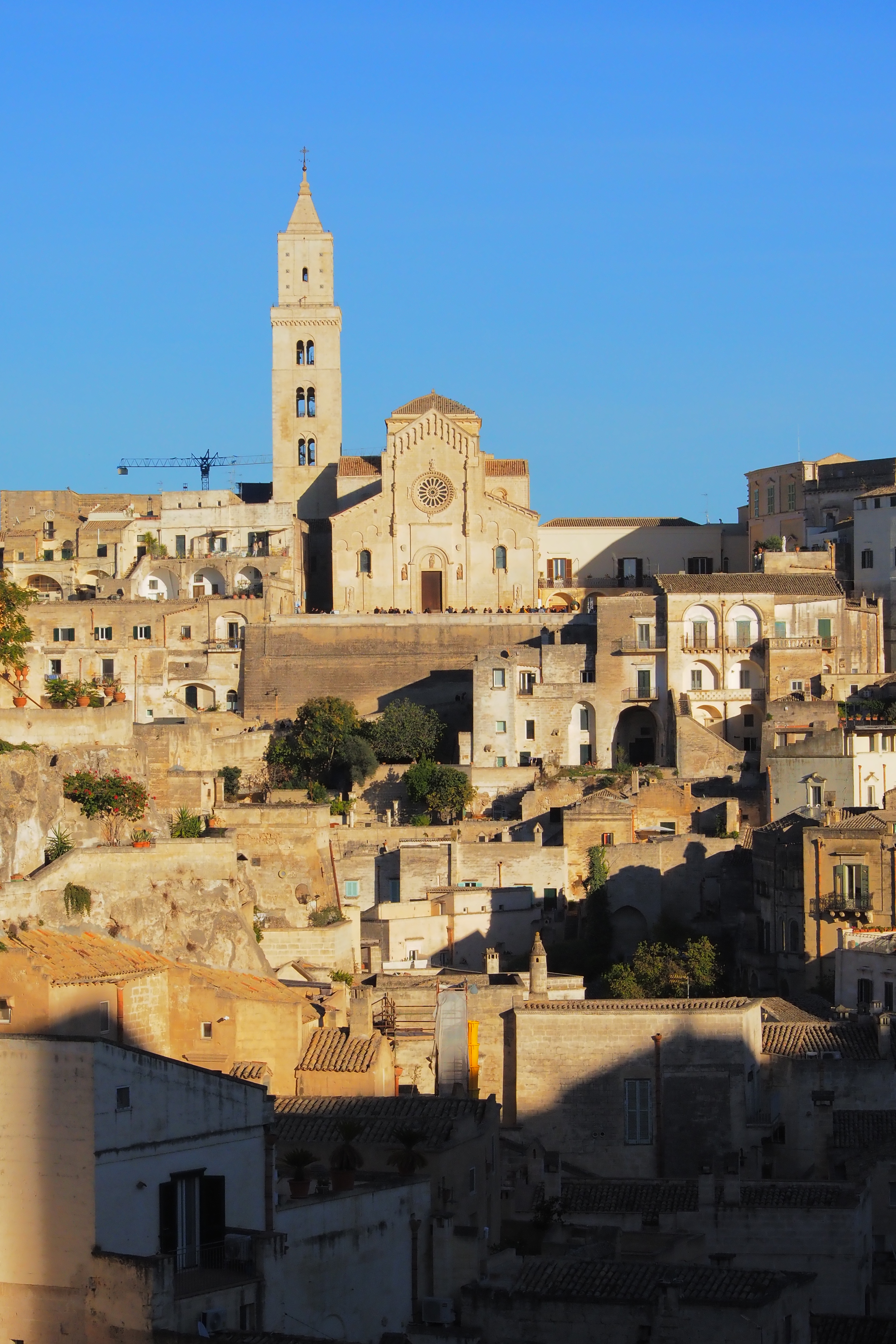 頂上には、さっき遠くから見えた Matera Cathedral; マテーラ大聖堂 が西日を浴びて鎮座していた。1270年の完成。