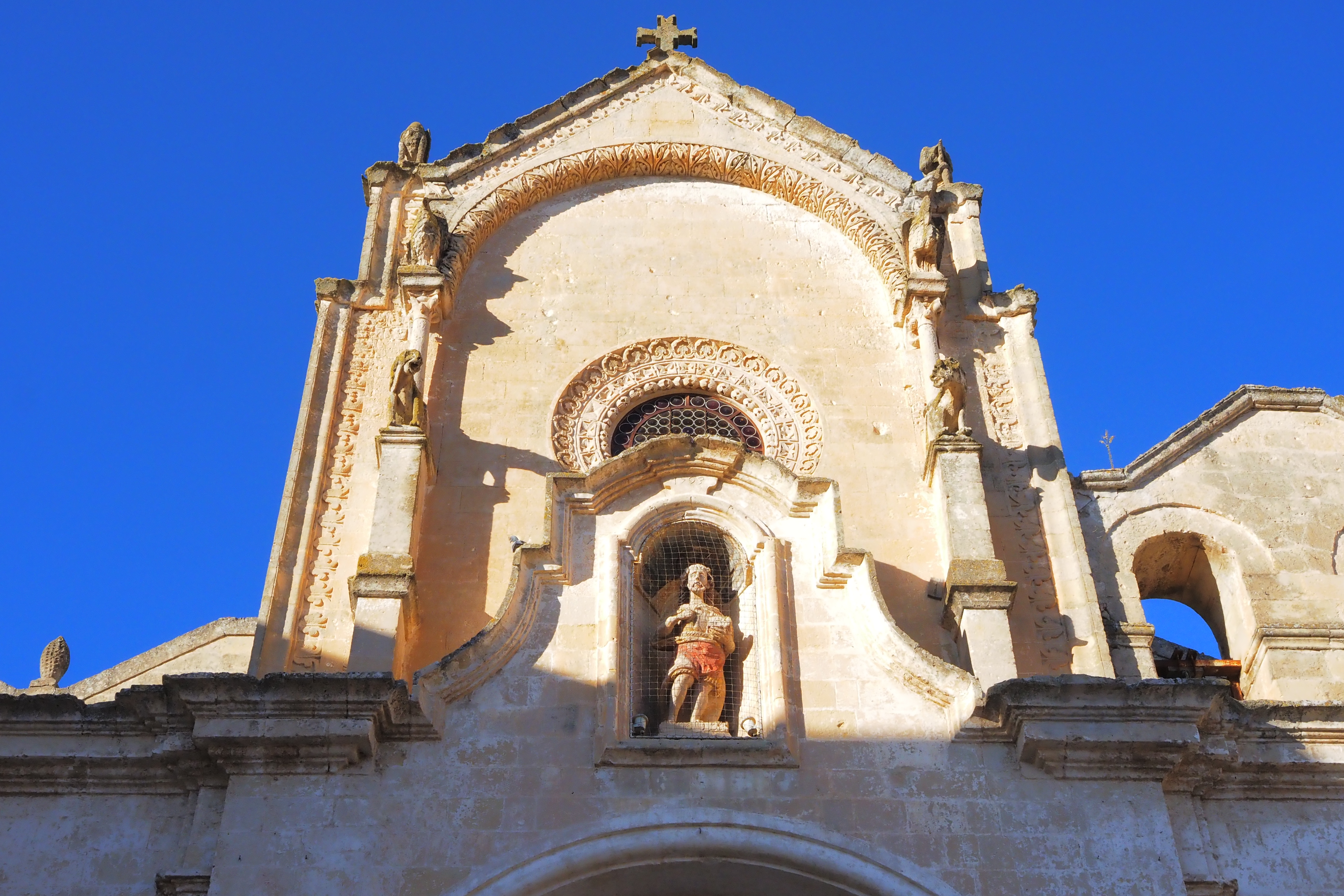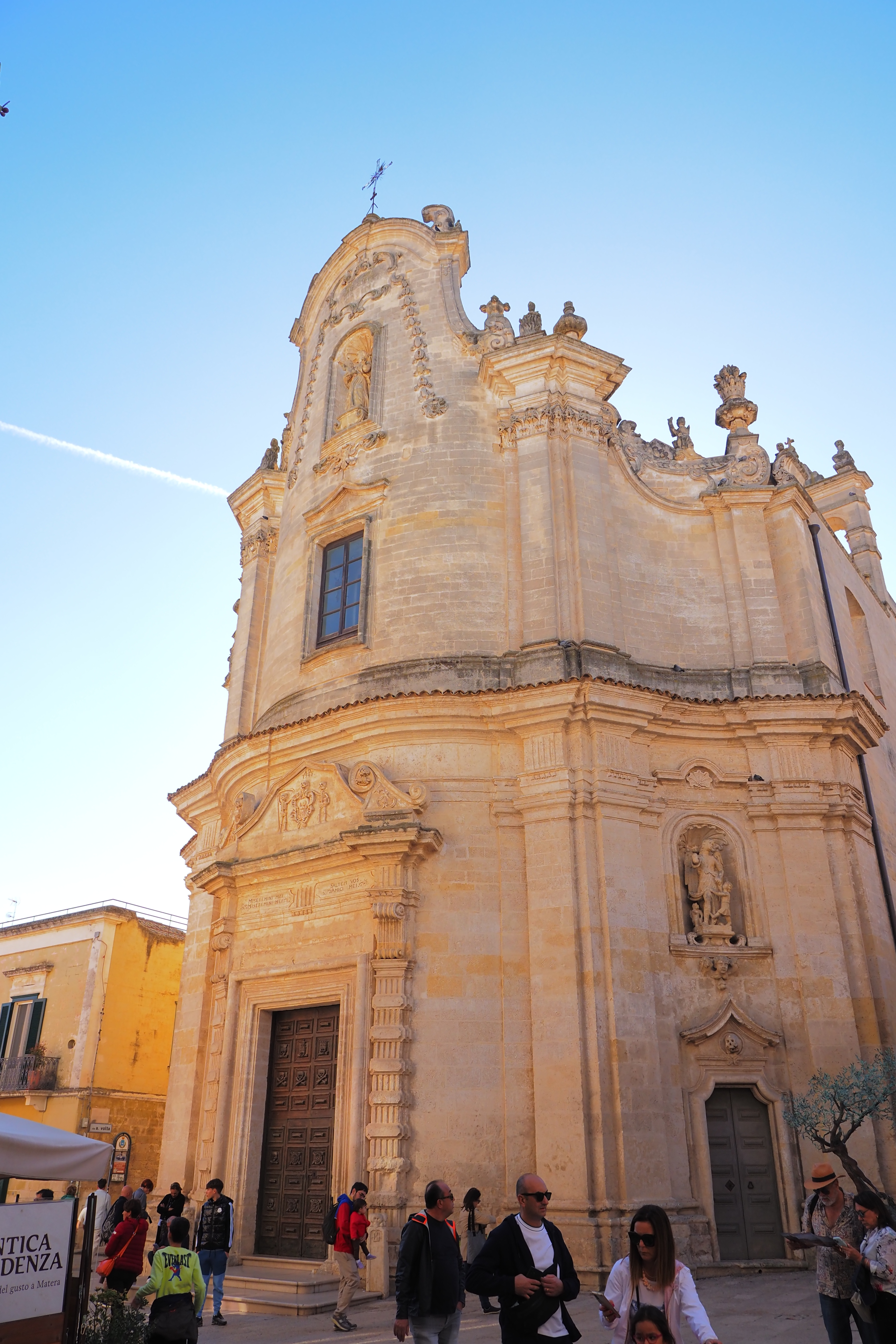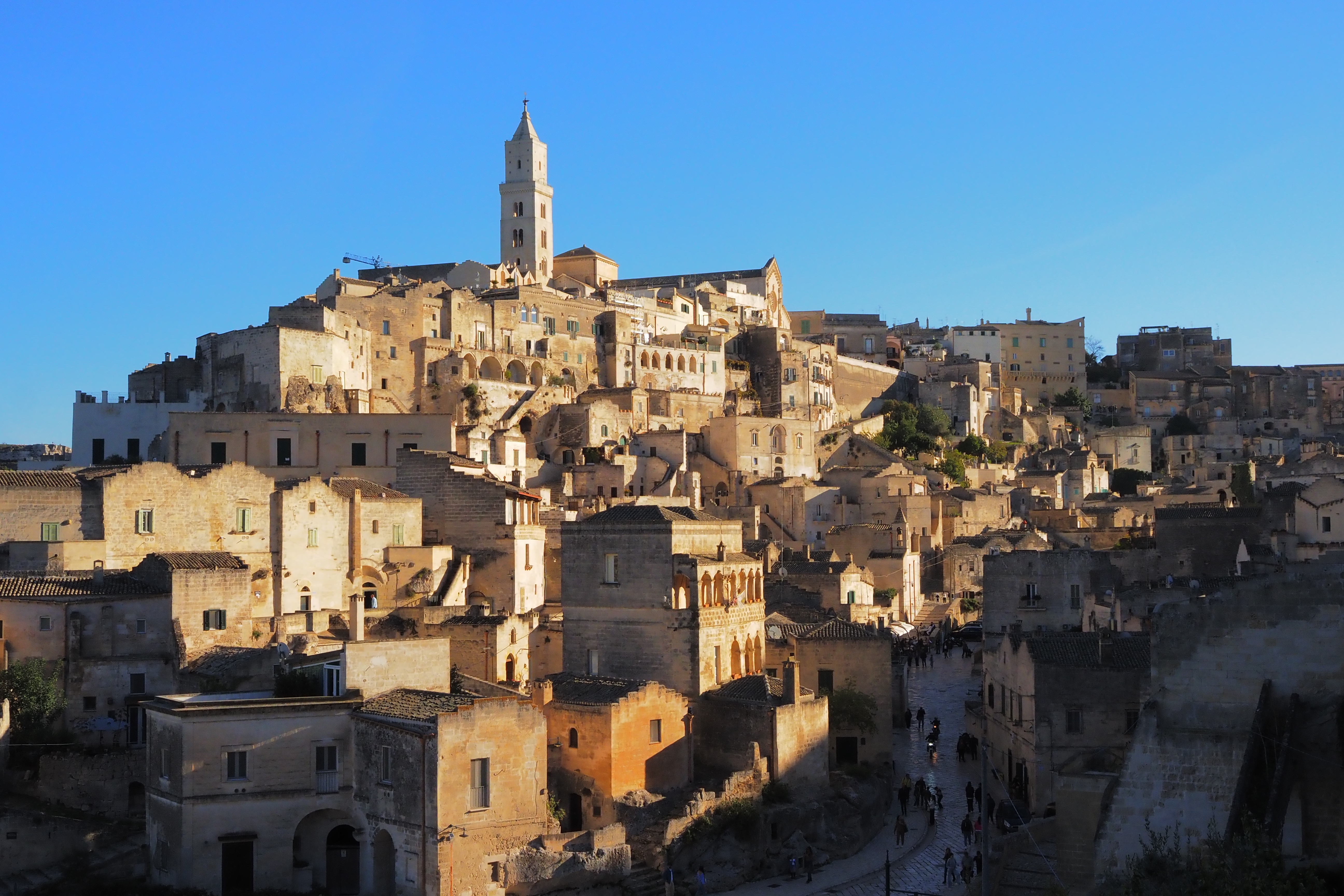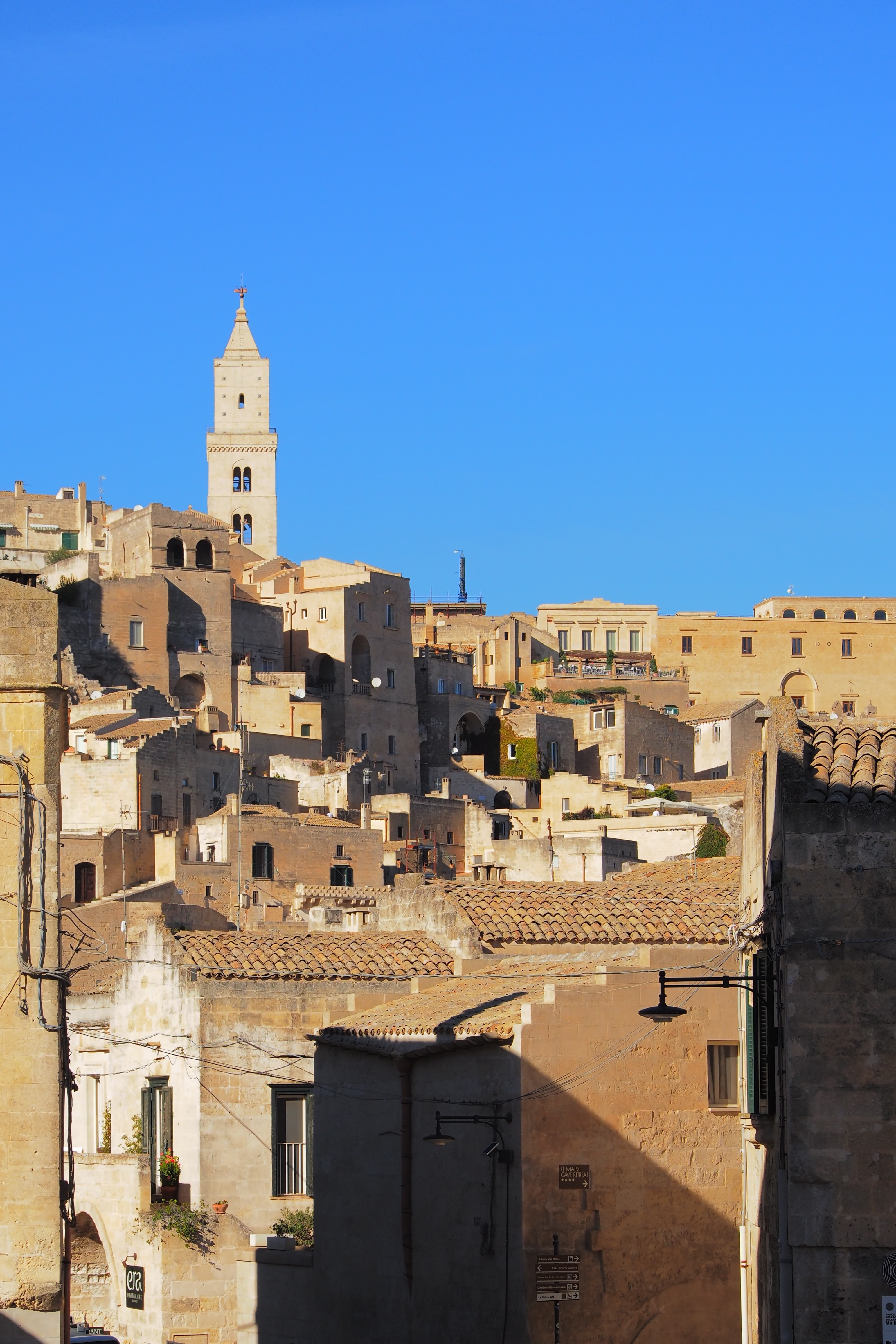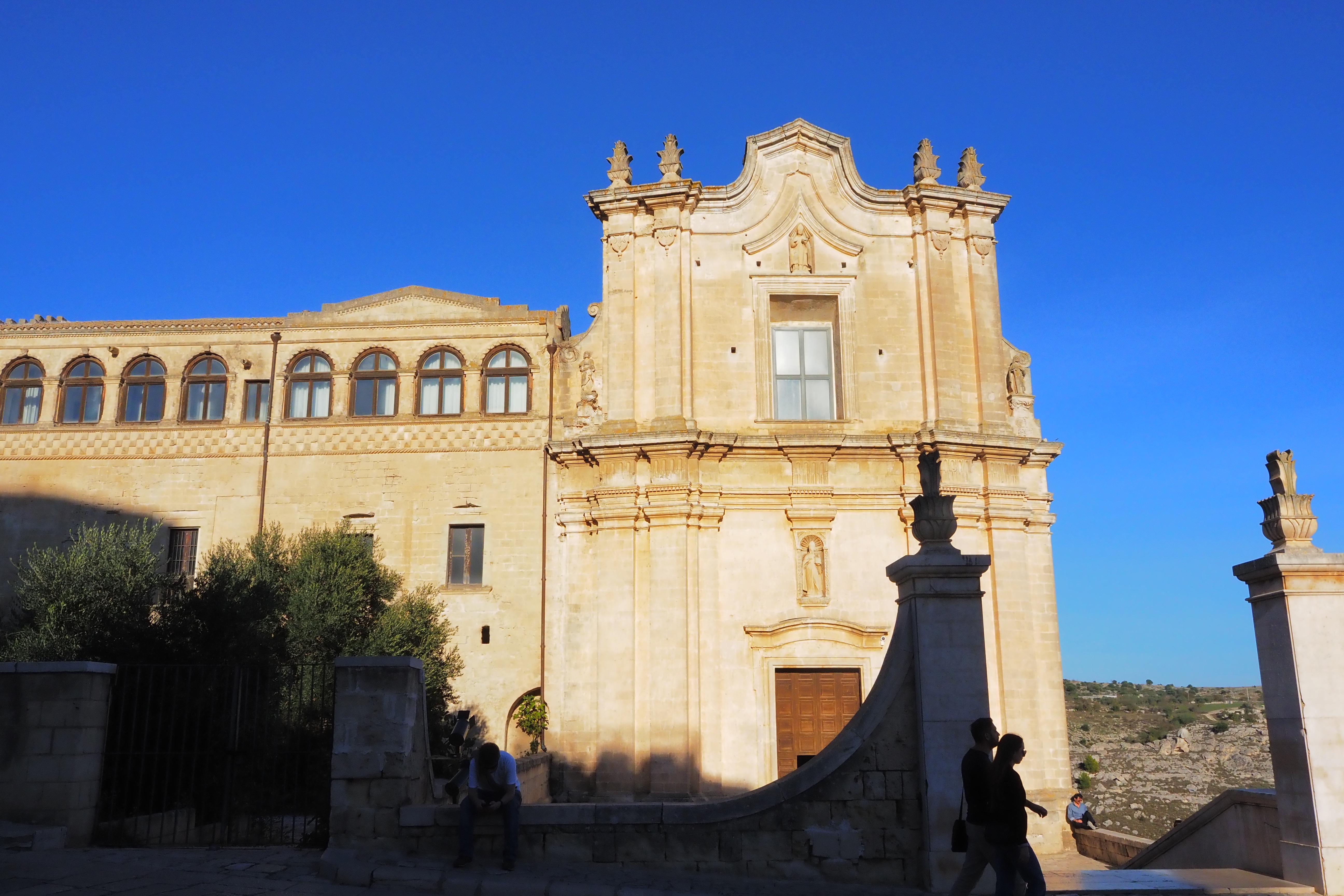 頂上には、さっき遠くから見えた Matera Cathedral; マテーラ大聖堂 が西日を浴びて鎮座していた。1270年の完成。