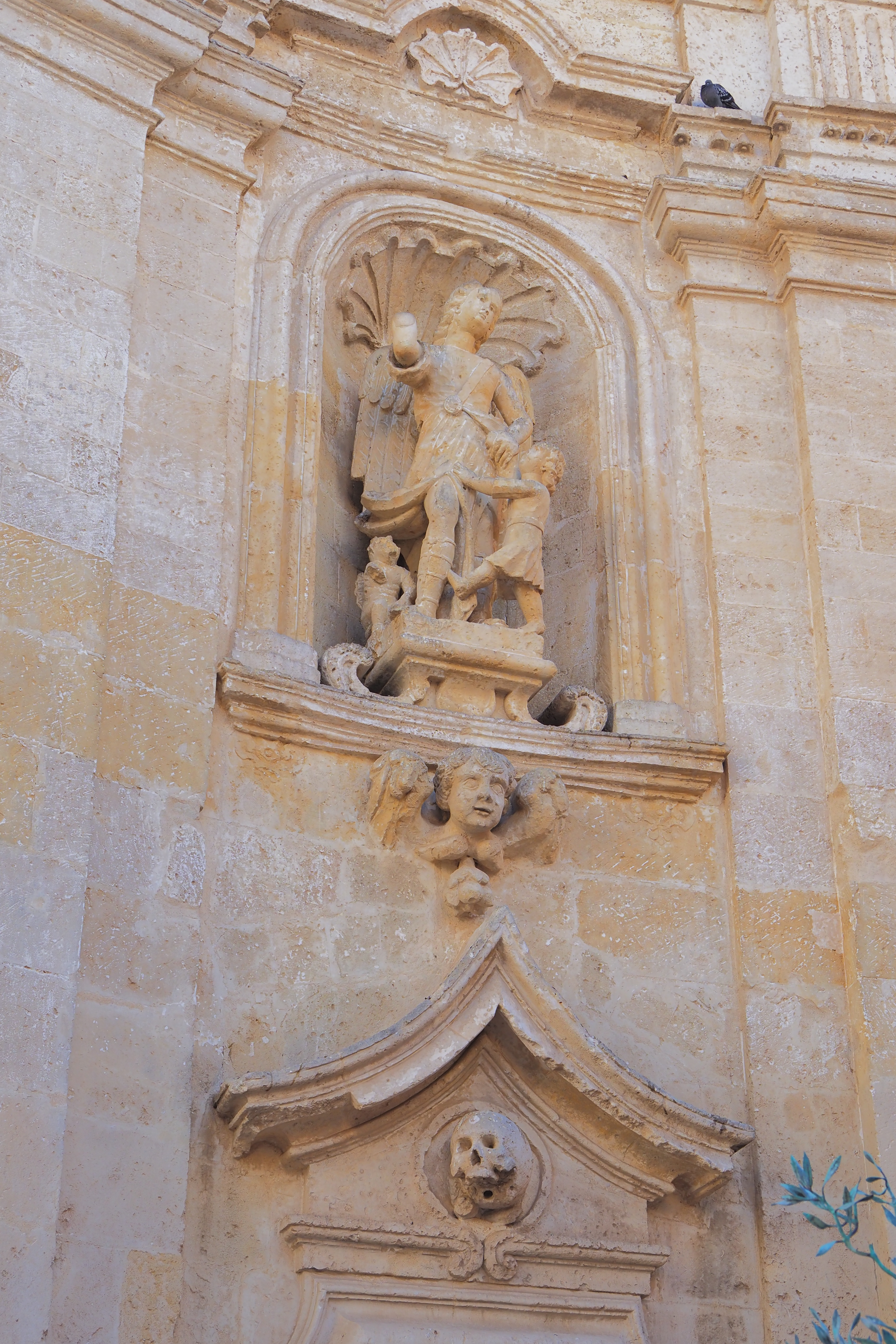 少し小ぶりなRosone; バラ窓(ロマネスク~ゴシックのカトリック教会に特徴的な円形の装飾窓) の下には 洗礼者ヨハネの姿が彫られている。